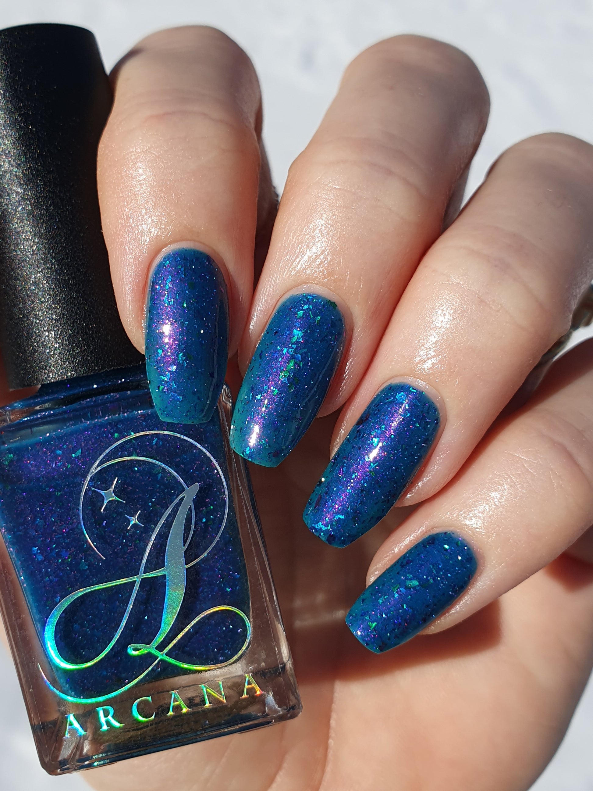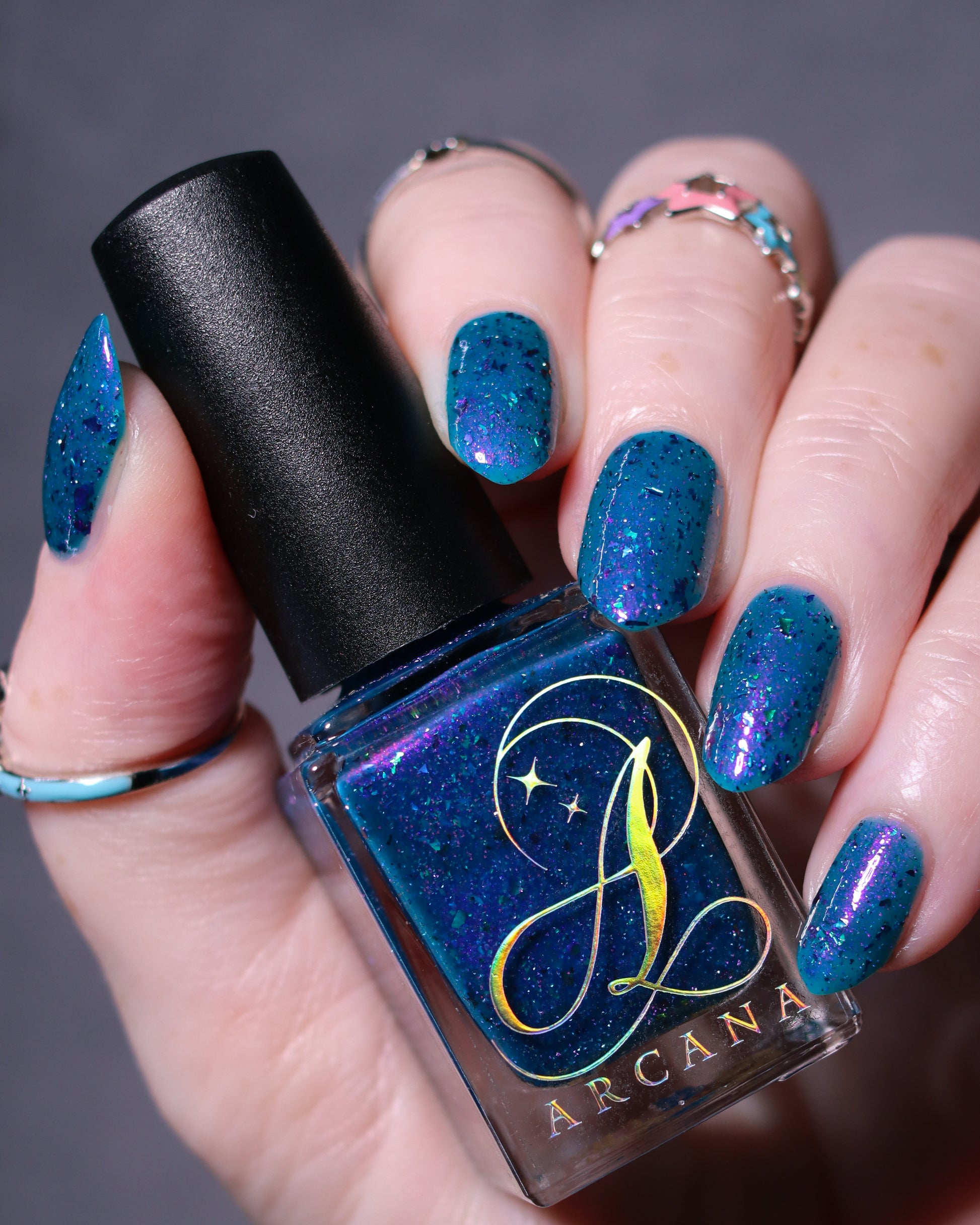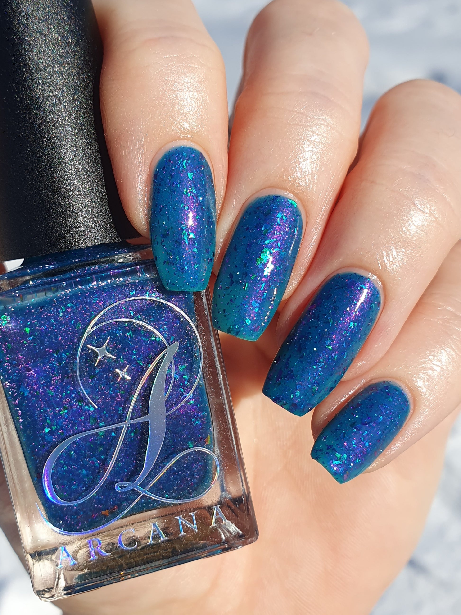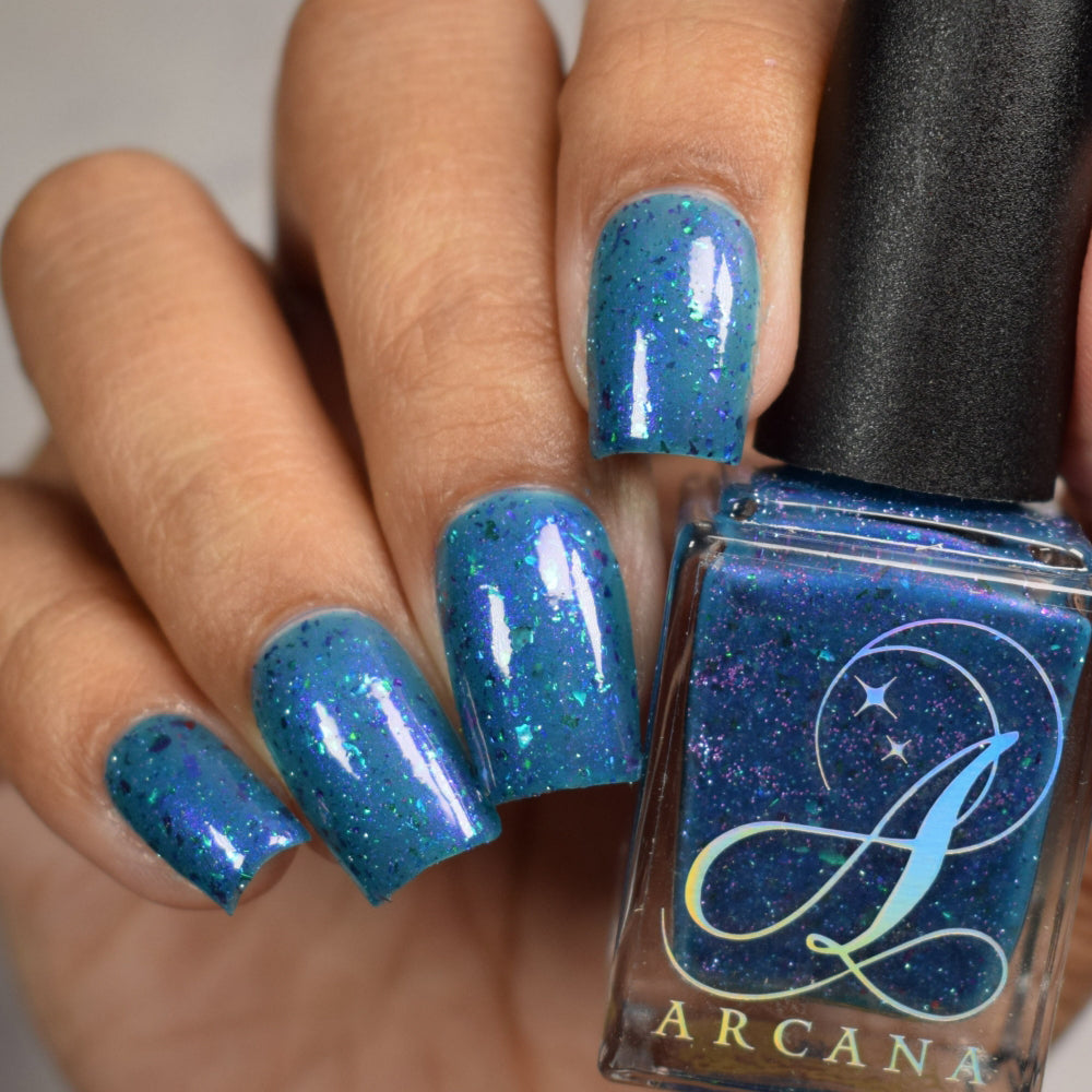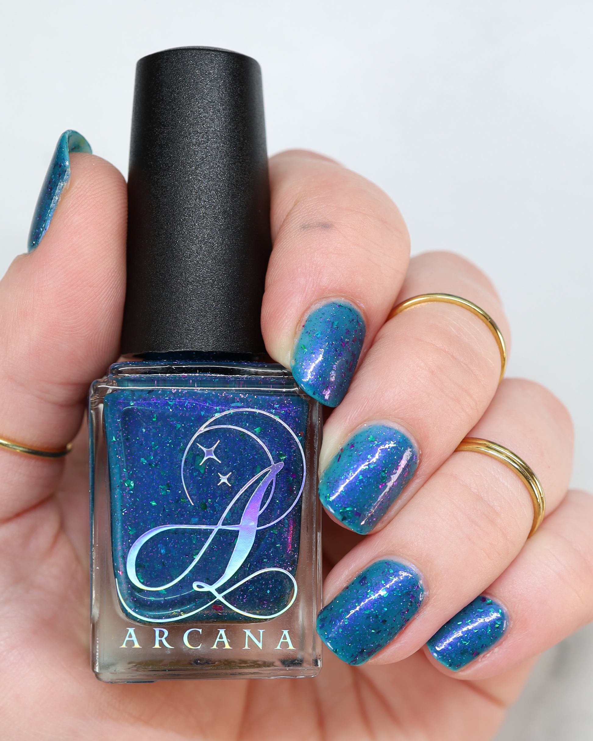 Stormicorn has as dark blue-green jelly base with purple and green metallic flakes, purple to red shimmer, and purple reflective glitter!