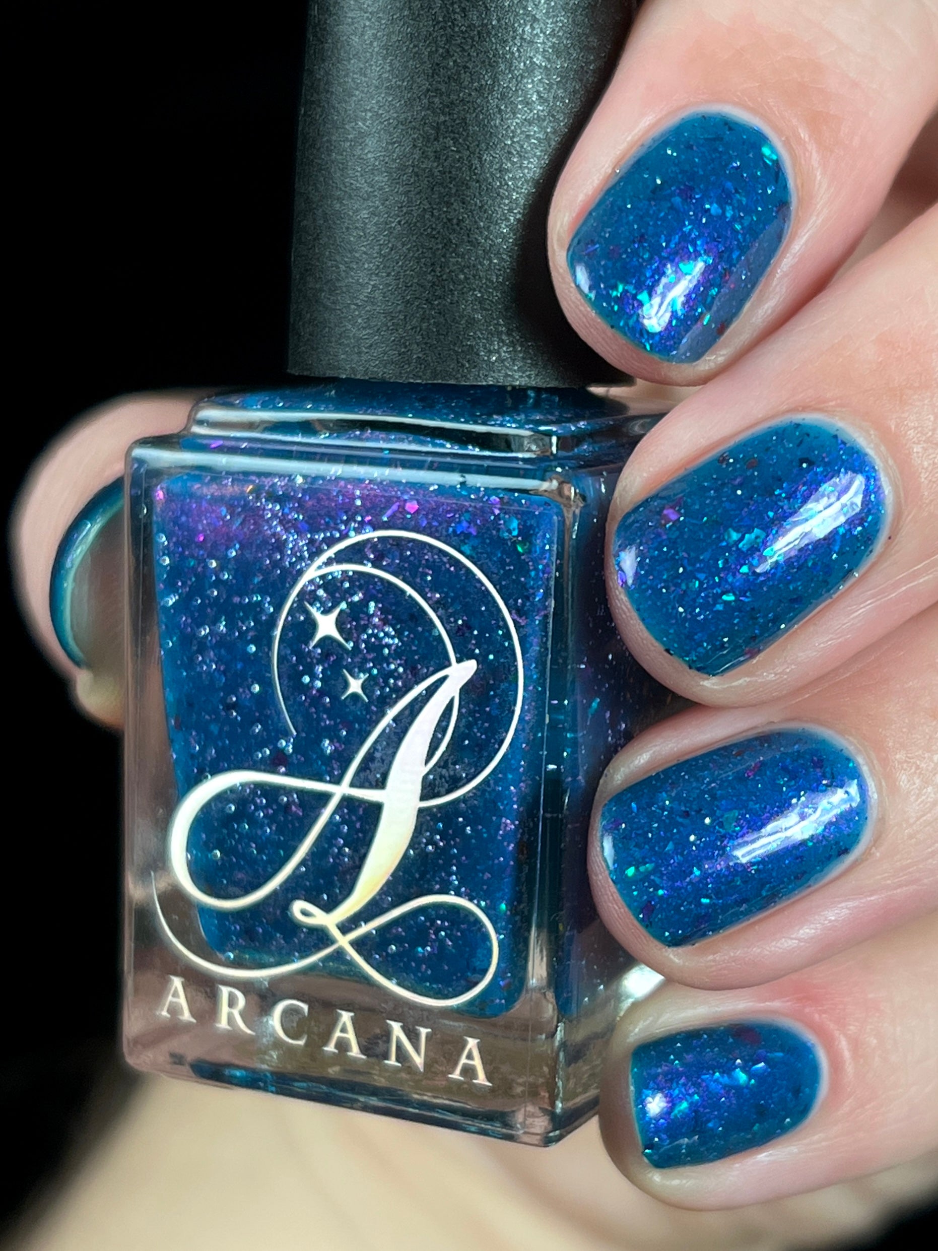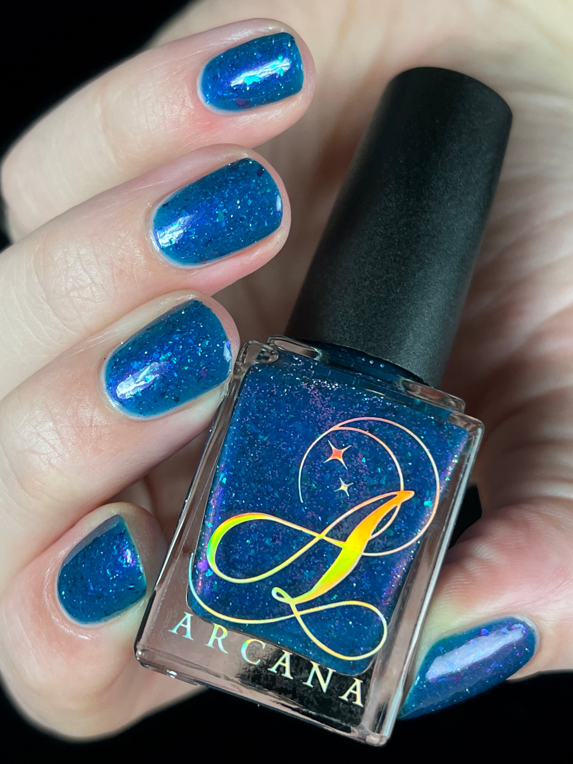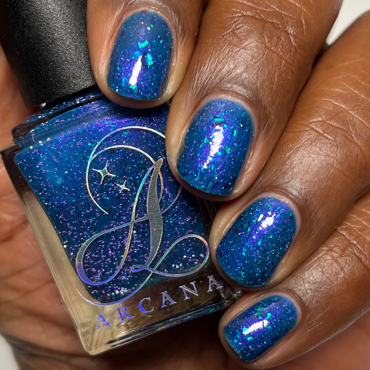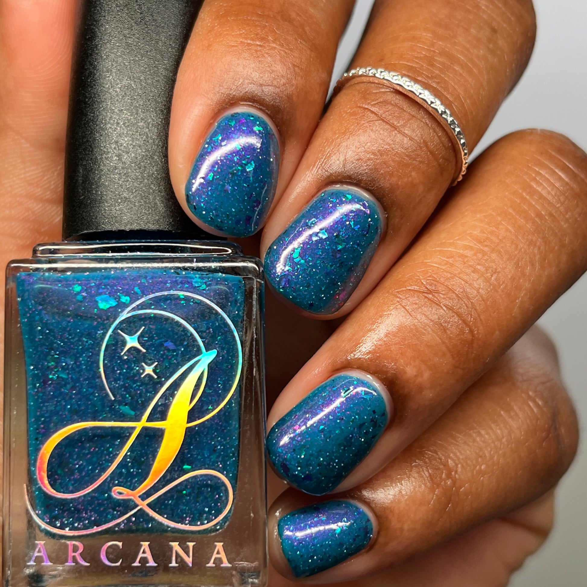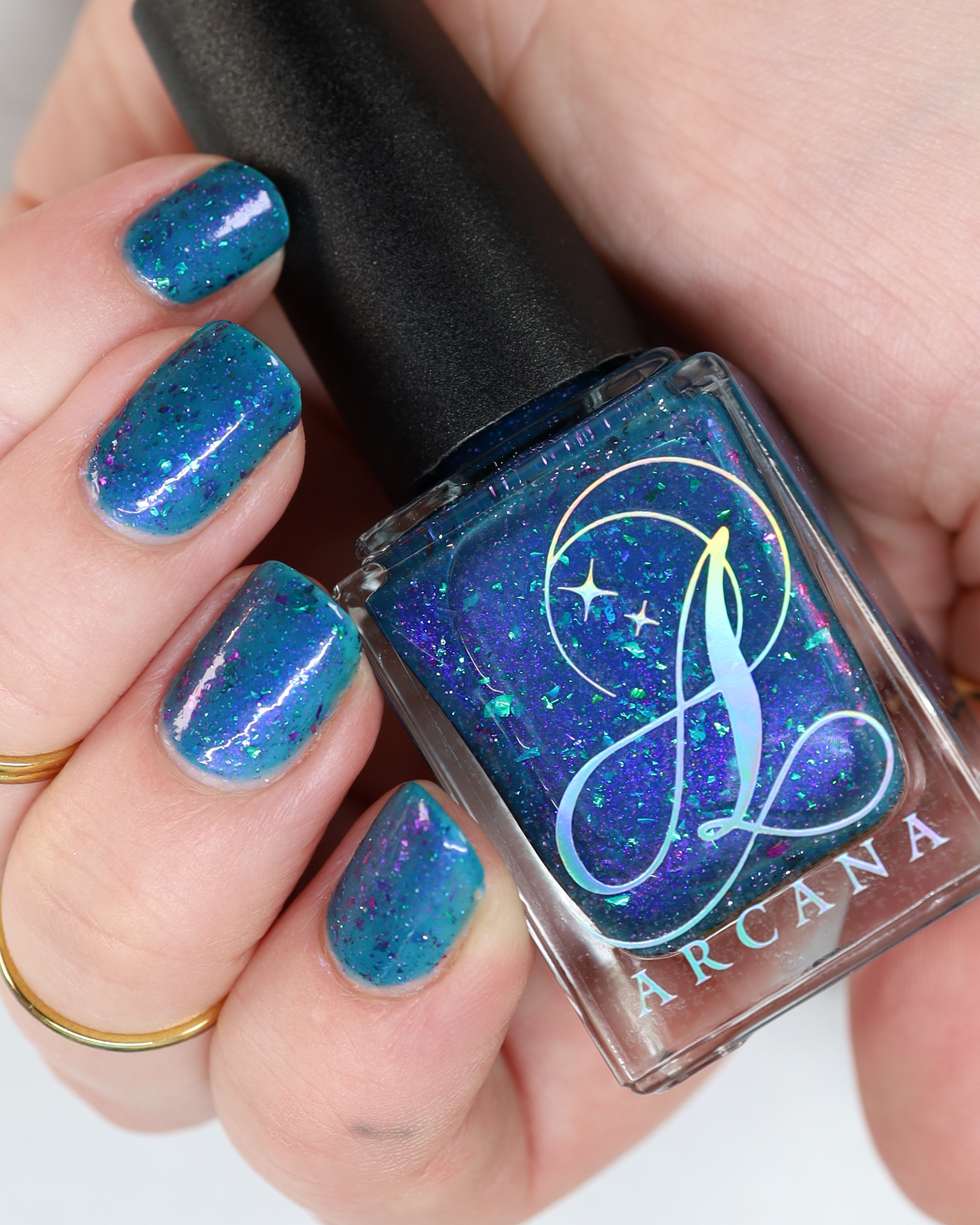 Stormicorn has as dark blue-green jelly base with purple and green metallic flakes, purple to red shimmer, and purple reflective glitter!
