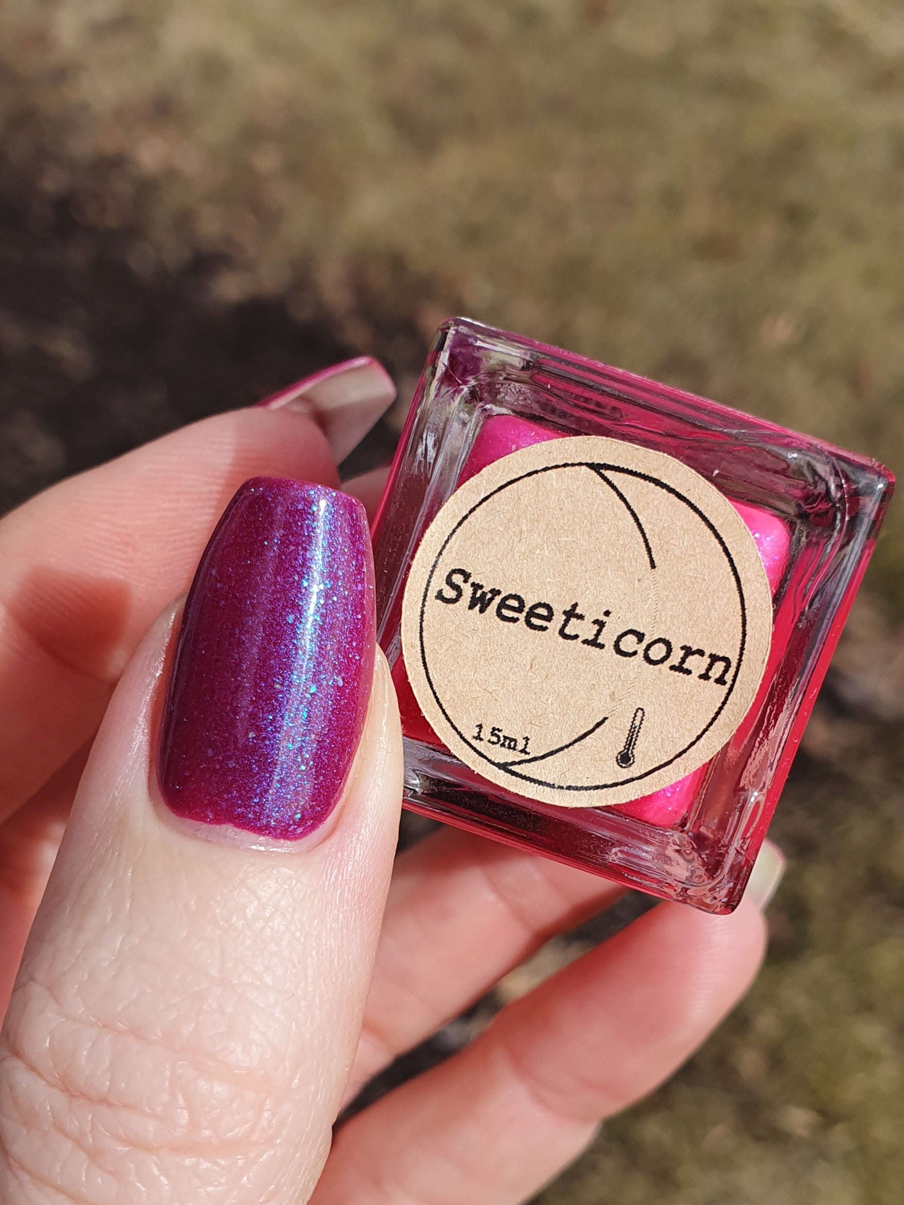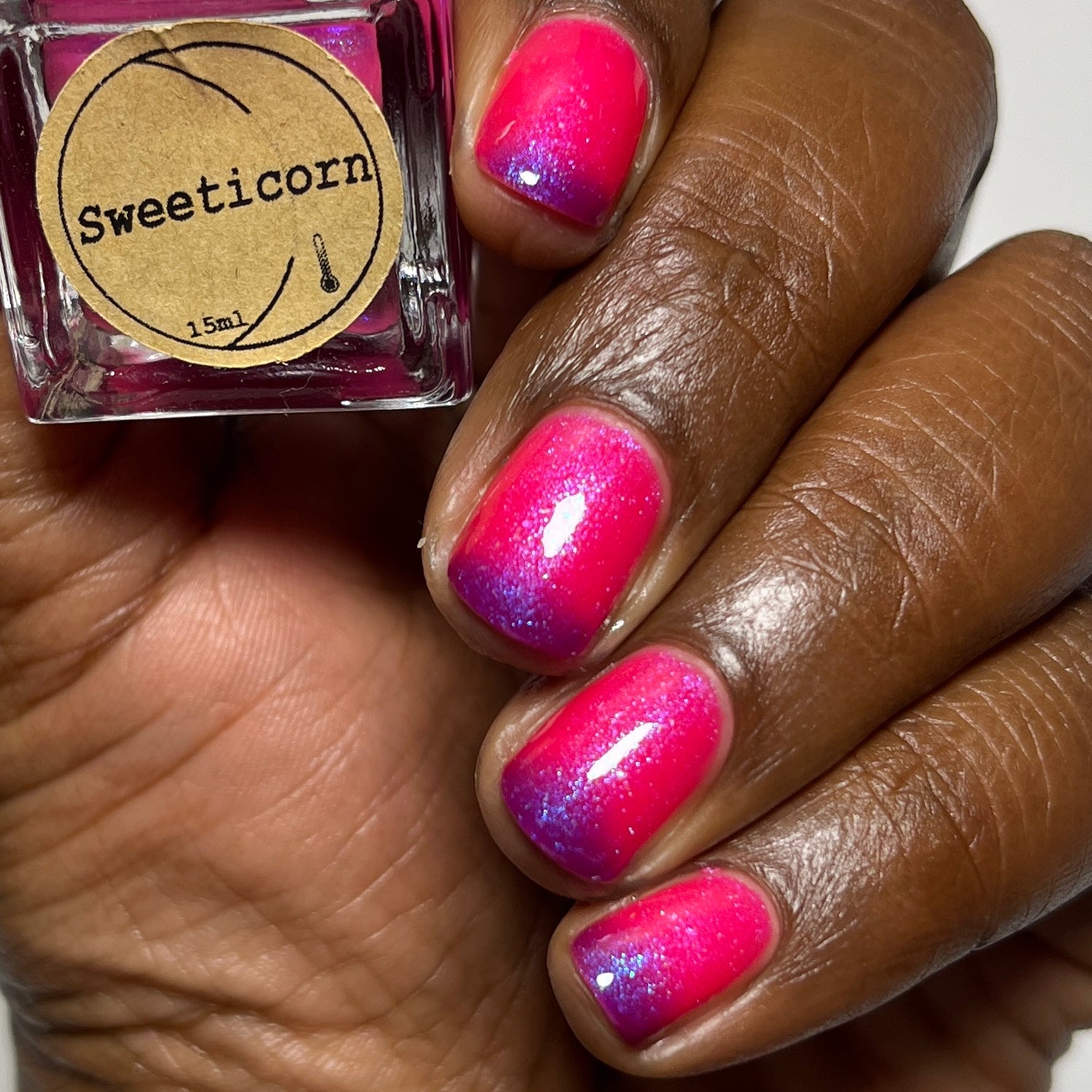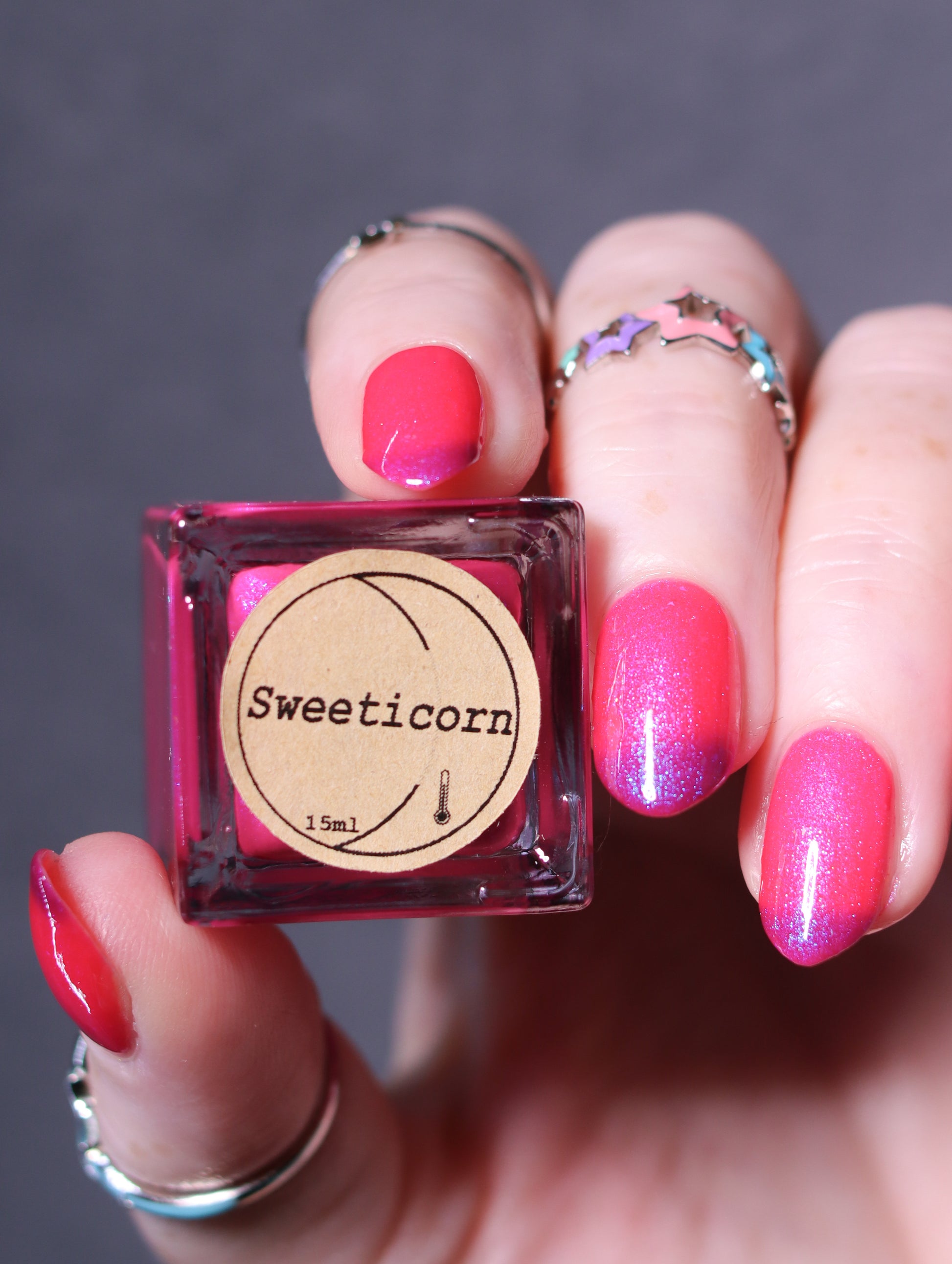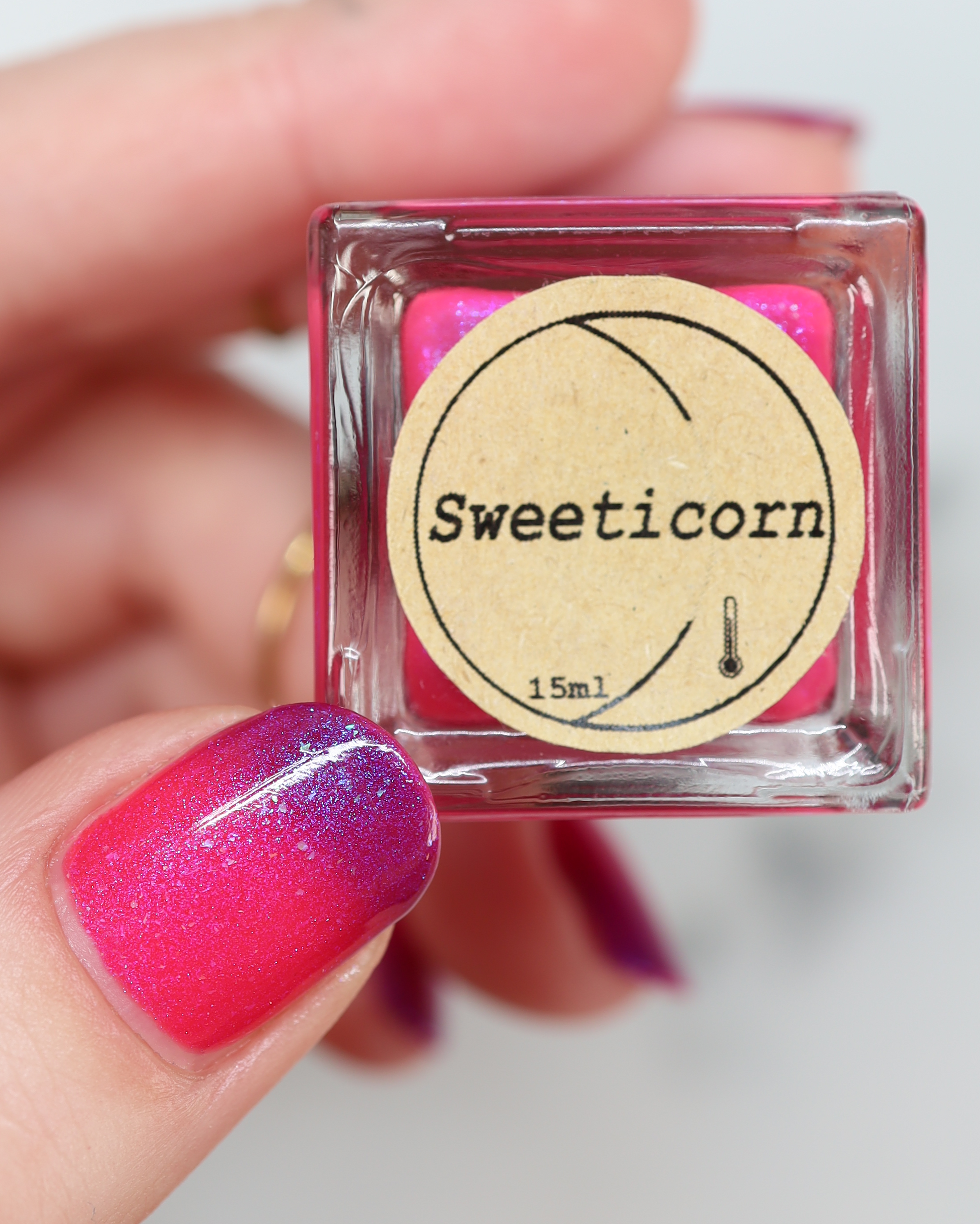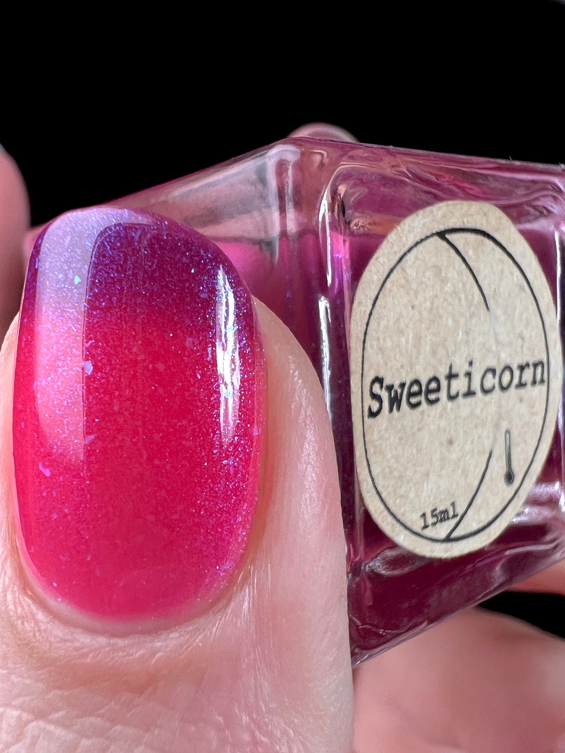 Sweeticorn is a bright pink (hot) to pinkish red (warm) to darkened magenta (cold) thermal base with blue to green shimmer and blue to green micro flakes.