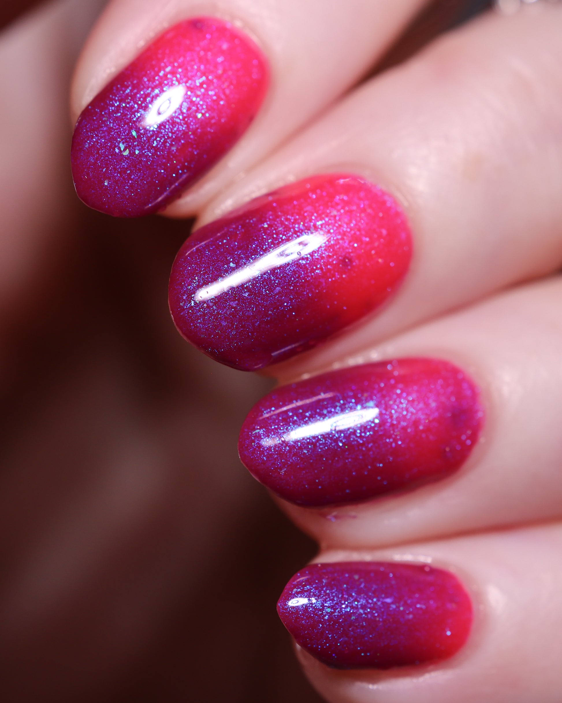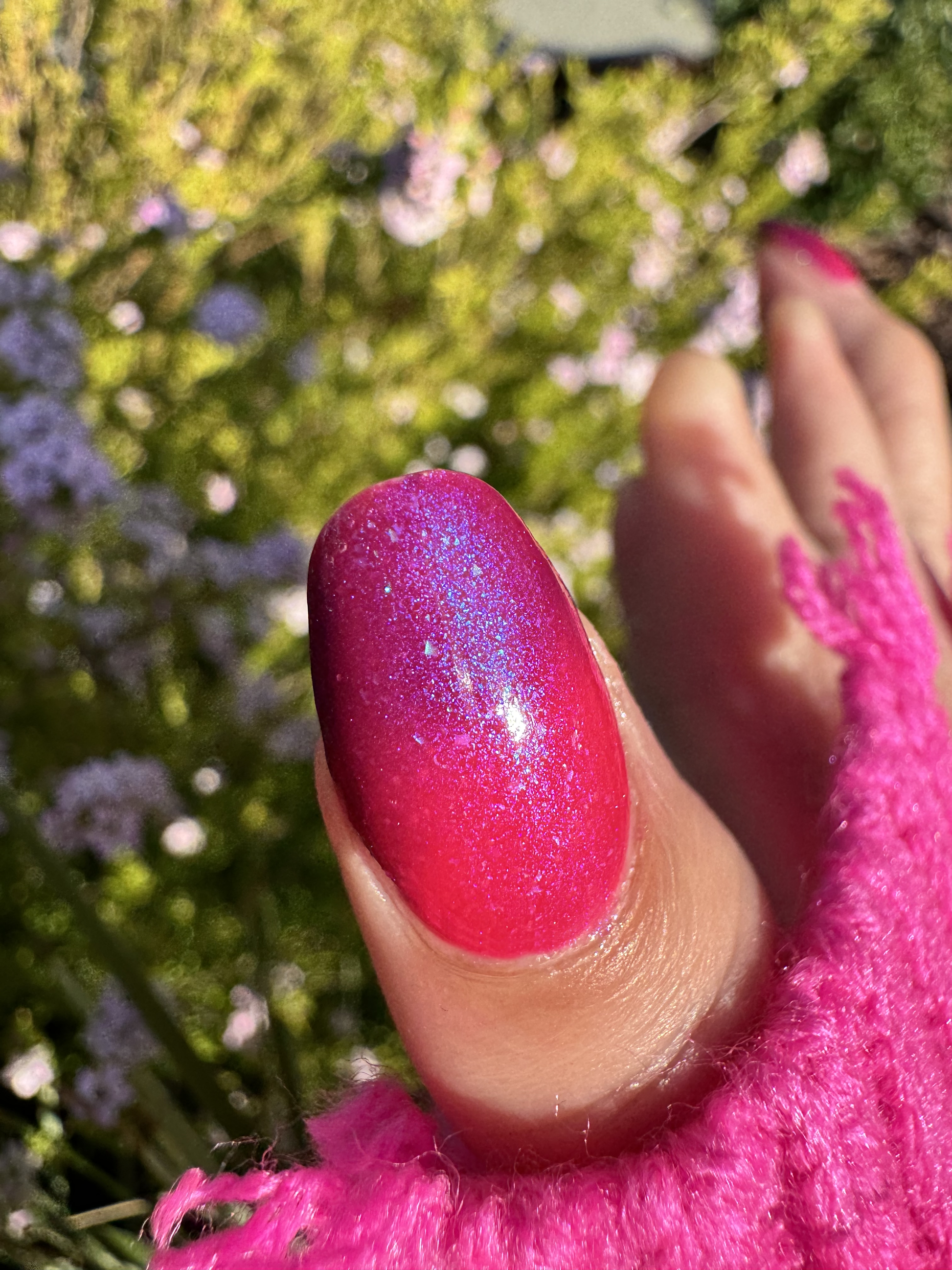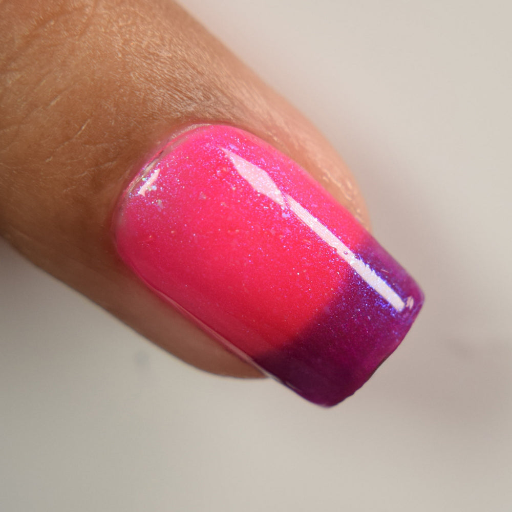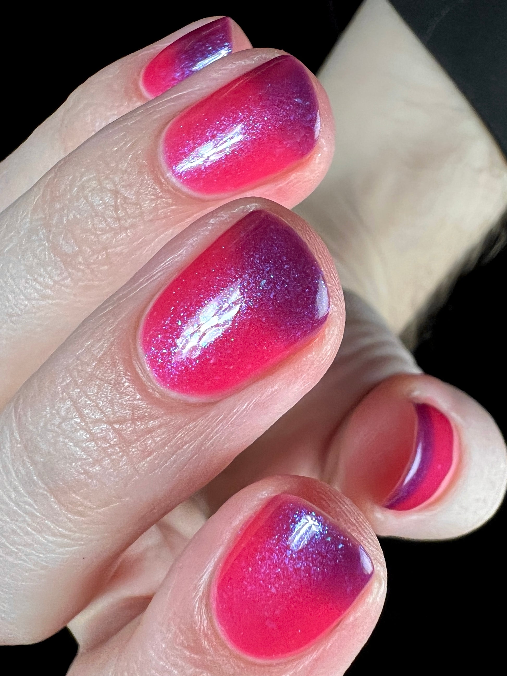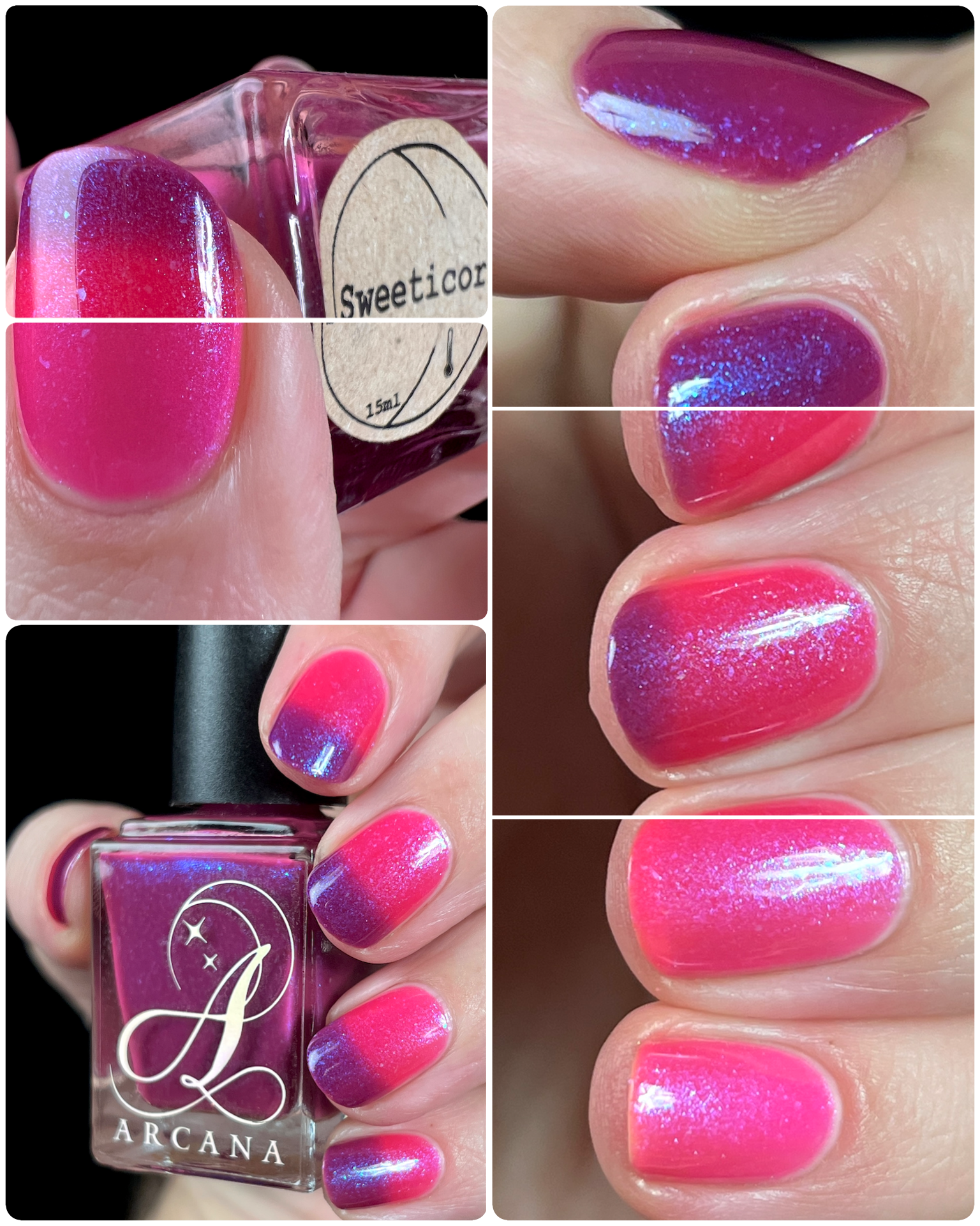Sweeticorn is a bright pink (hot) to pinkish red (warm) to darkened magenta (cold) thermal base with blue to green shimmer and blue to green micro flakes.