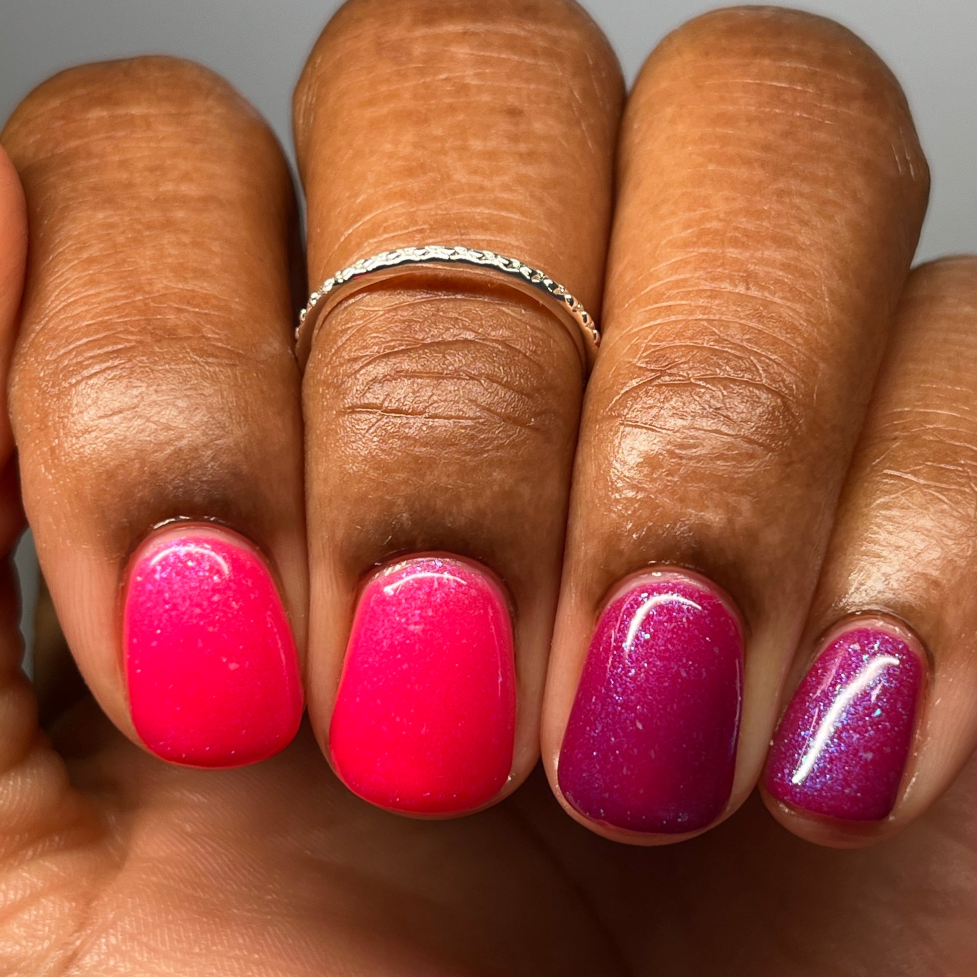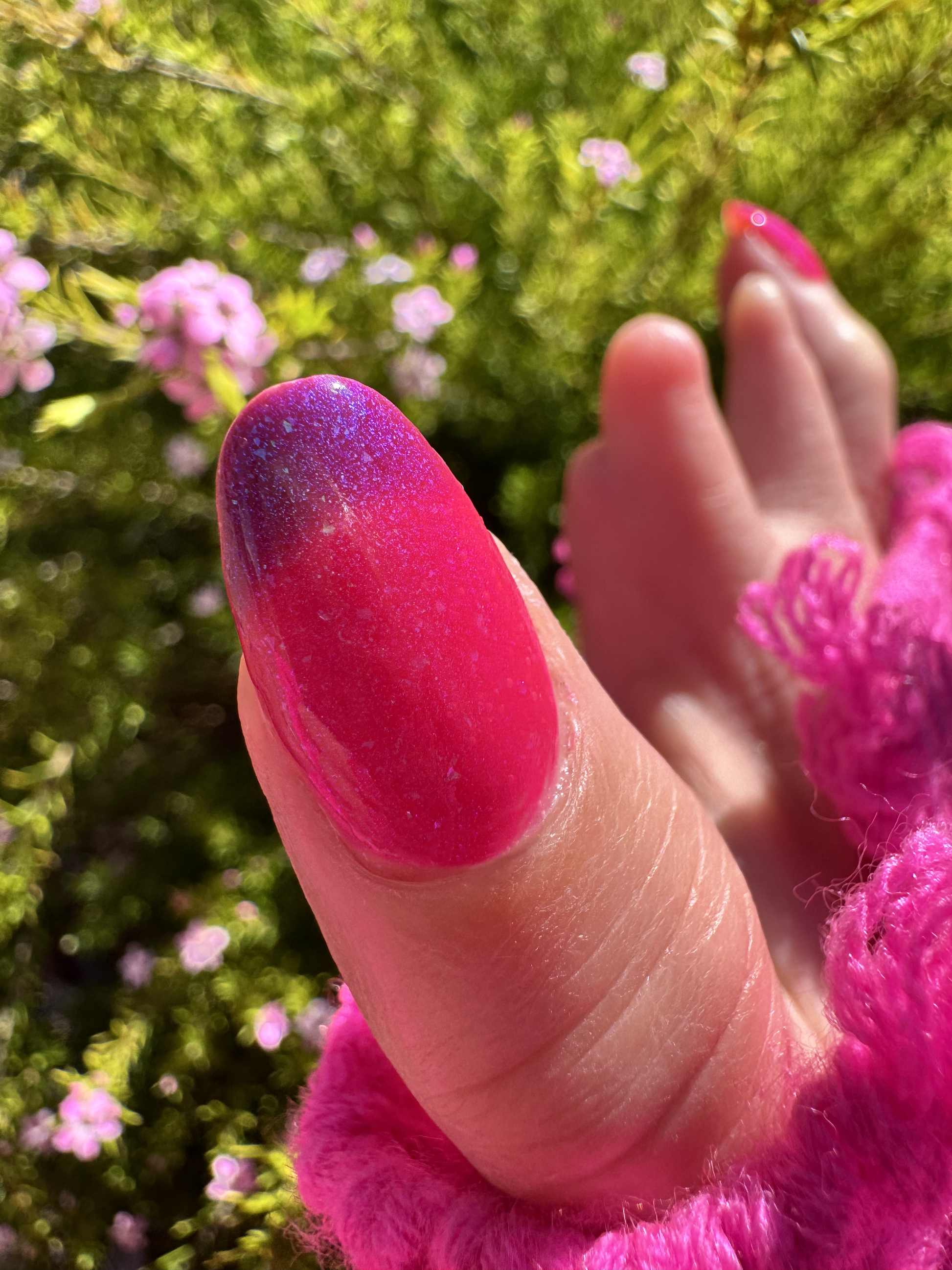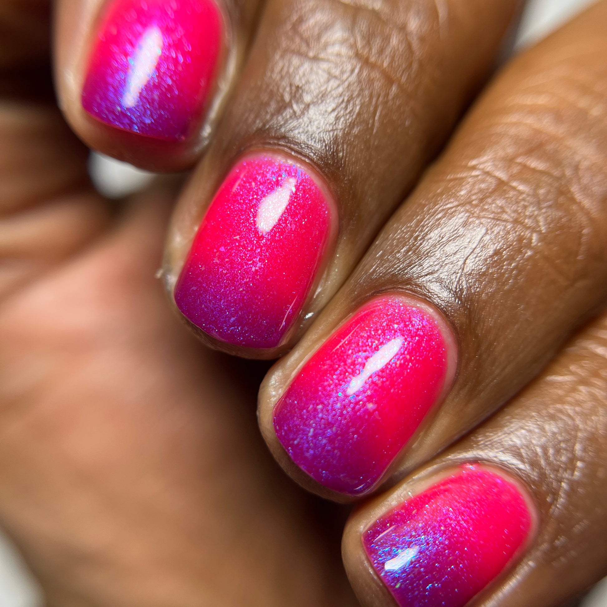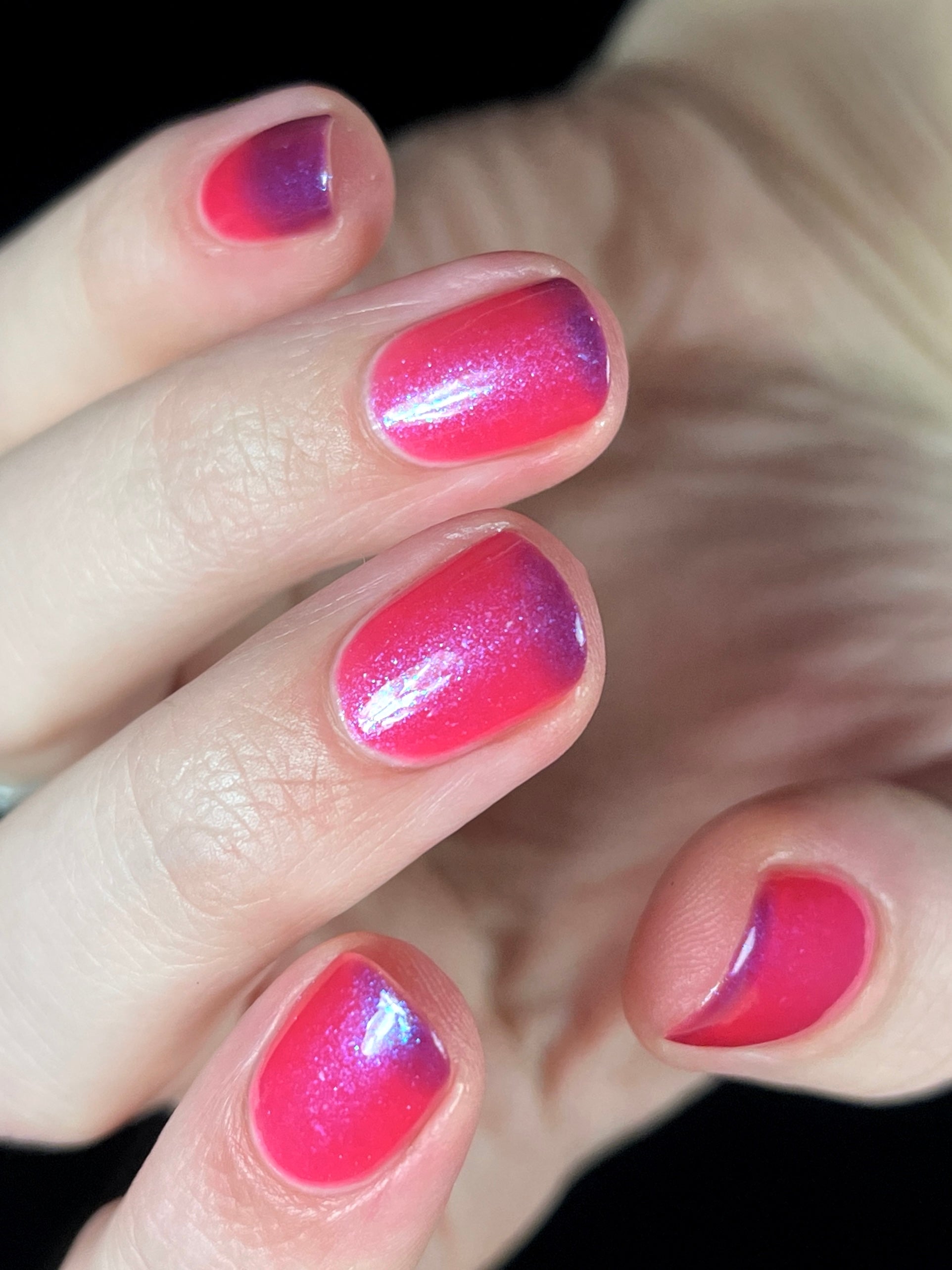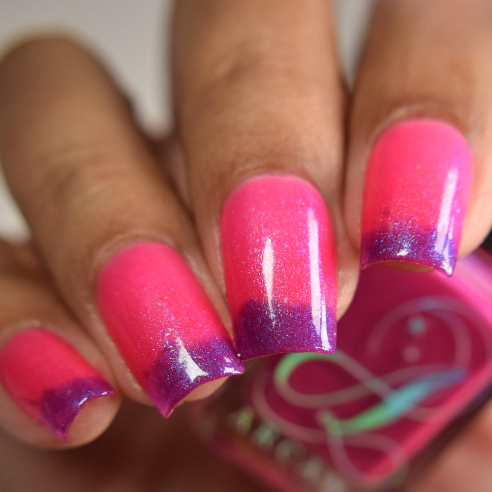 Sweeticorn is a bright pink (hot) to pinkish red (warm) to darkened magenta (cold) thermal base with blue to green shimmer and blue to green micro flakes.