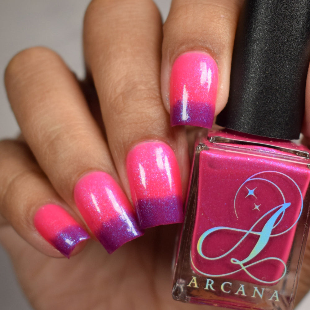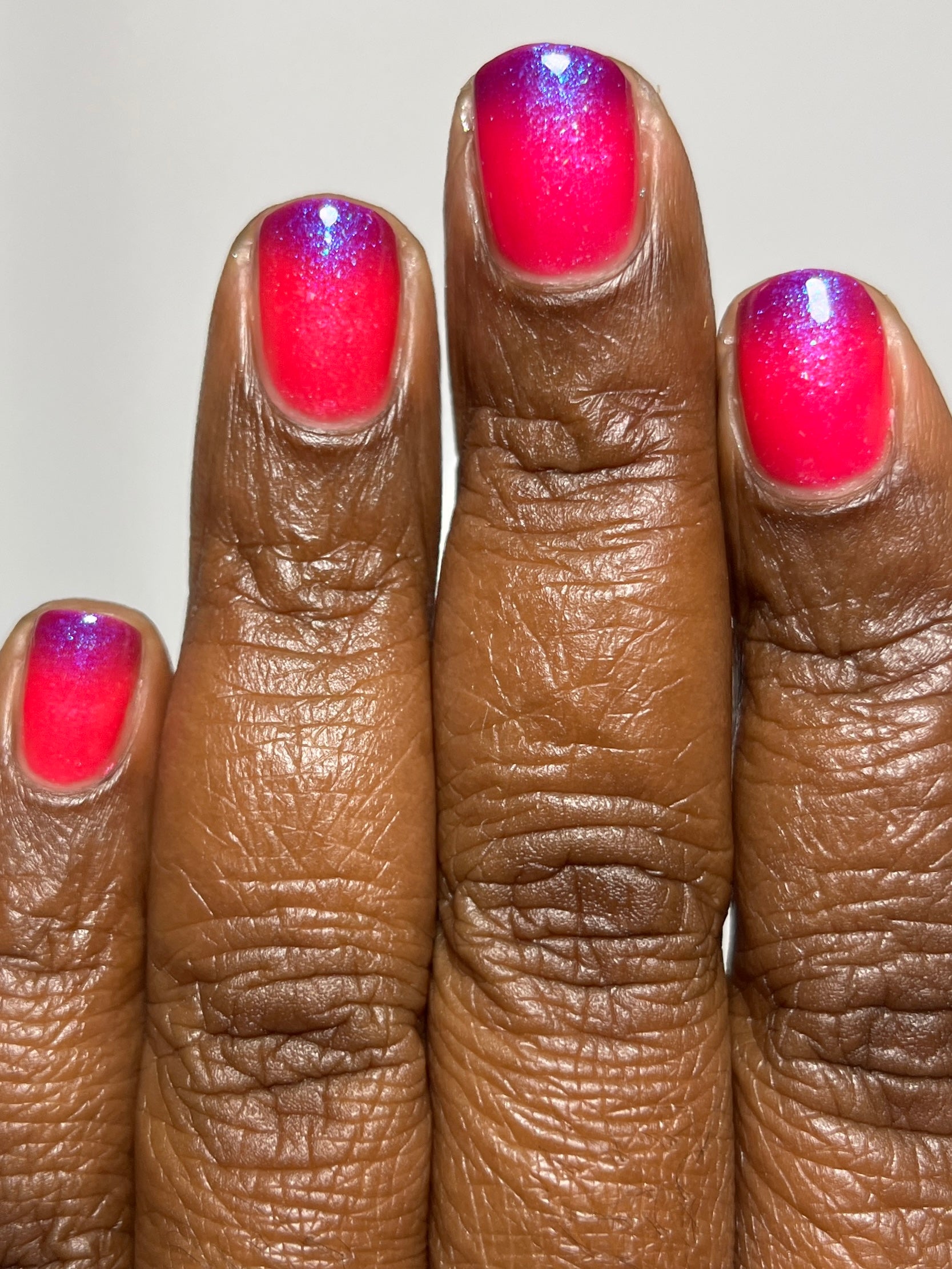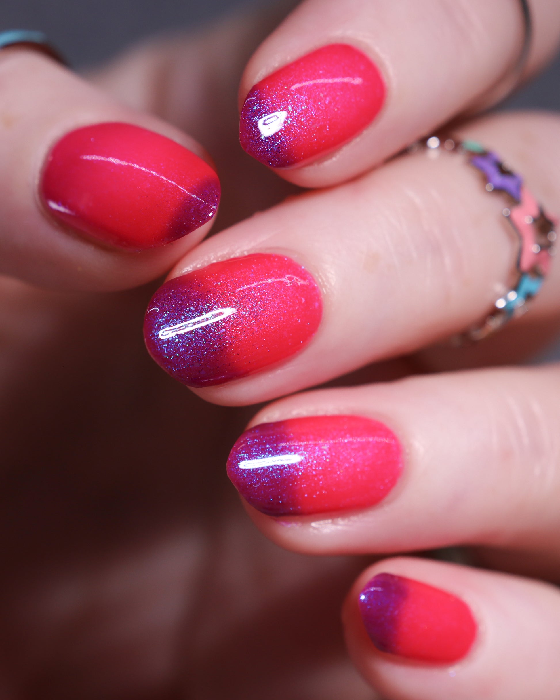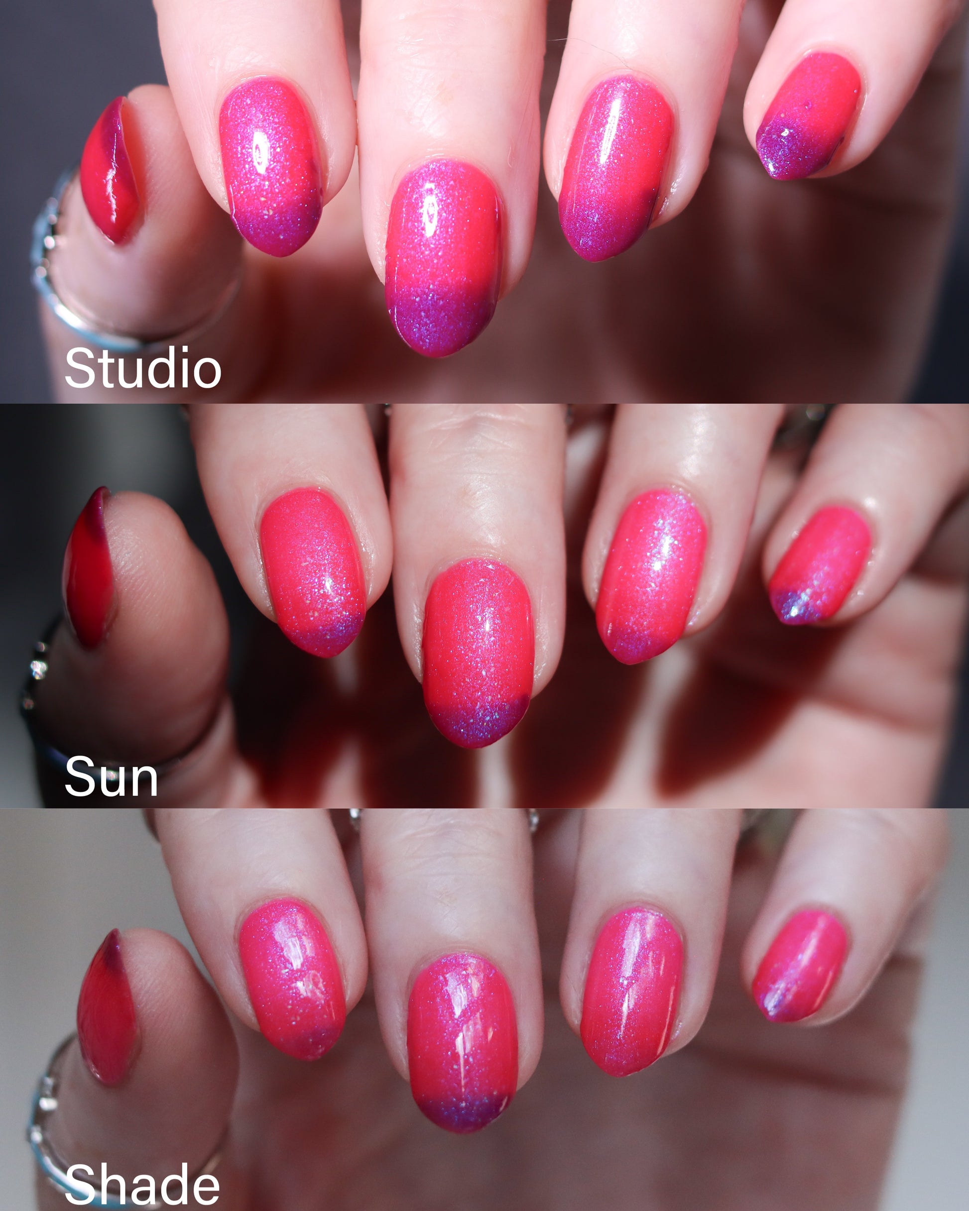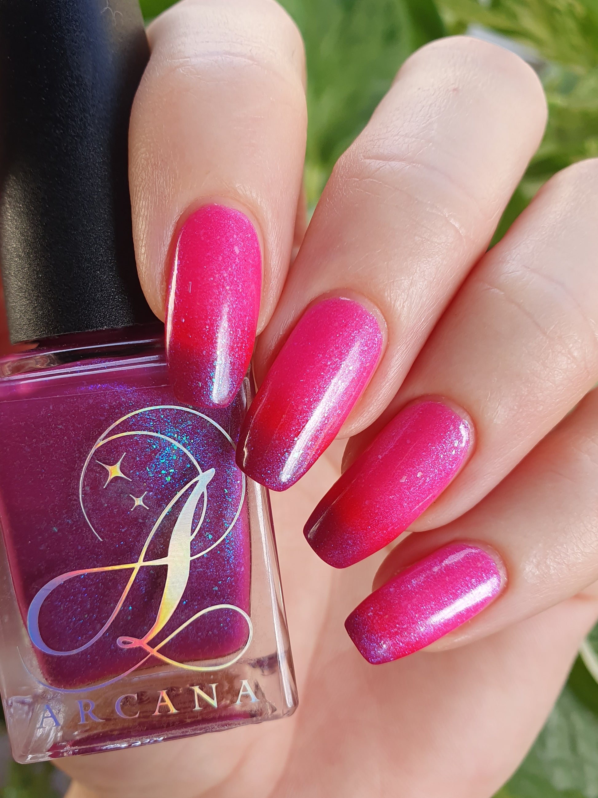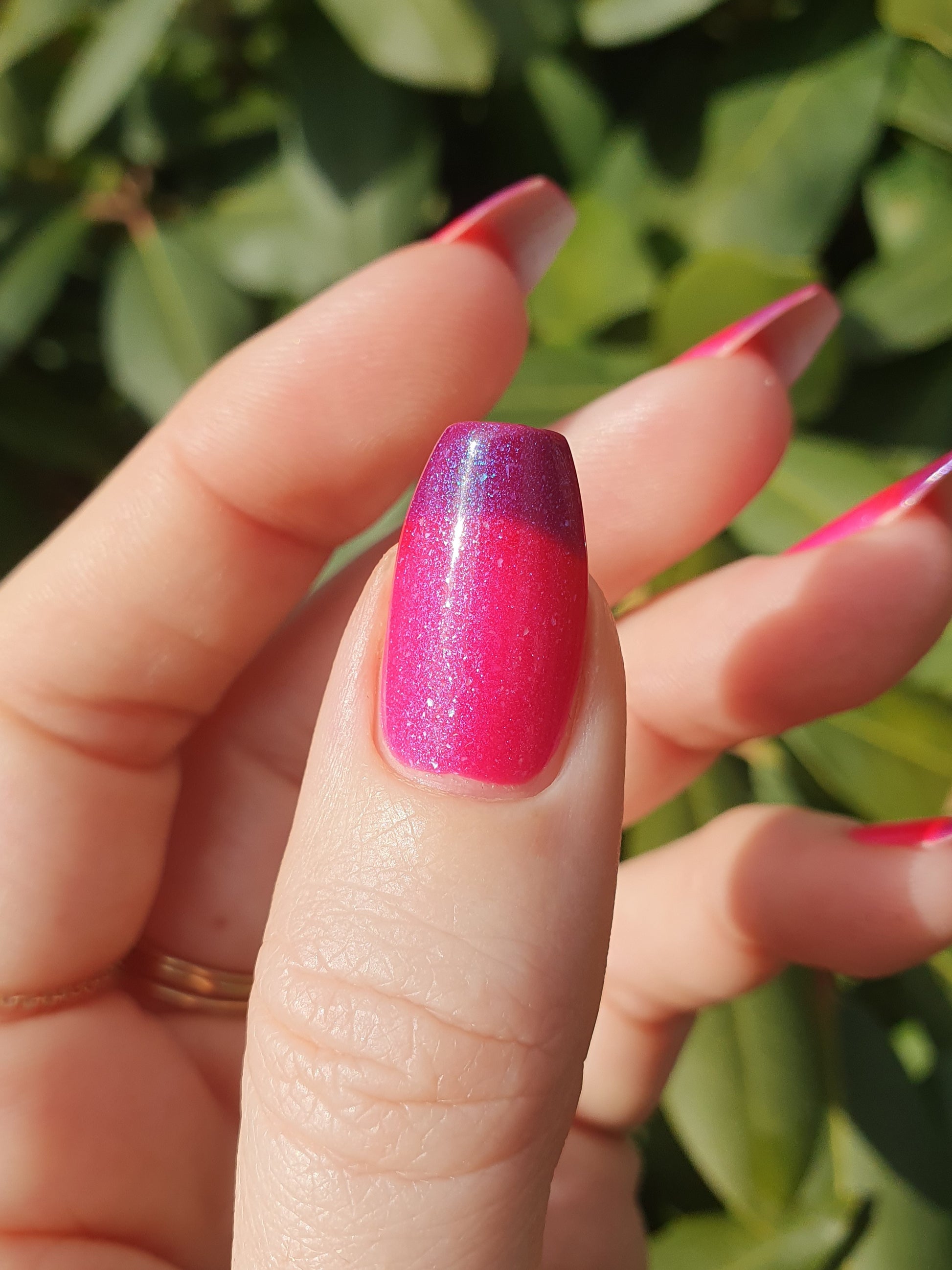 Sweeticorn is a bright pink (hot) to pinkish red (warm) to darkened magenta (cold) thermal base with blue to green shimmer and blue to green micro flakes.