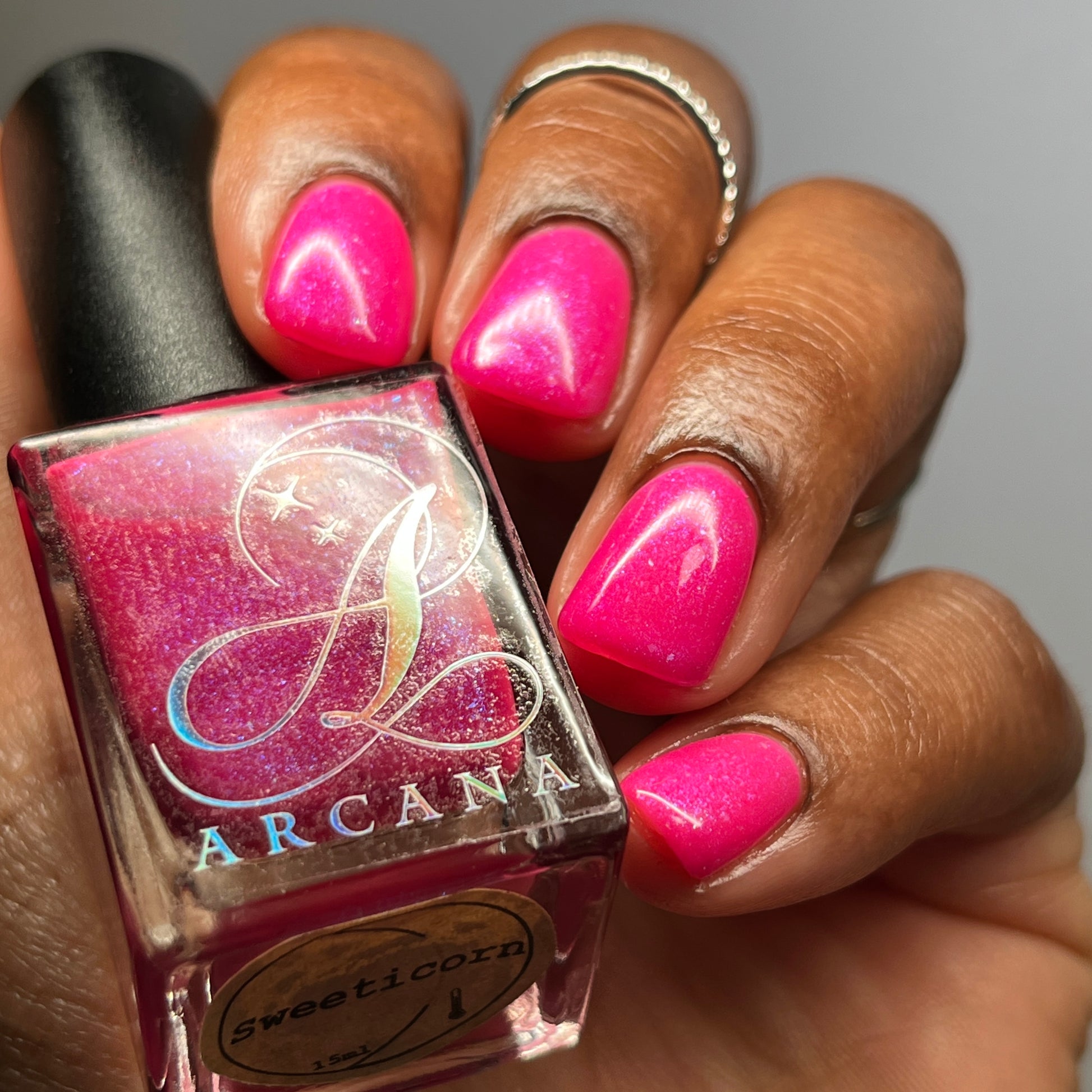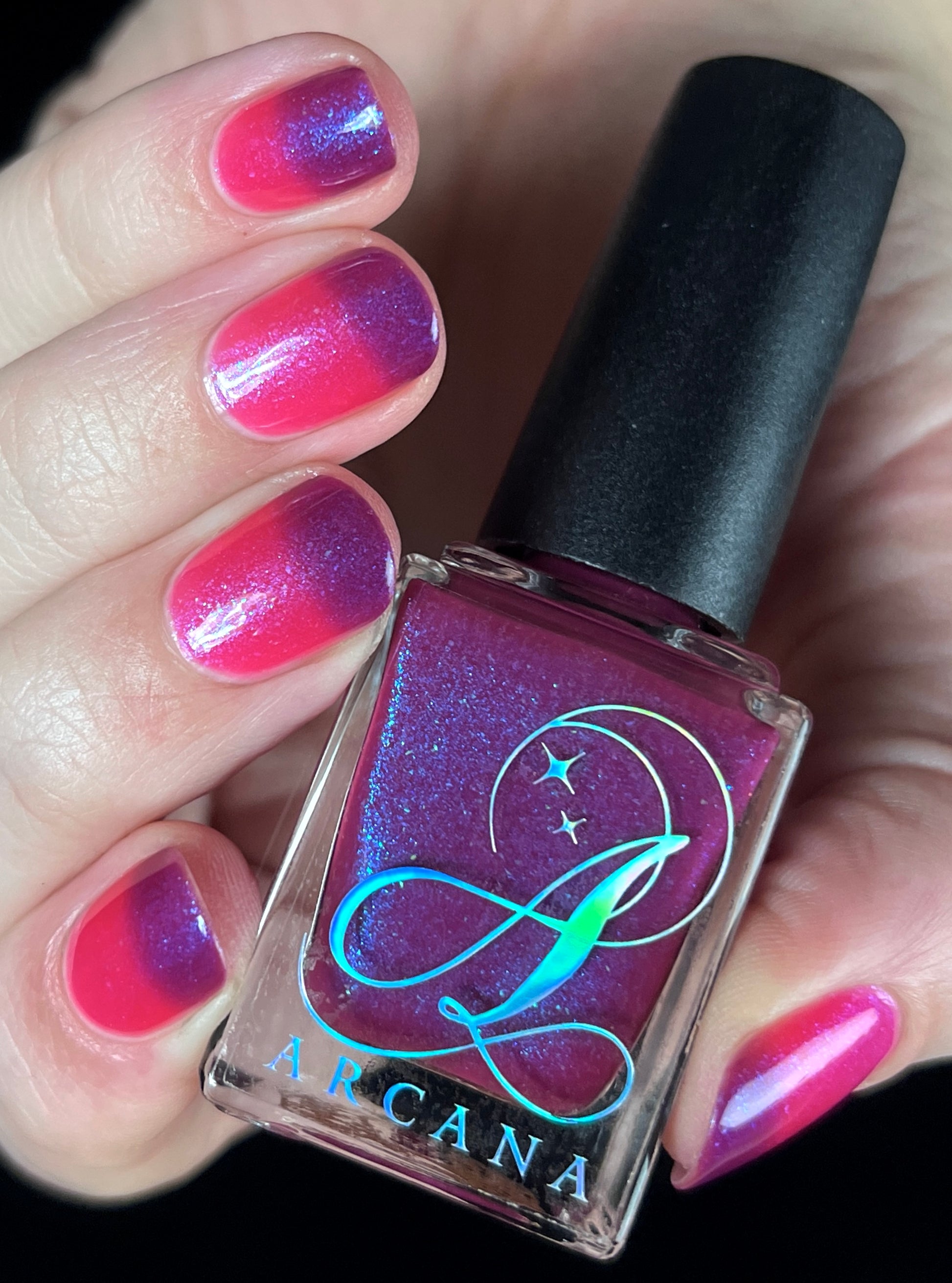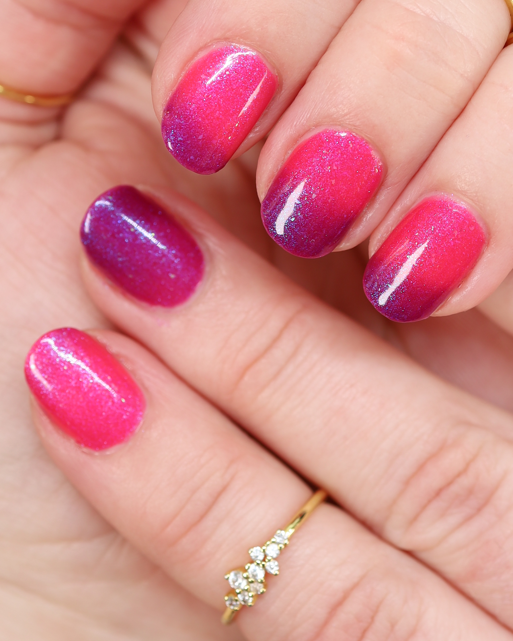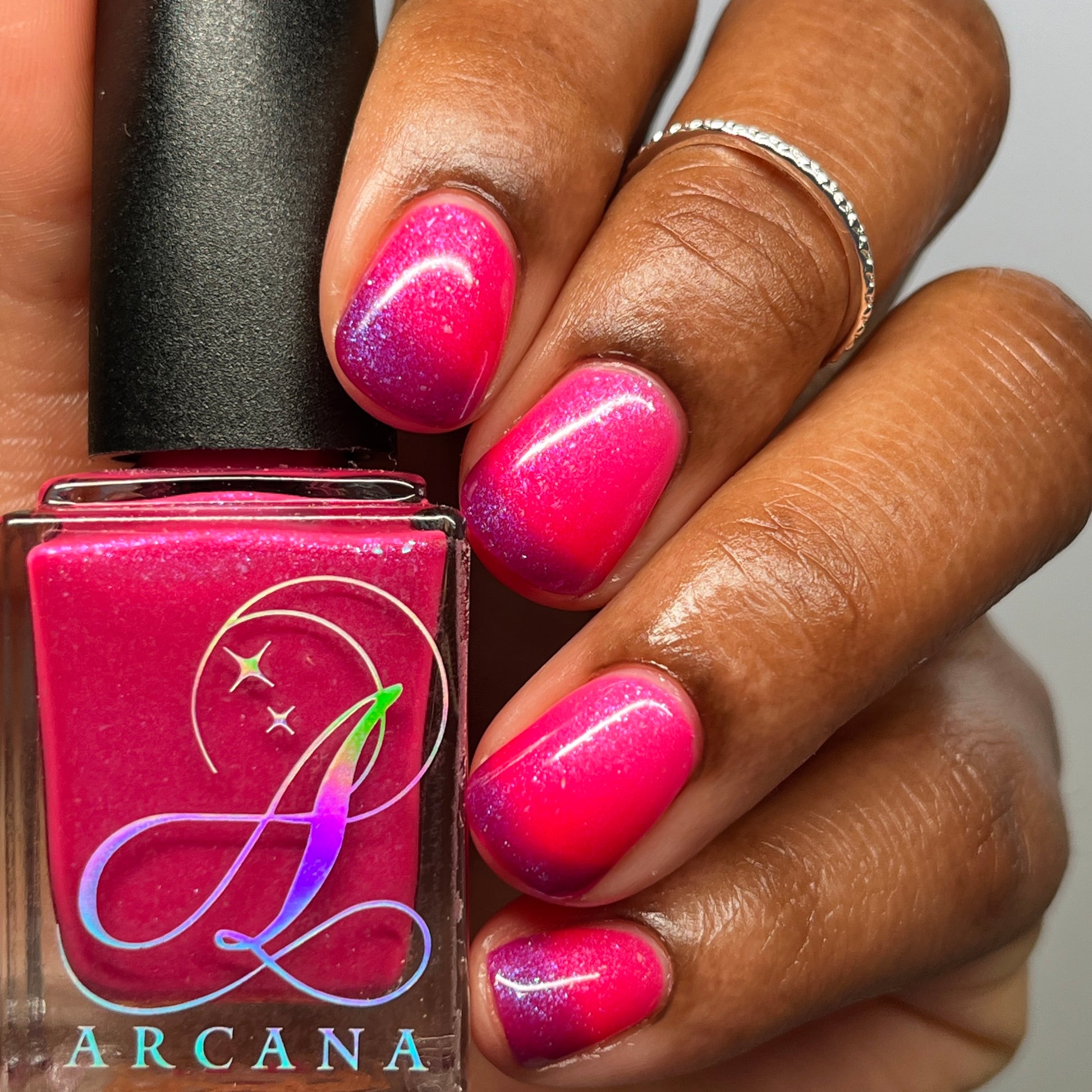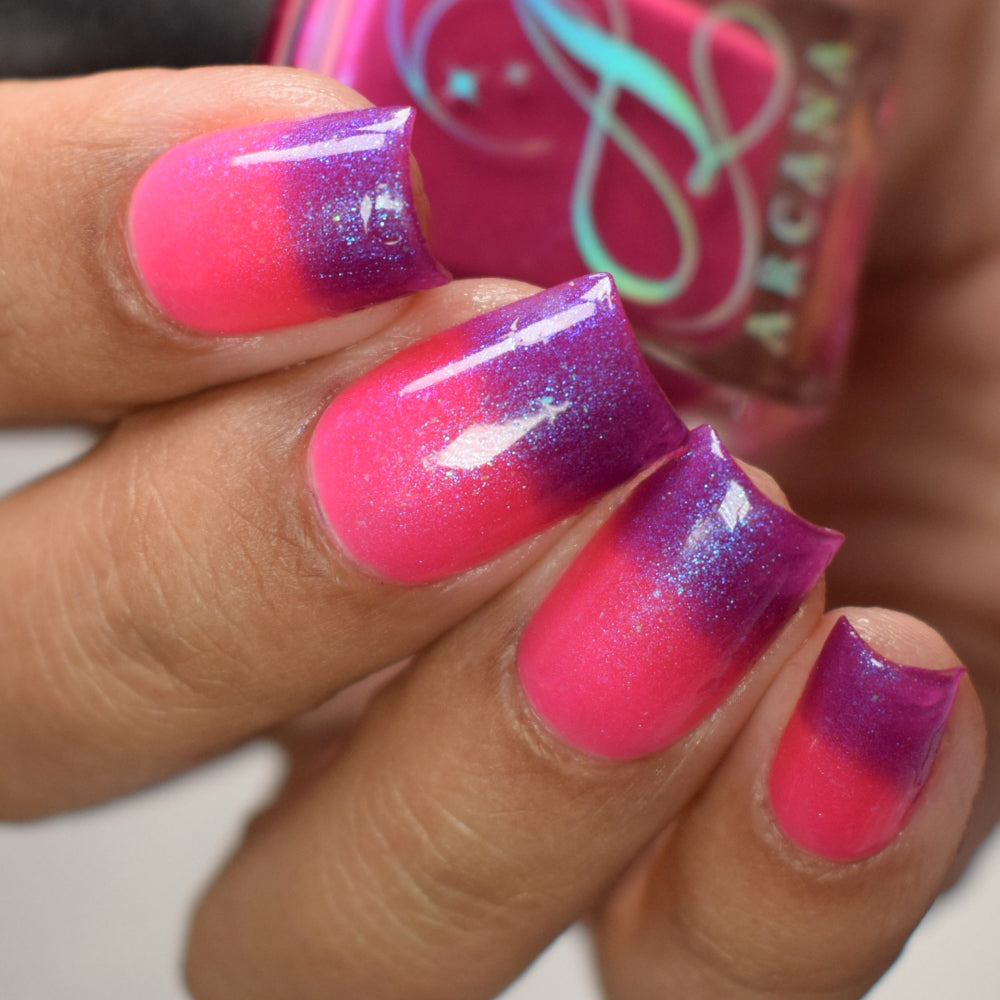 Sweeticorn is a bright pink (hot) to pinkish red (warm) to darkened magenta (cold) thermal base with blue to green shimmer and blue to green micro flakes.
