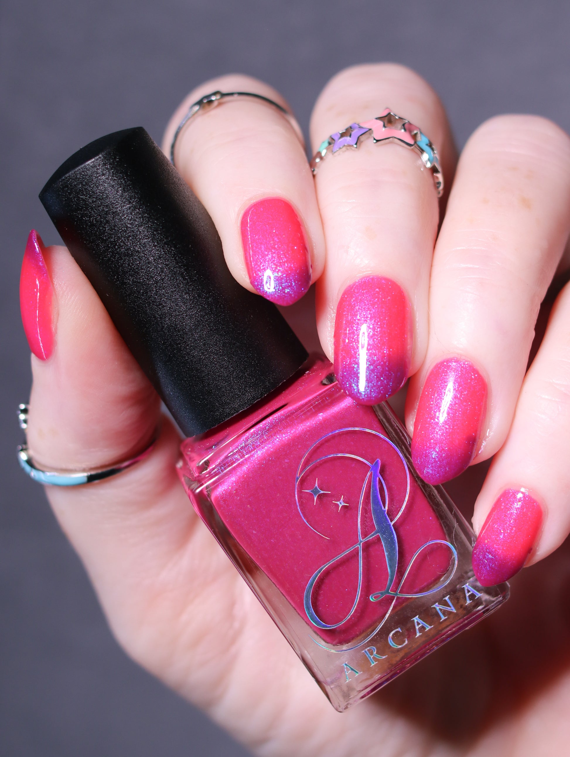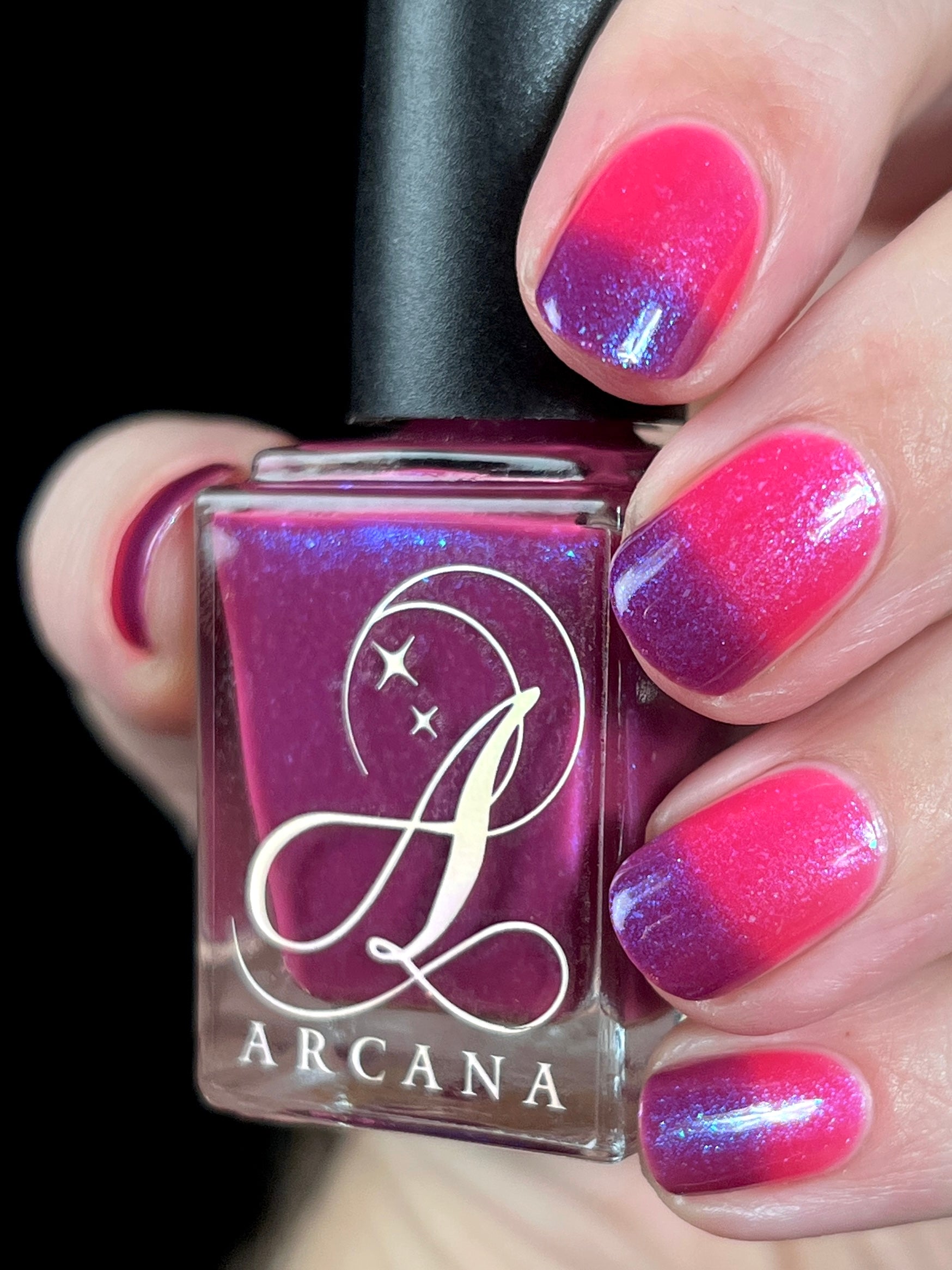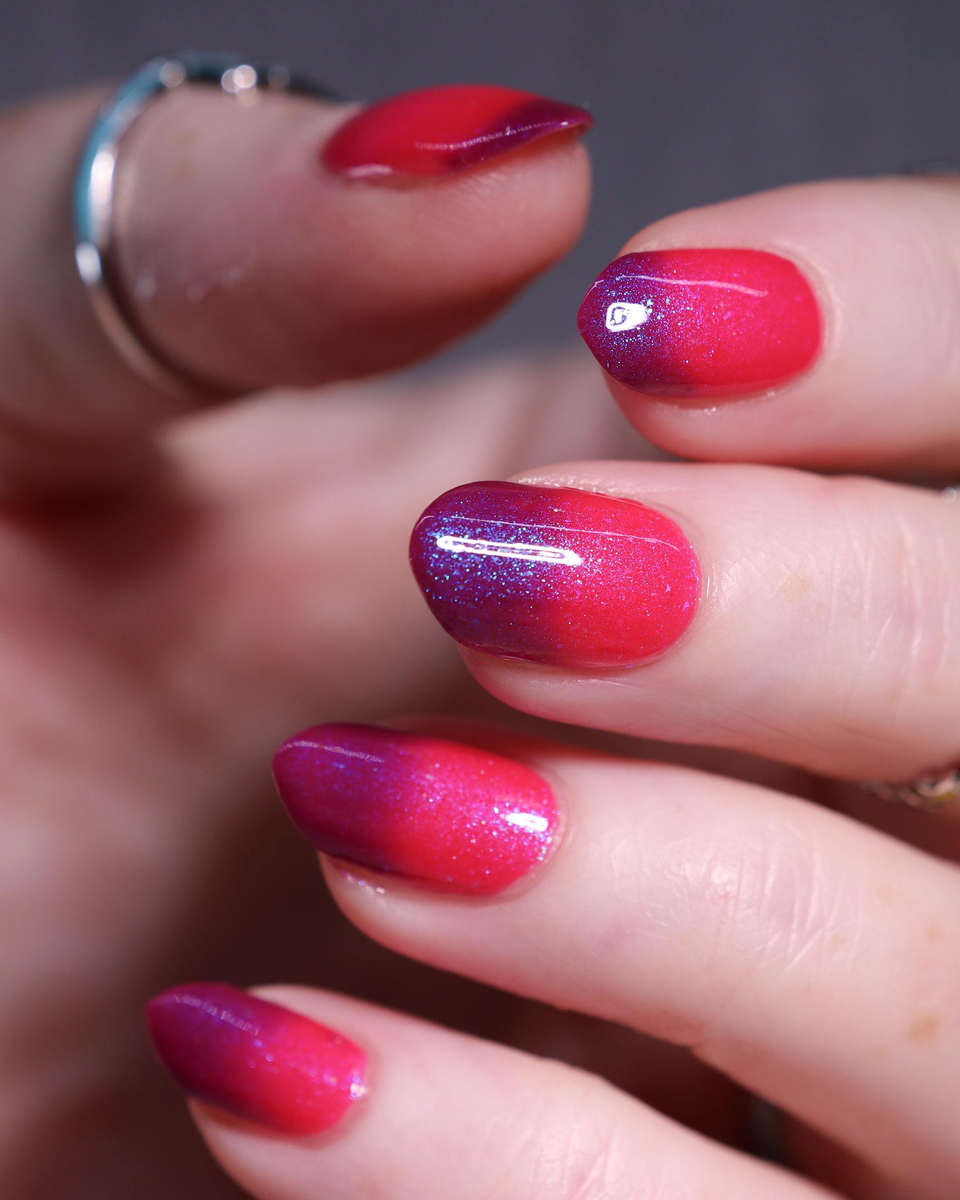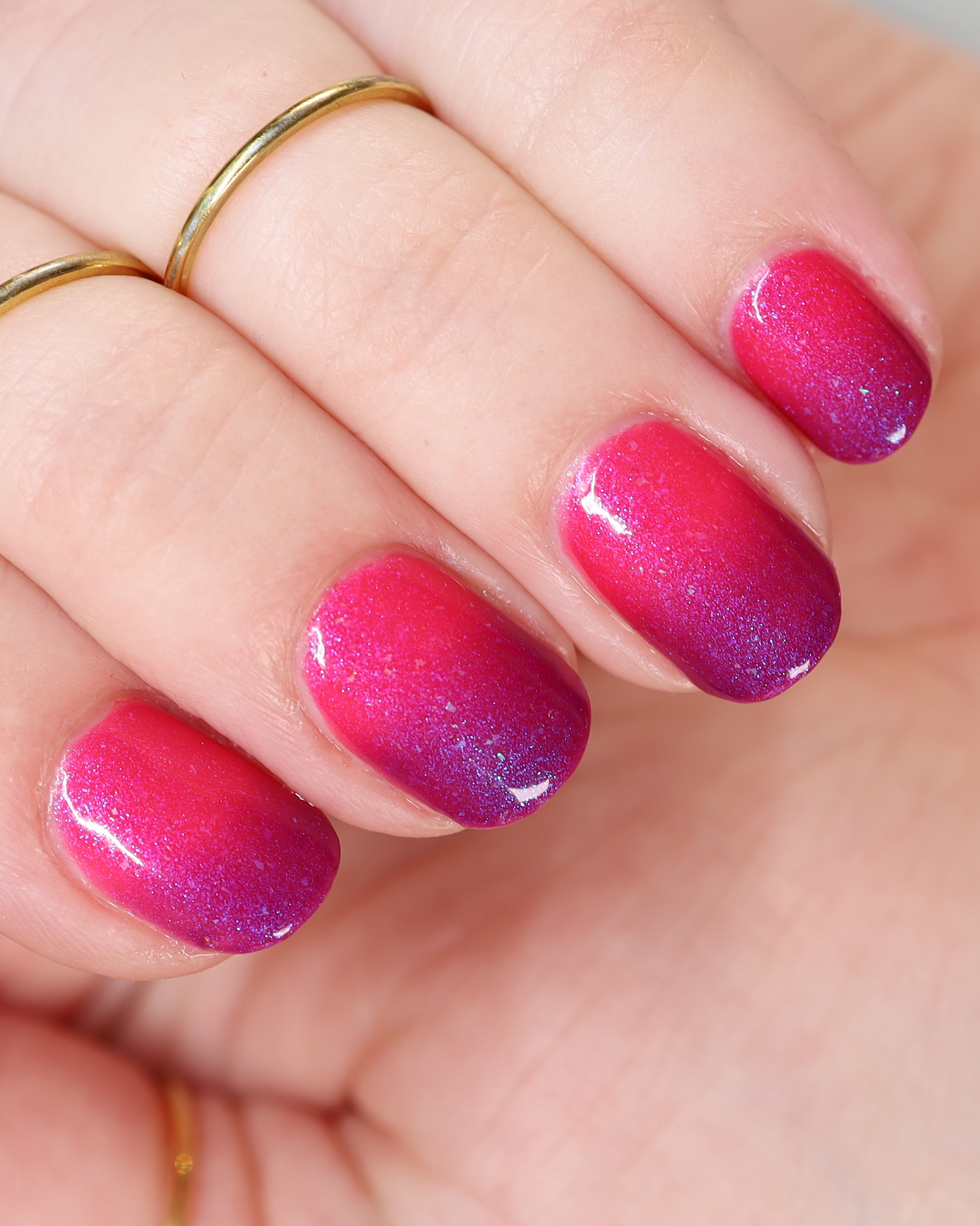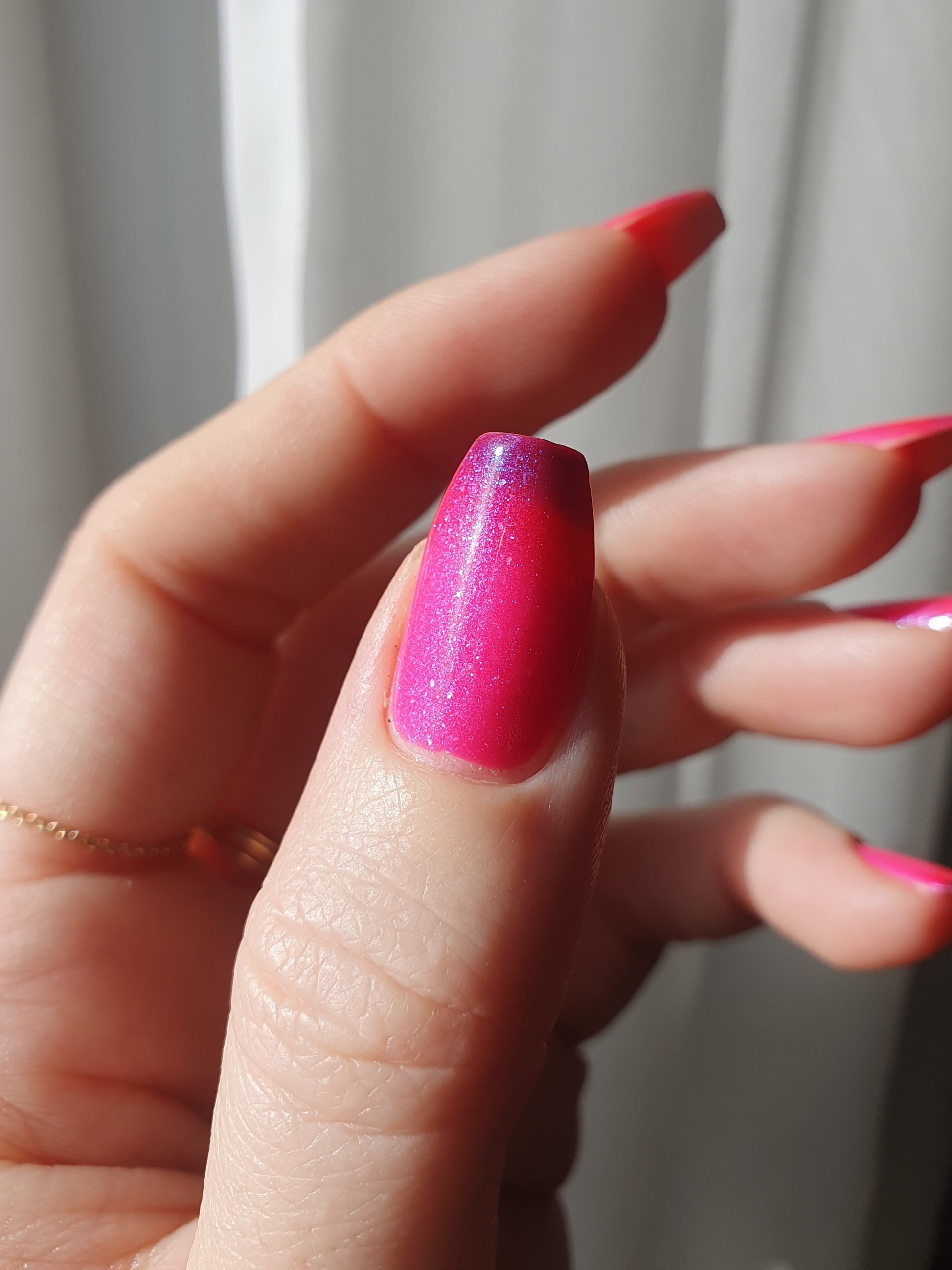 Sweeticorn is a bright pink (hot) to pinkish red (warm) to darkened magenta (cold) thermal base with blue to green shimmer and blue to green micro flakes.