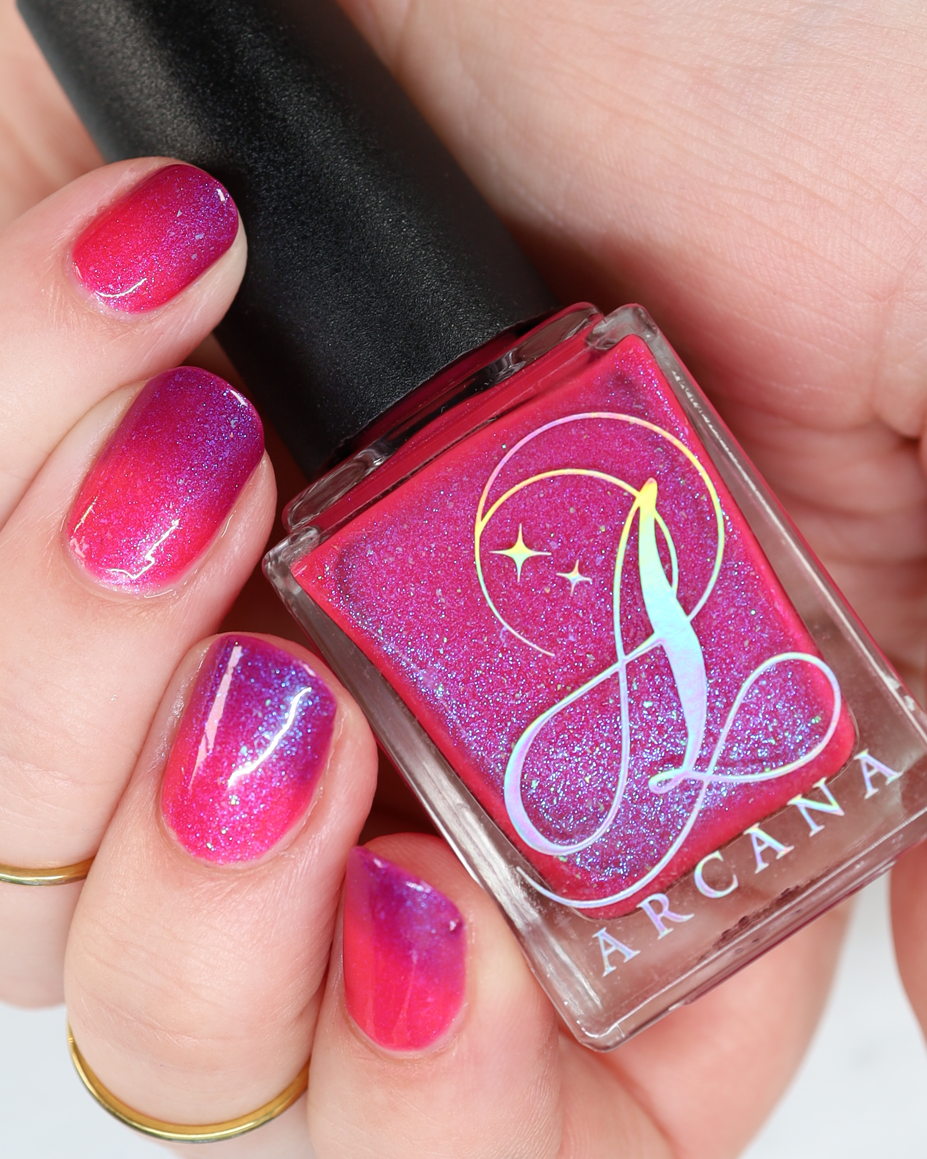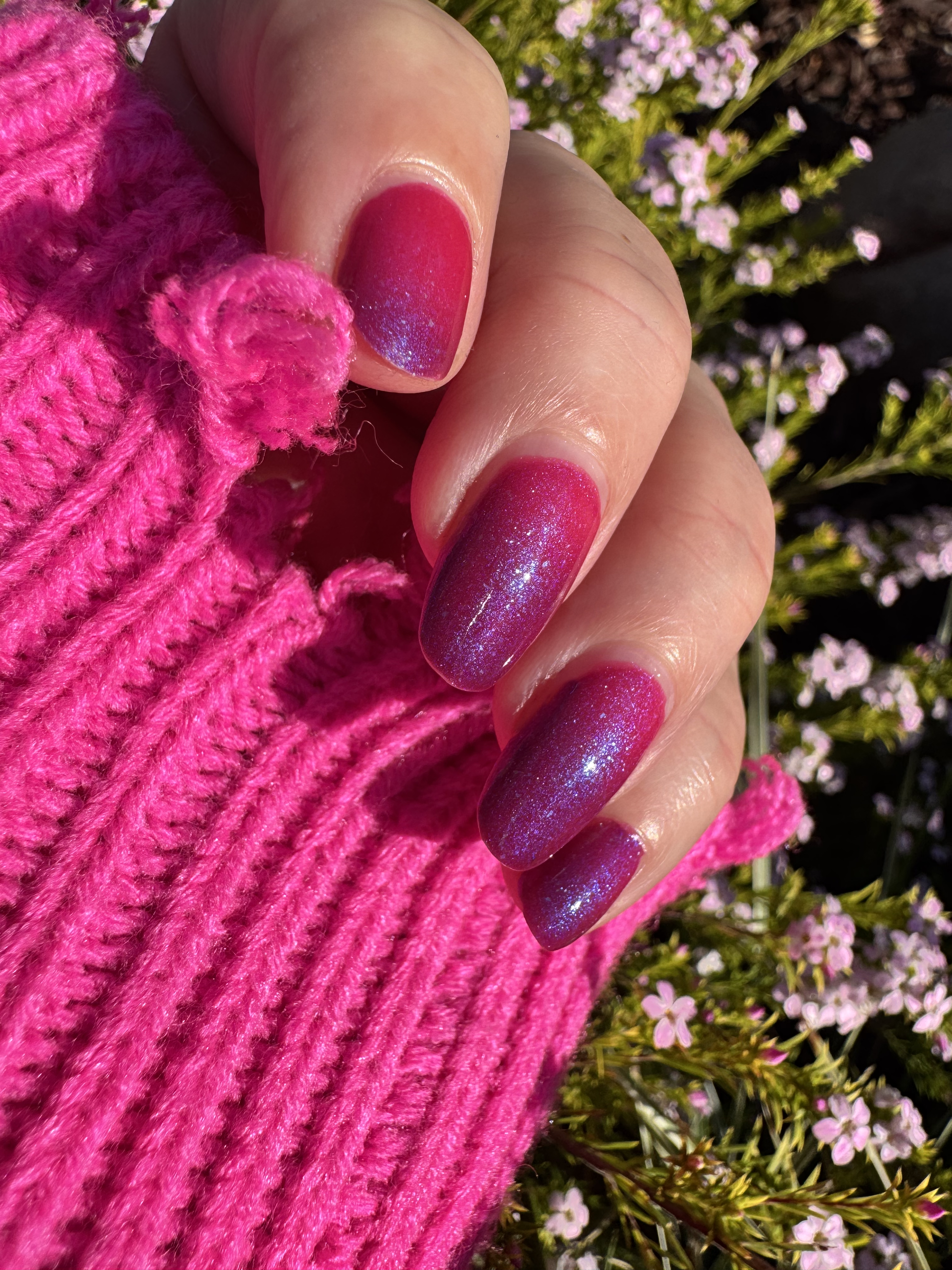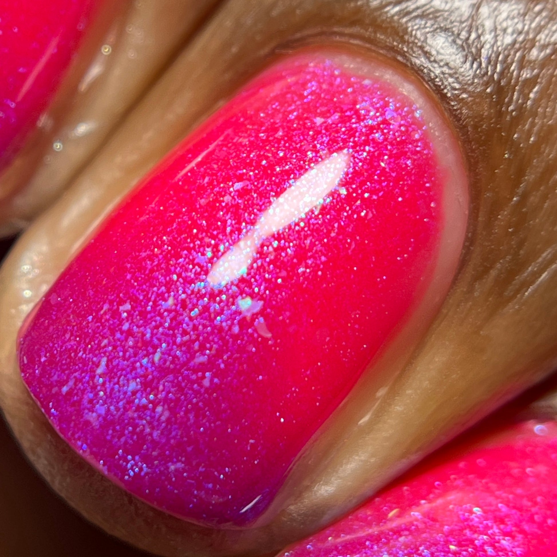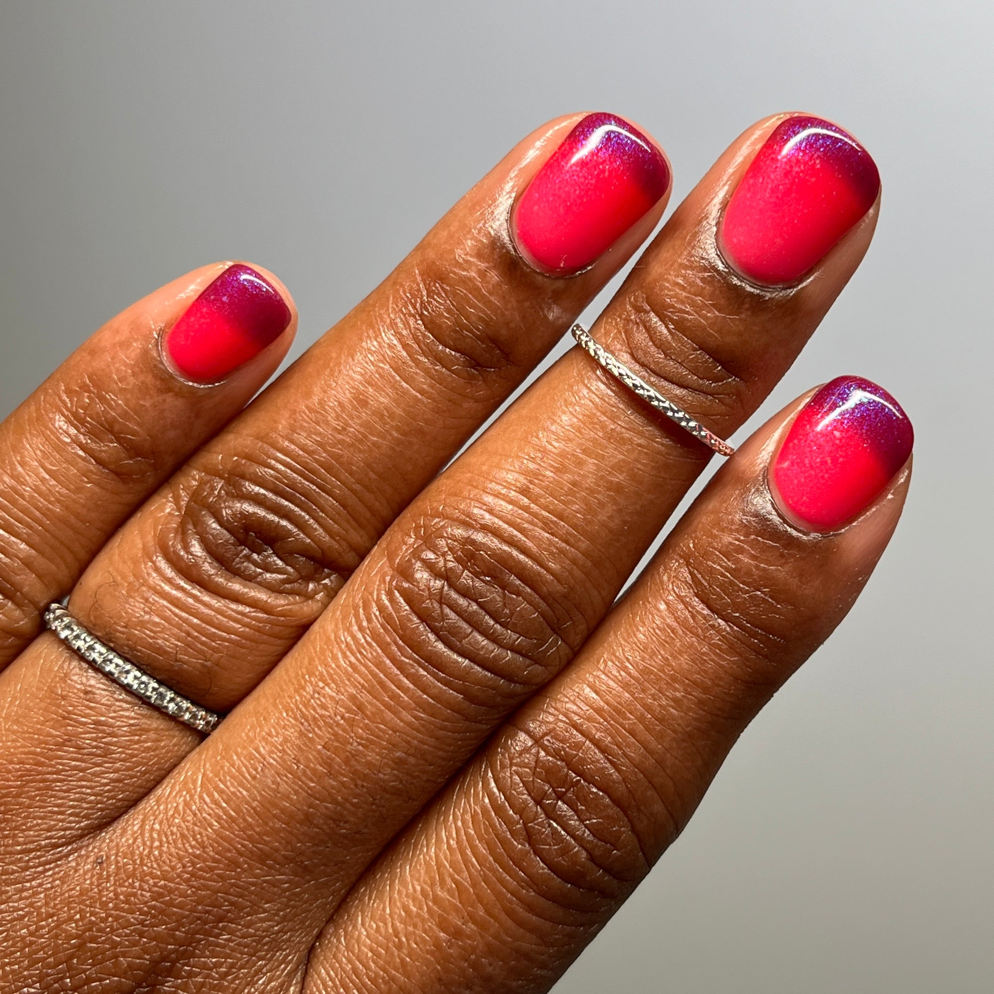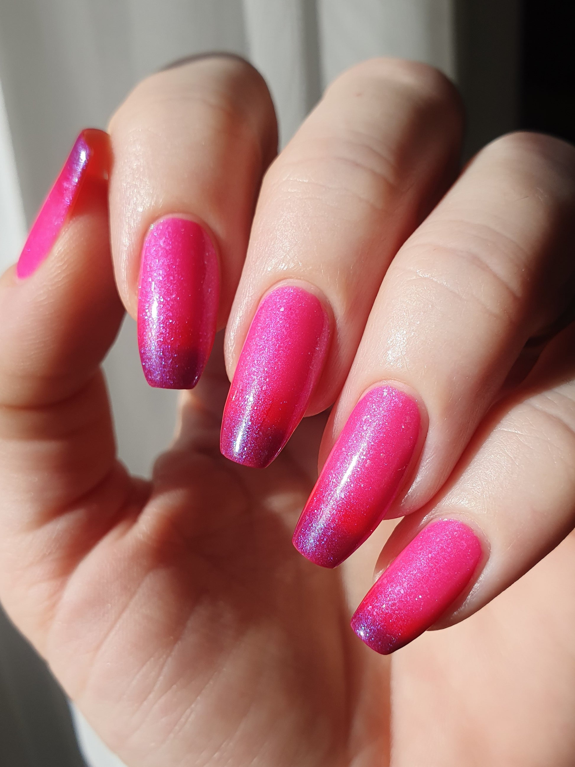 Sweeticorn is a bright pink (hot) to pinkish red (warm) to darkened magenta (cold) thermal base with blue to green shimmer and blue to green micro flakes.