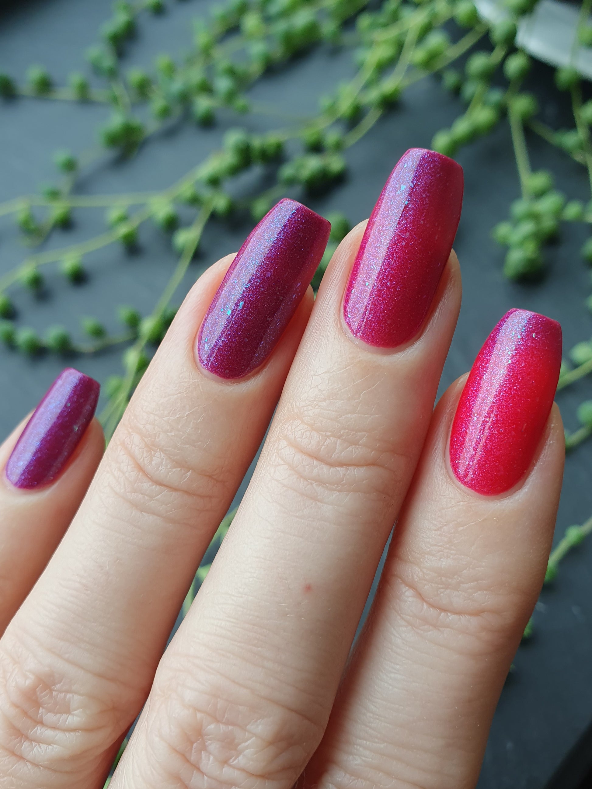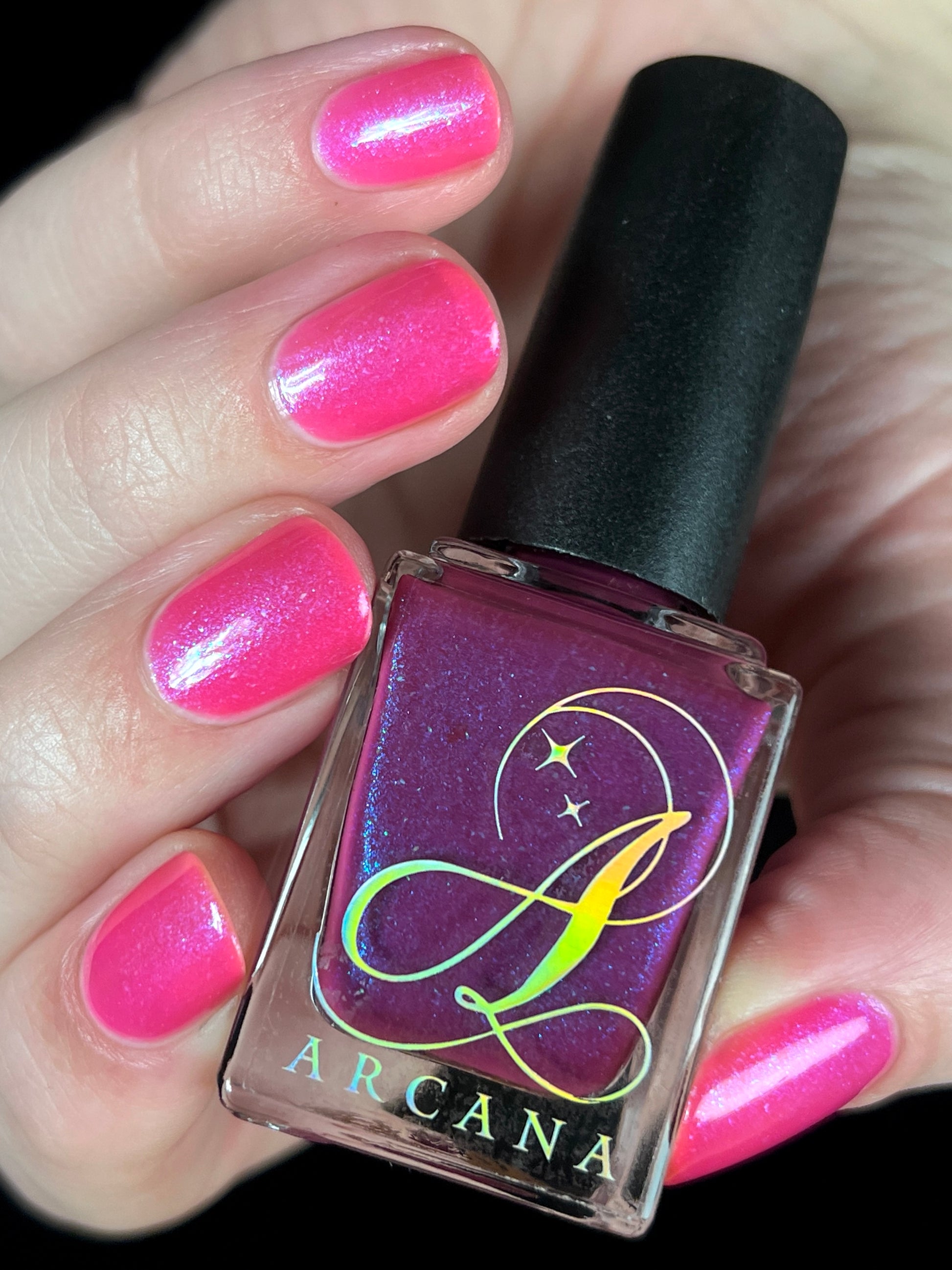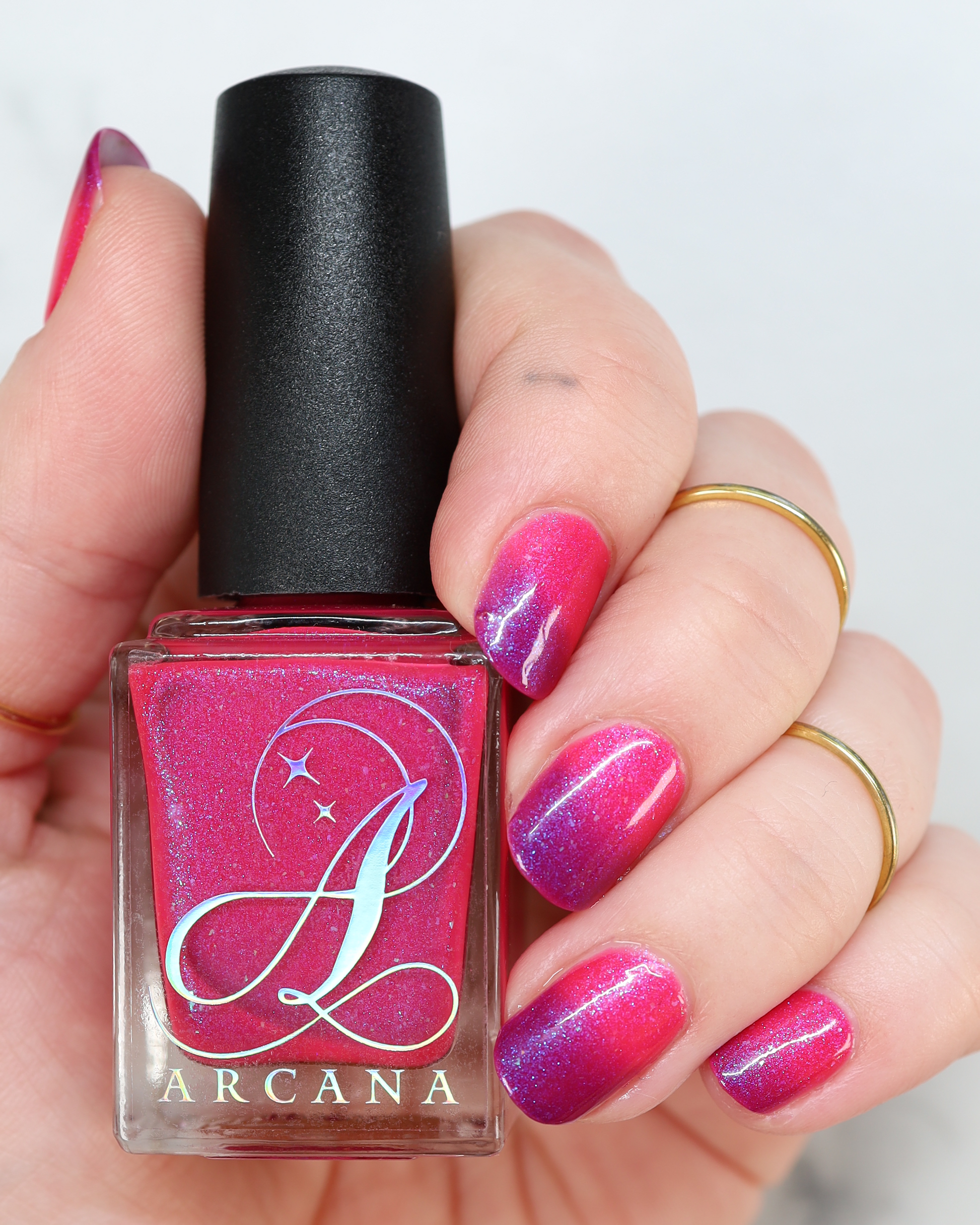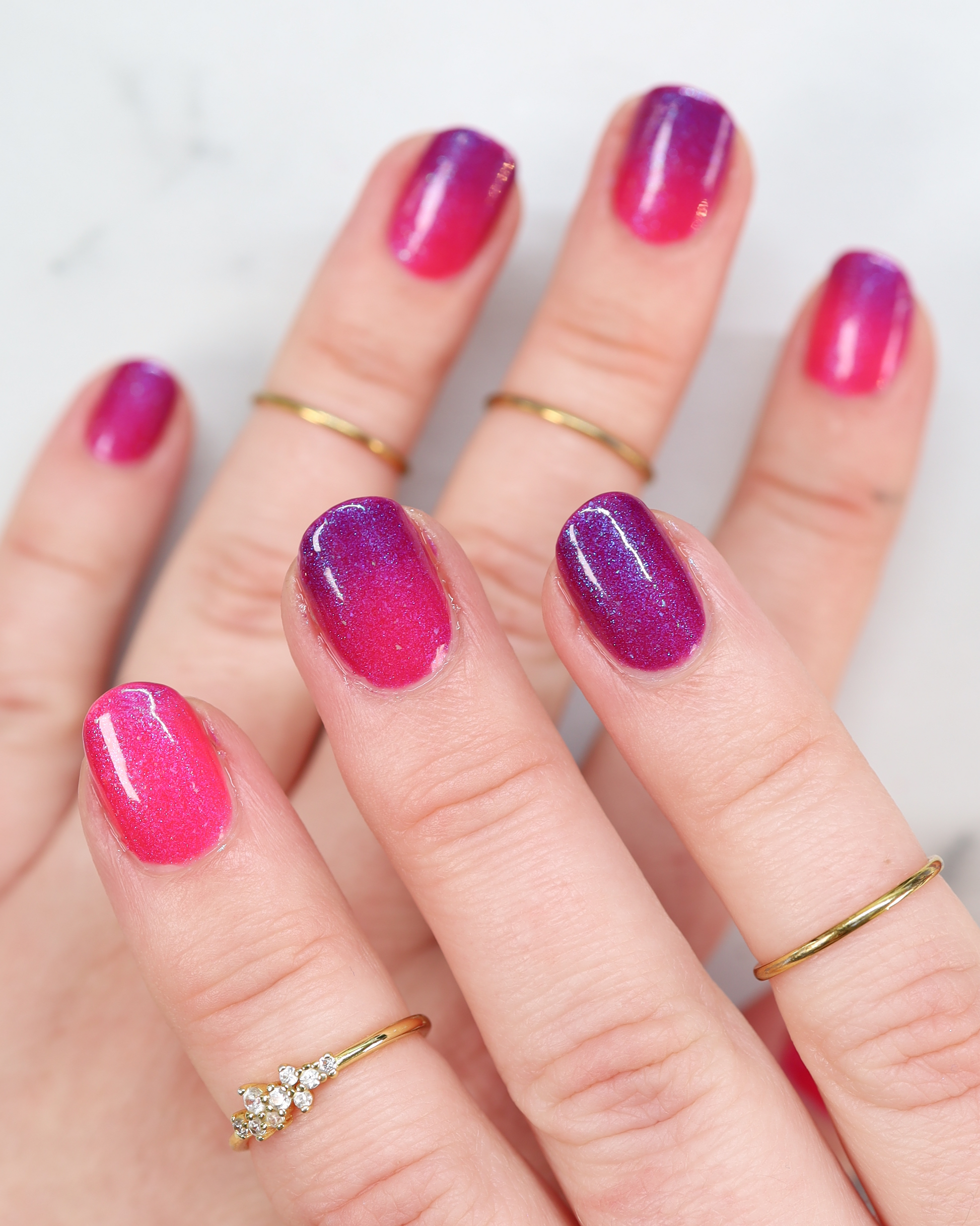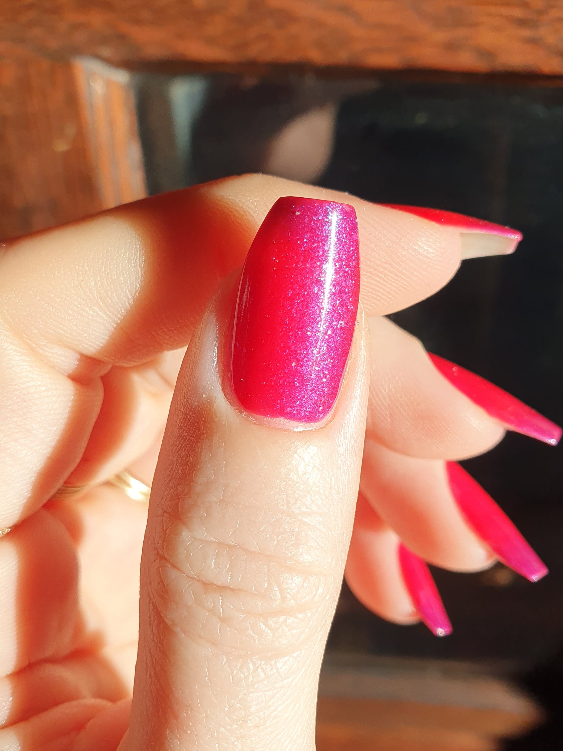 Sweeticorn is a bright pink (hot) to pinkish red (warm) to darkened magenta (cold) thermal base with blue to green shimmer and blue to green micro flakes.
