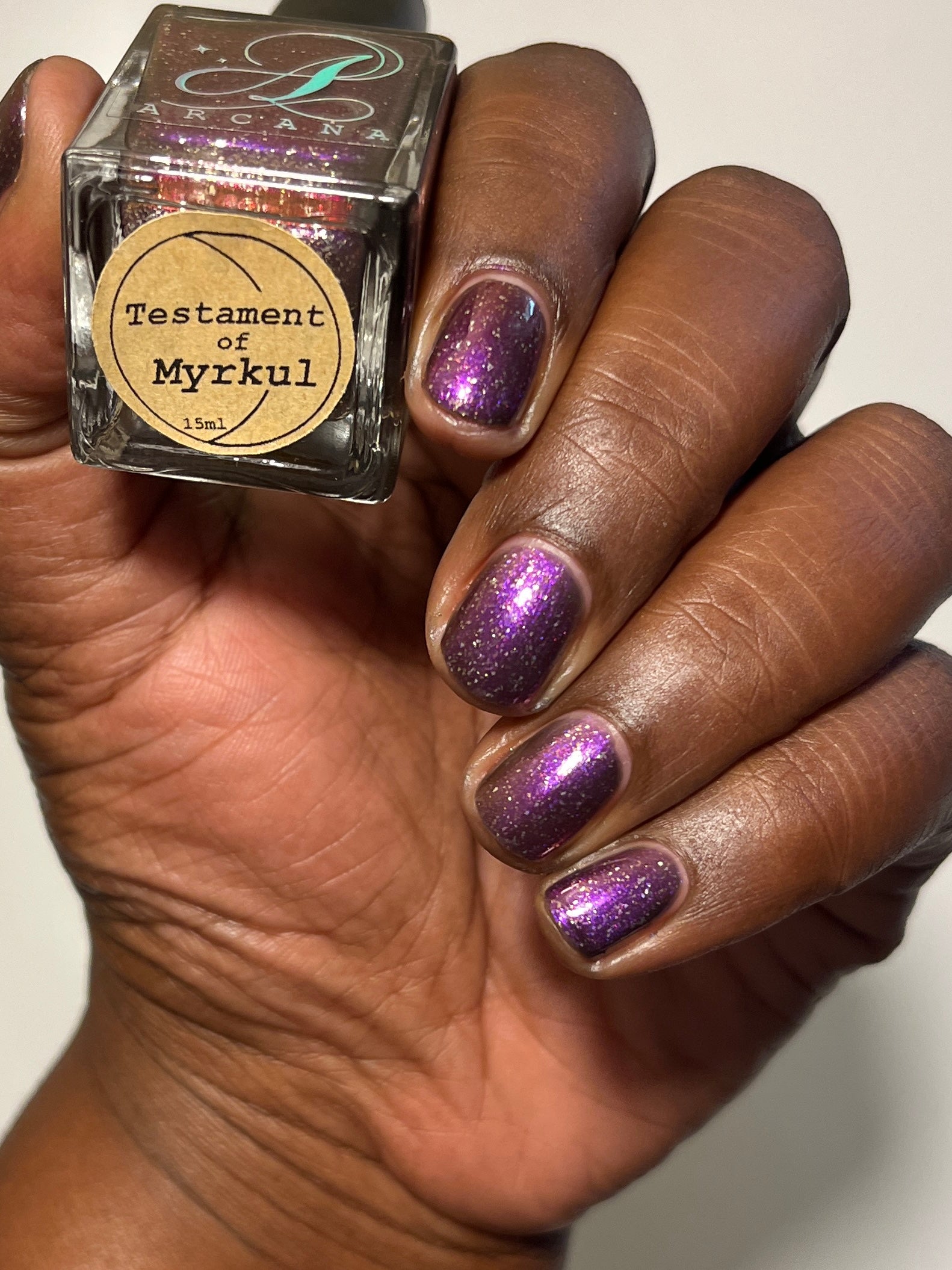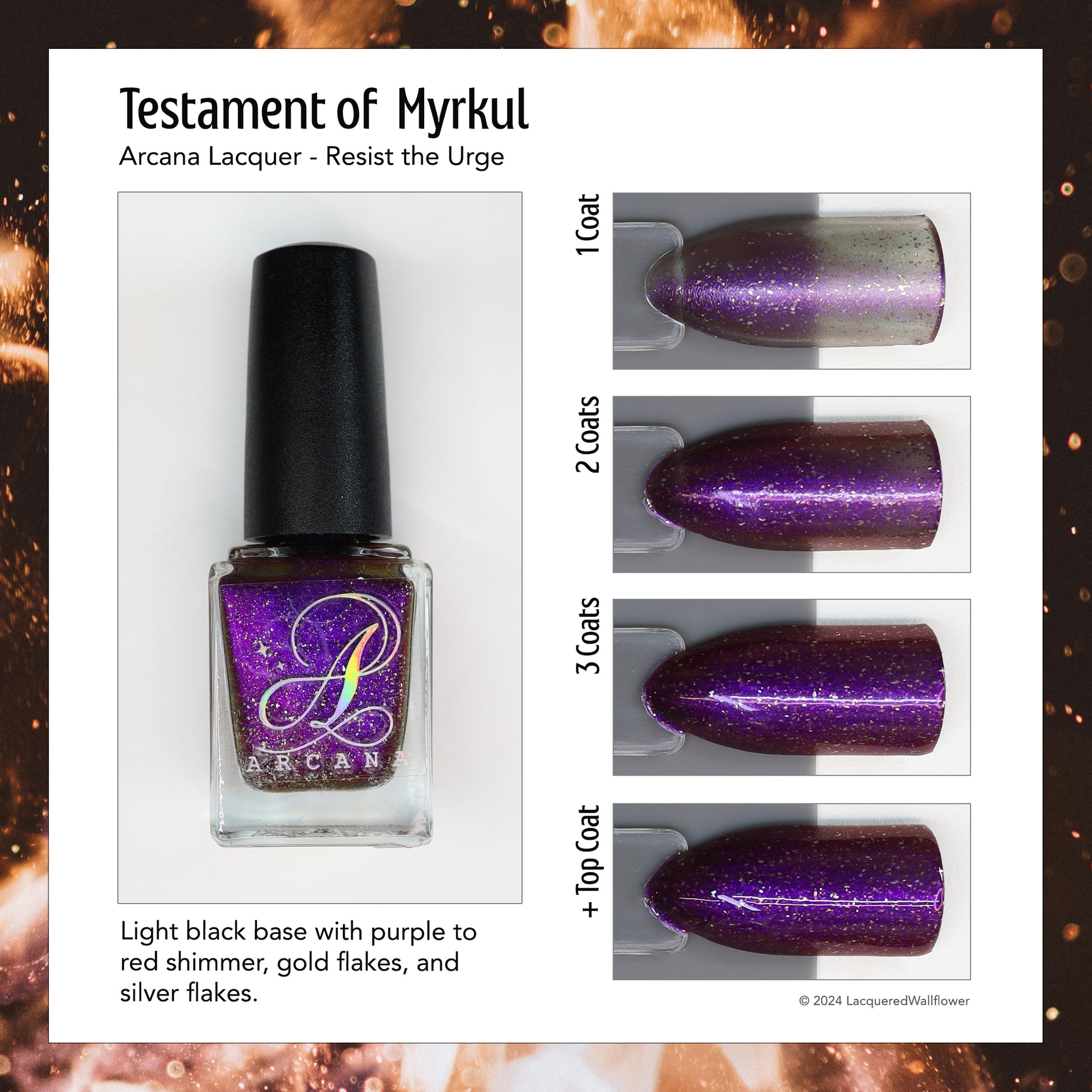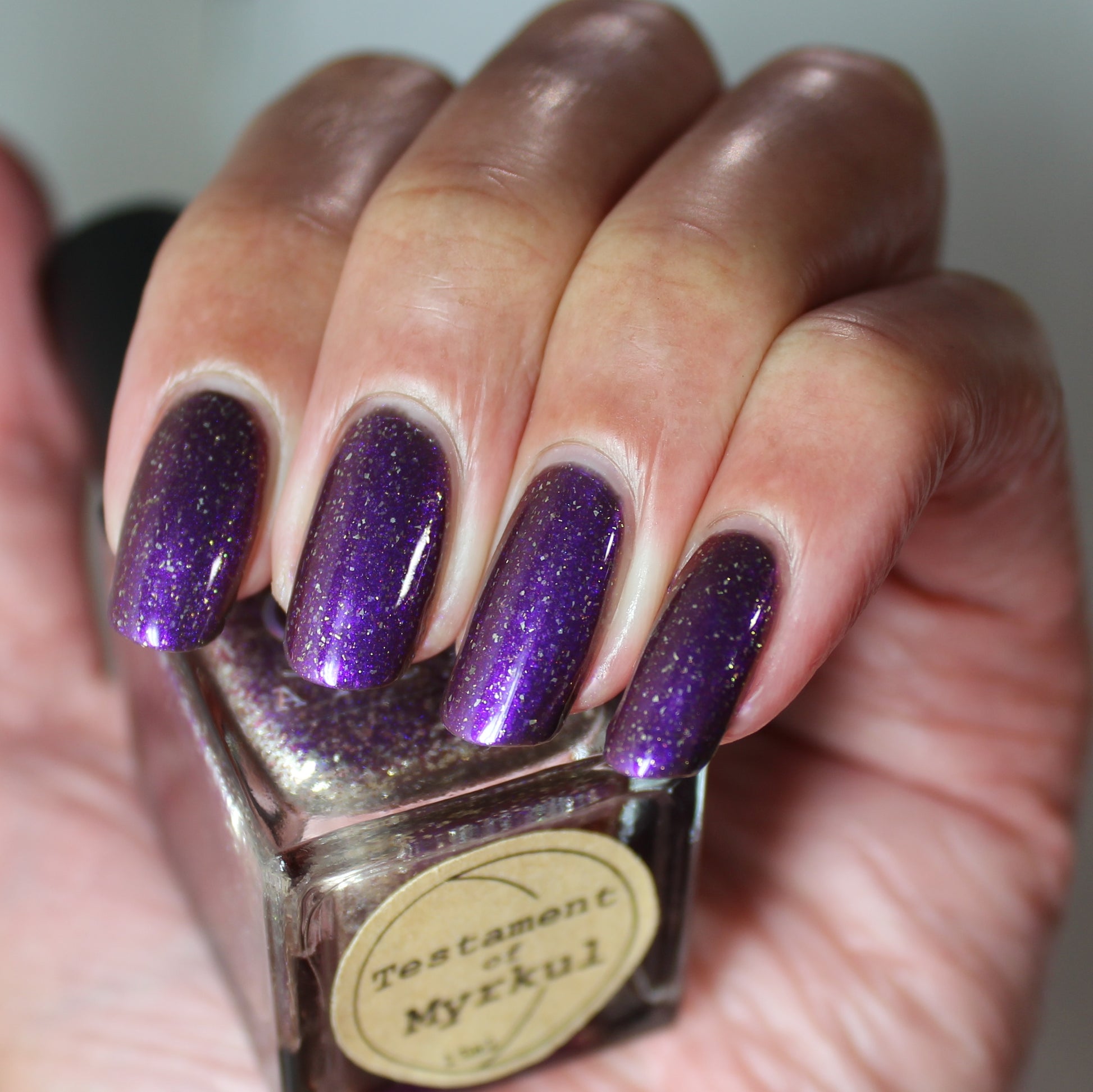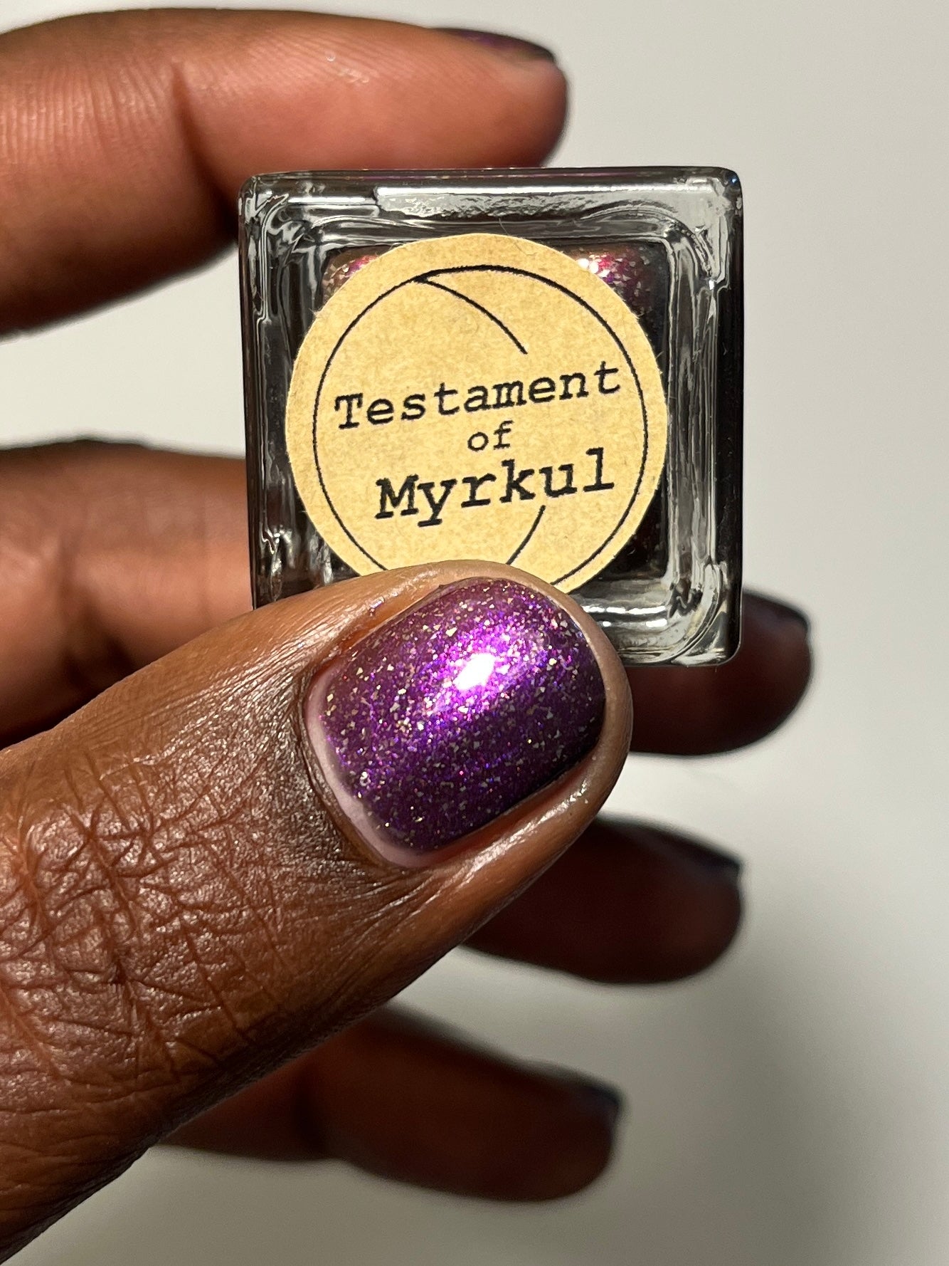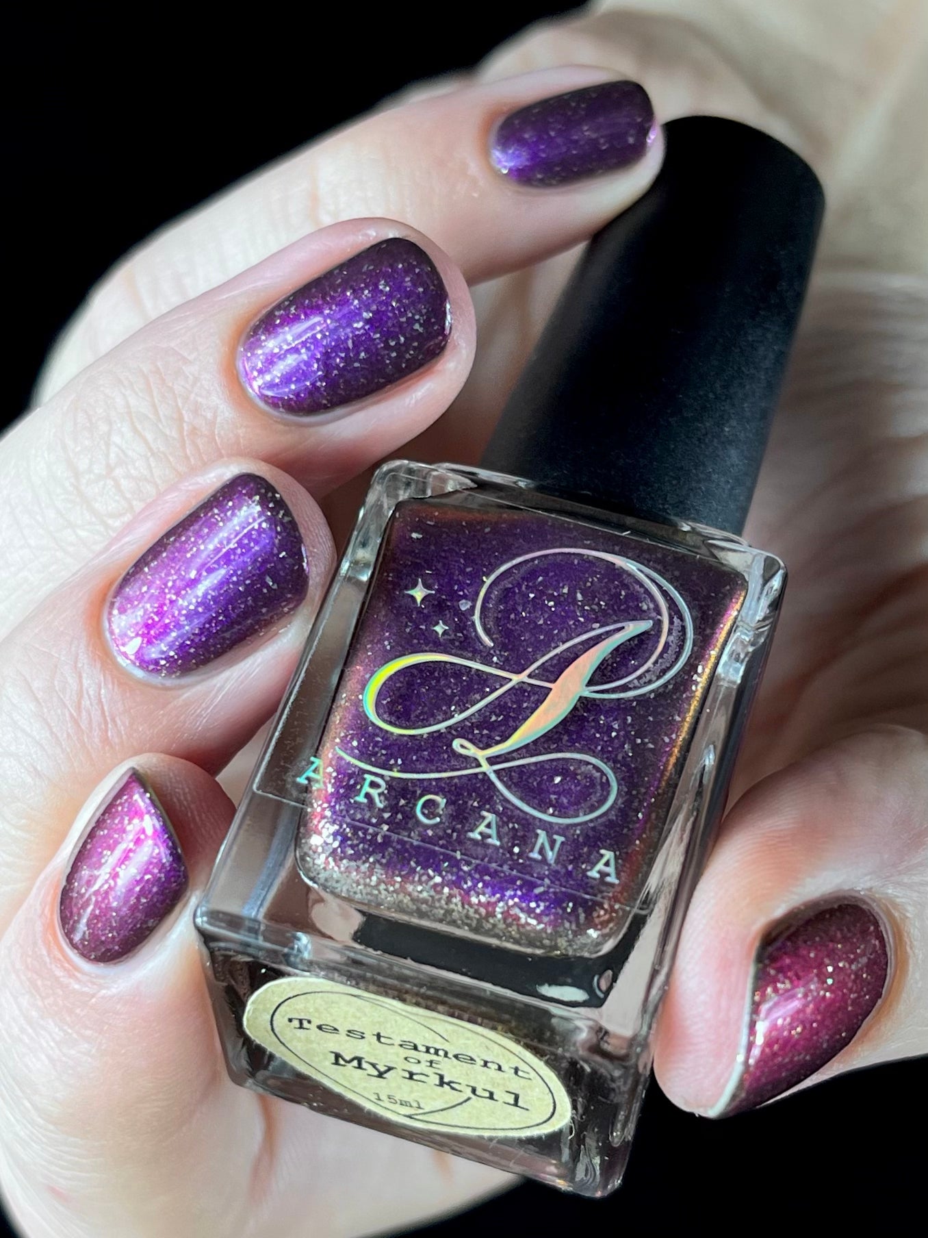 Testament of Myrkul is a light black base with purple to red shimmer, gold flakes, and silver flakes.