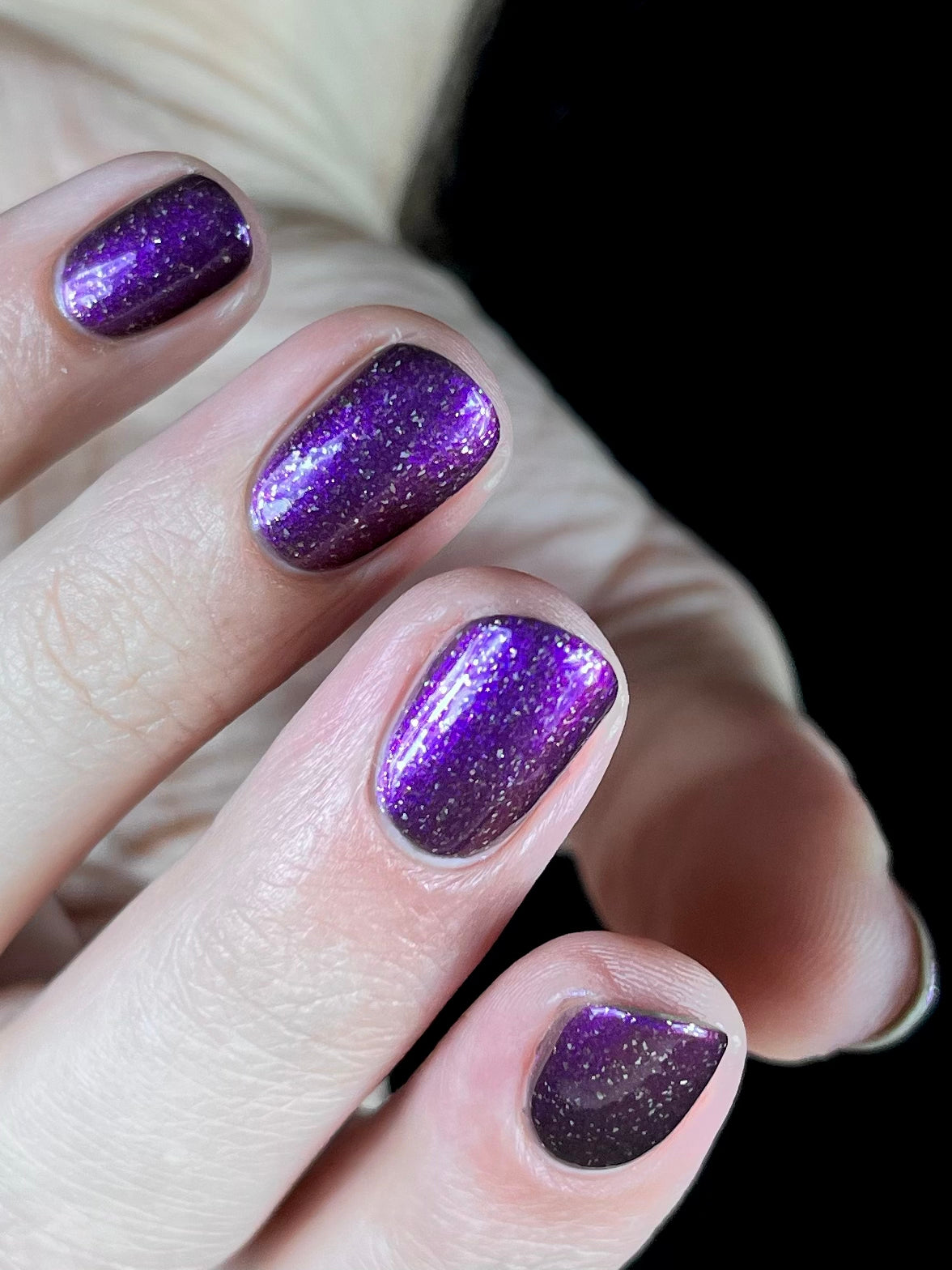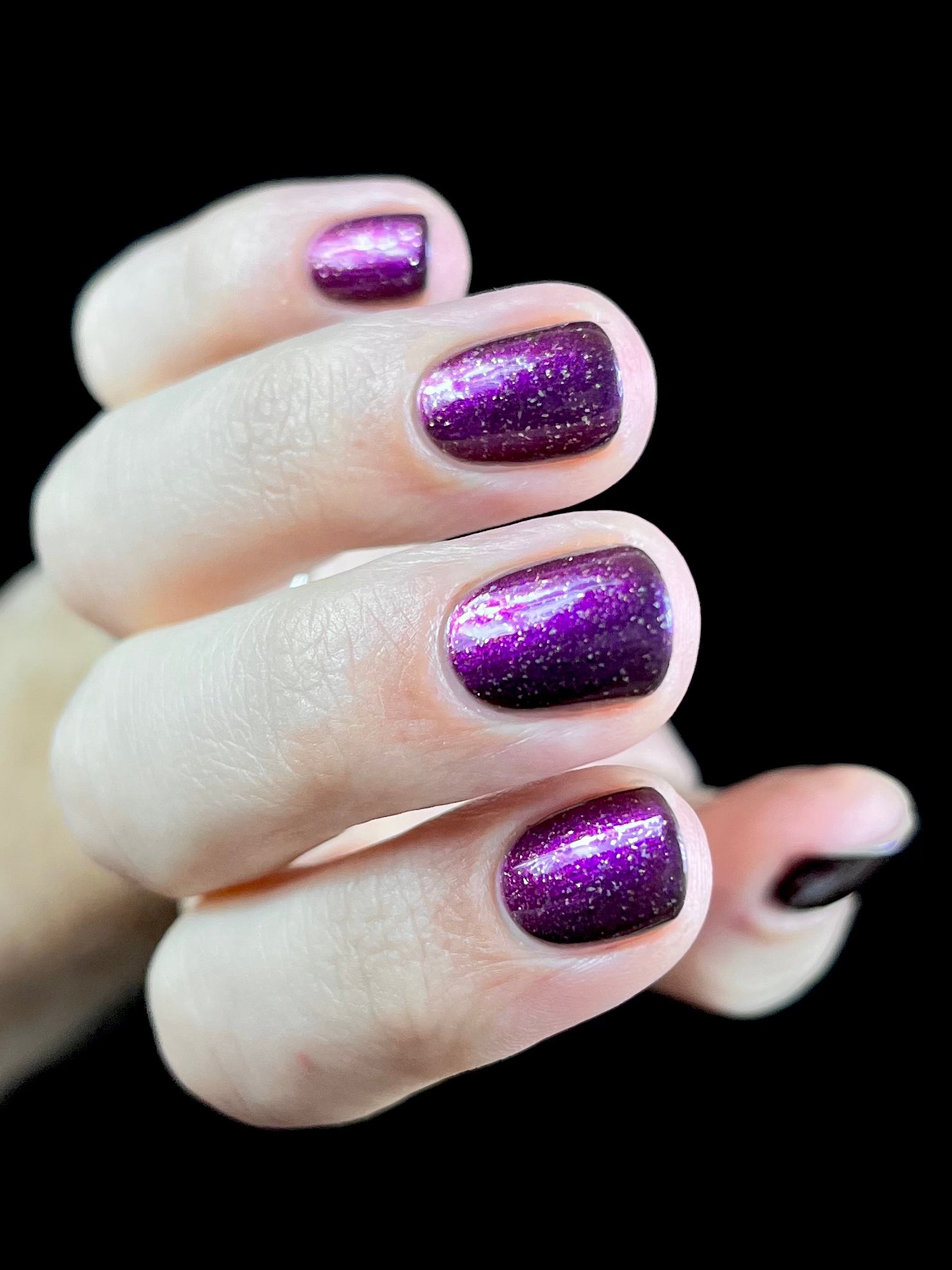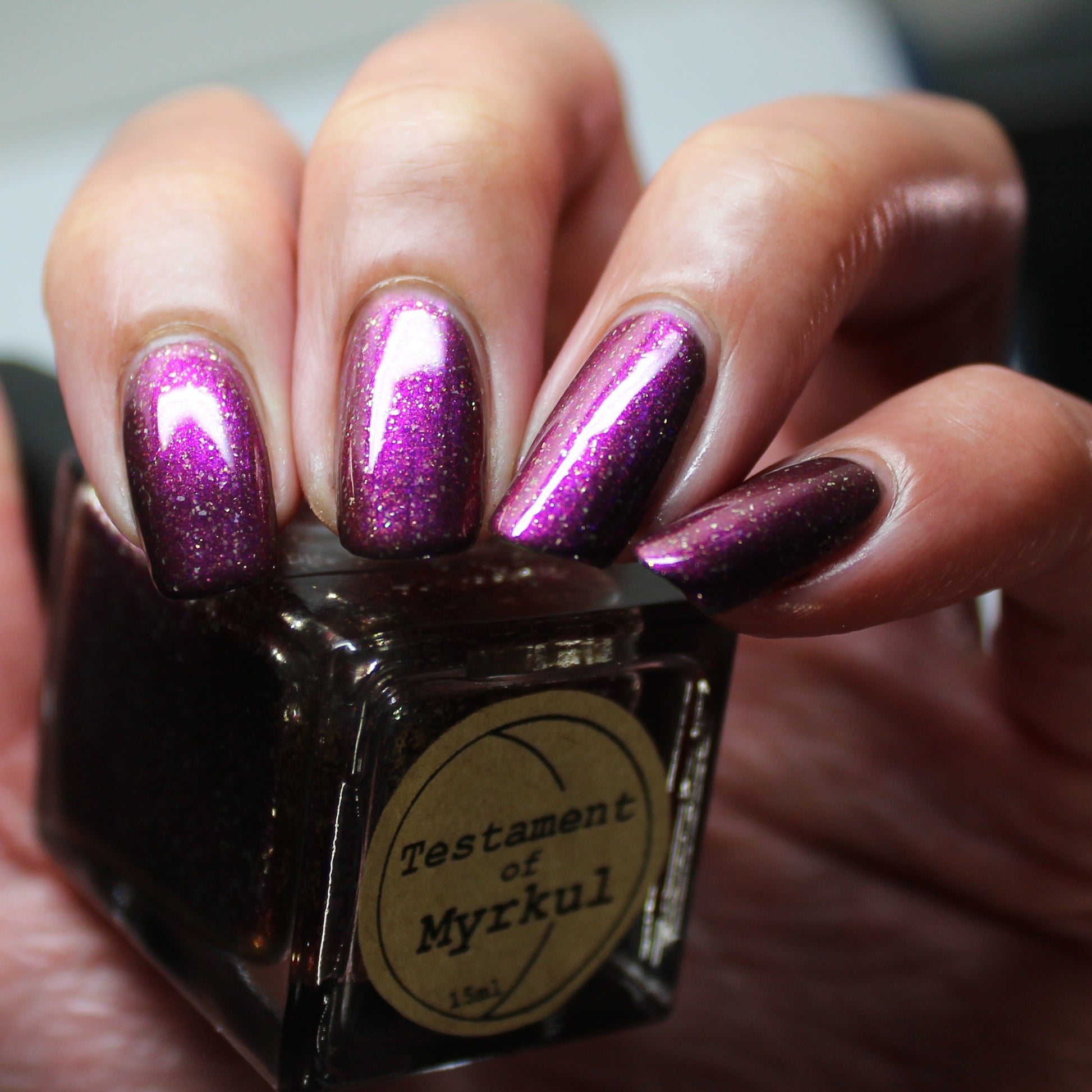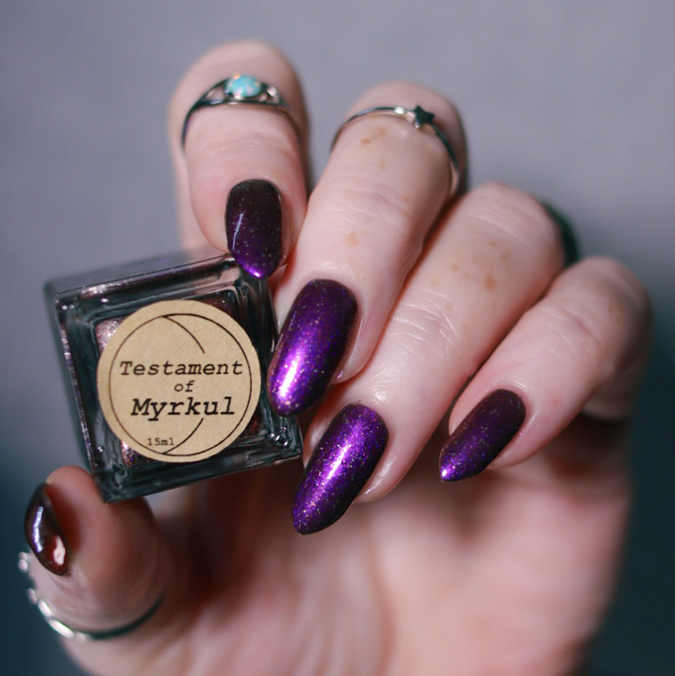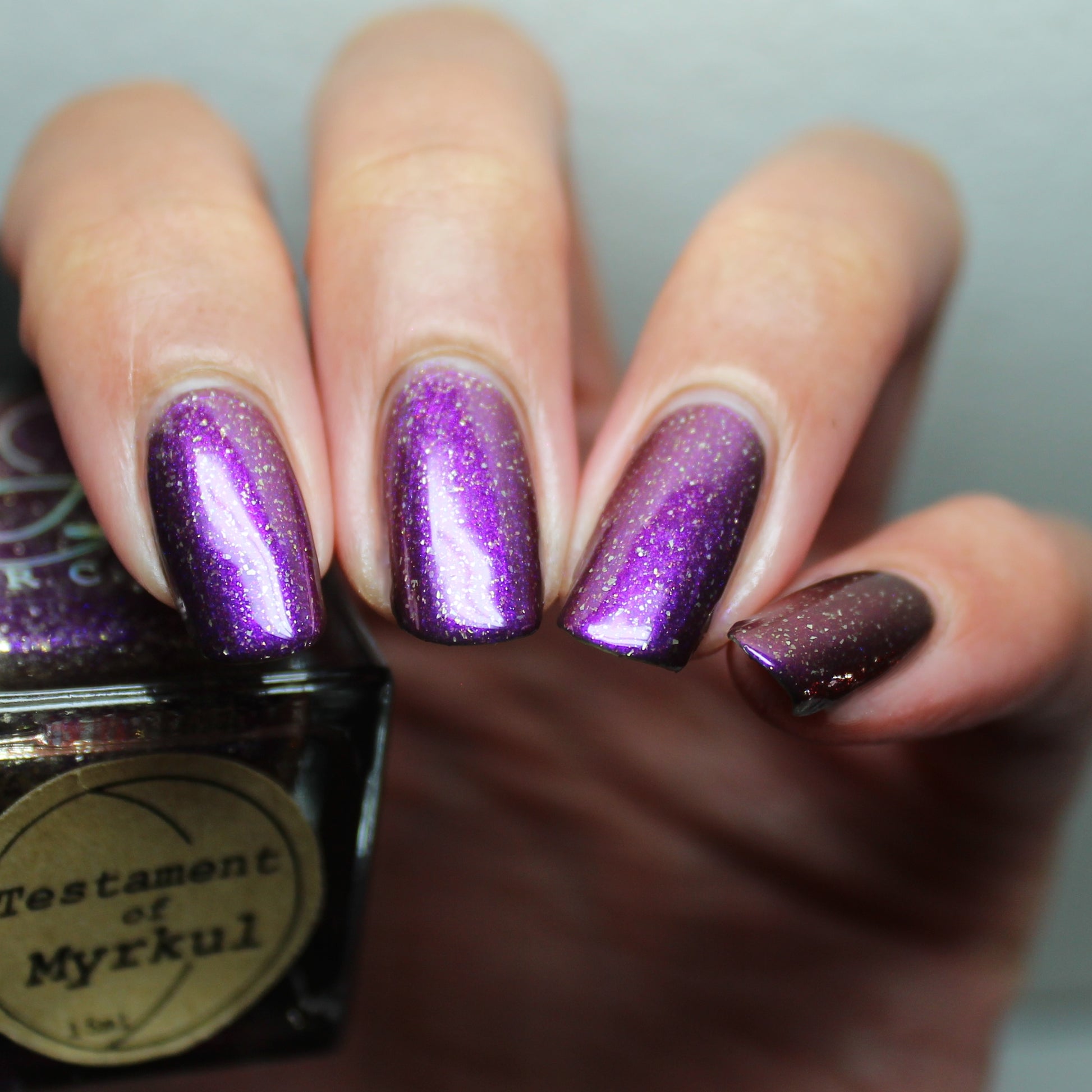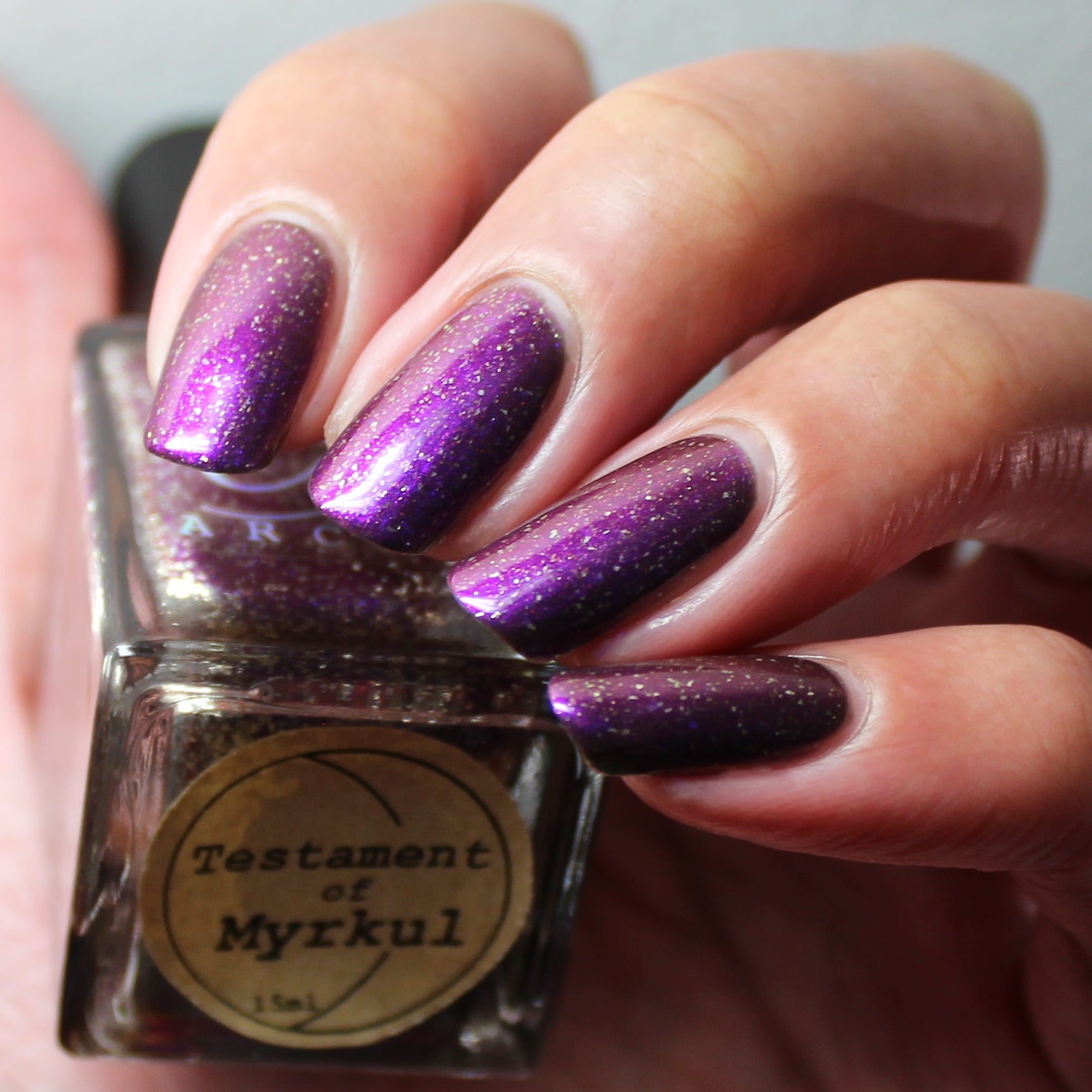 Testament of Myrkul is a light black base with purple to red shimmer, gold flakes, and silver flakes.