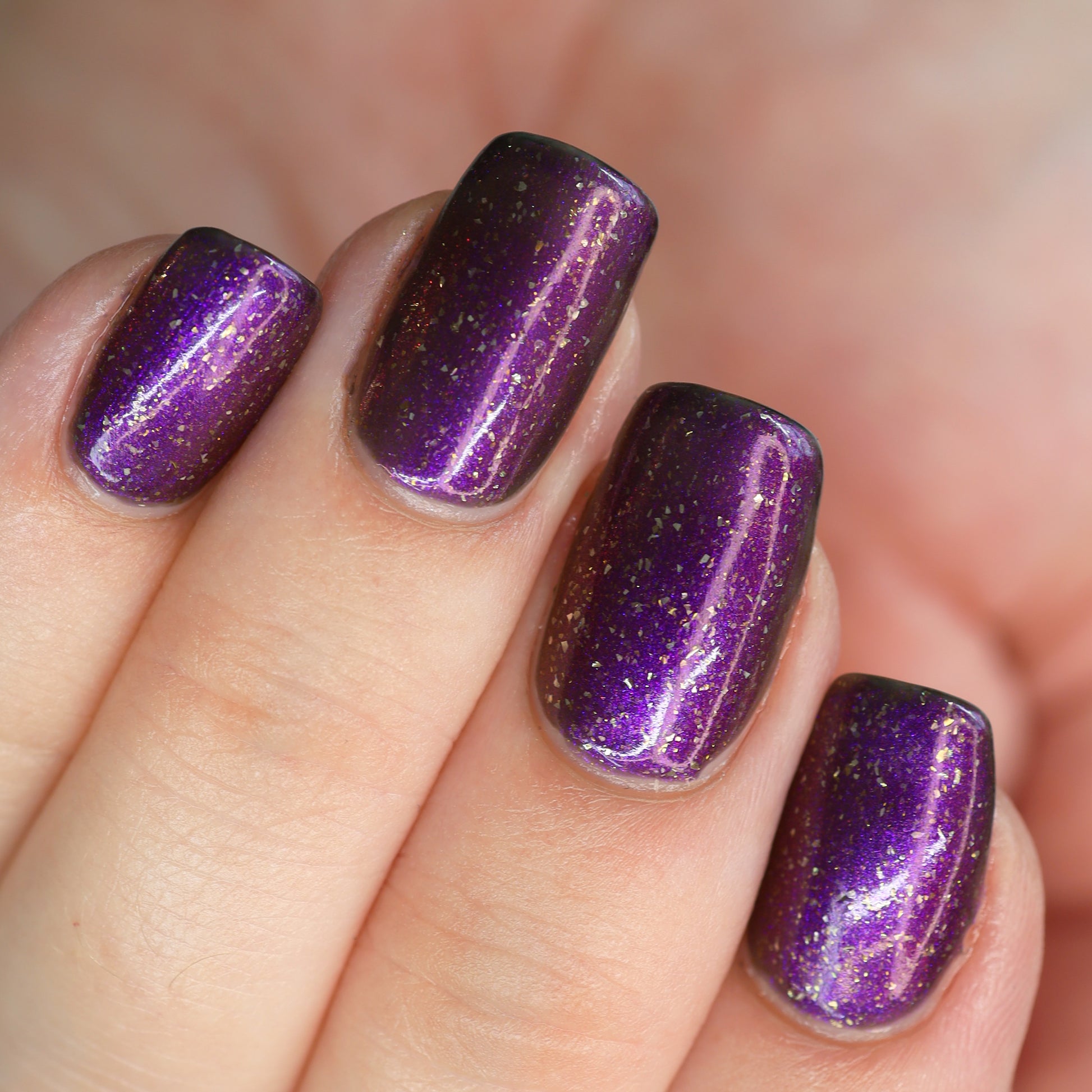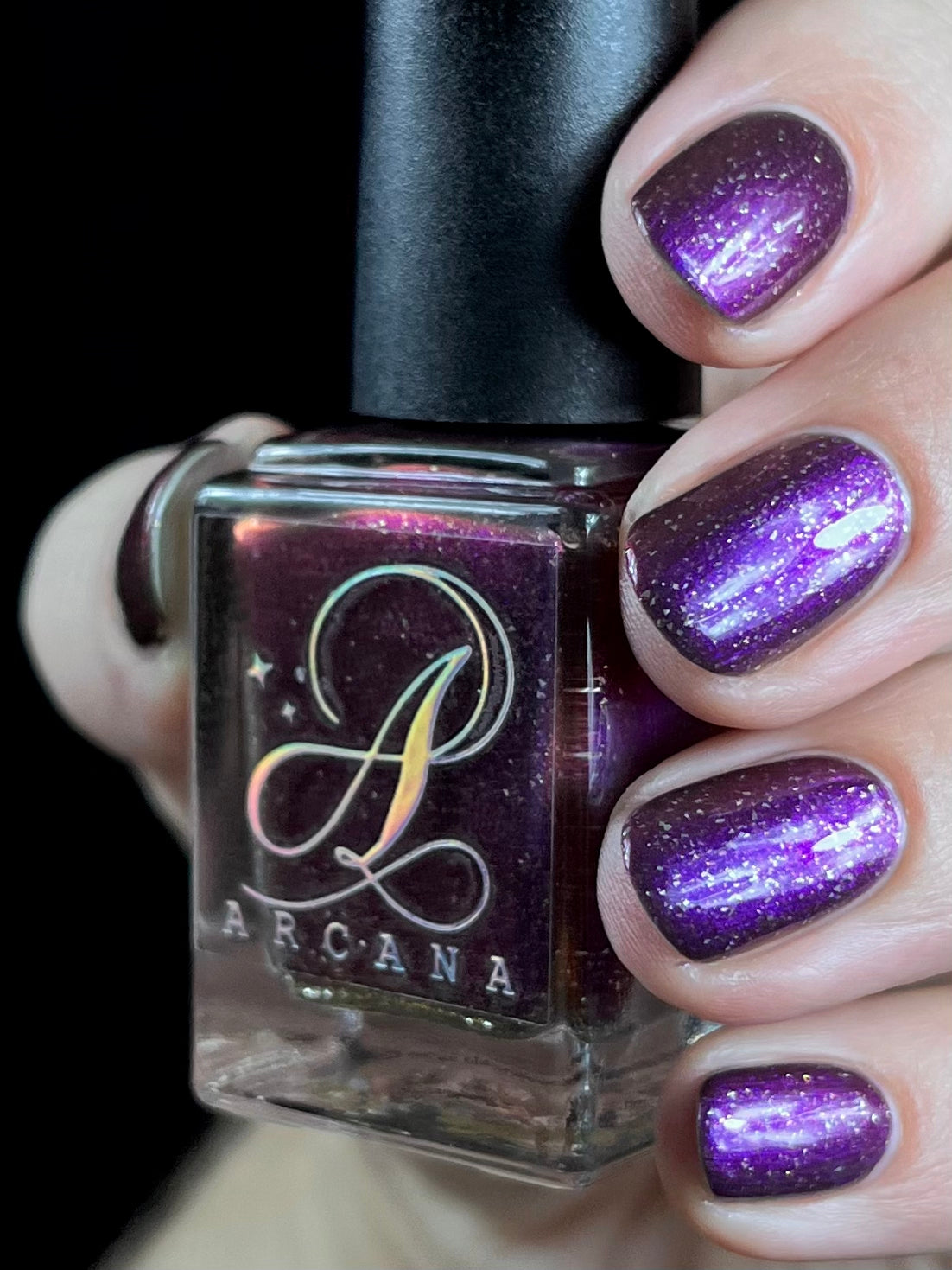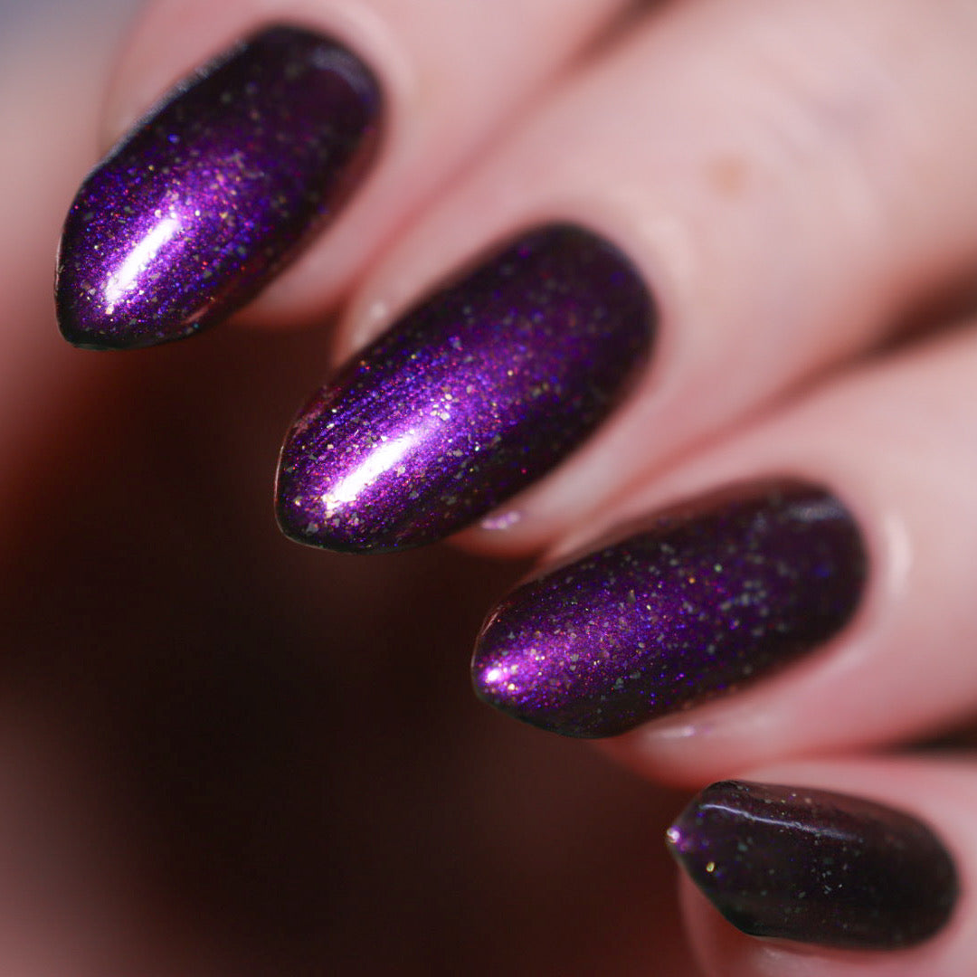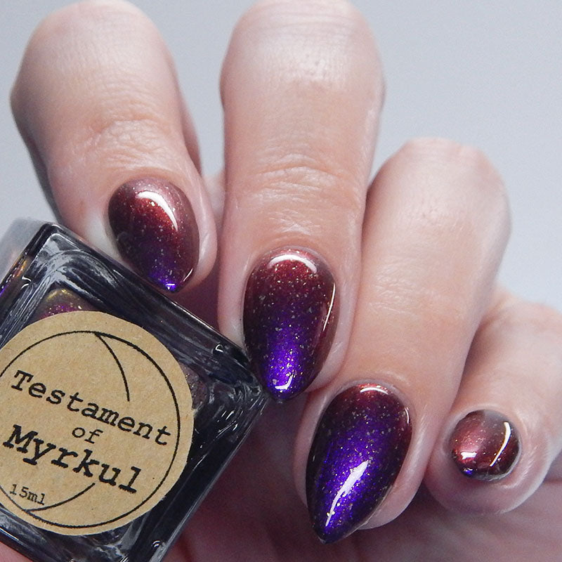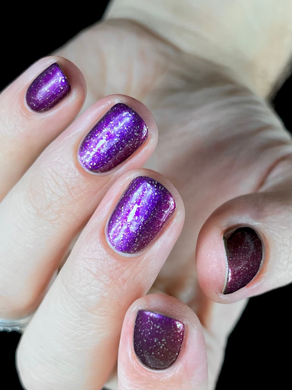 Testament of Myrkul is a light black base with purple to red shimmer, gold flakes, and silver flakes.