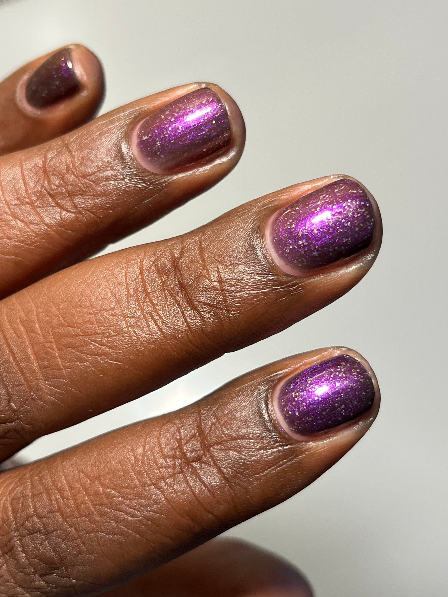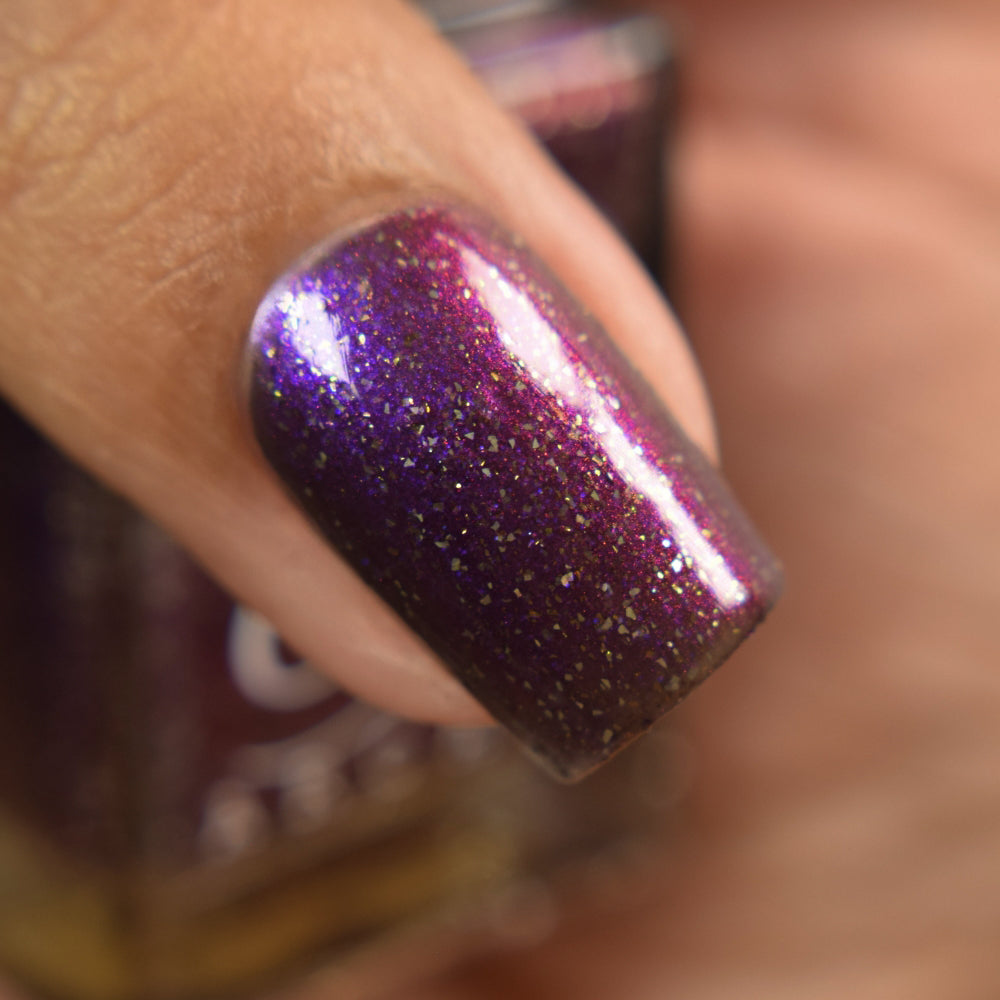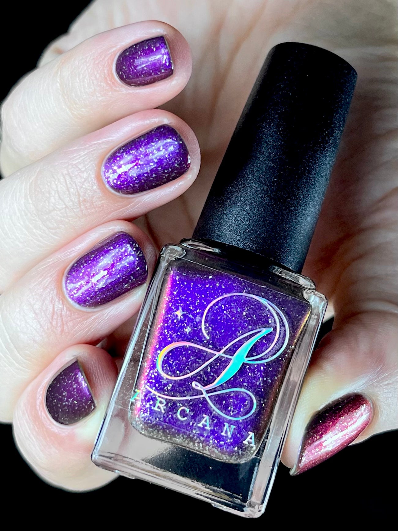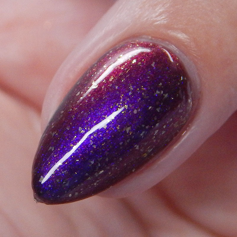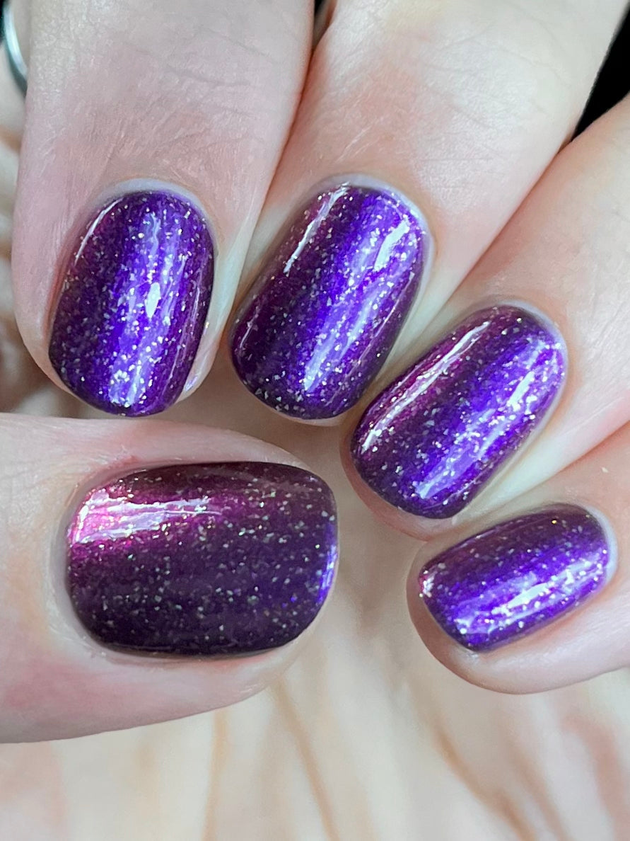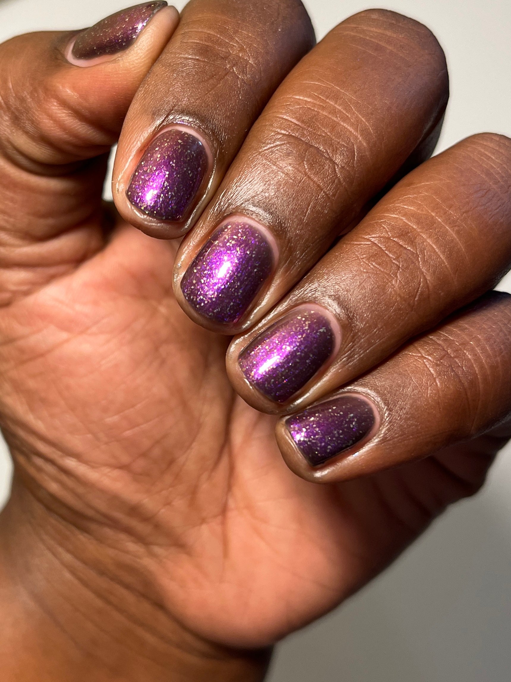 Testament of Myrkul is a light black base with purple to red shimmer, gold flakes, and silver flakes.