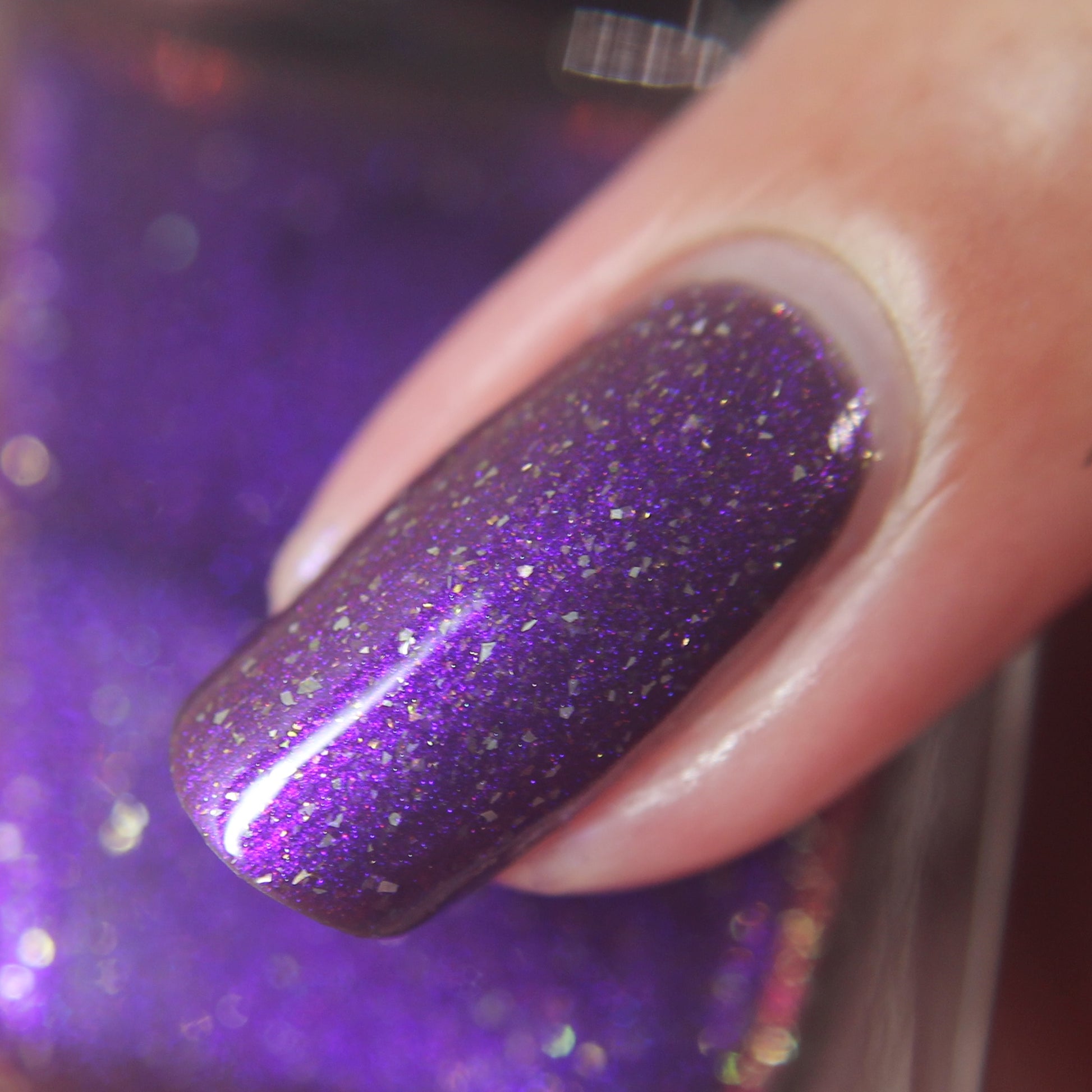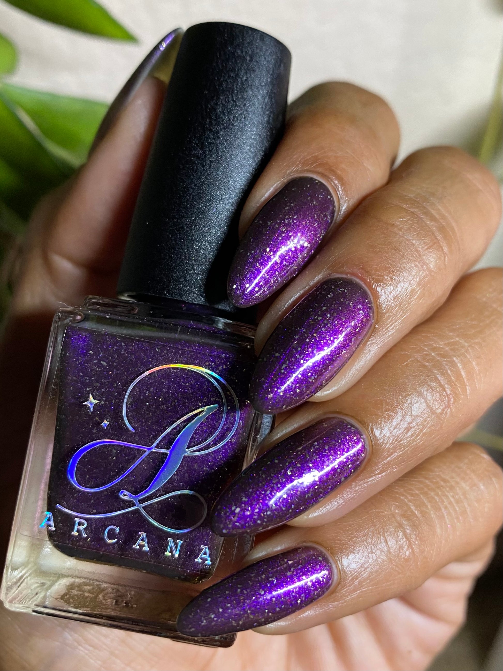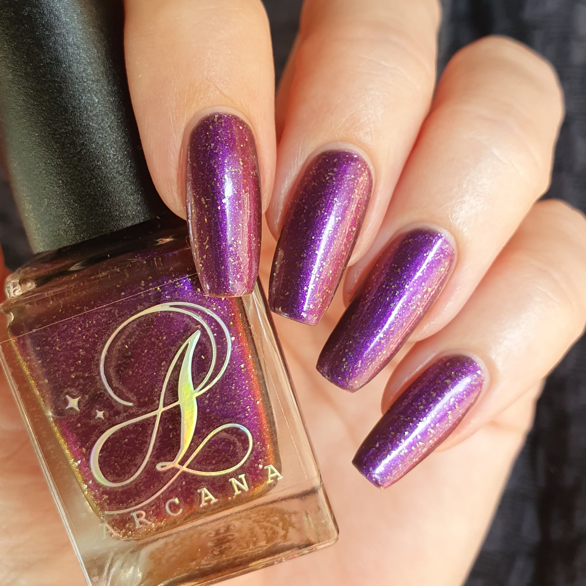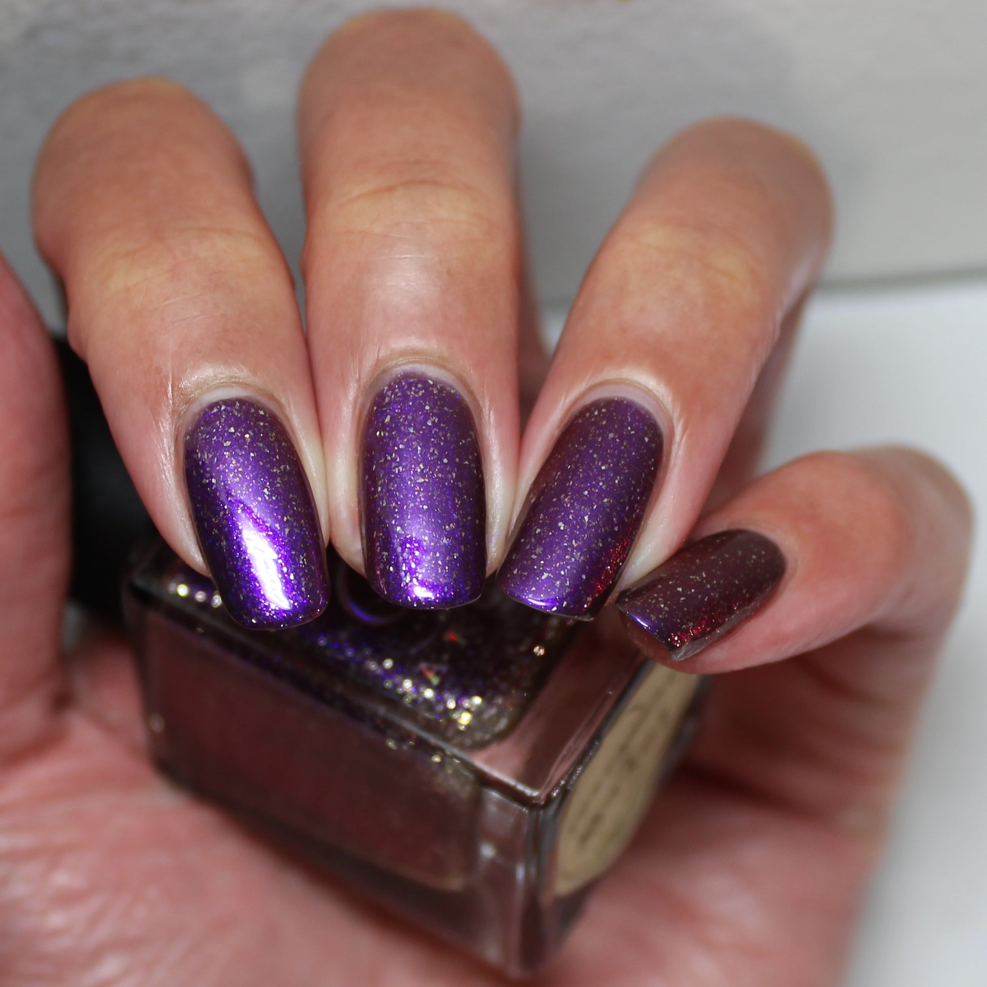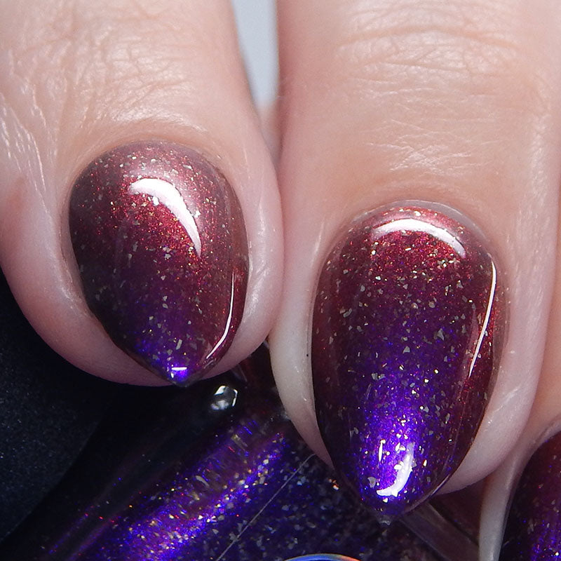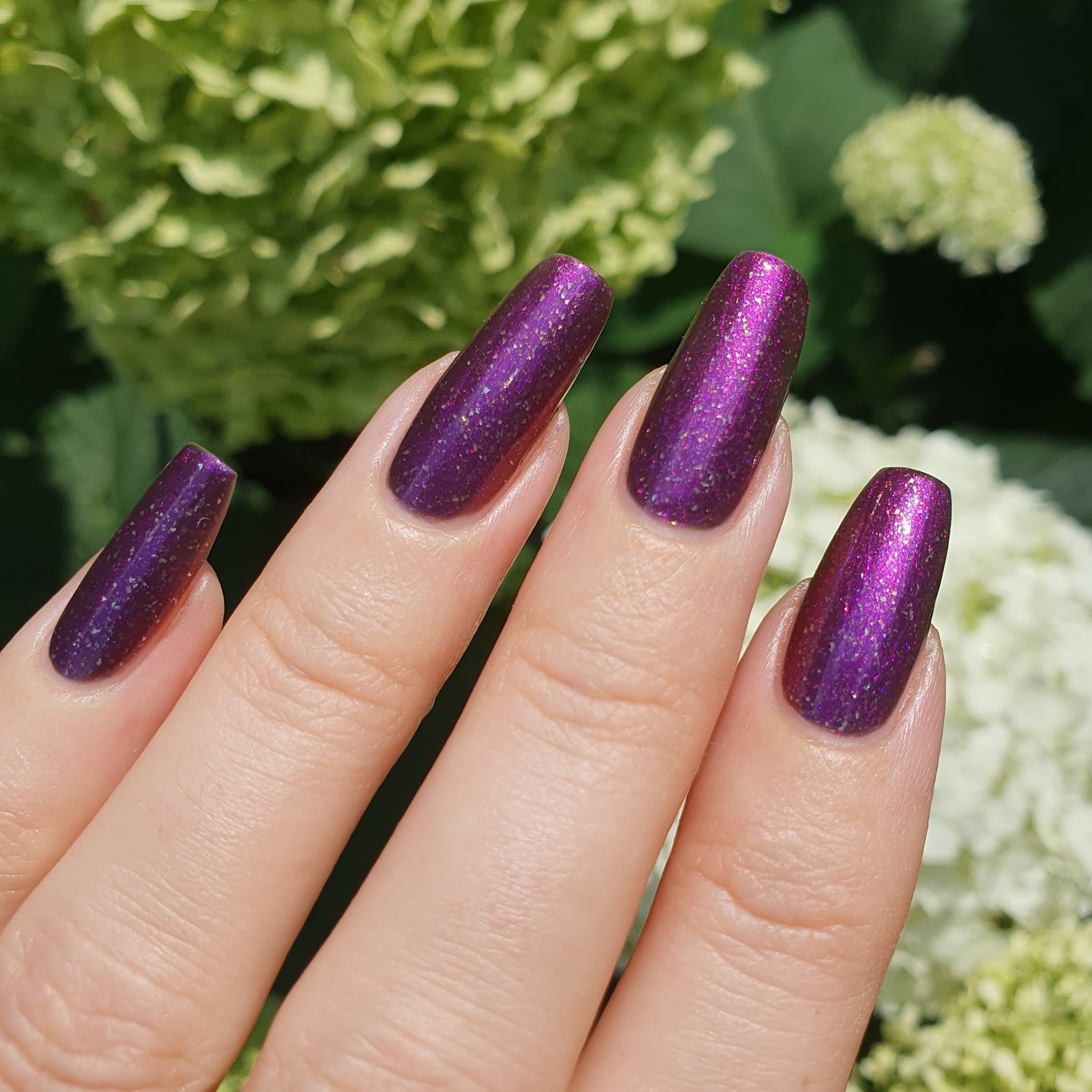 Testament of Myrkul is a light black base with purple to red shimmer, gold flakes, and silver flakes.