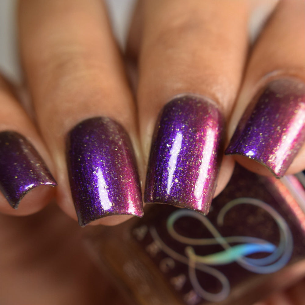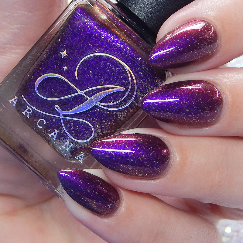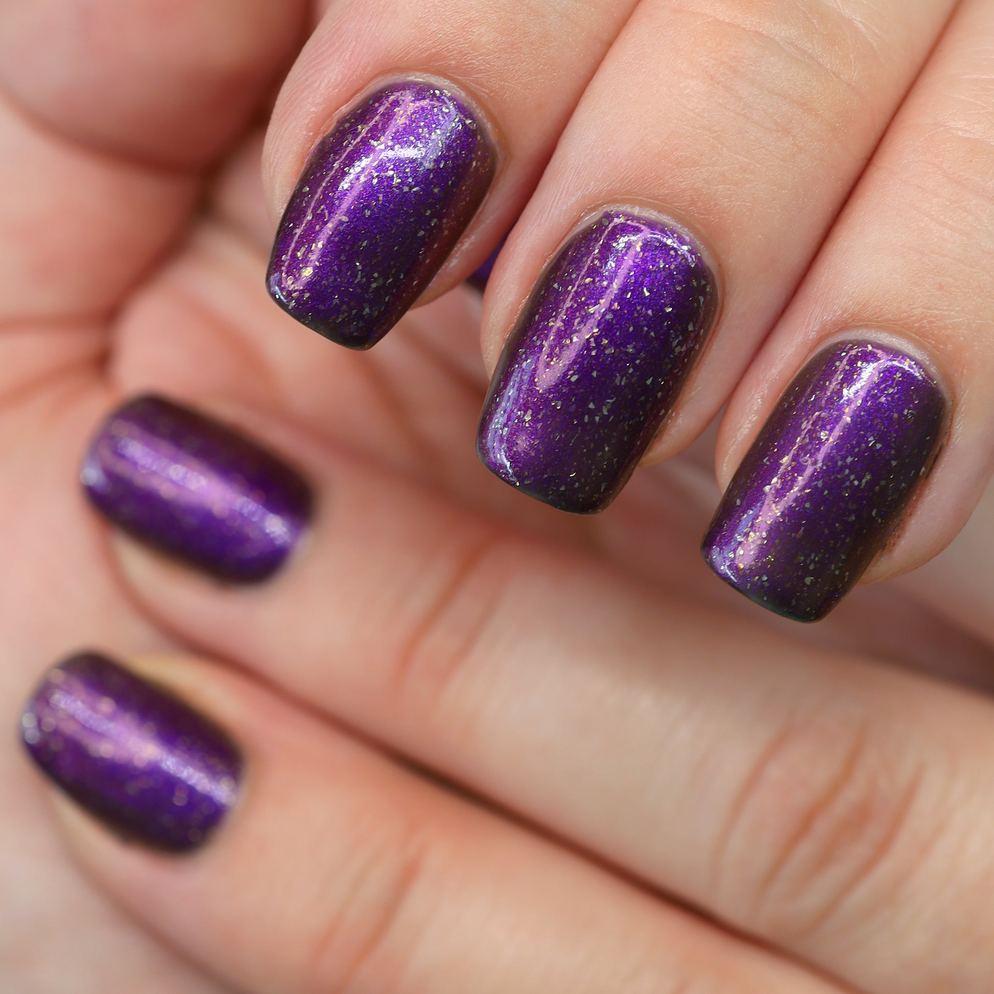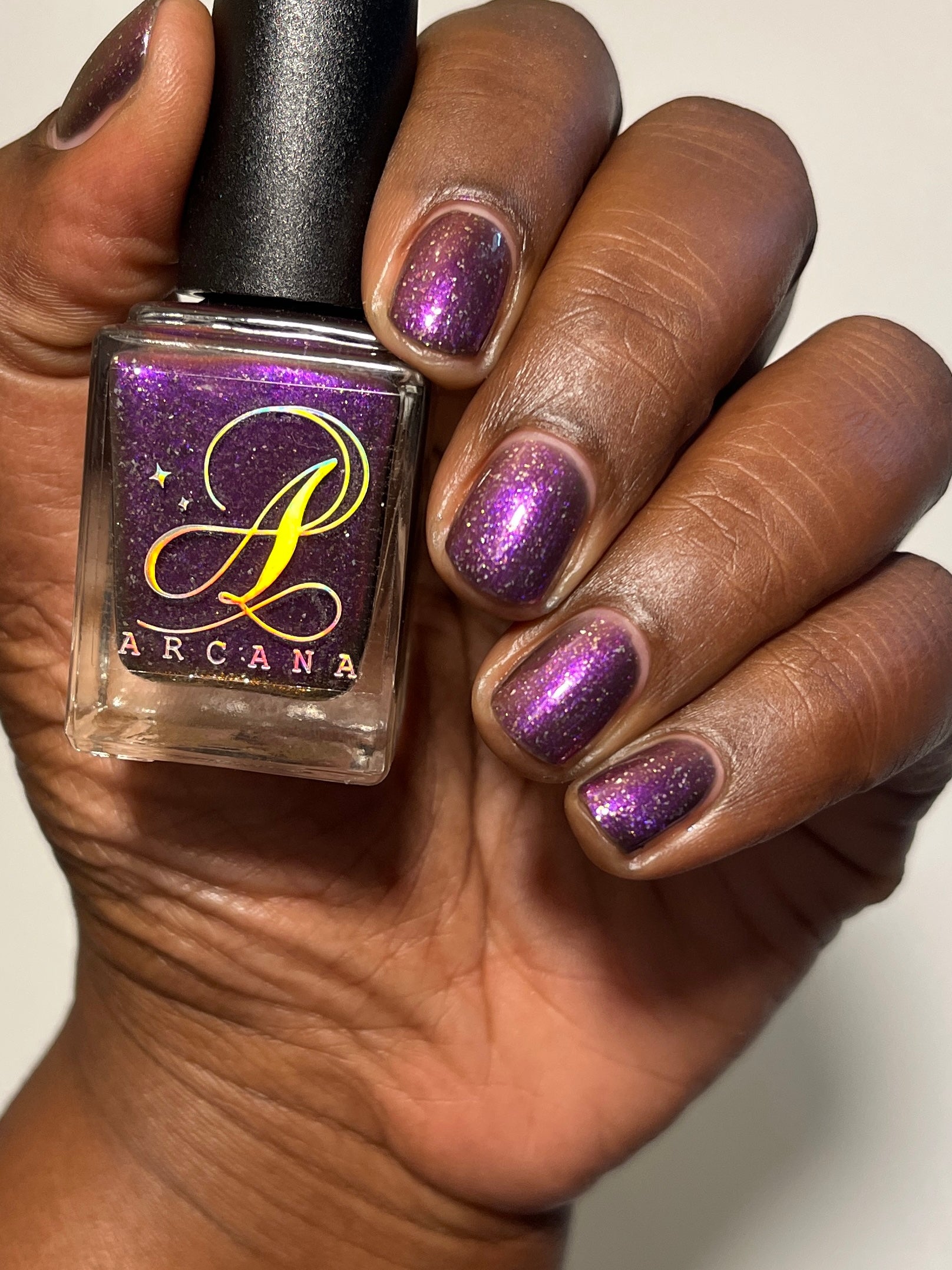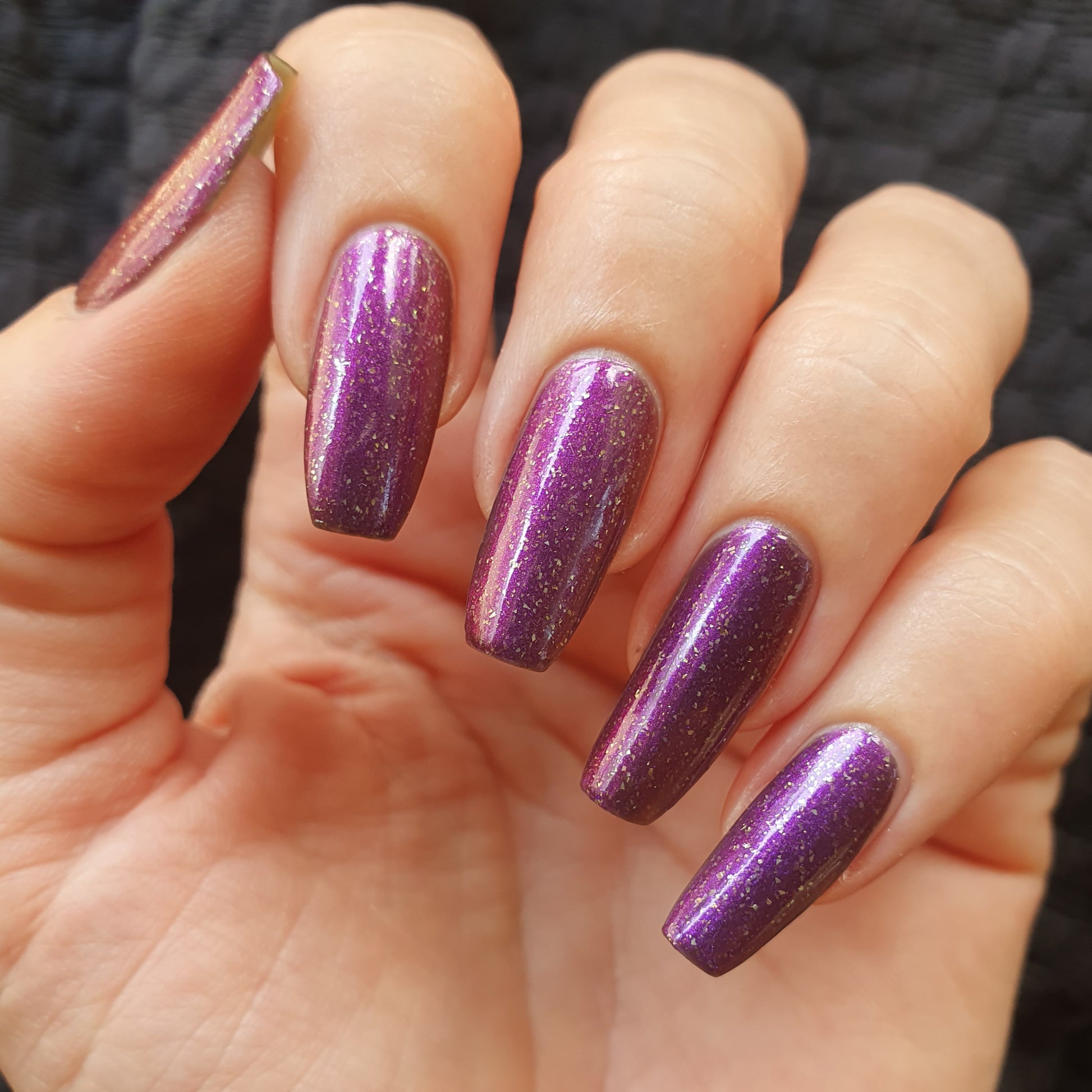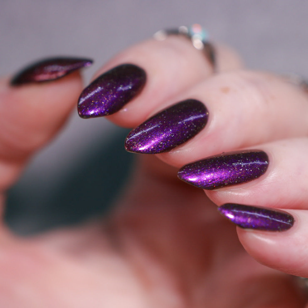 Testament of Myrkul is a light black base with purple to red shimmer, gold flakes, and silver flakes.