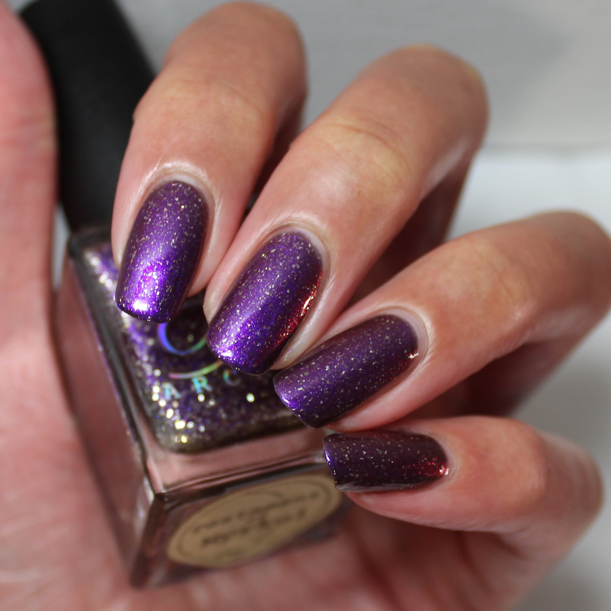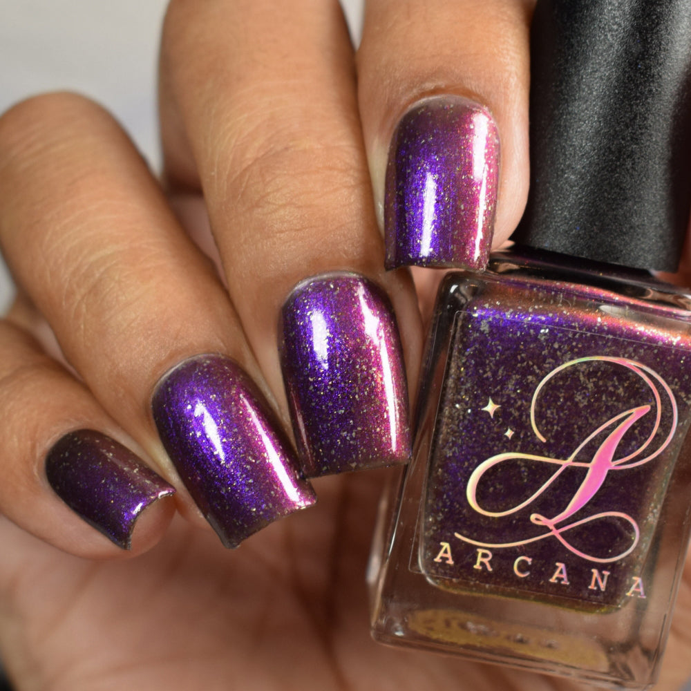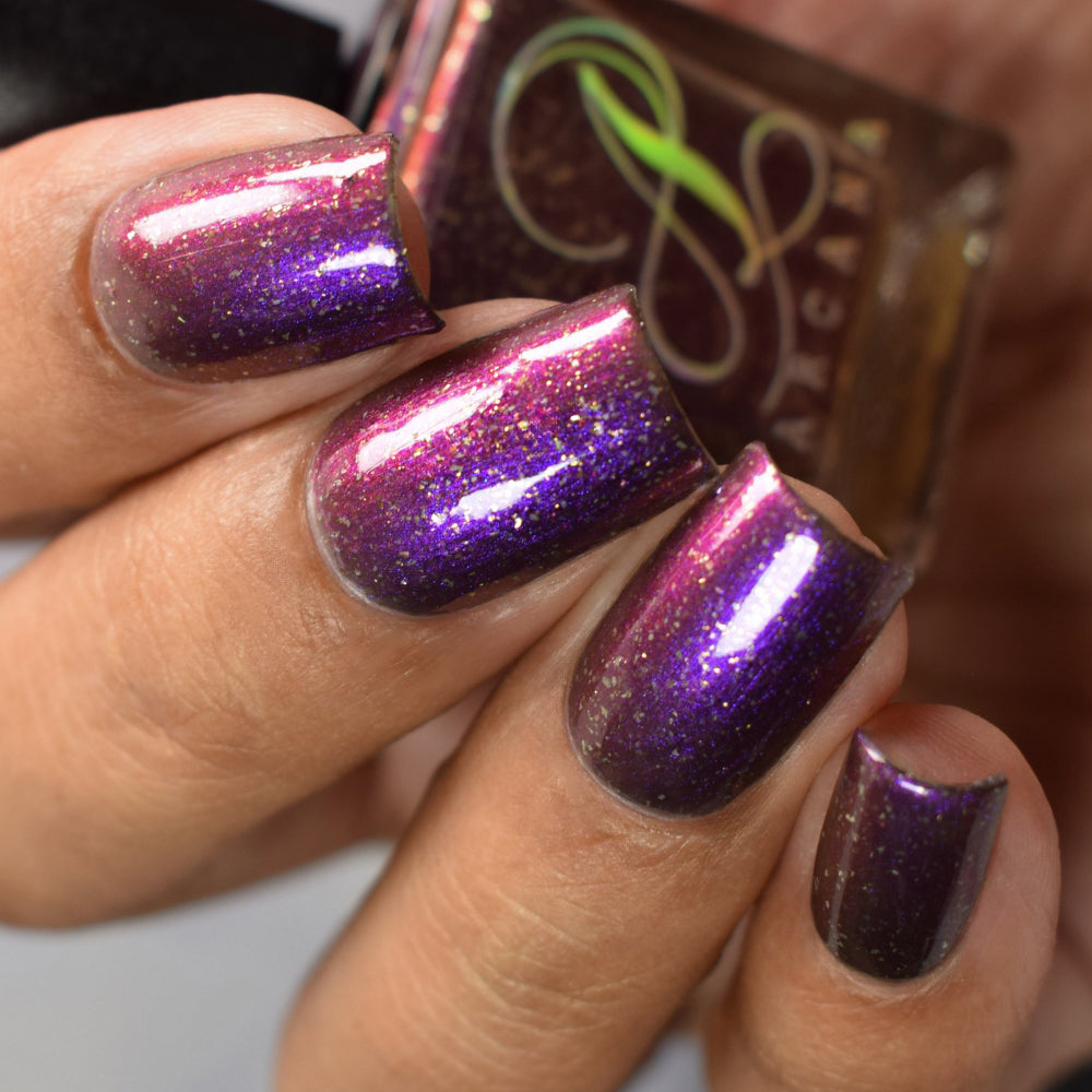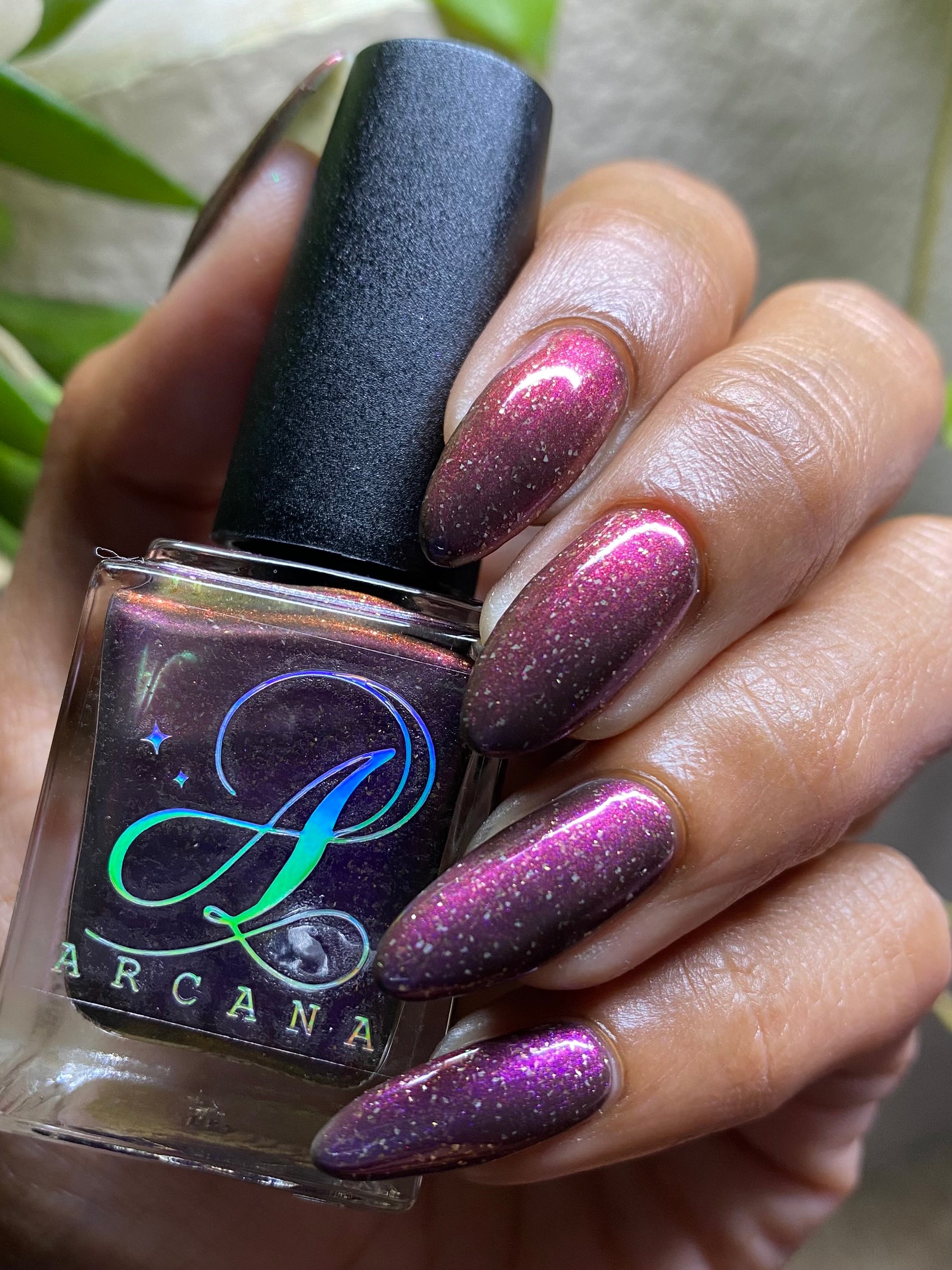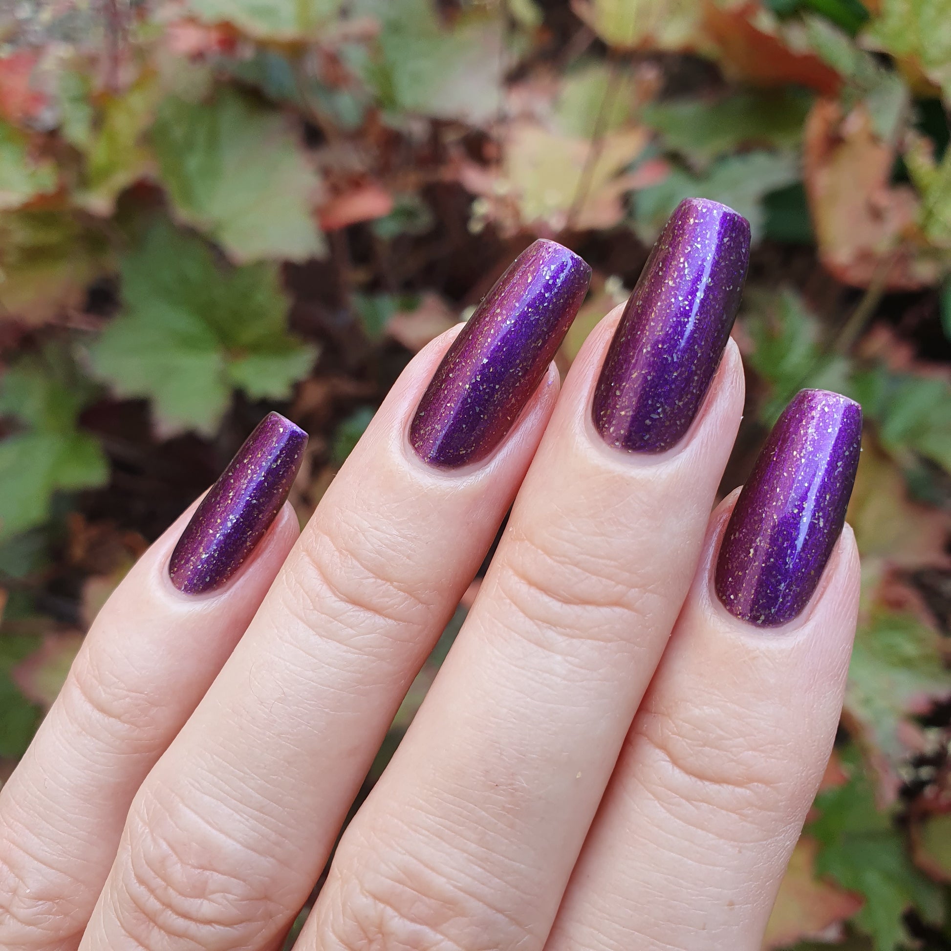 Testament of Myrkul is a light black base with purple to red shimmer, gold flakes, and silver flakes.