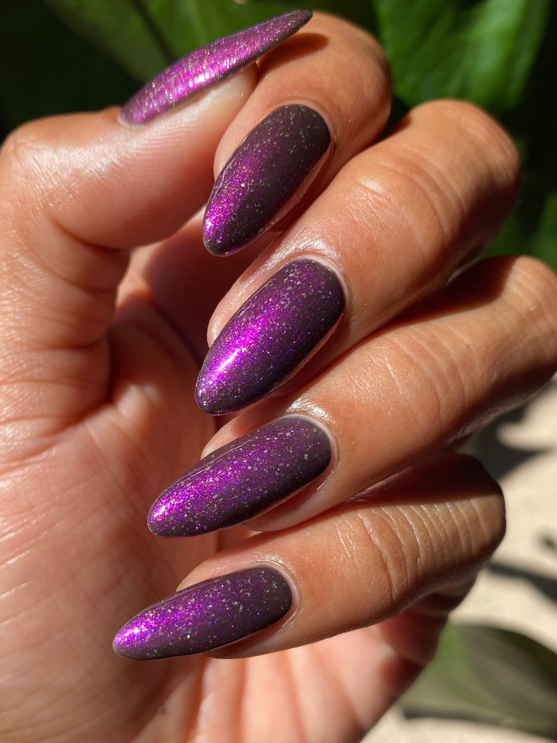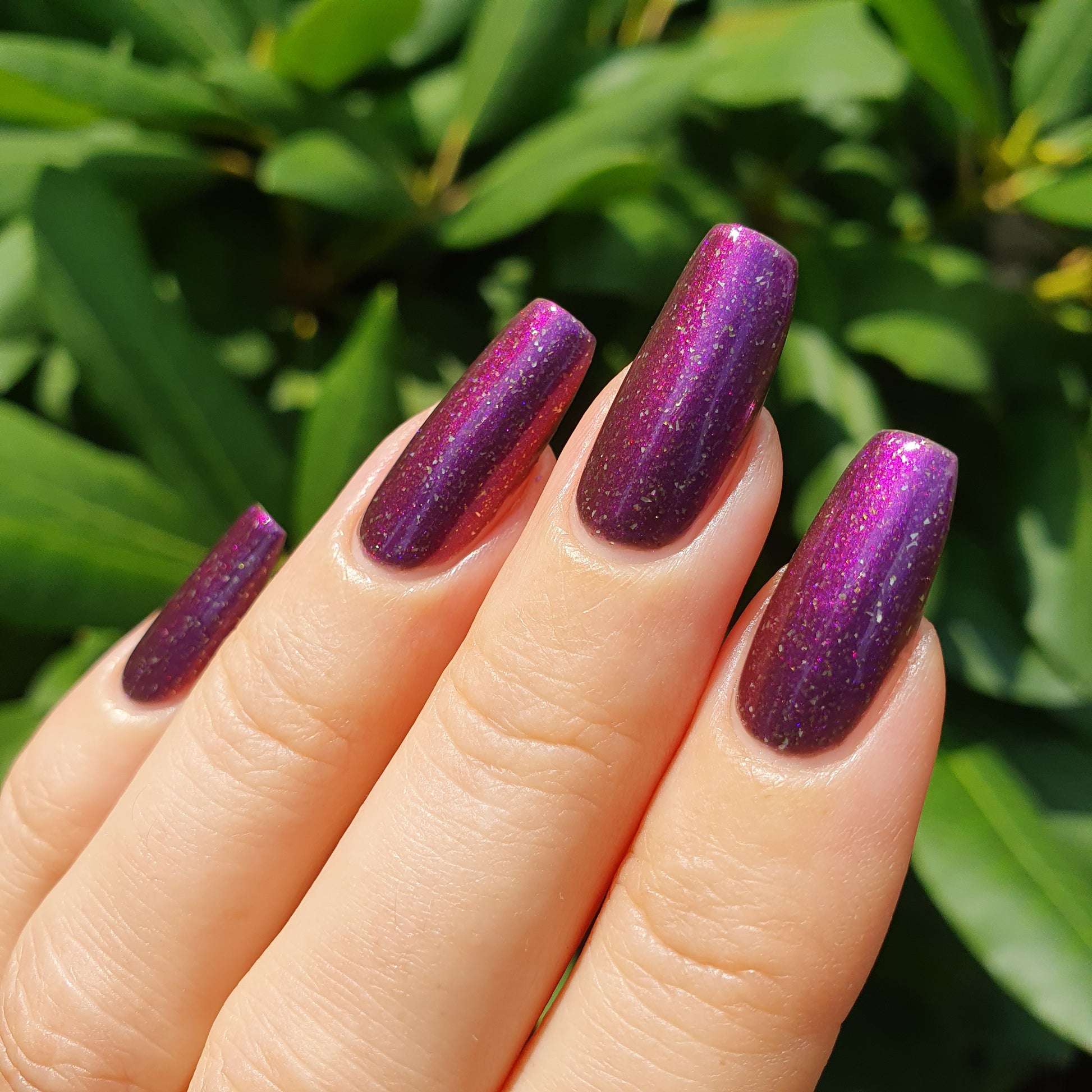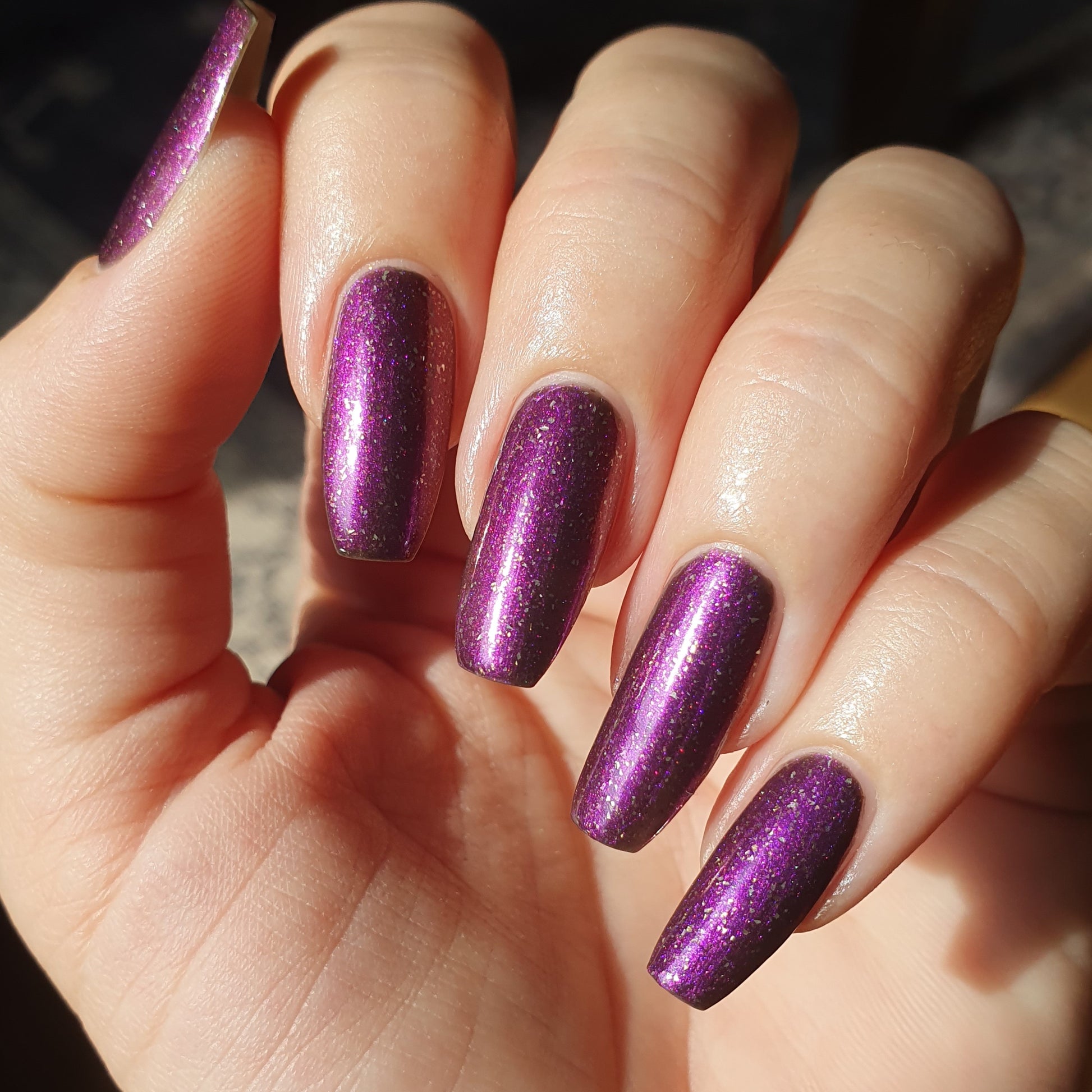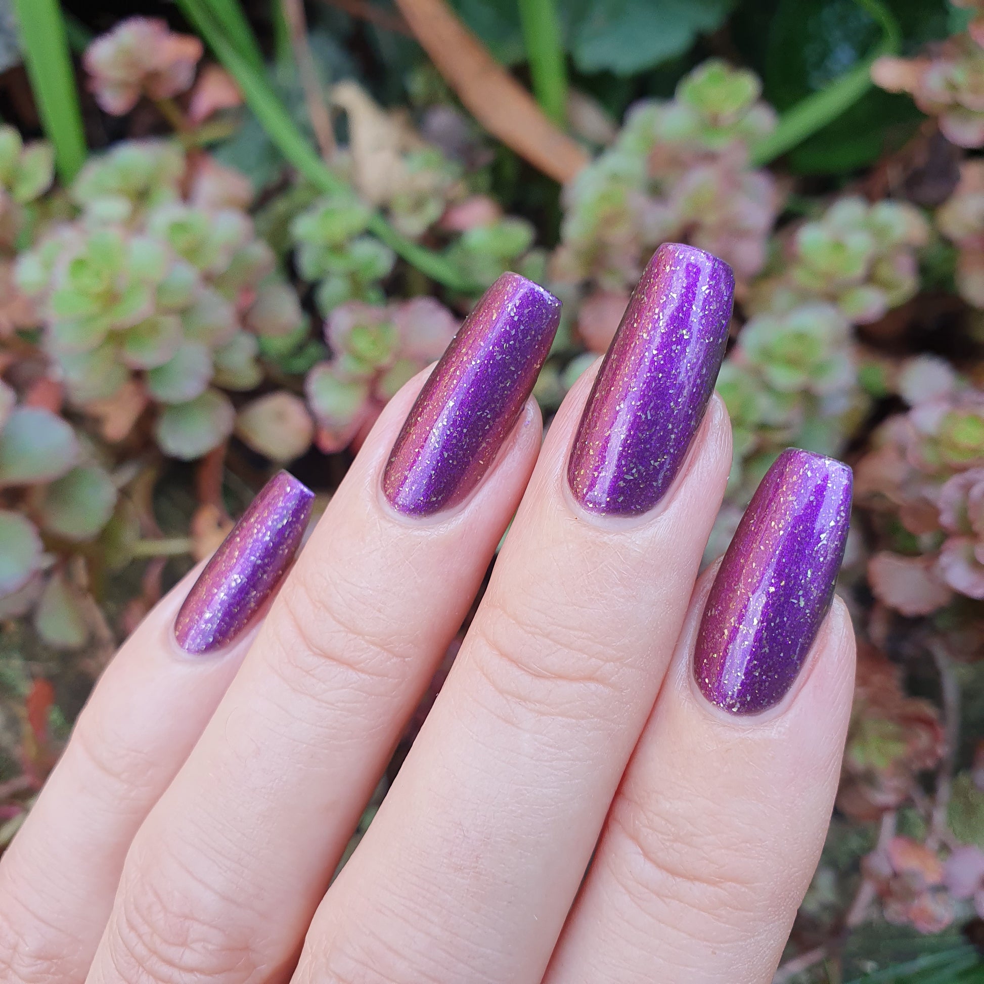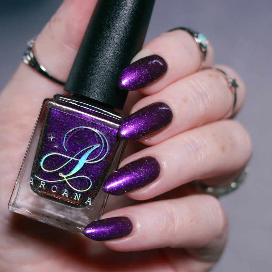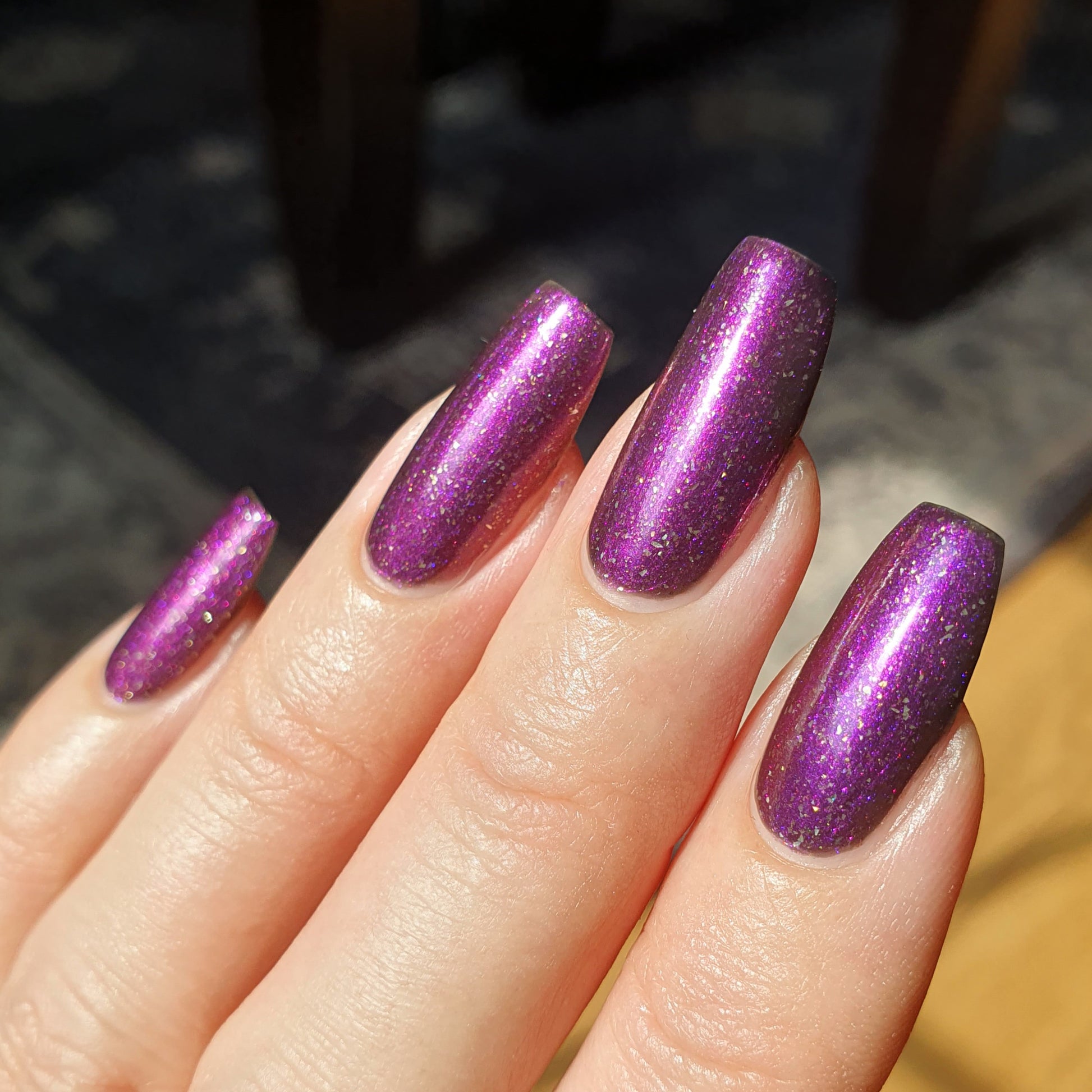 Testament of Myrkul is a light black base with purple to red shimmer, gold flakes, and silver flakes.