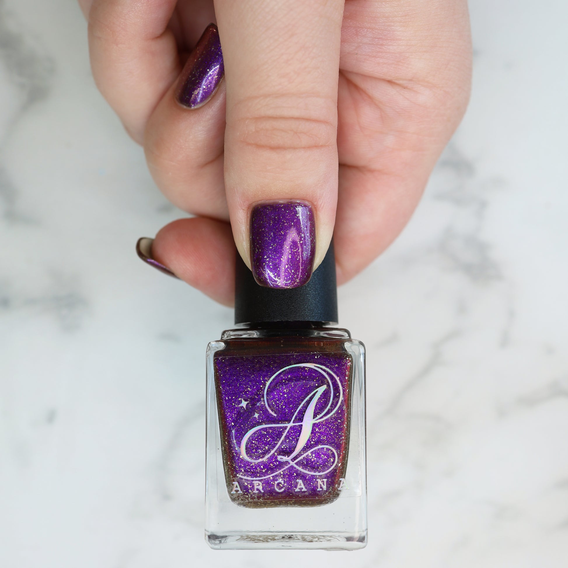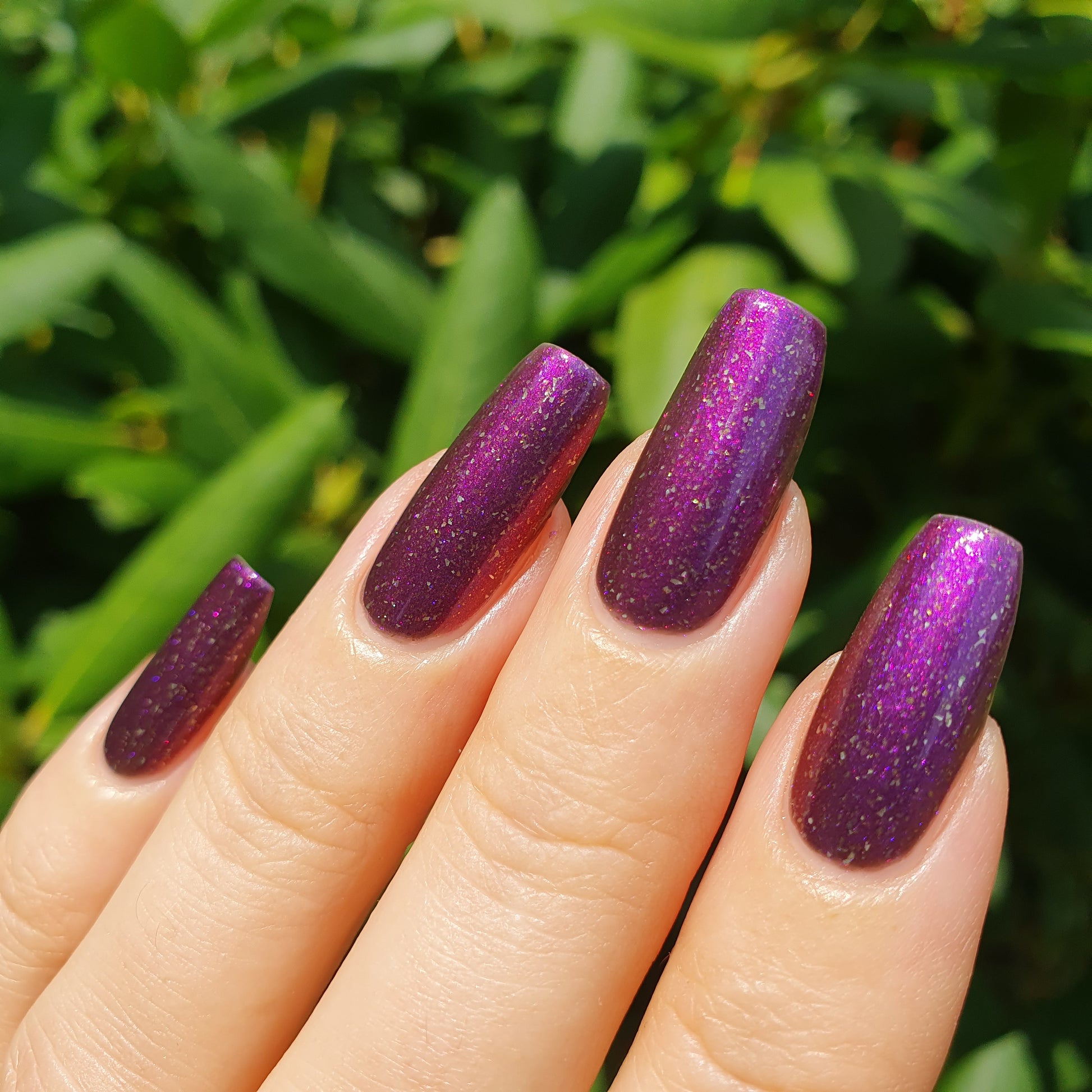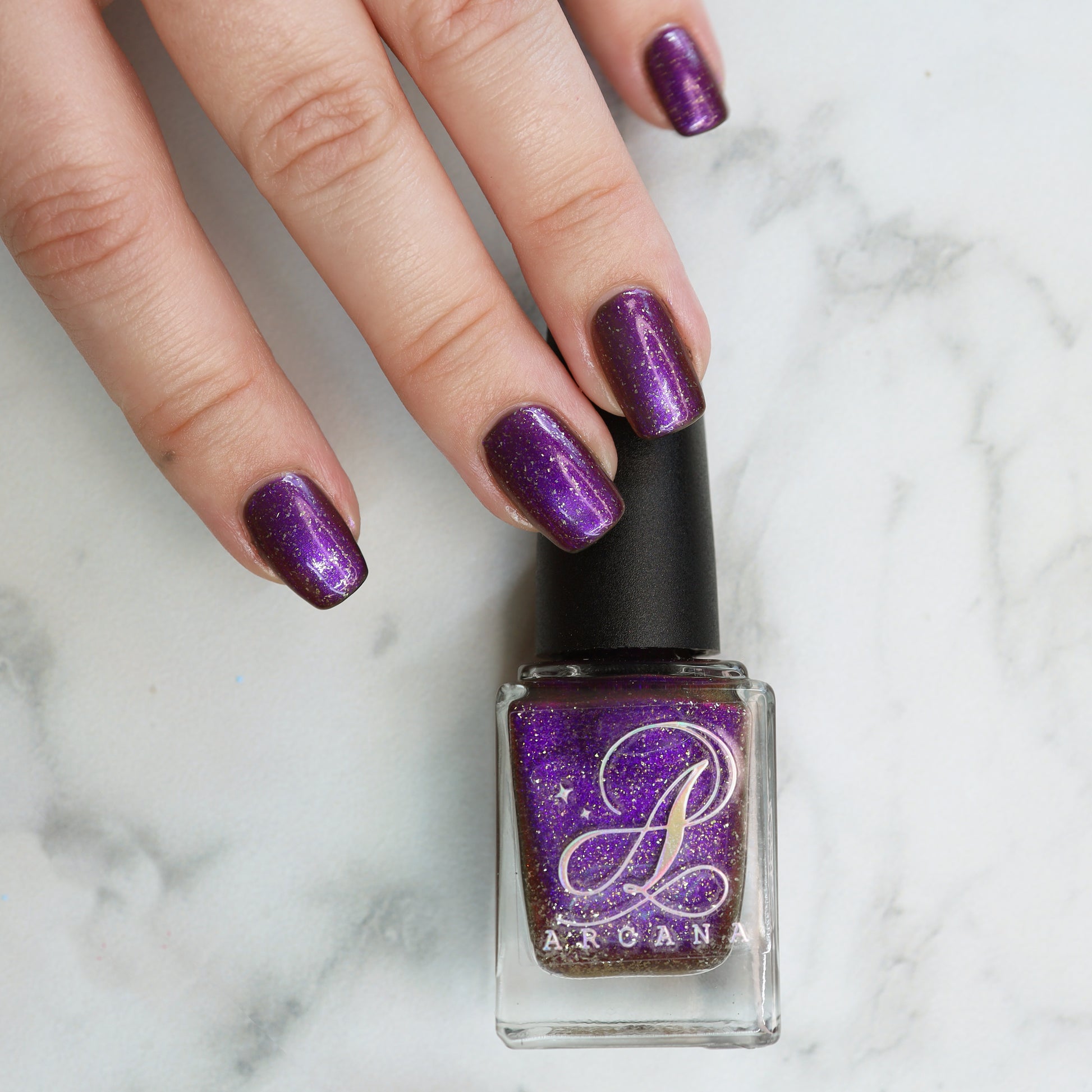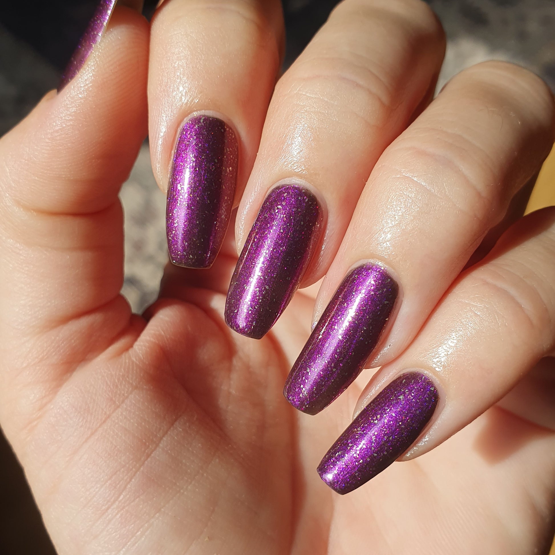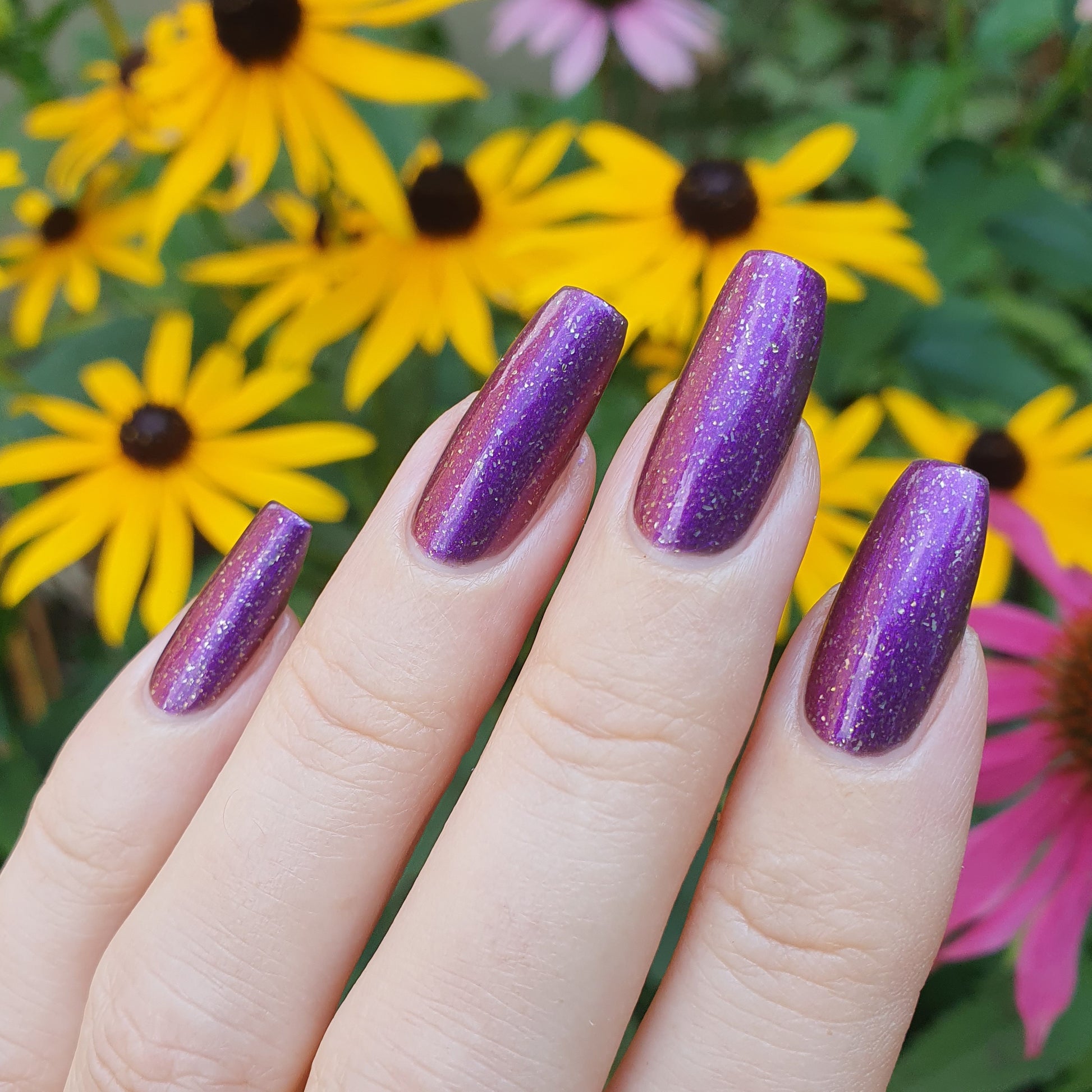 Testament of Myrkul is a light black base with purple to red shimmer, gold flakes, and silver flakes.