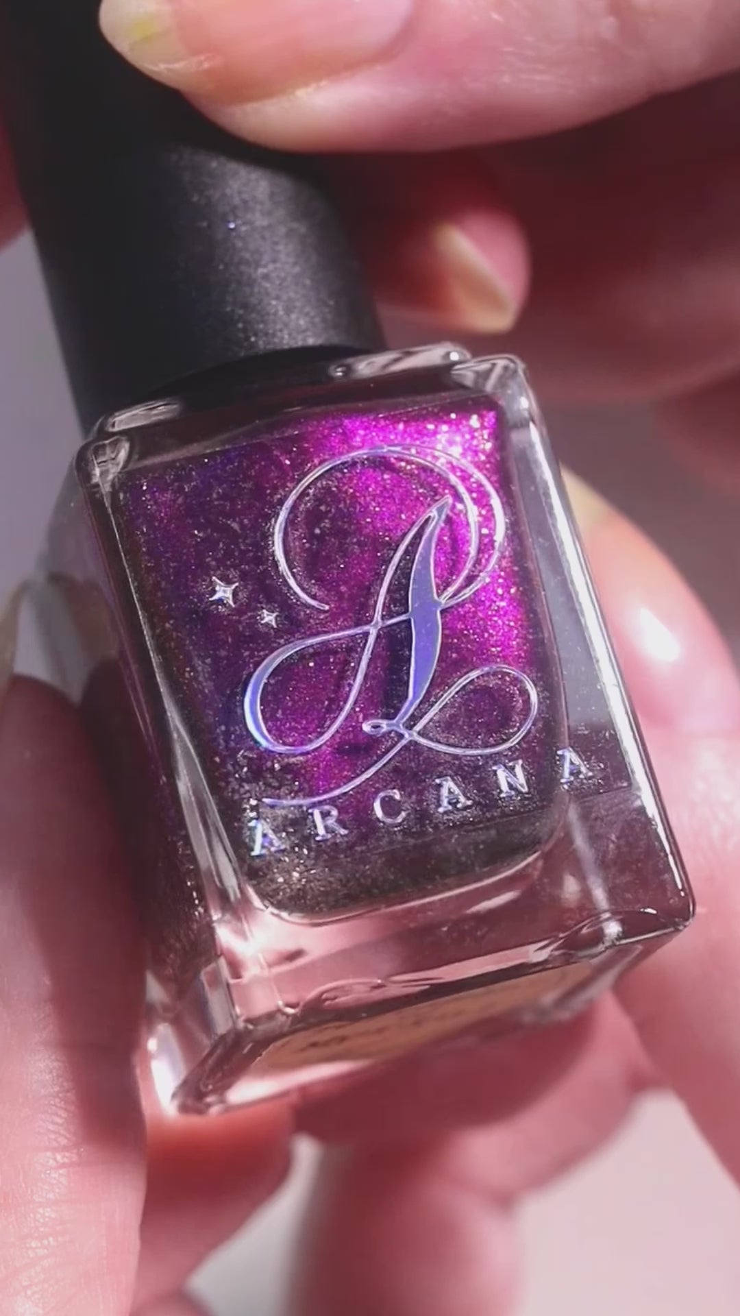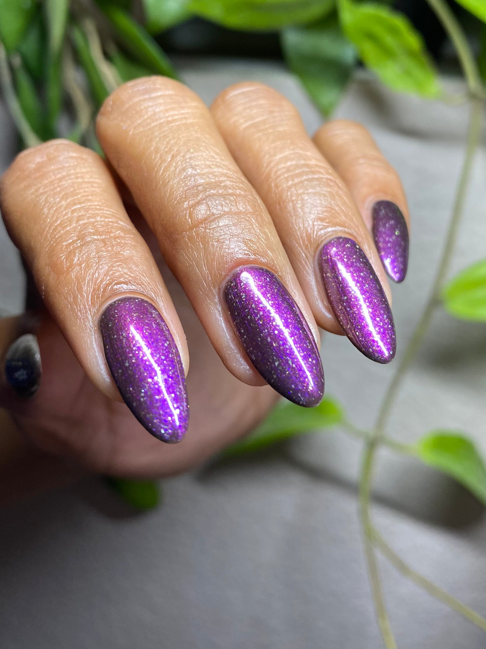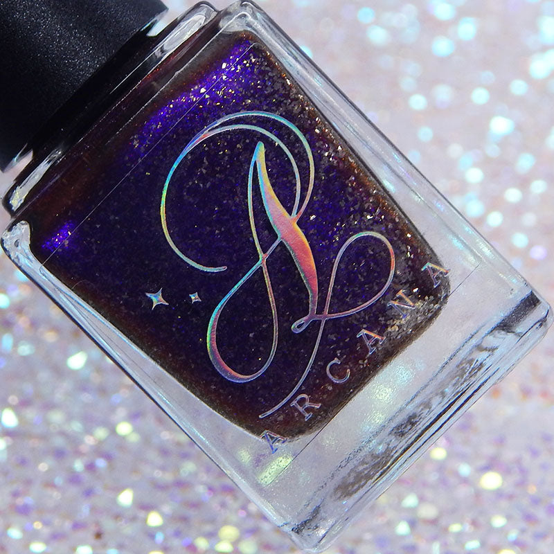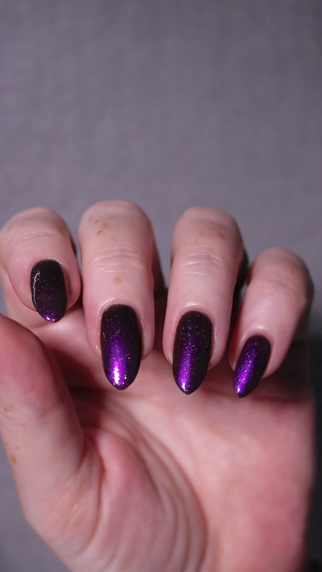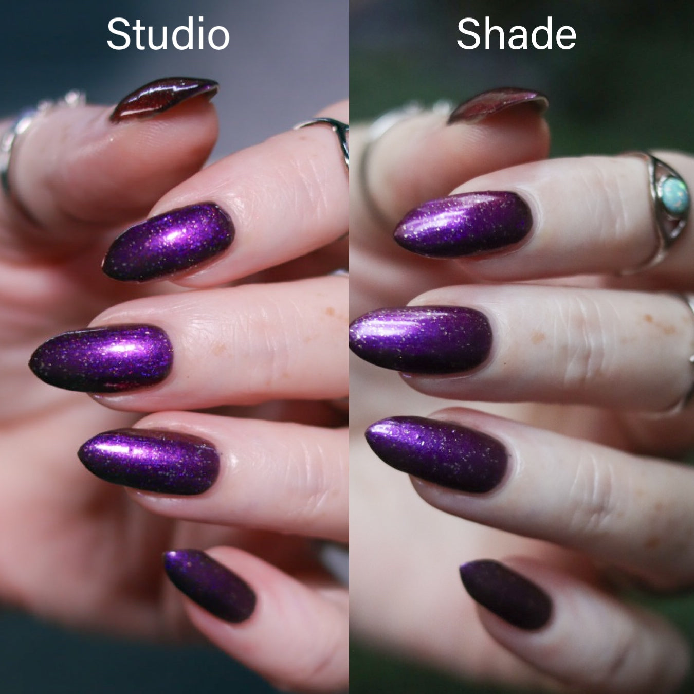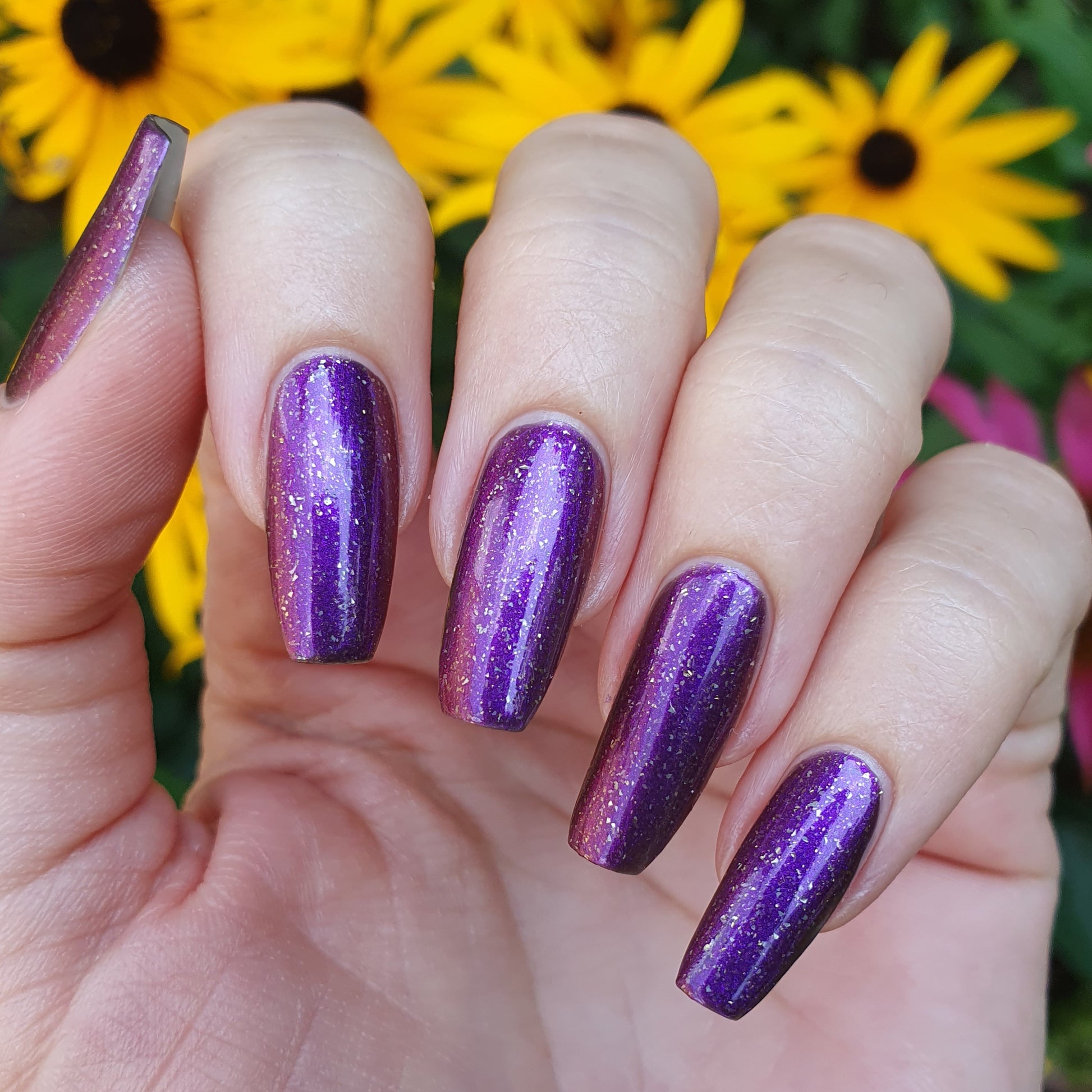 Testament of Myrkul is a light black base with purple to red shimmer, gold flakes, and silver flakes.