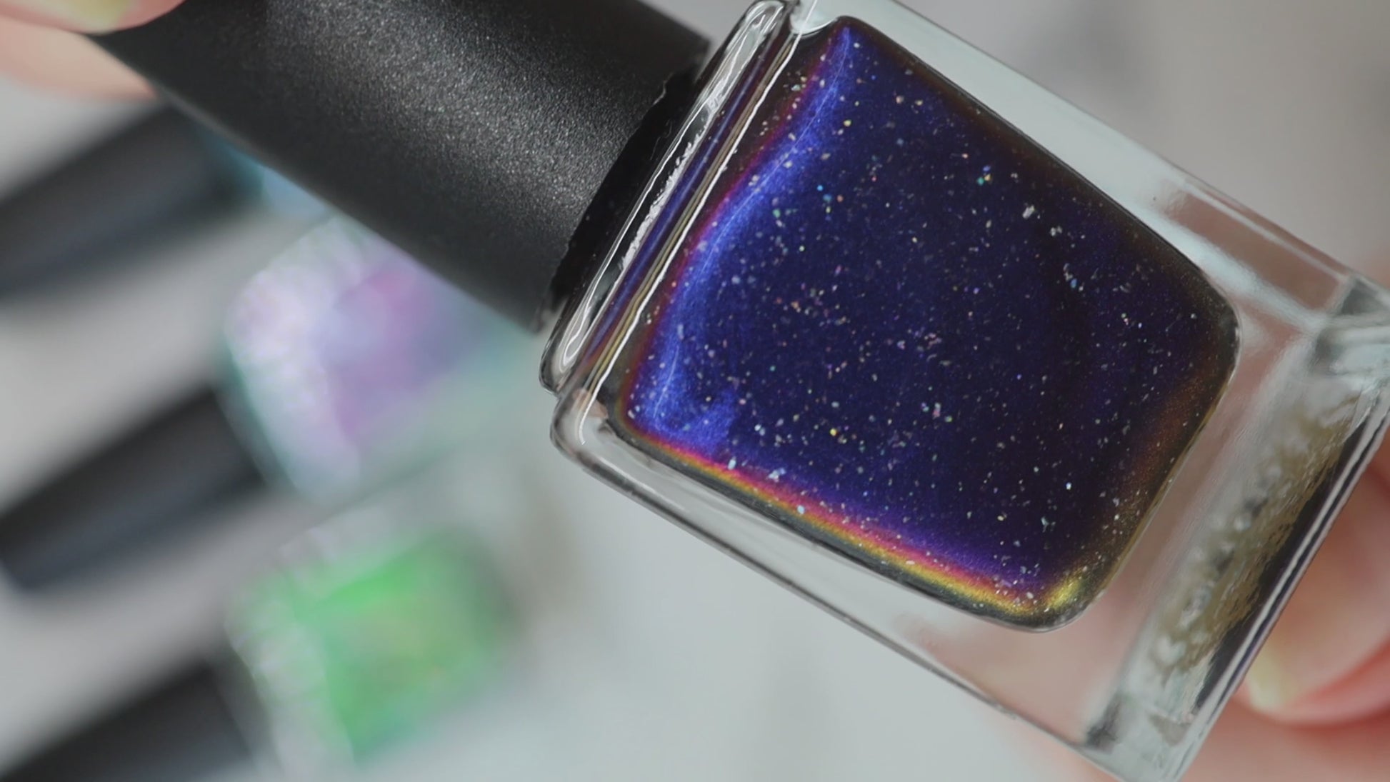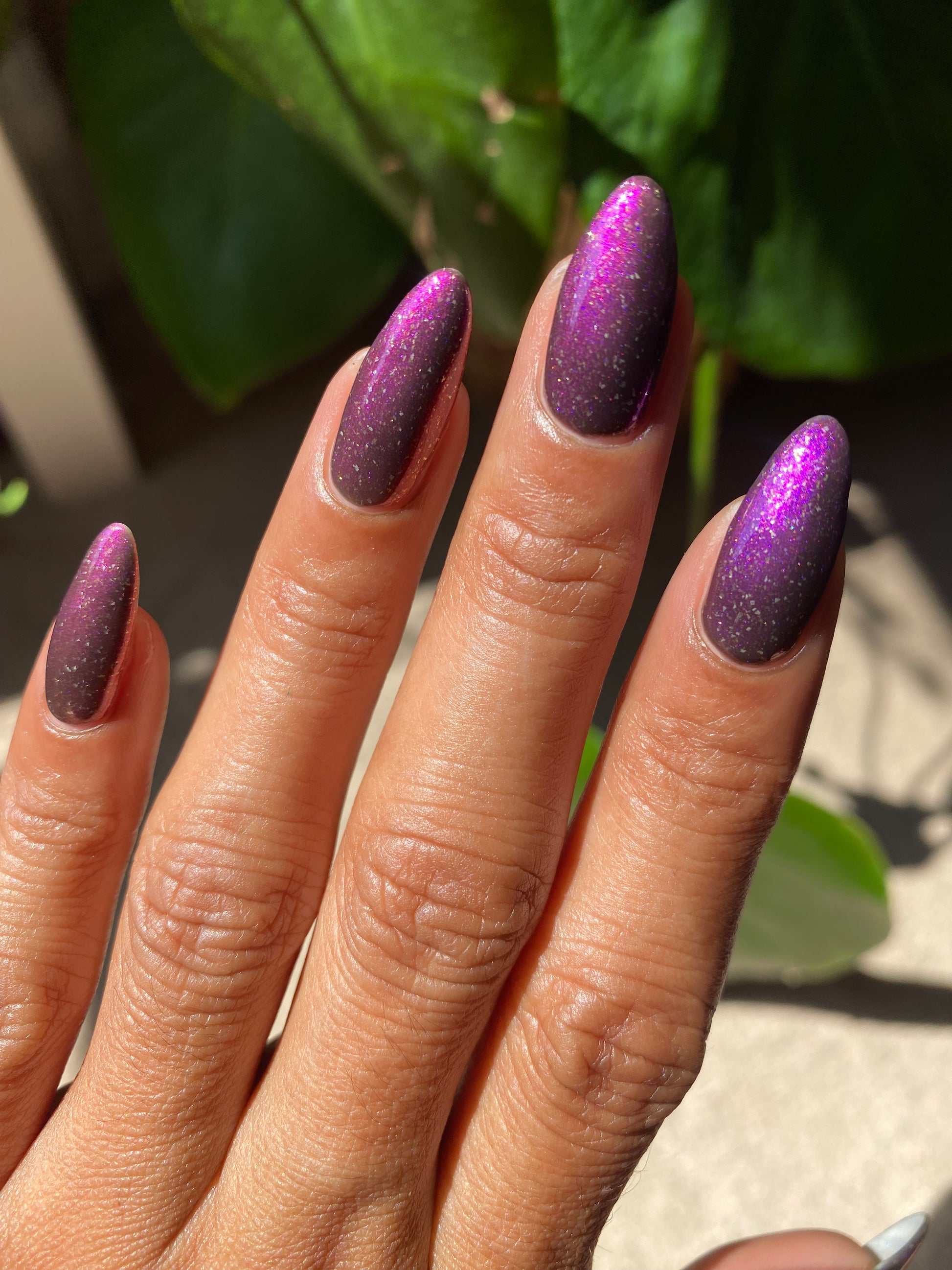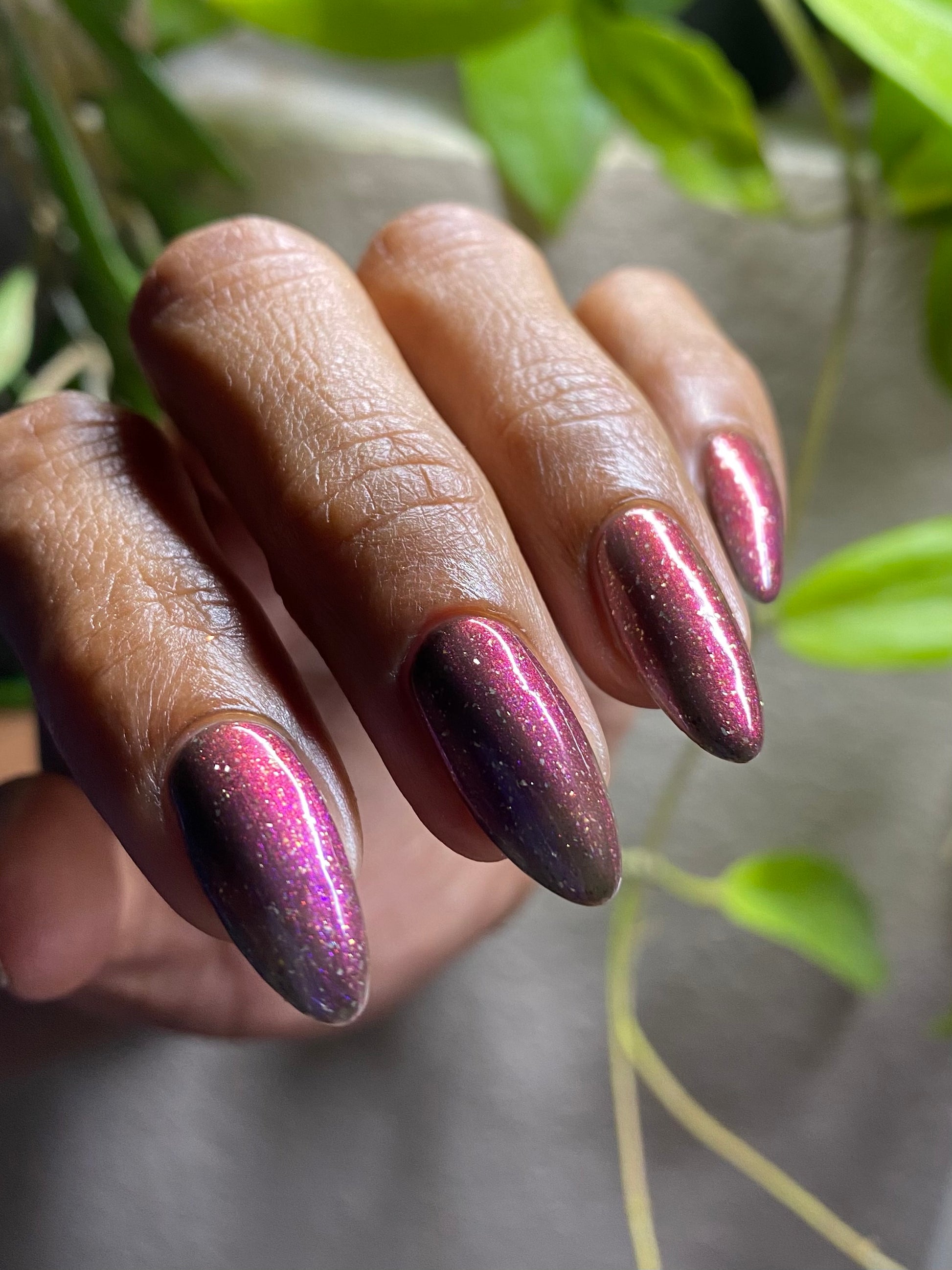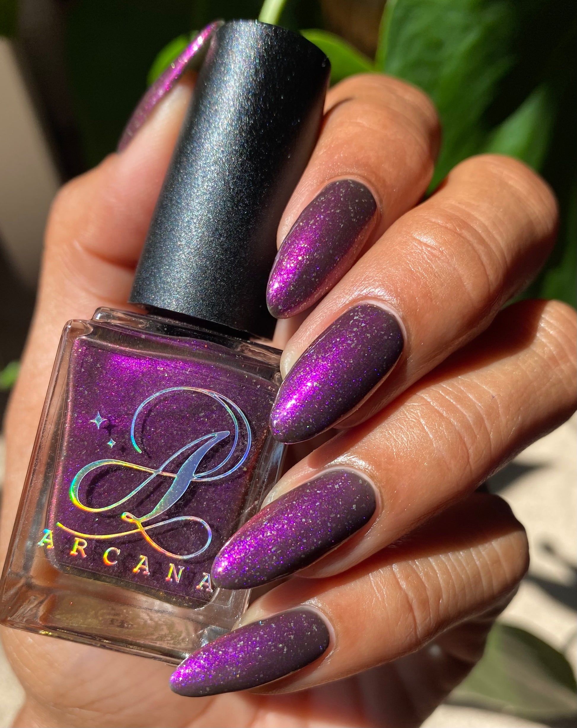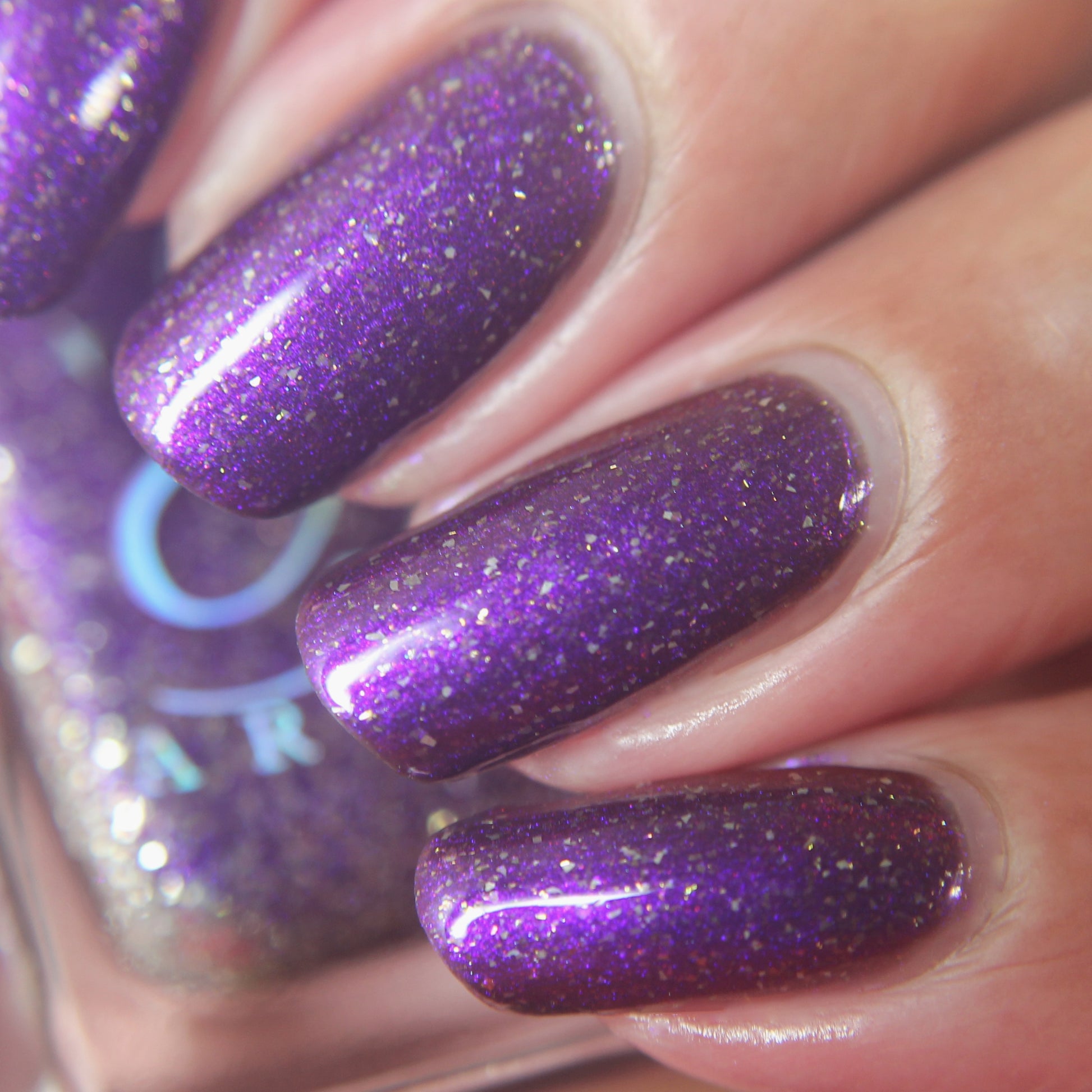 Testament of Myrkul is a light black base with purple to red shimmer, gold flakes, and silver flakes.