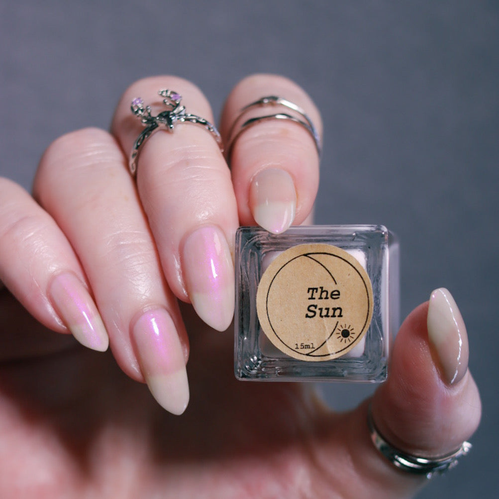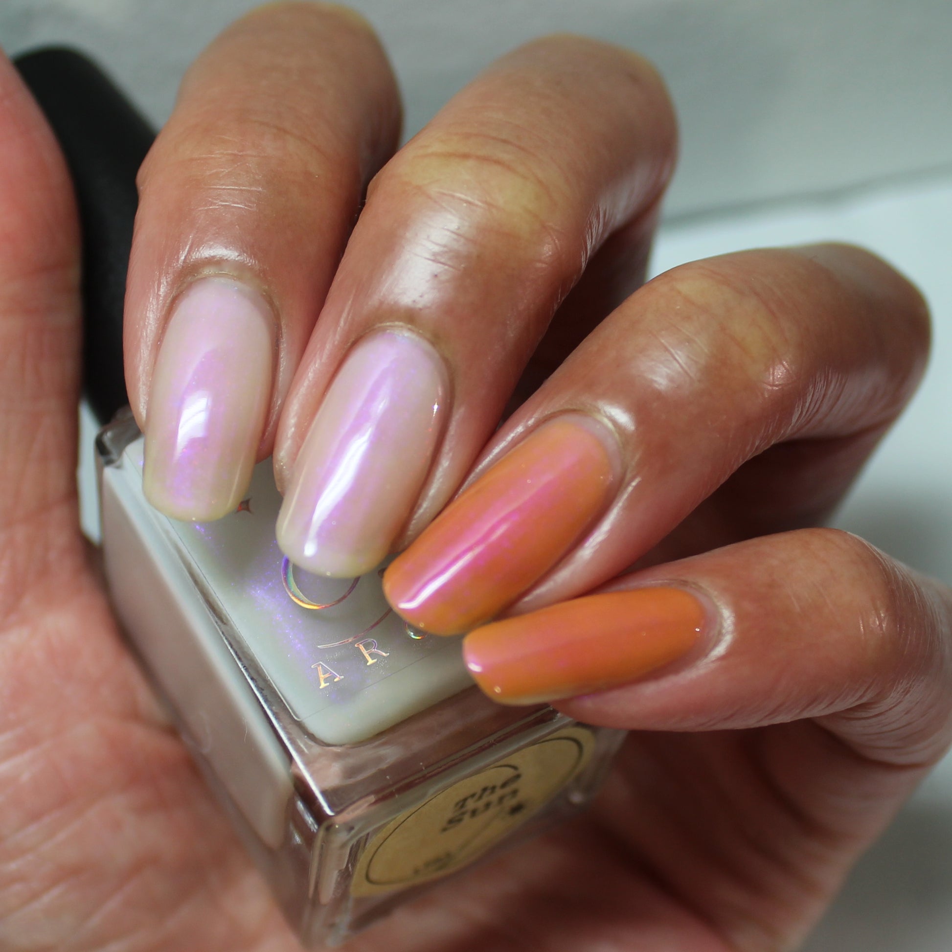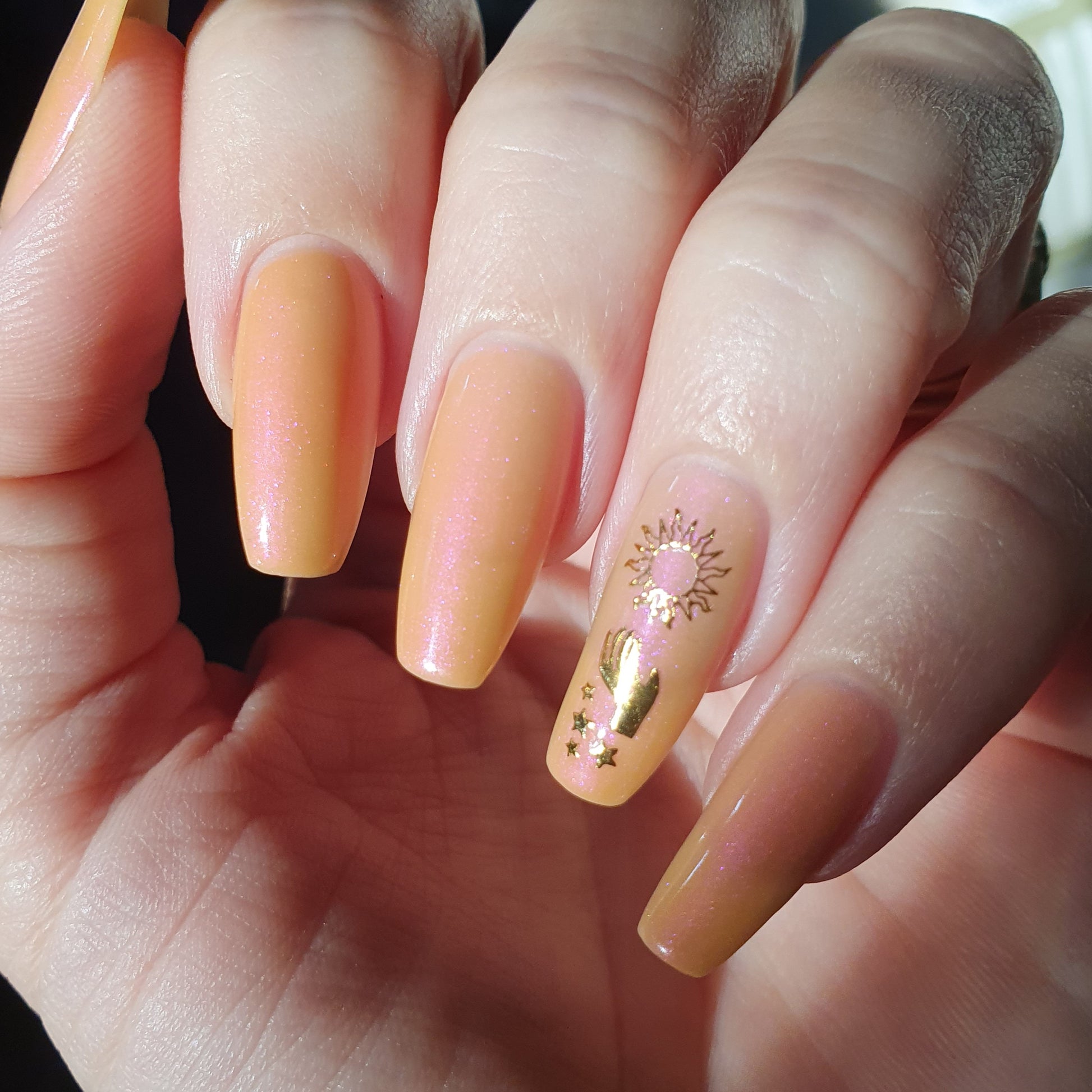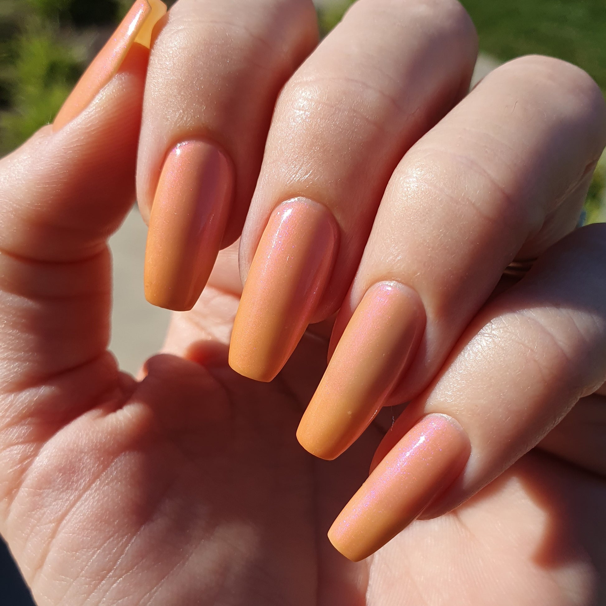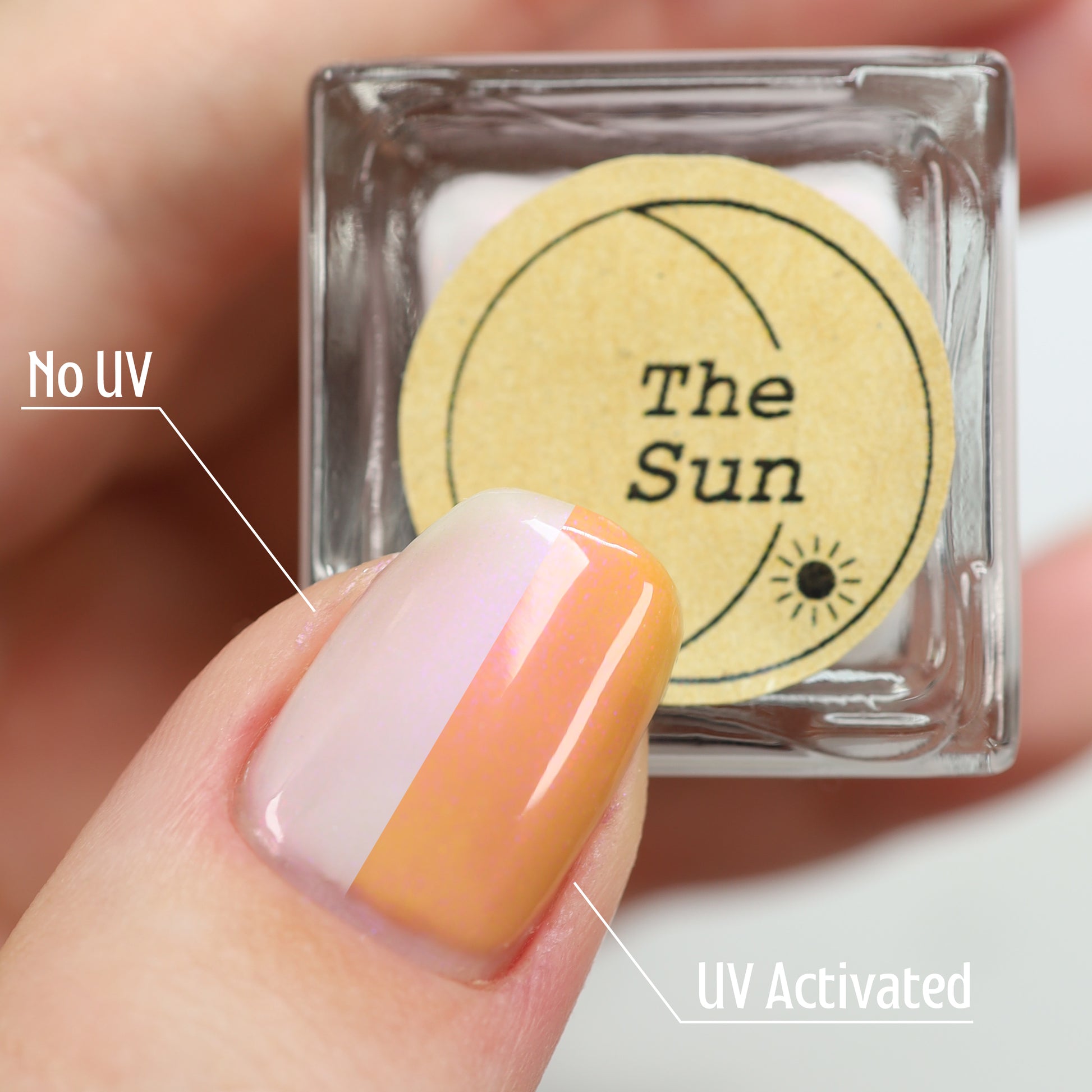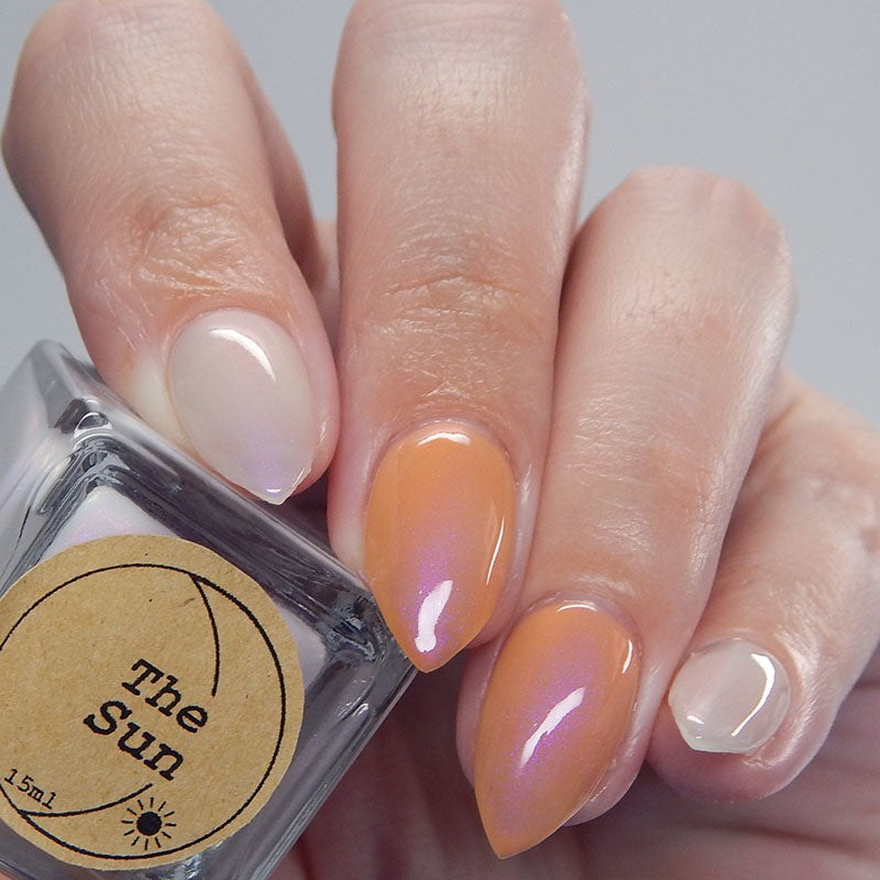 The Sun is a very light orange to orange UV reactive base with a red to purple shimmer. It really looks like a sunset on your fingers!