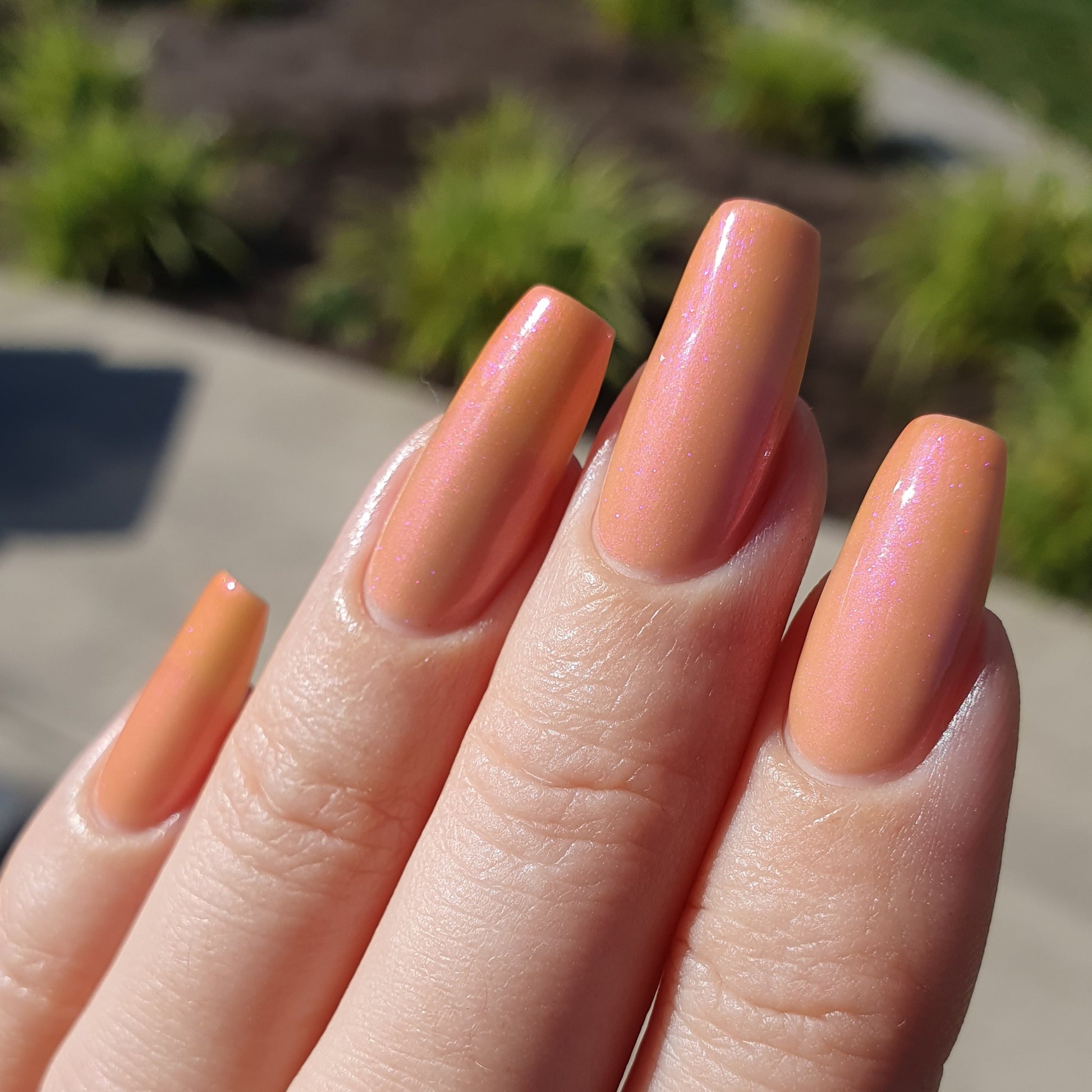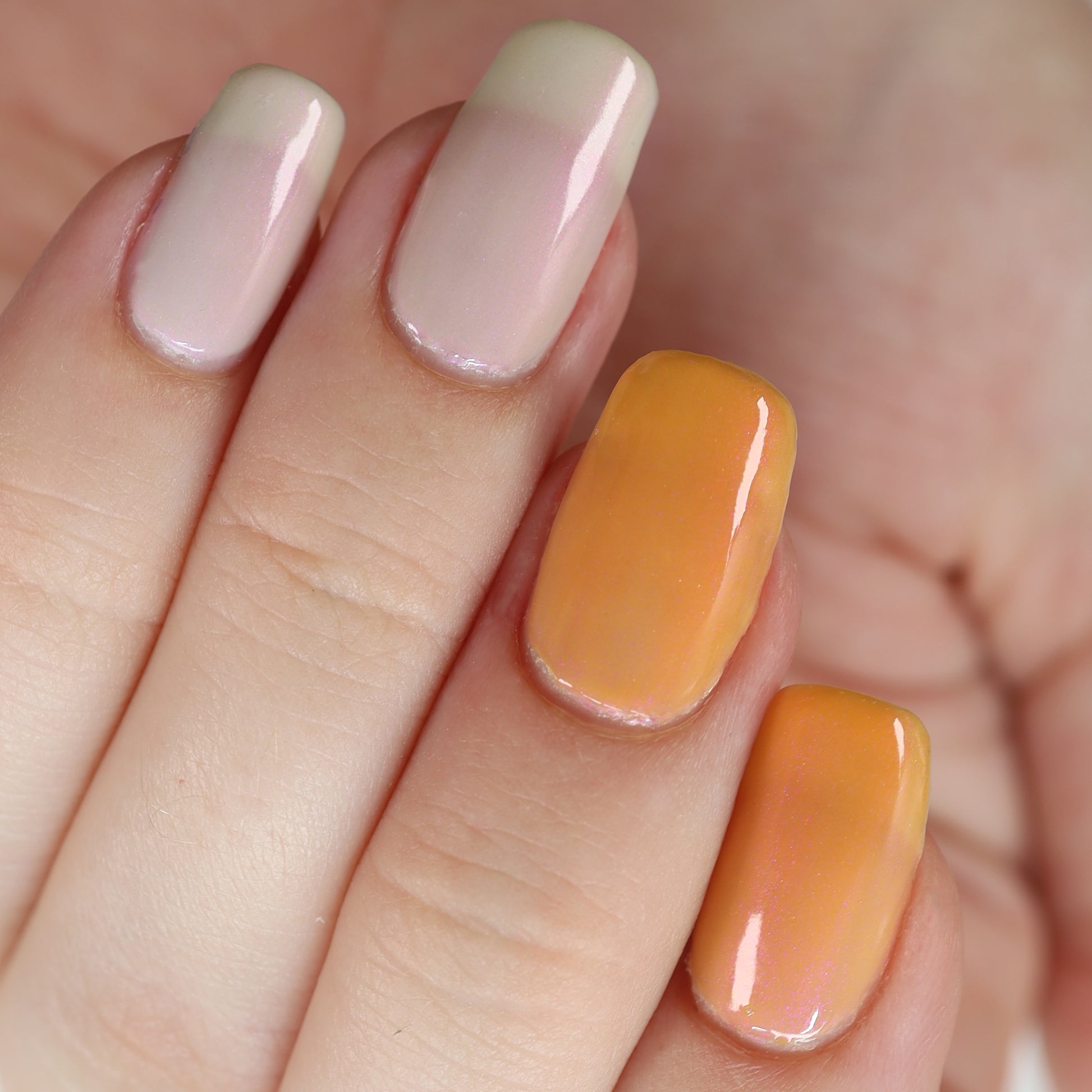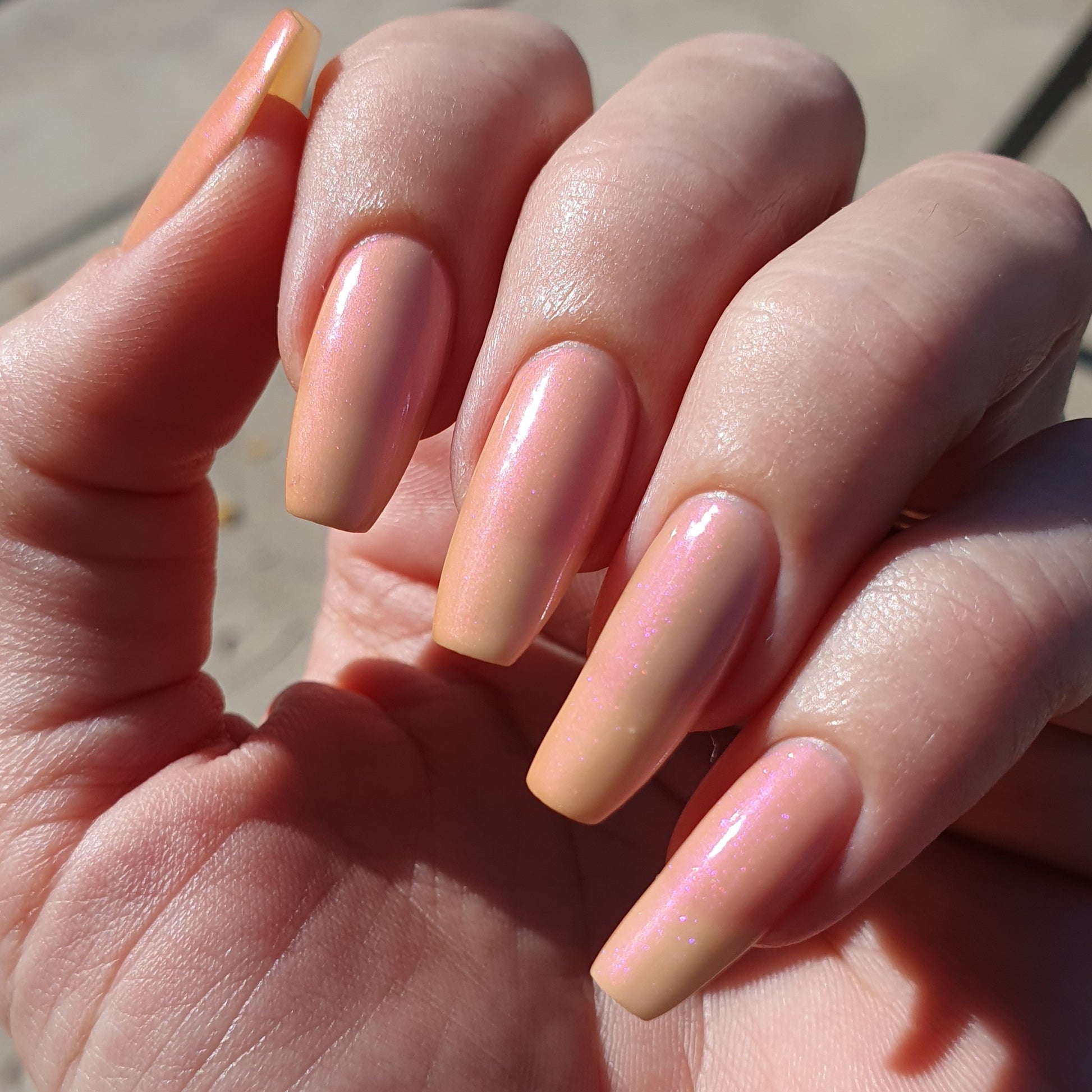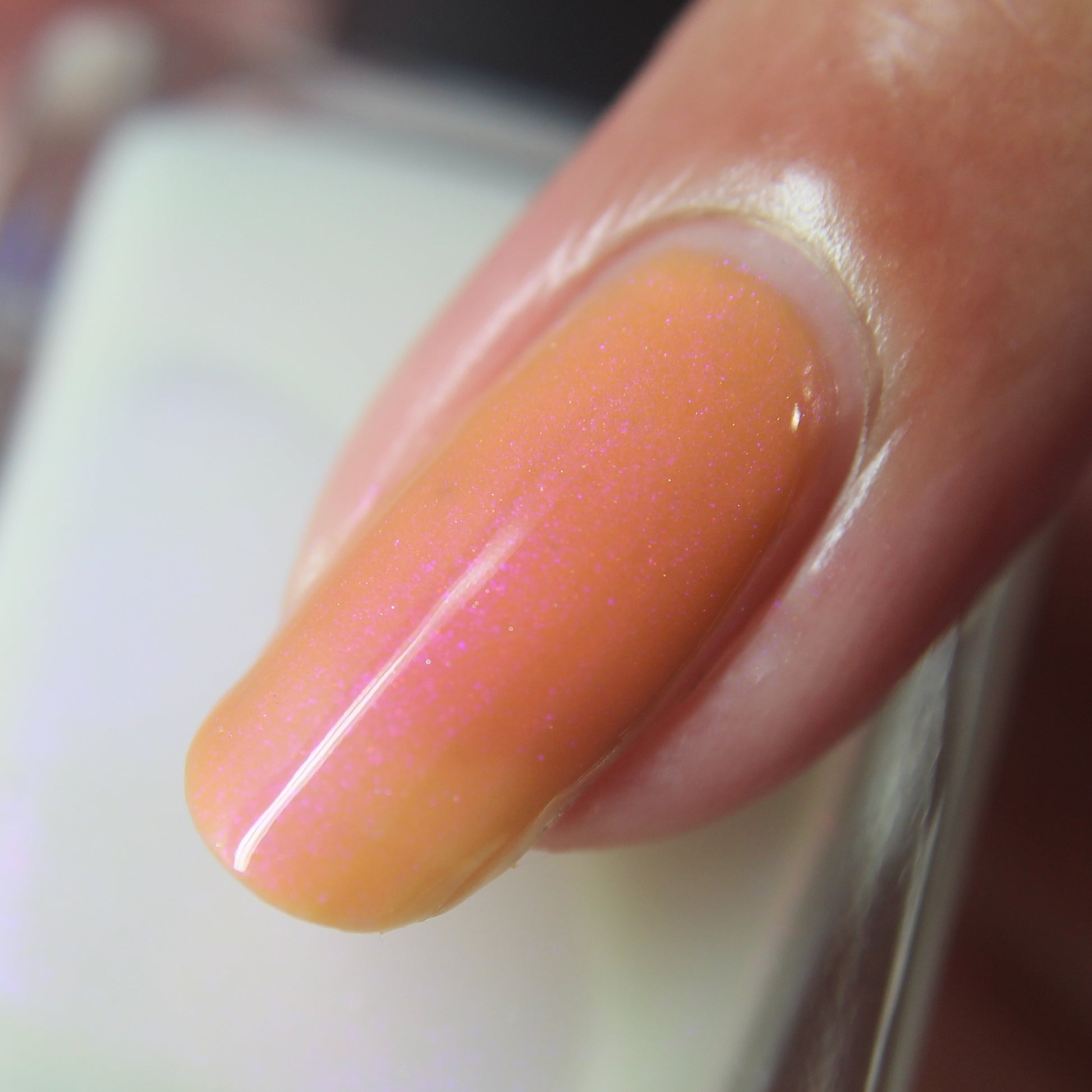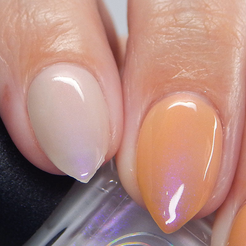 The Sun is a very light orange to orange UV reactive base with a red to purple shimmer. It really looks like a sunset on your fingers!