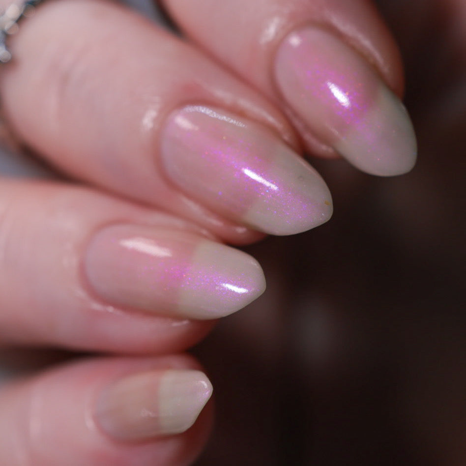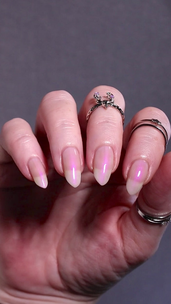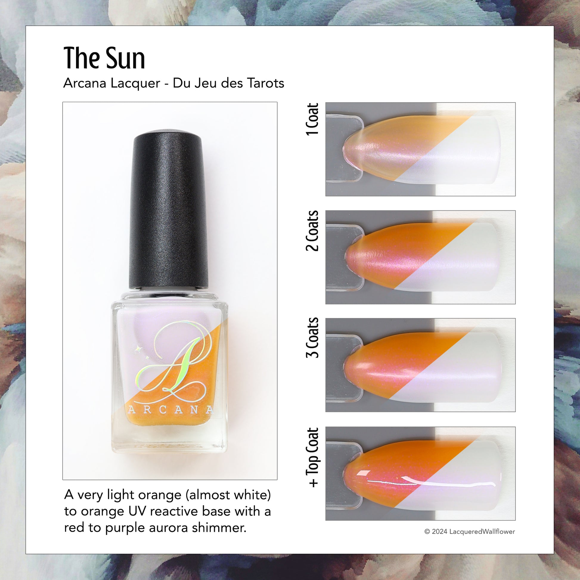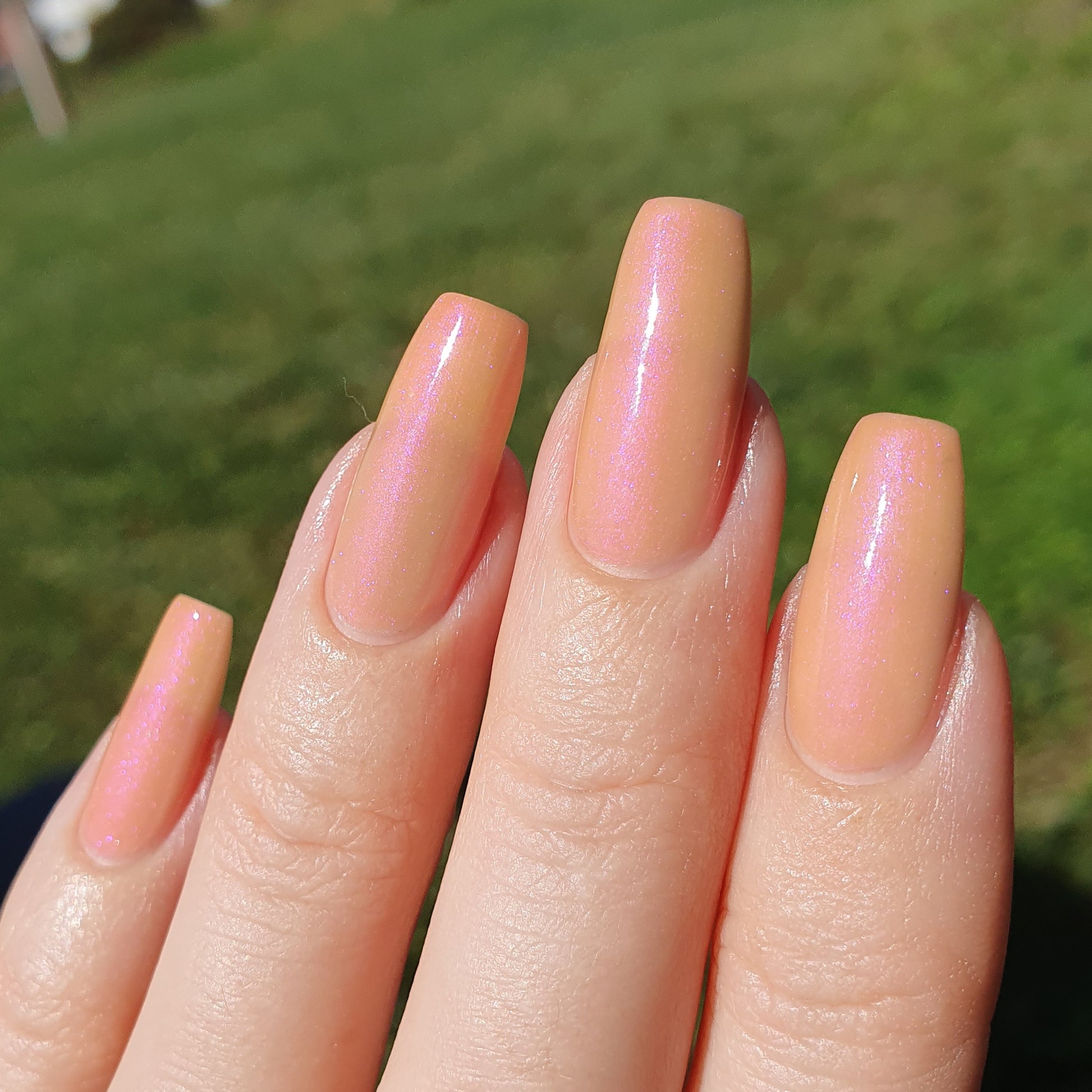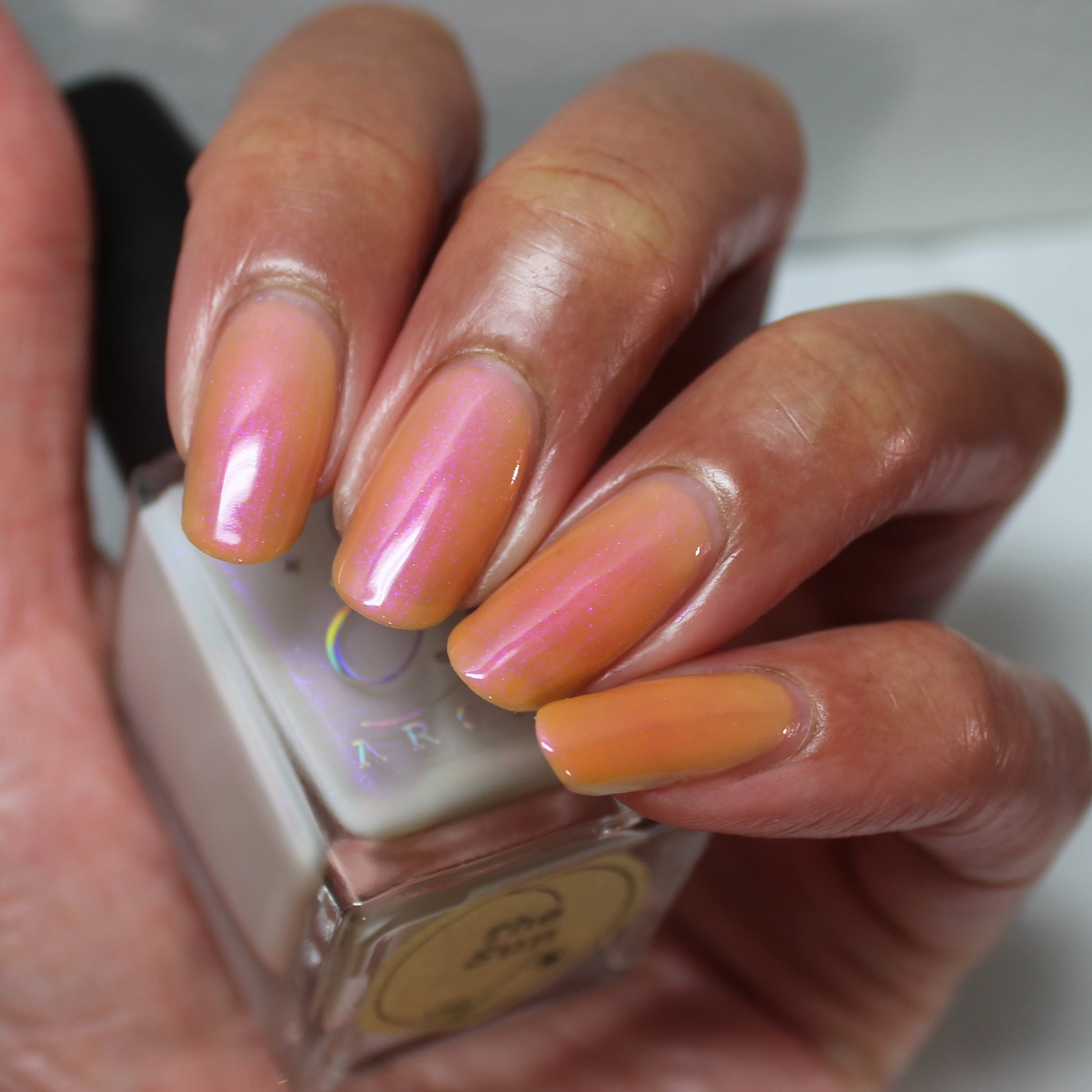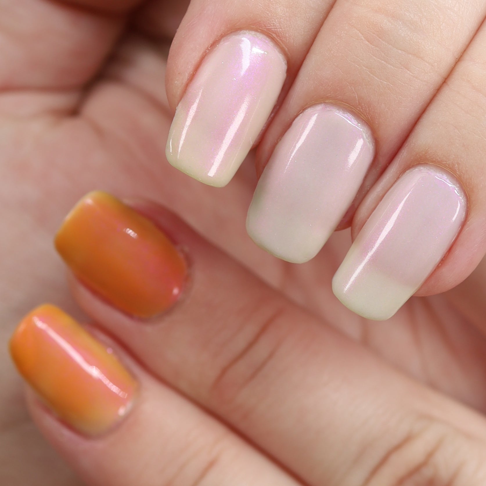 The Sun is a very light orange to orange UV reactive base with a red to purple shimmer. It really looks like a sunset on your fingers!
