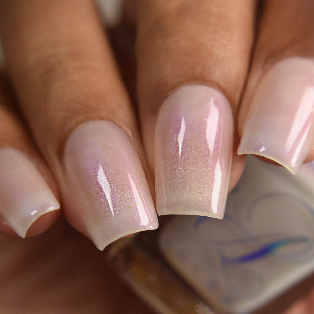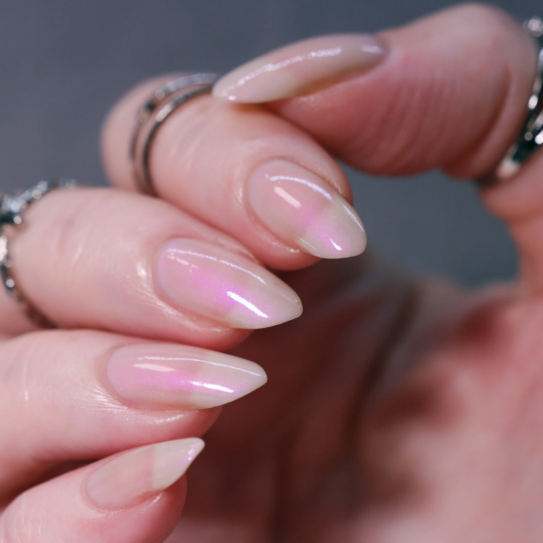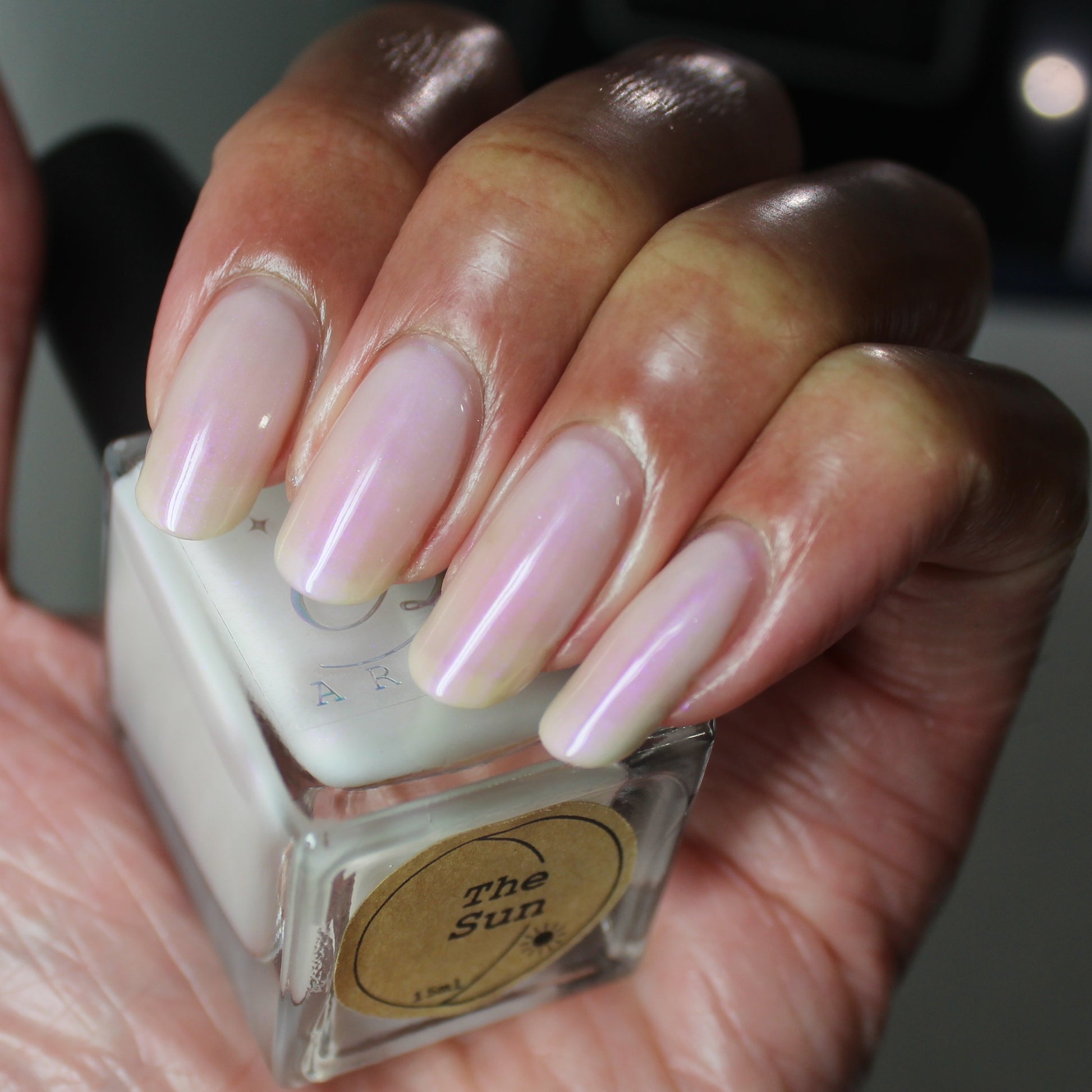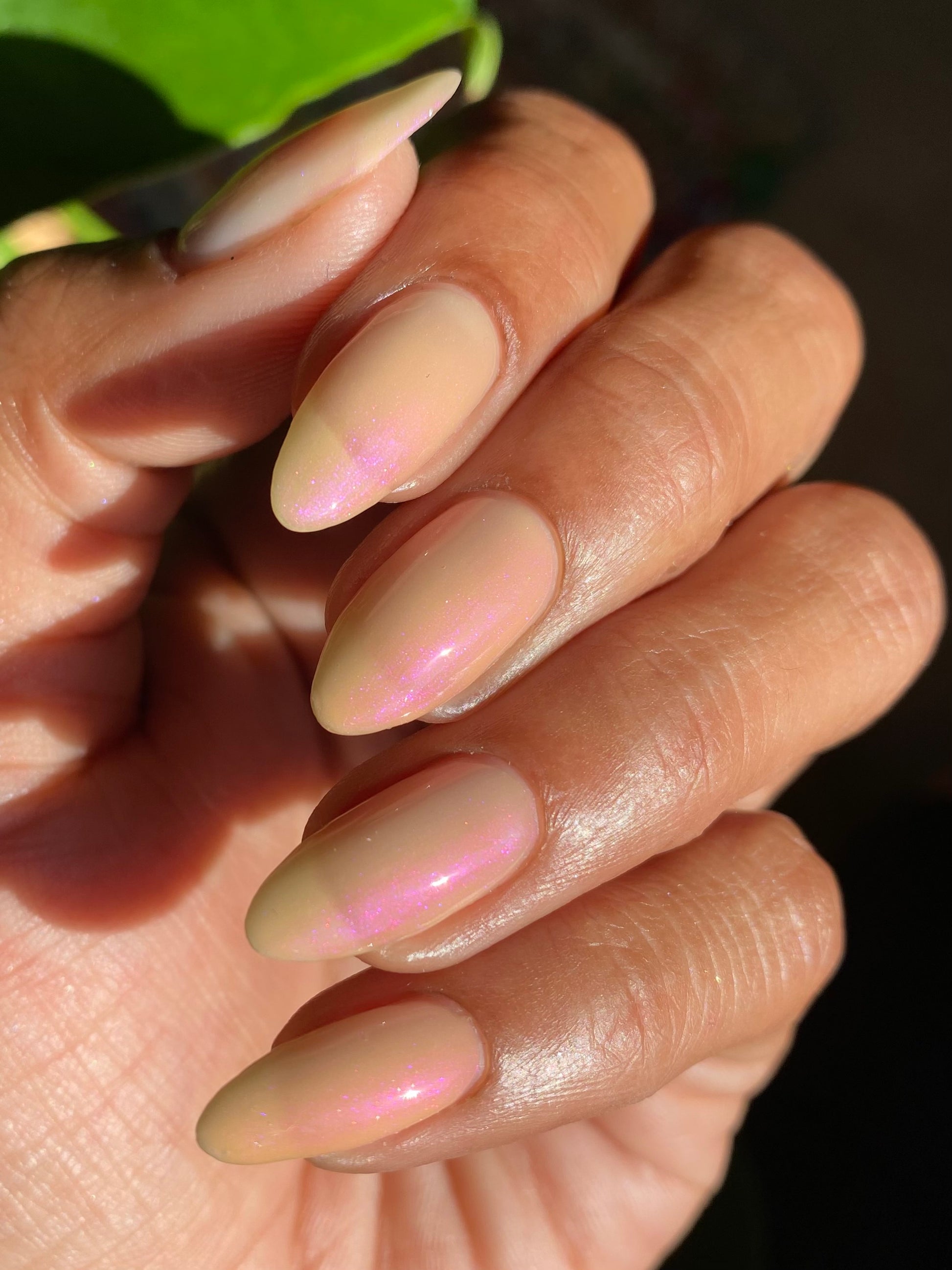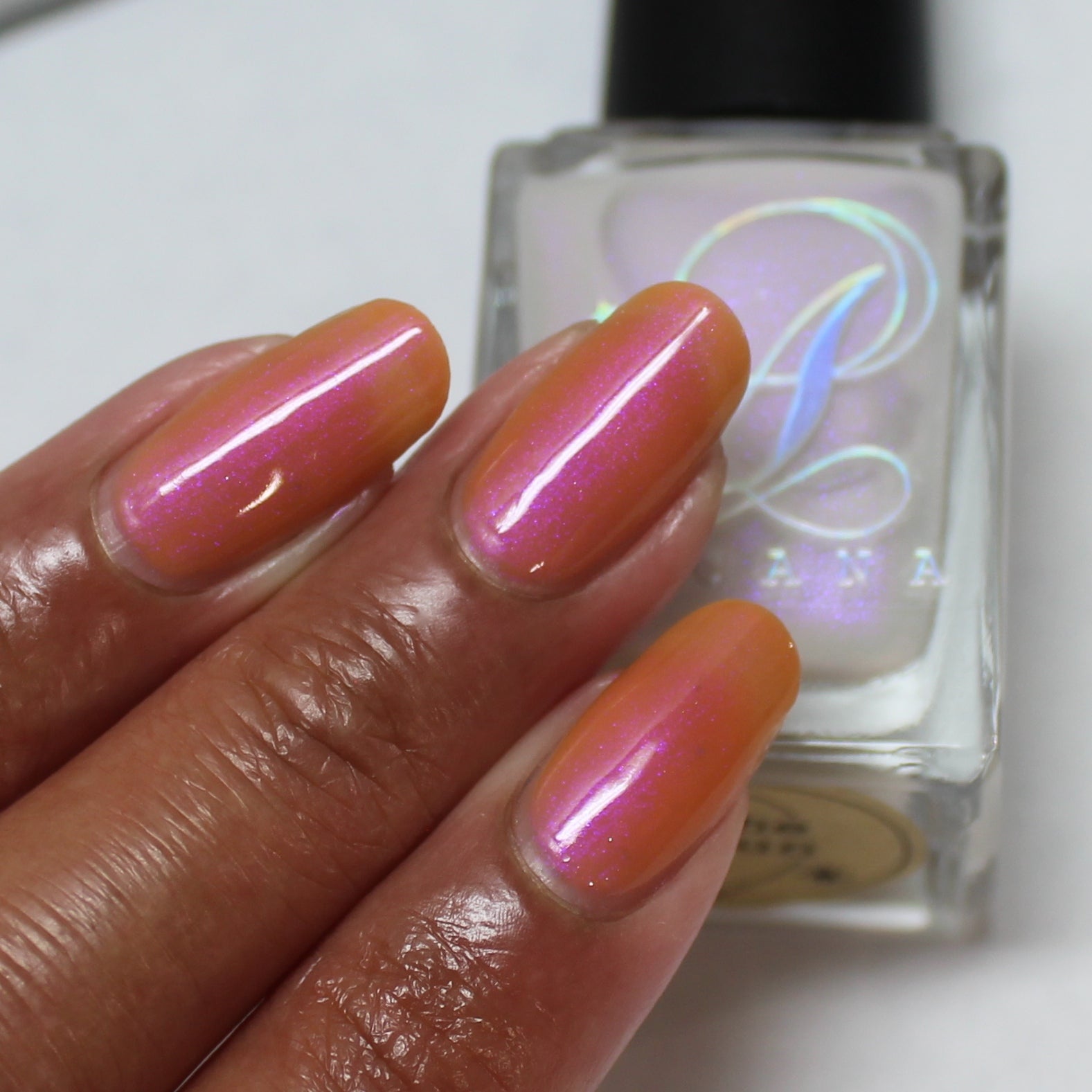 The Sun is a very light orange to orange UV reactive base with a red to purple shimmer. It really looks like a sunset on your fingers!
