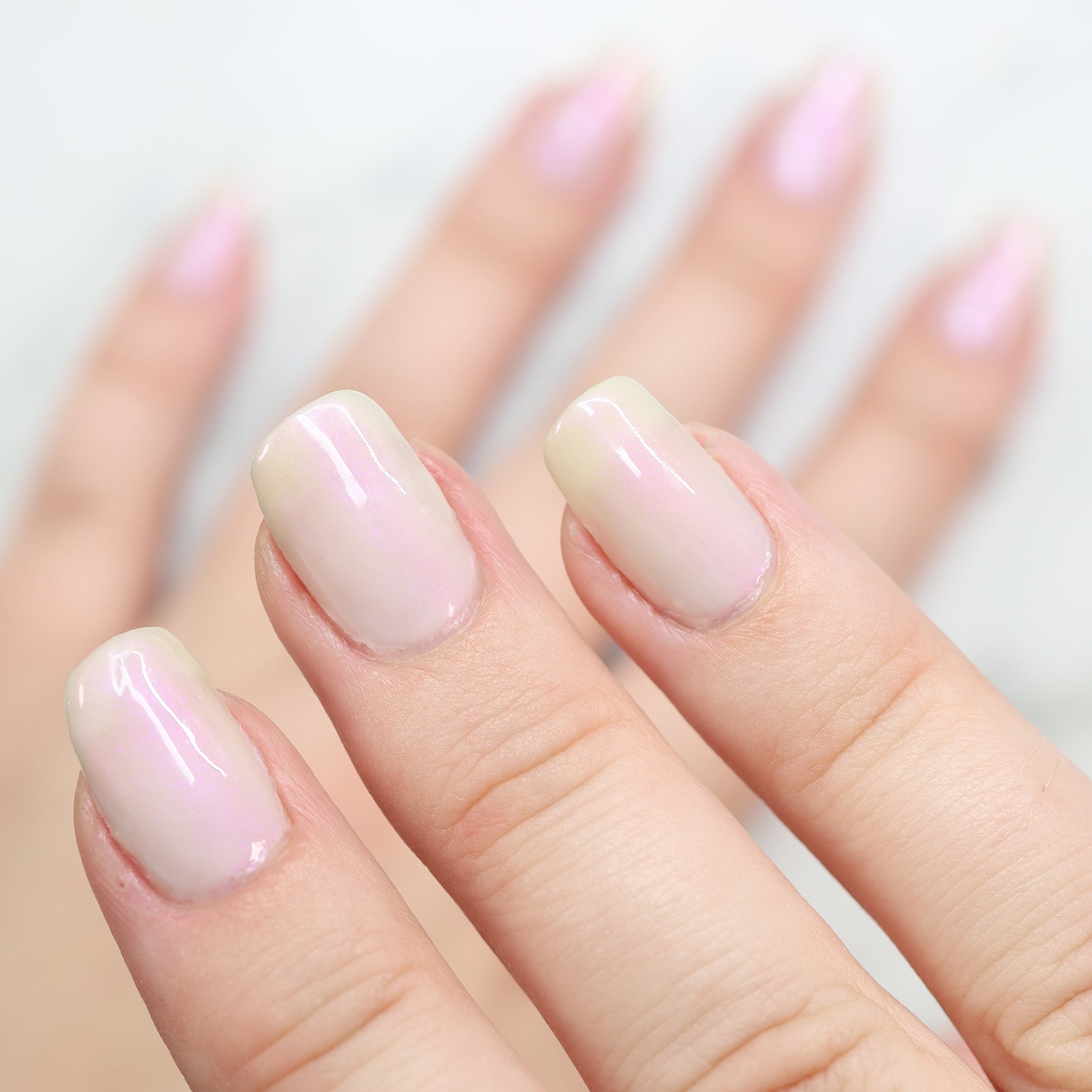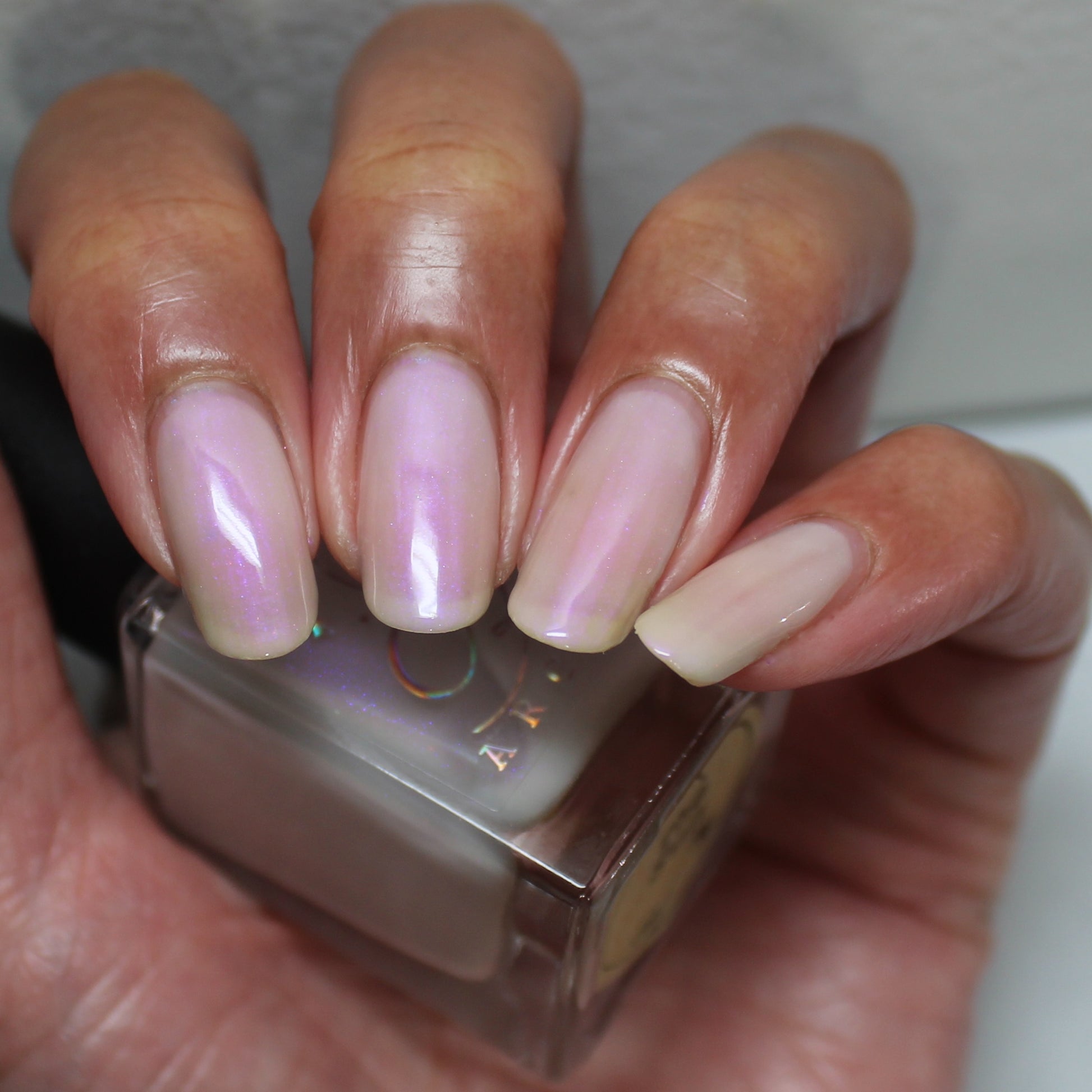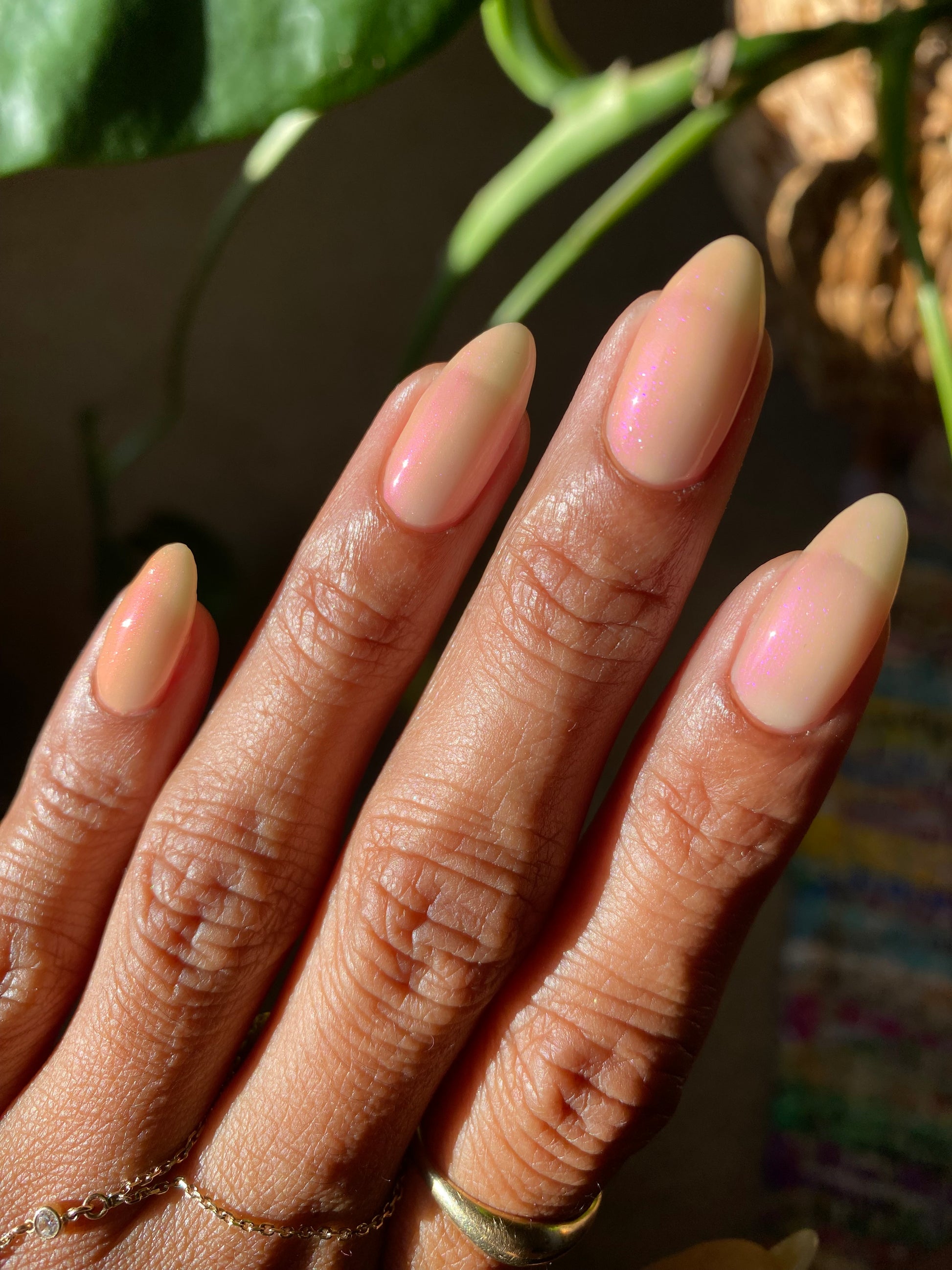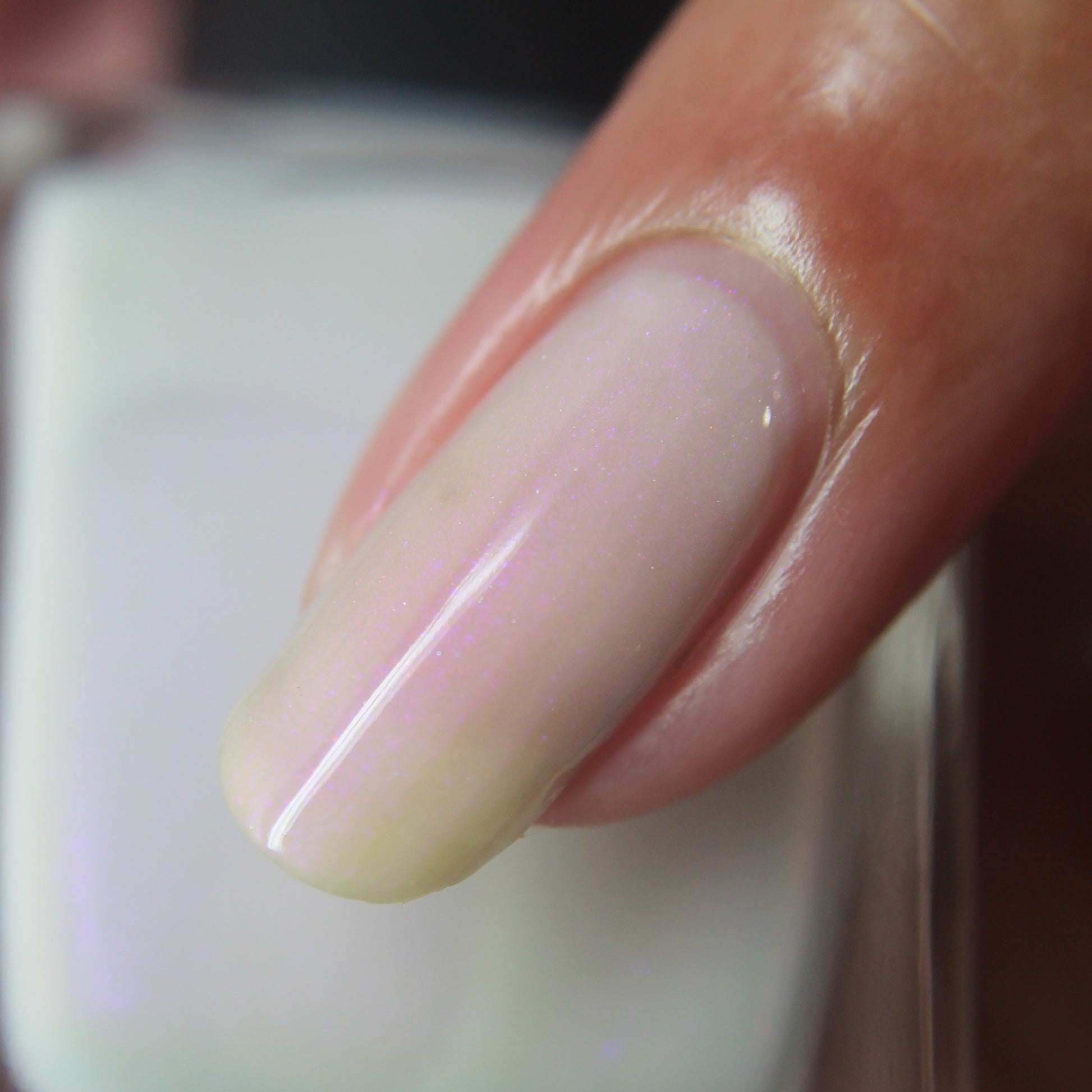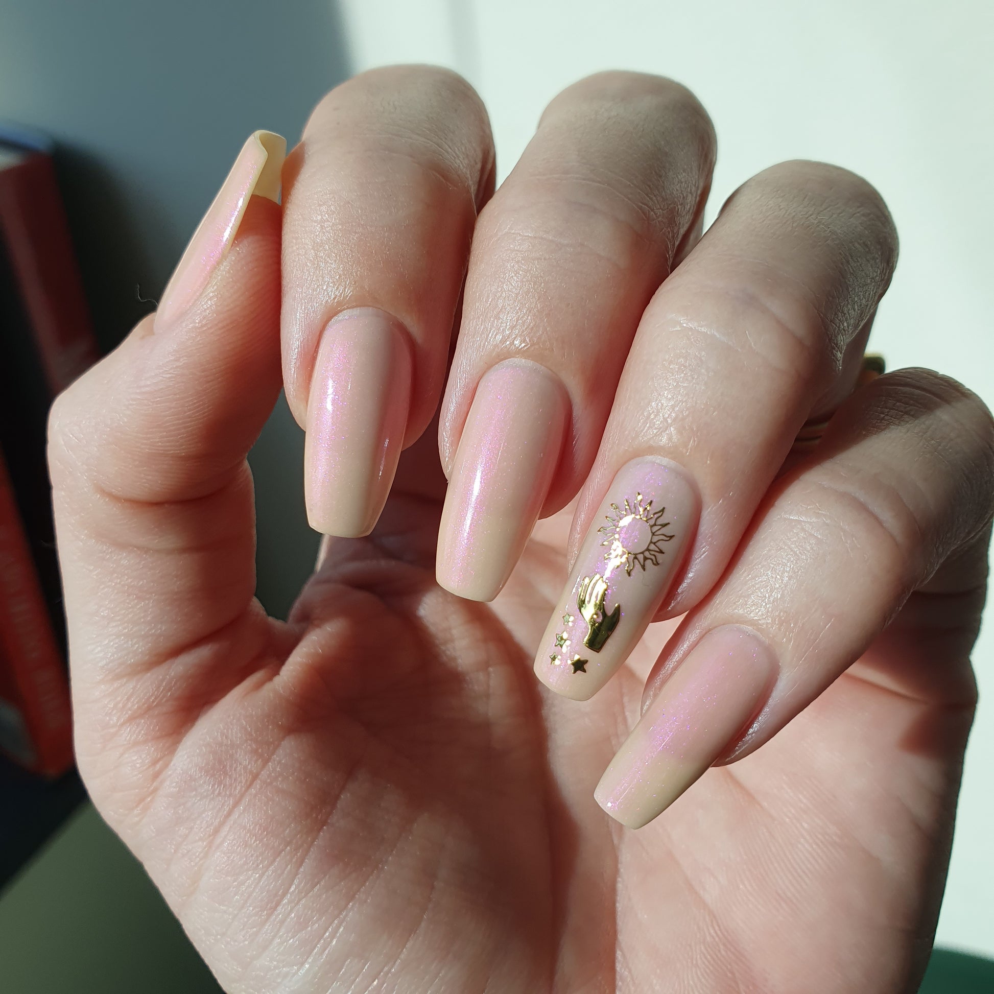 The Sun is a very light orange to orange UV reactive base with a red to purple shimmer. It really looks like a sunset on your fingers!