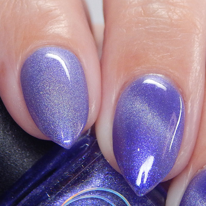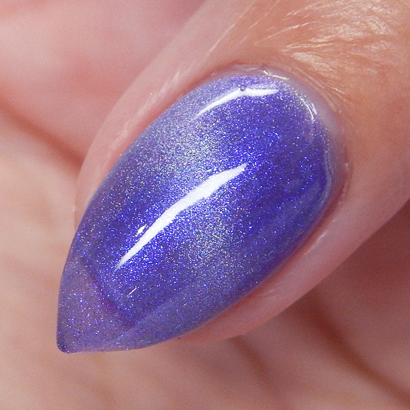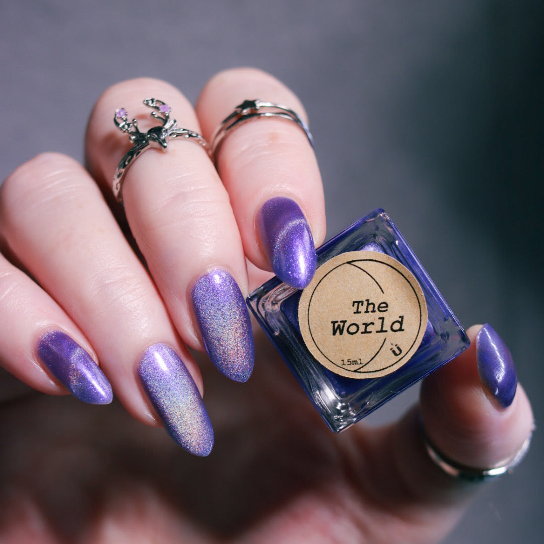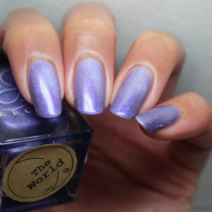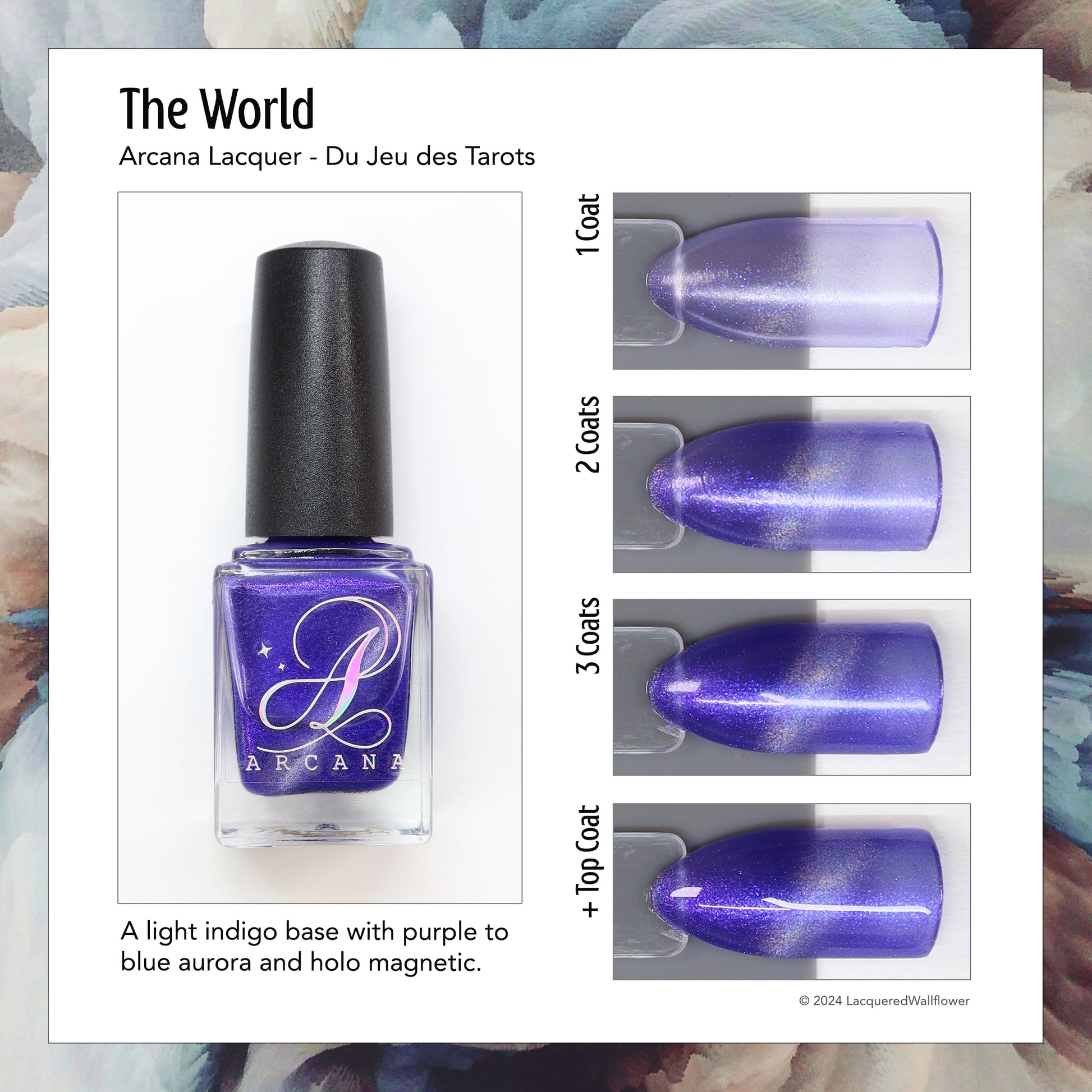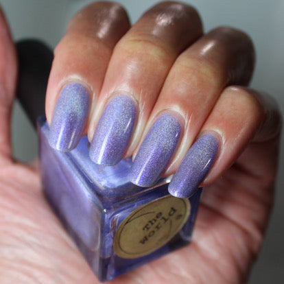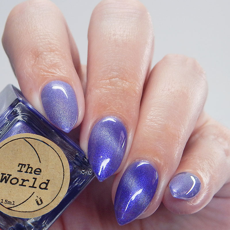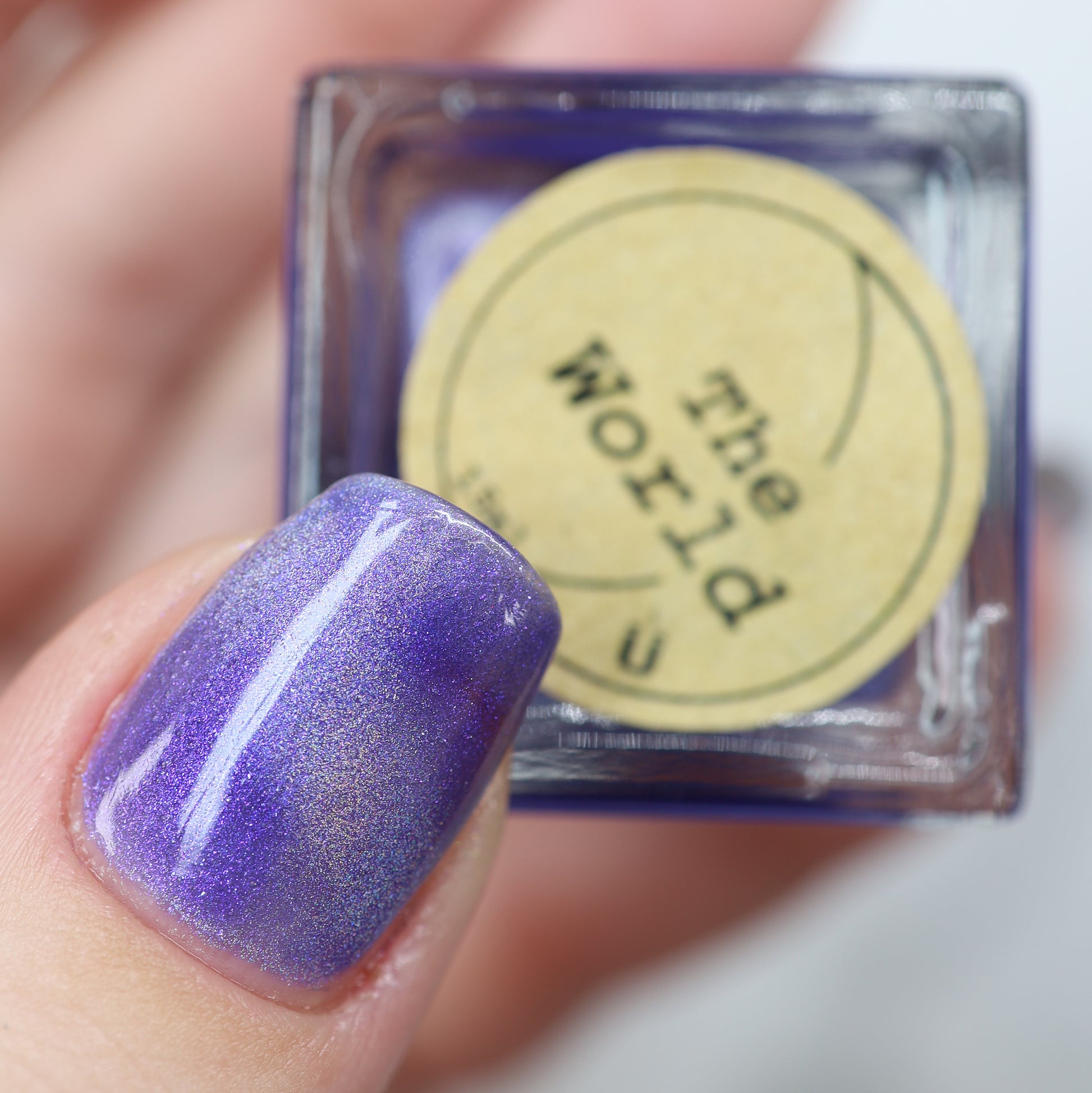 The World is a bright purple-leaning blue with purple to silver shimmer and holographic magnetic pigment.