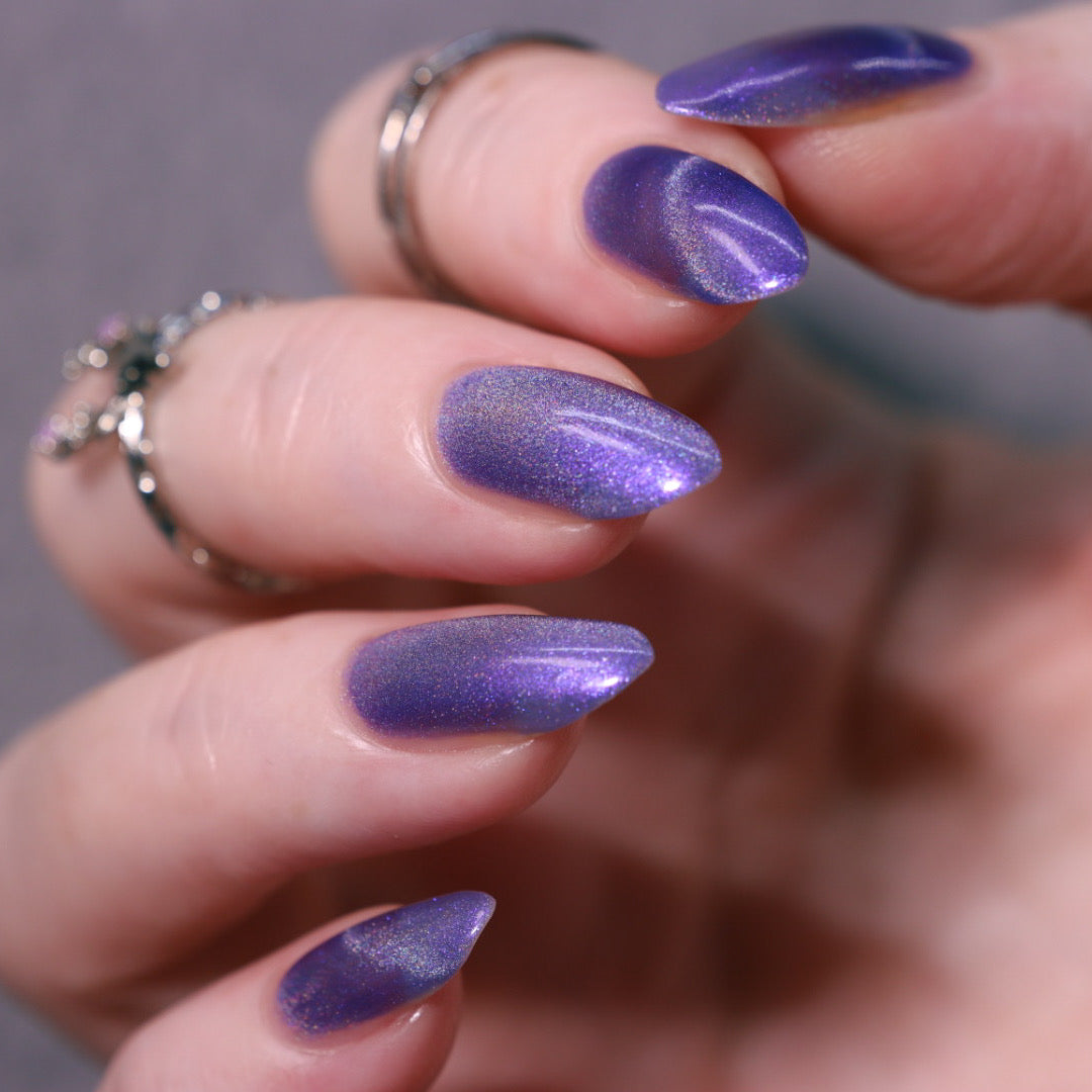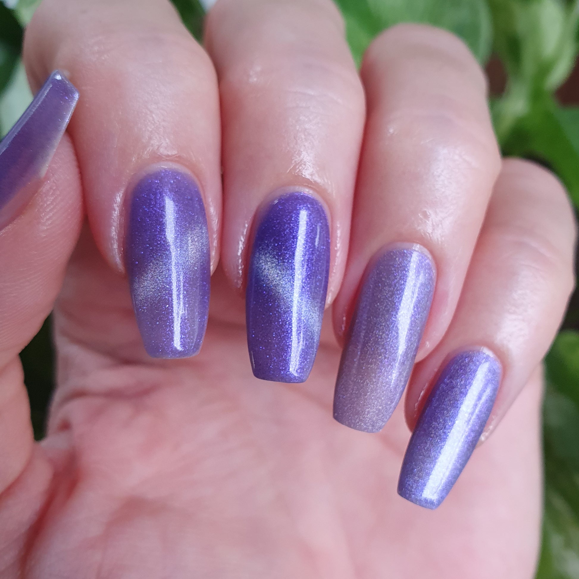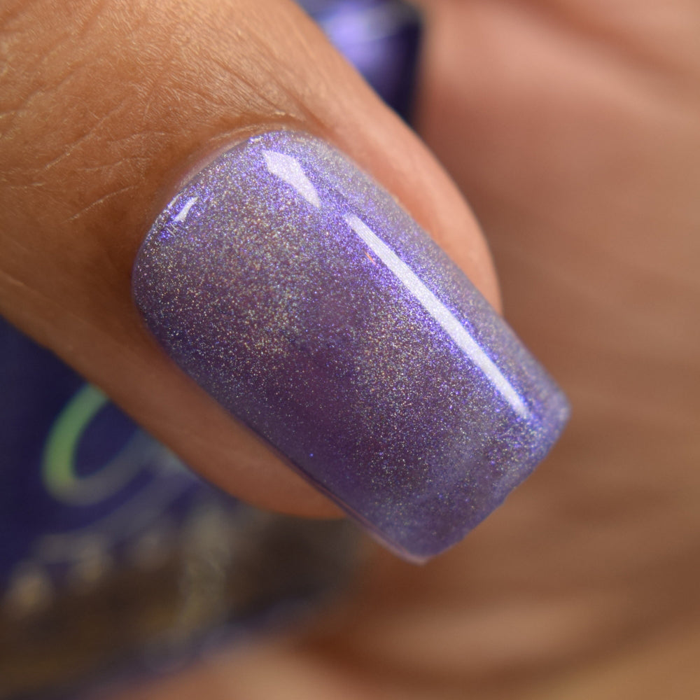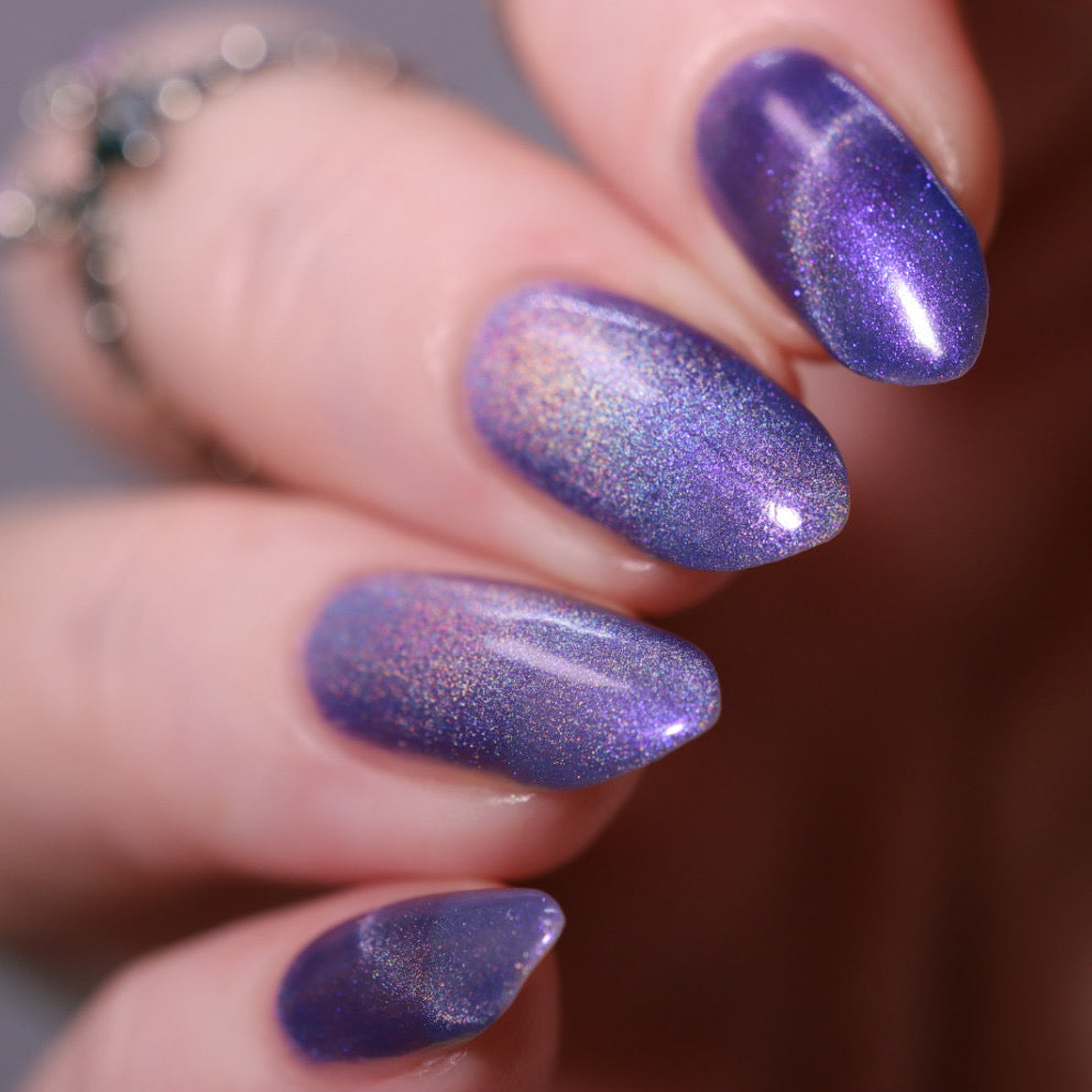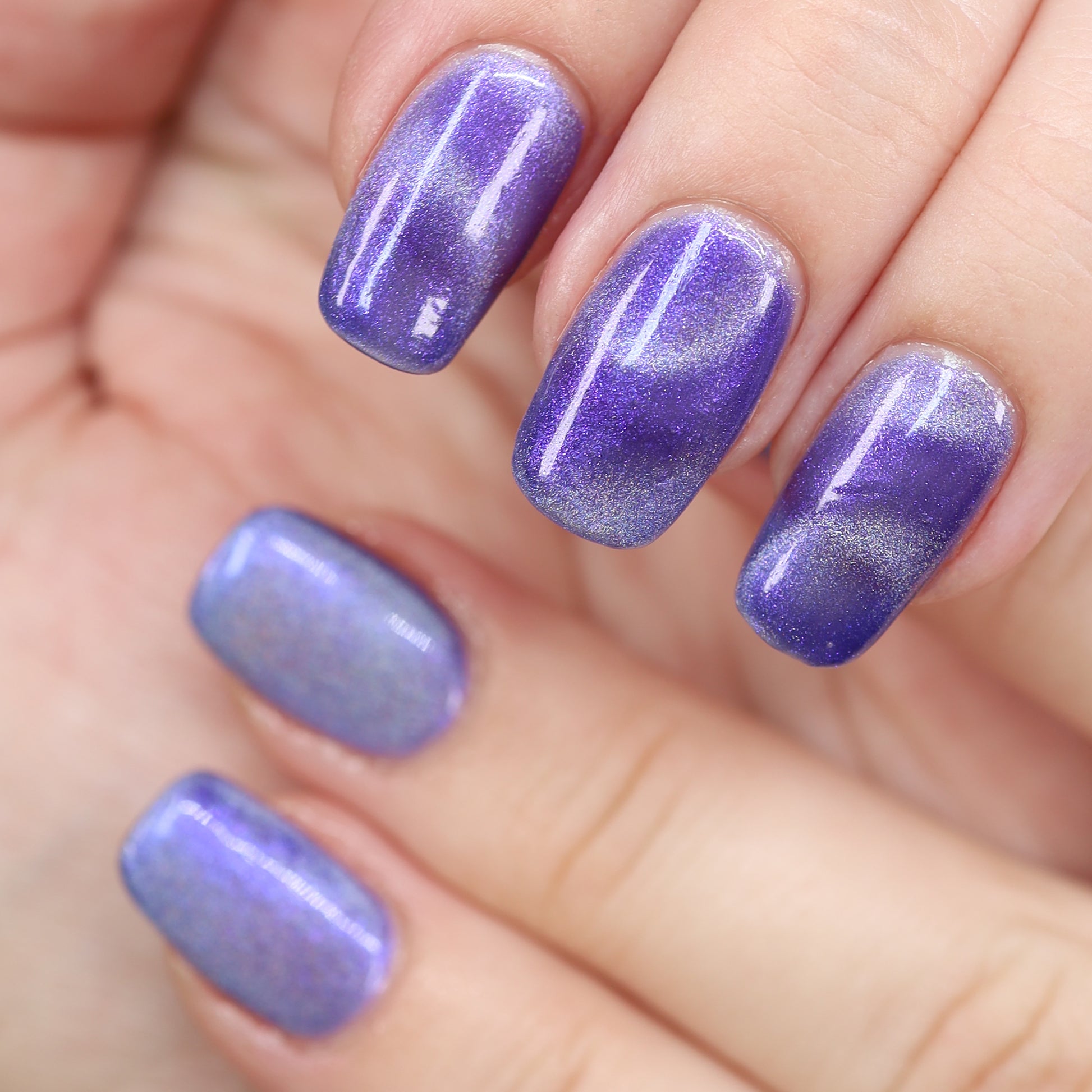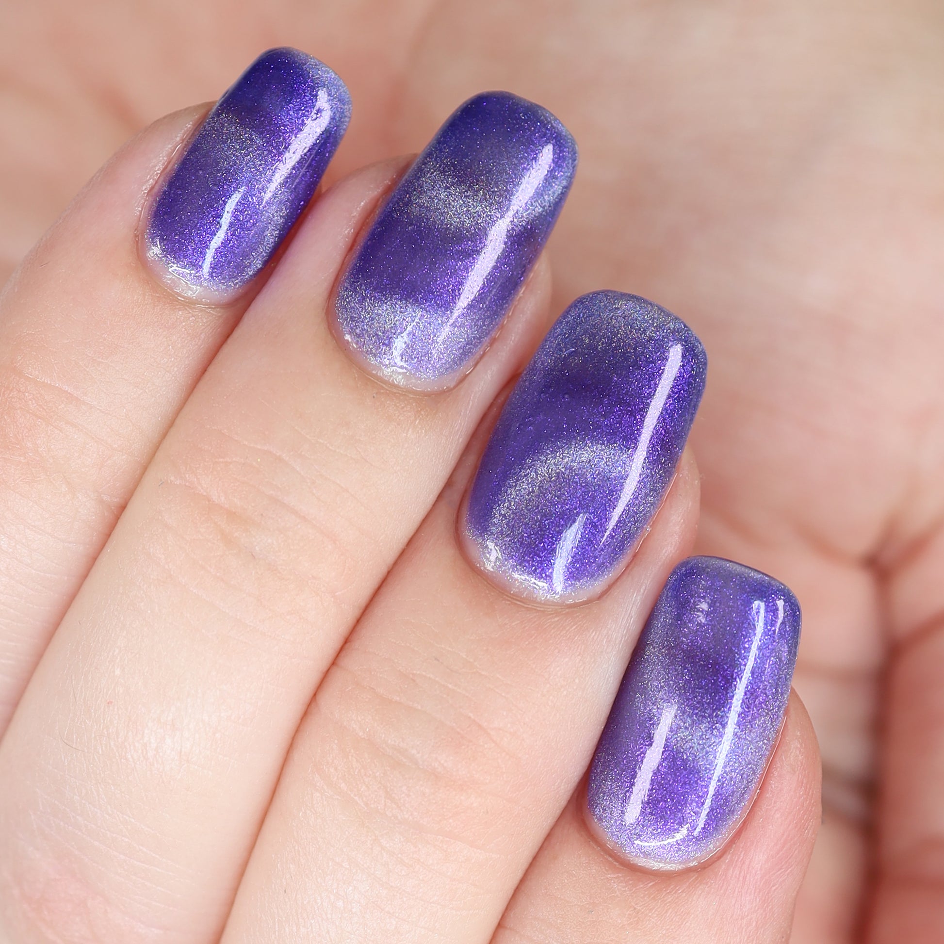 The World is a bright purple-leaning blue with purple to silver shimmer and holographic magnetic pigment.