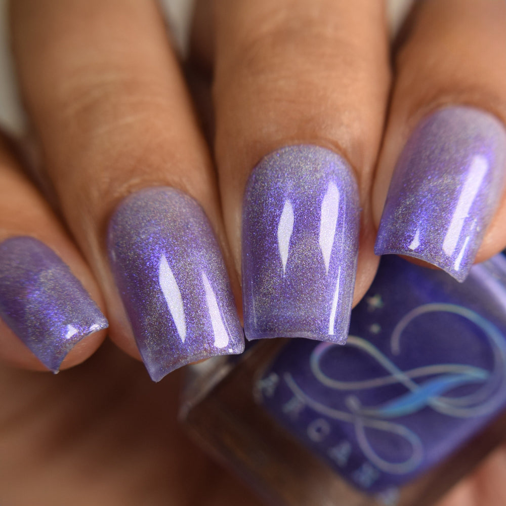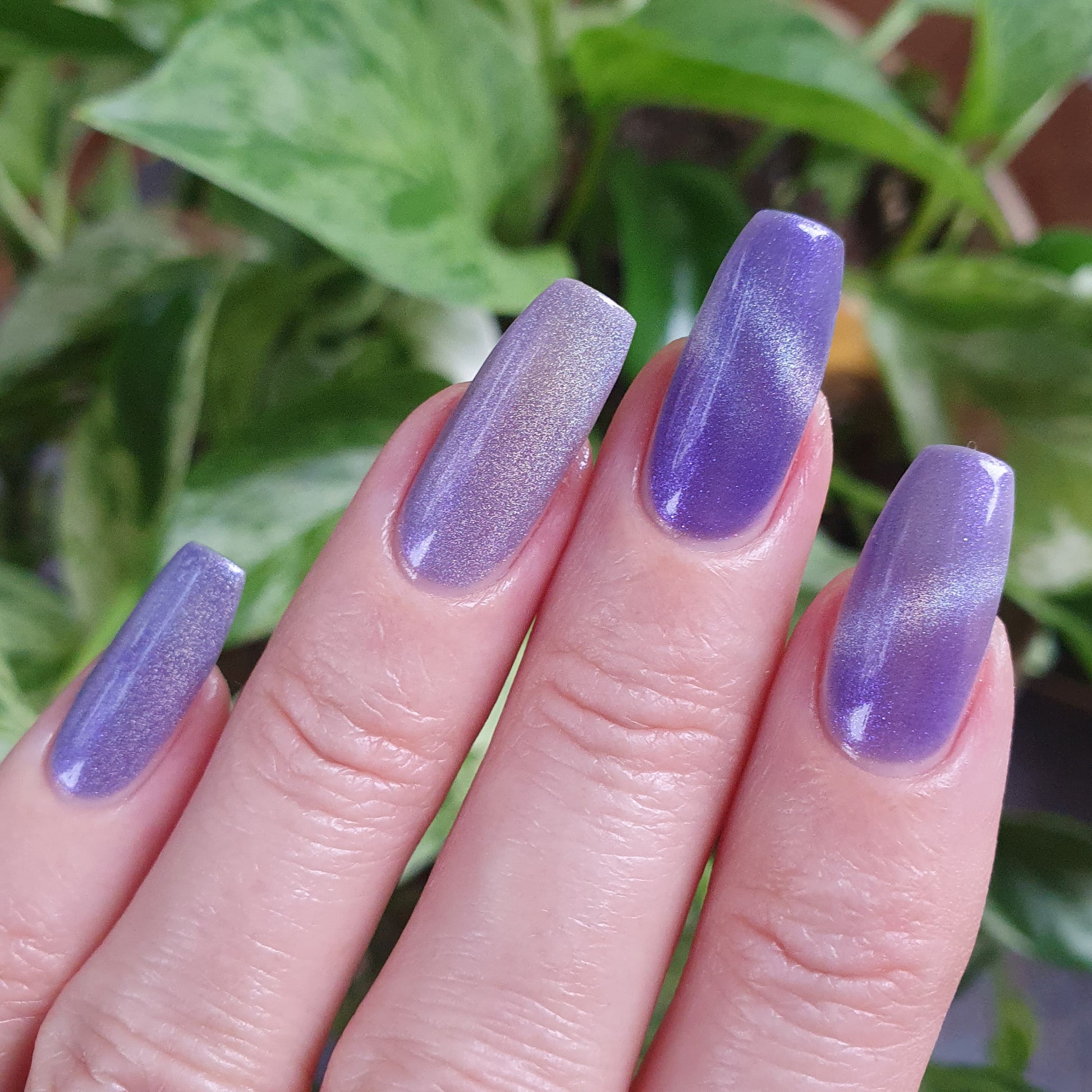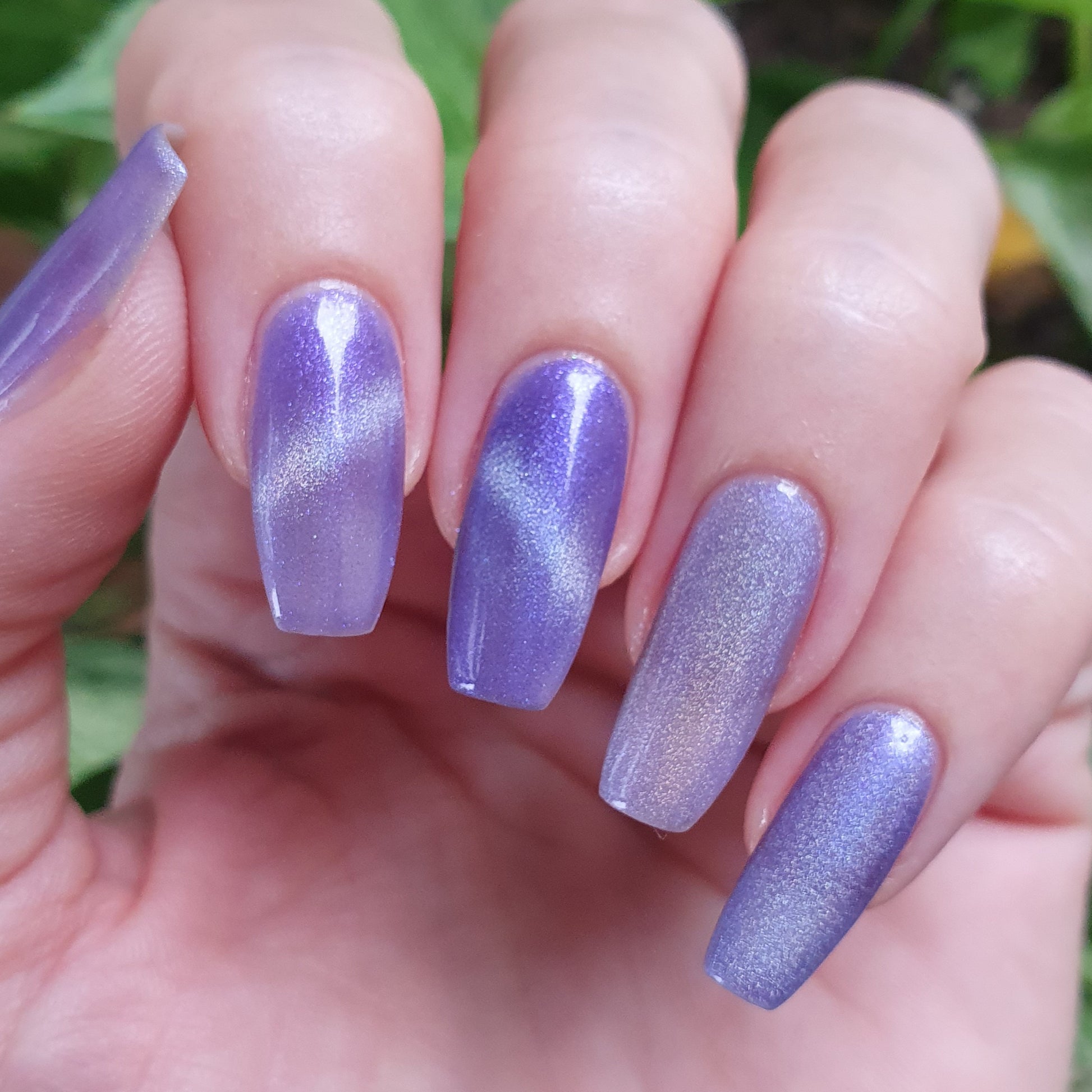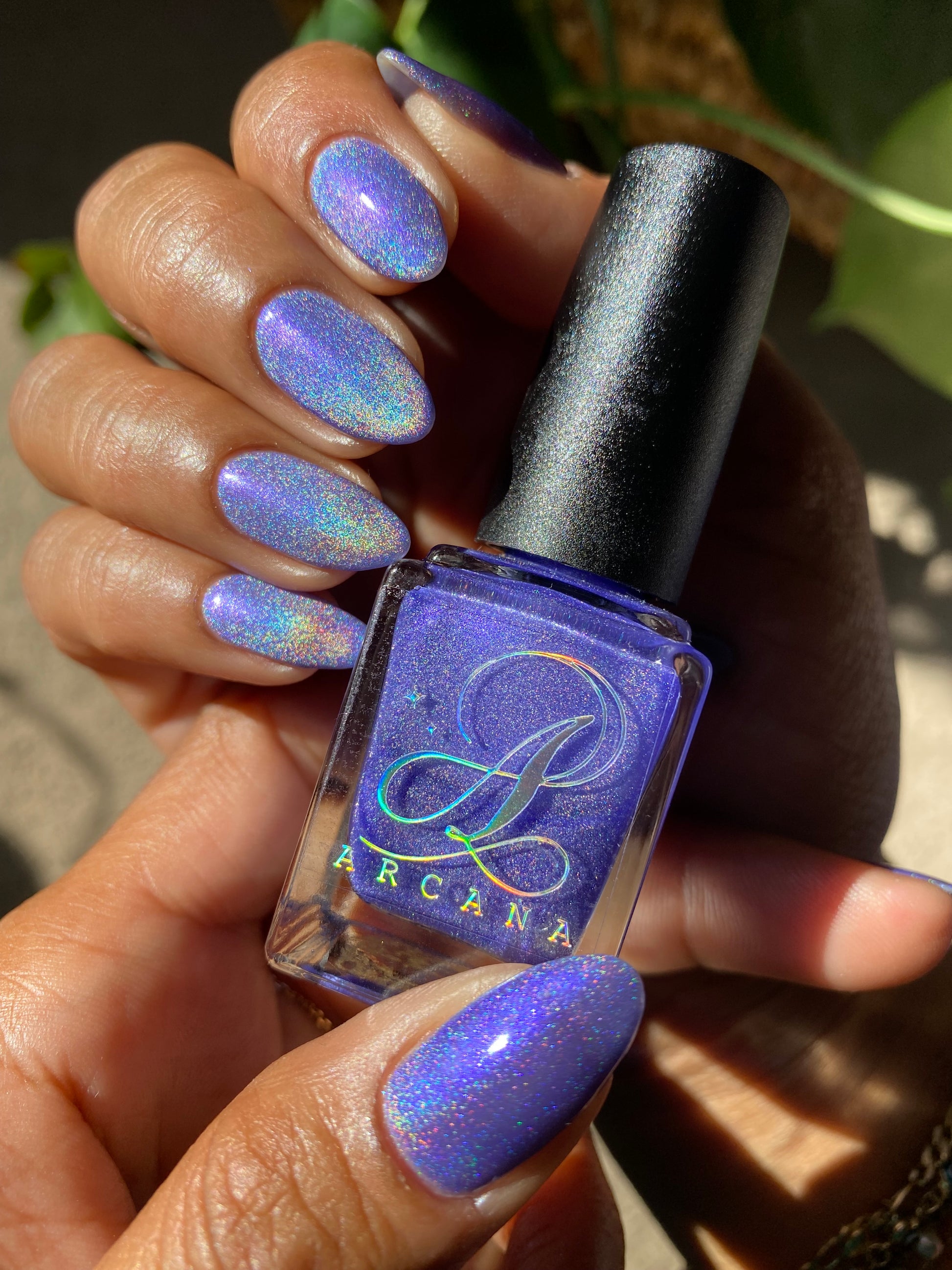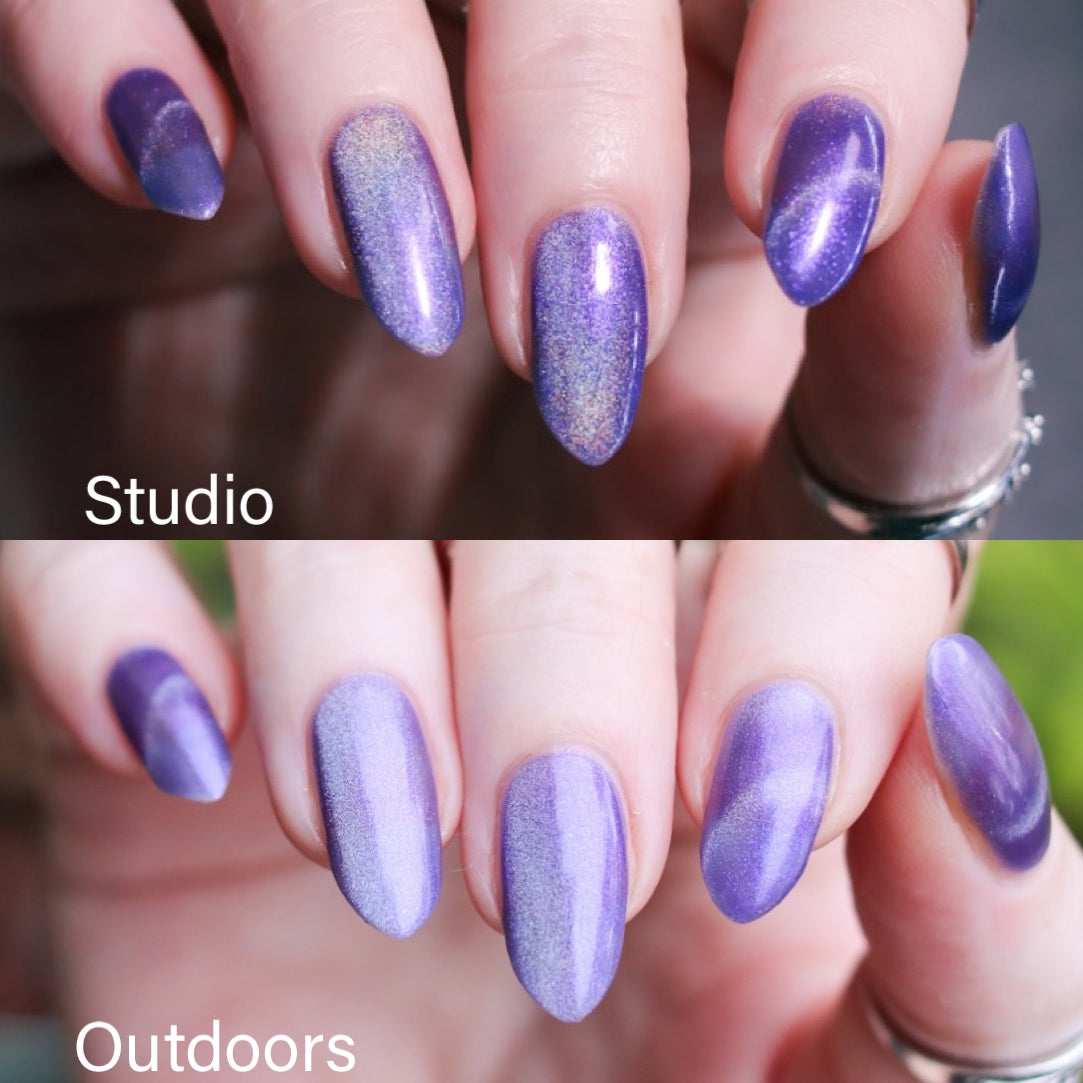 The World is a bright purple-leaning blue with purple to silver shimmer and holographic magnetic pigment.