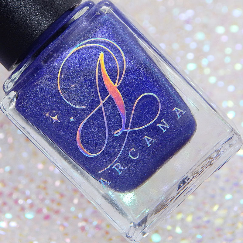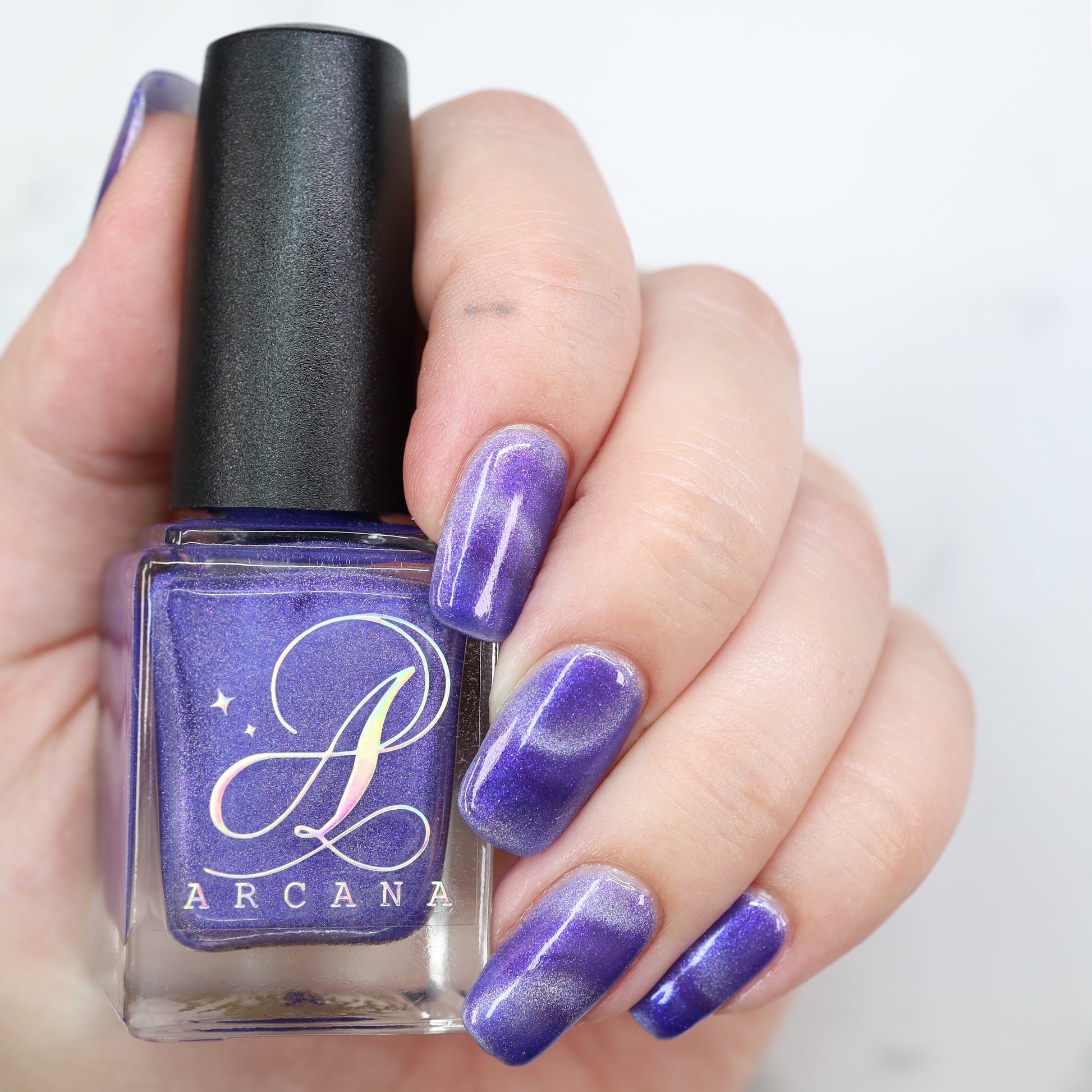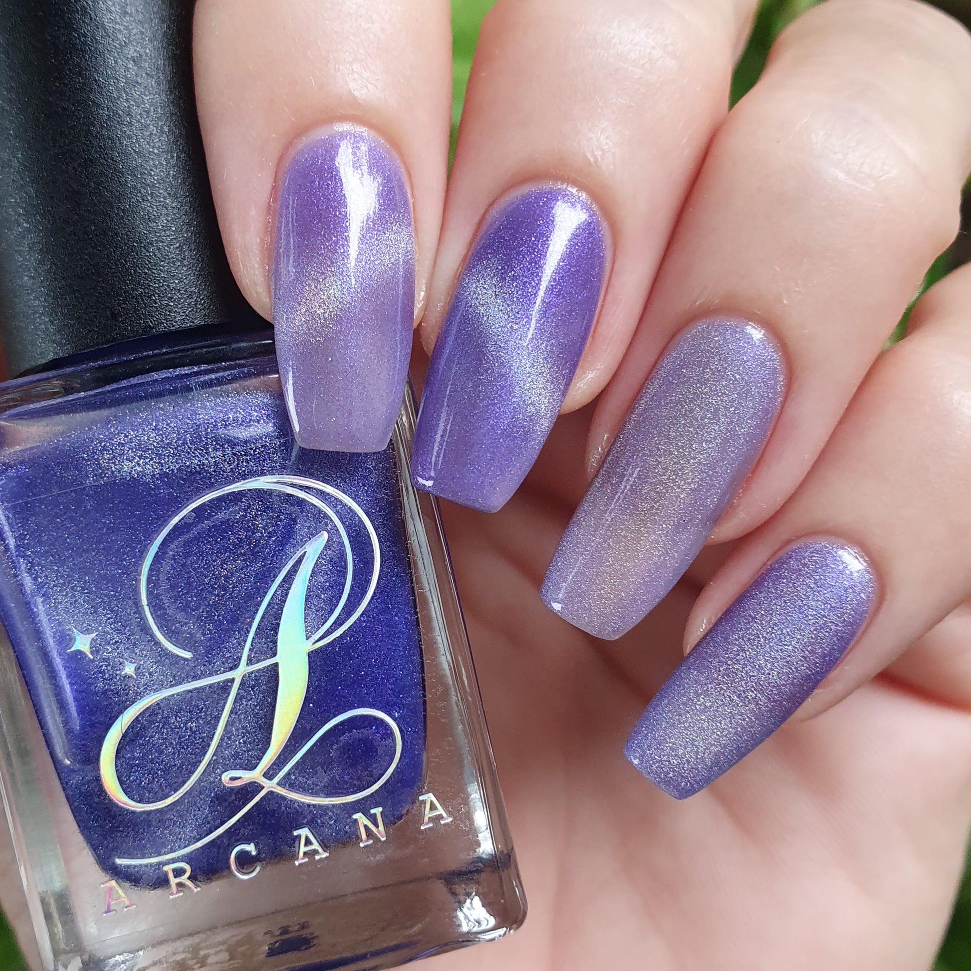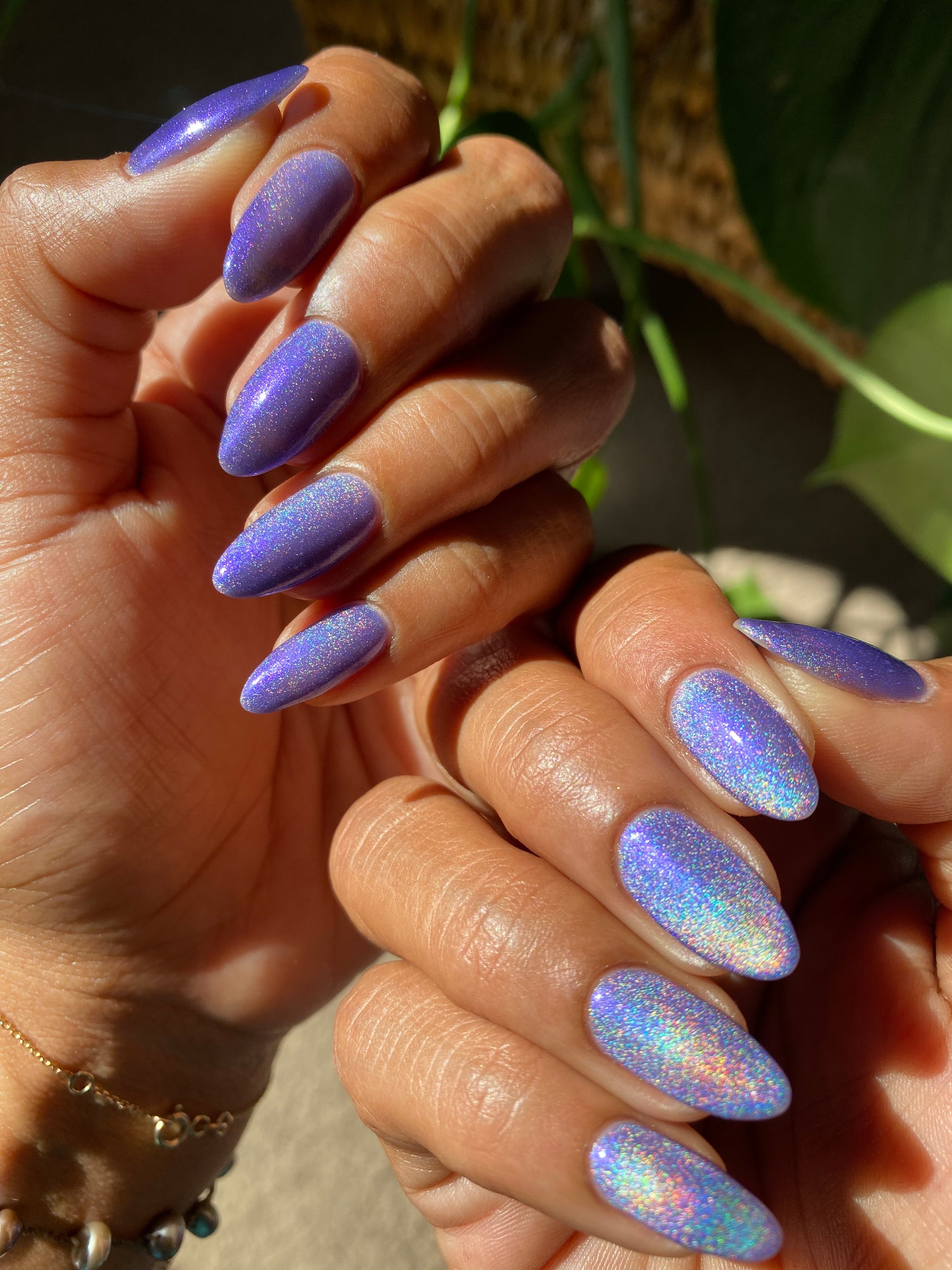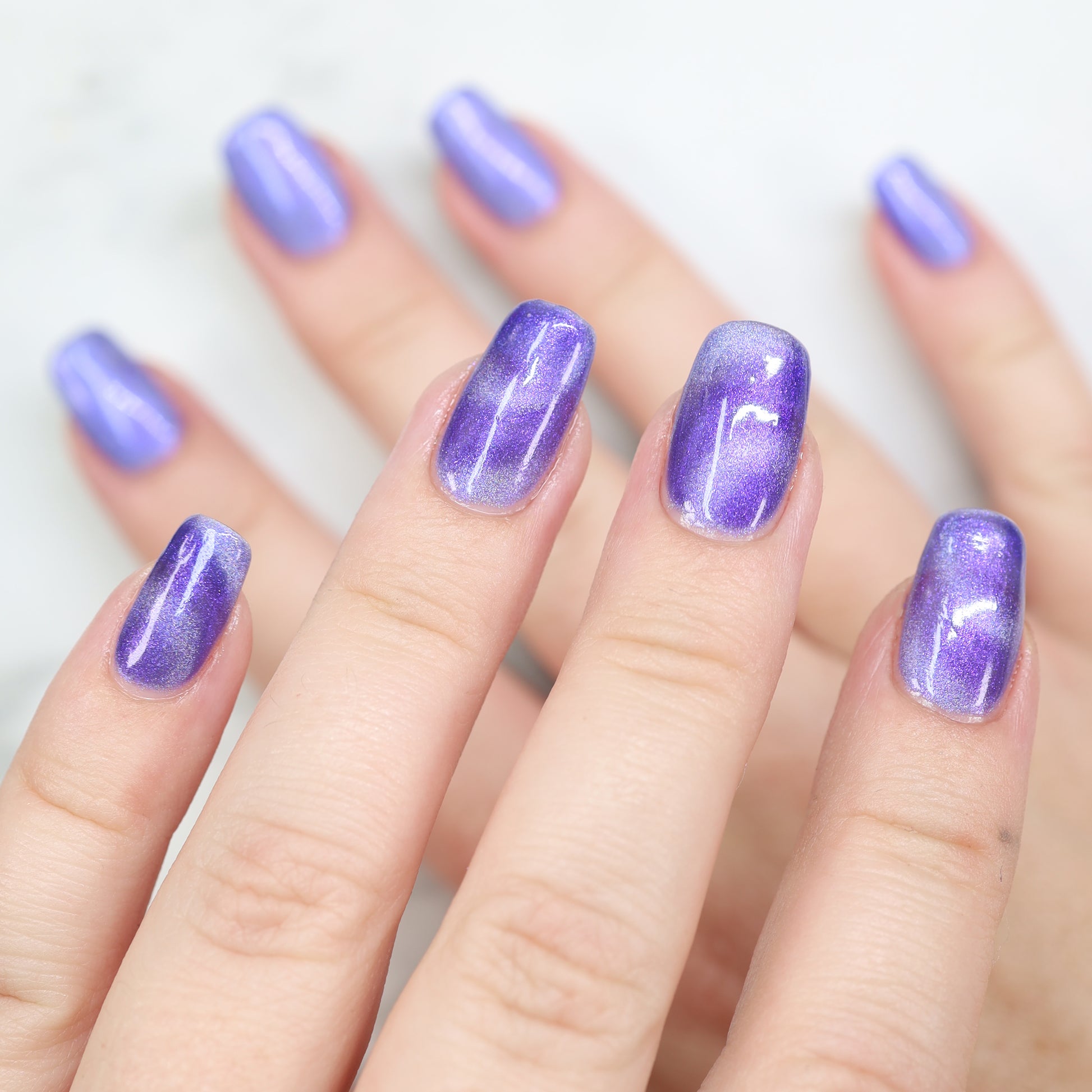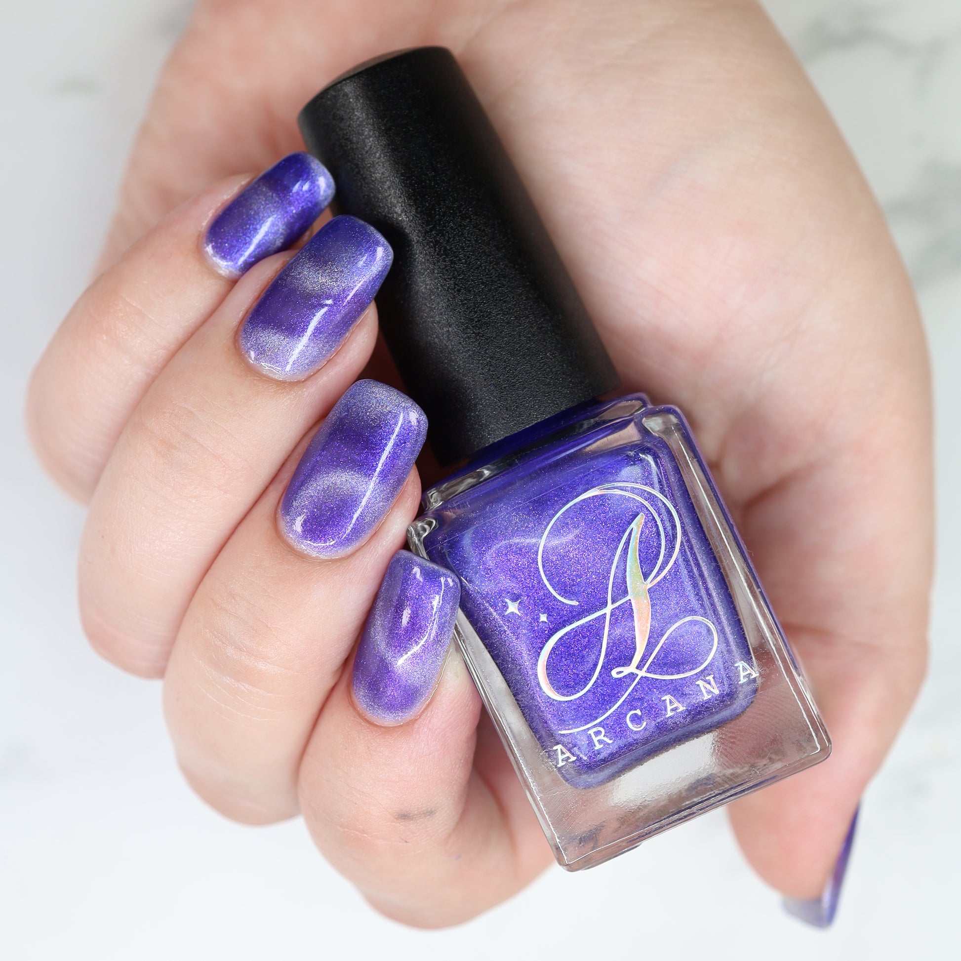 The World is a bright purple-leaning blue with purple to silver shimmer and holographic magnetic pigment.