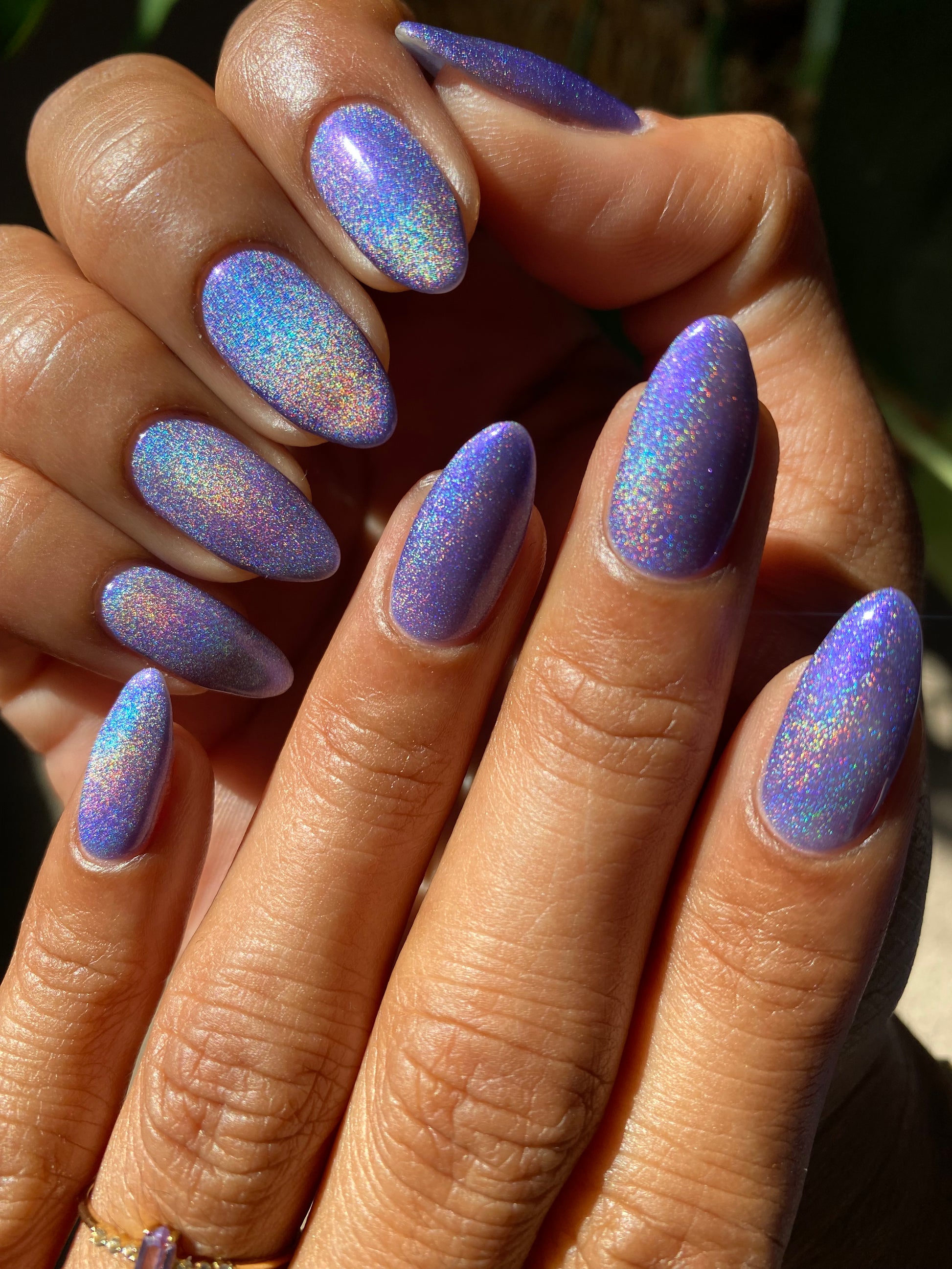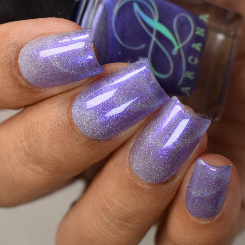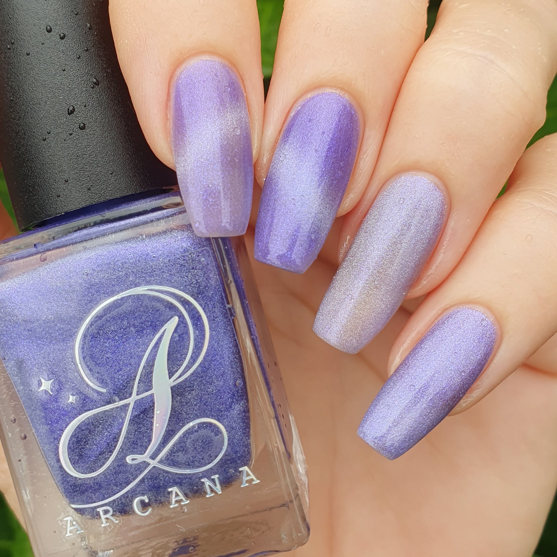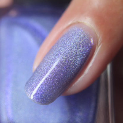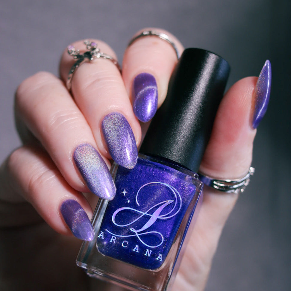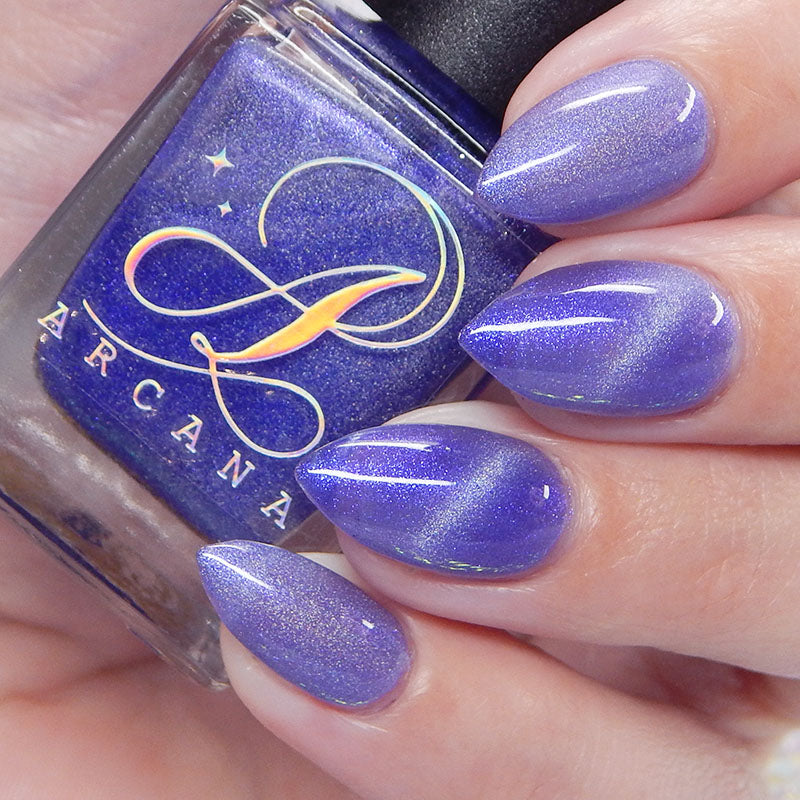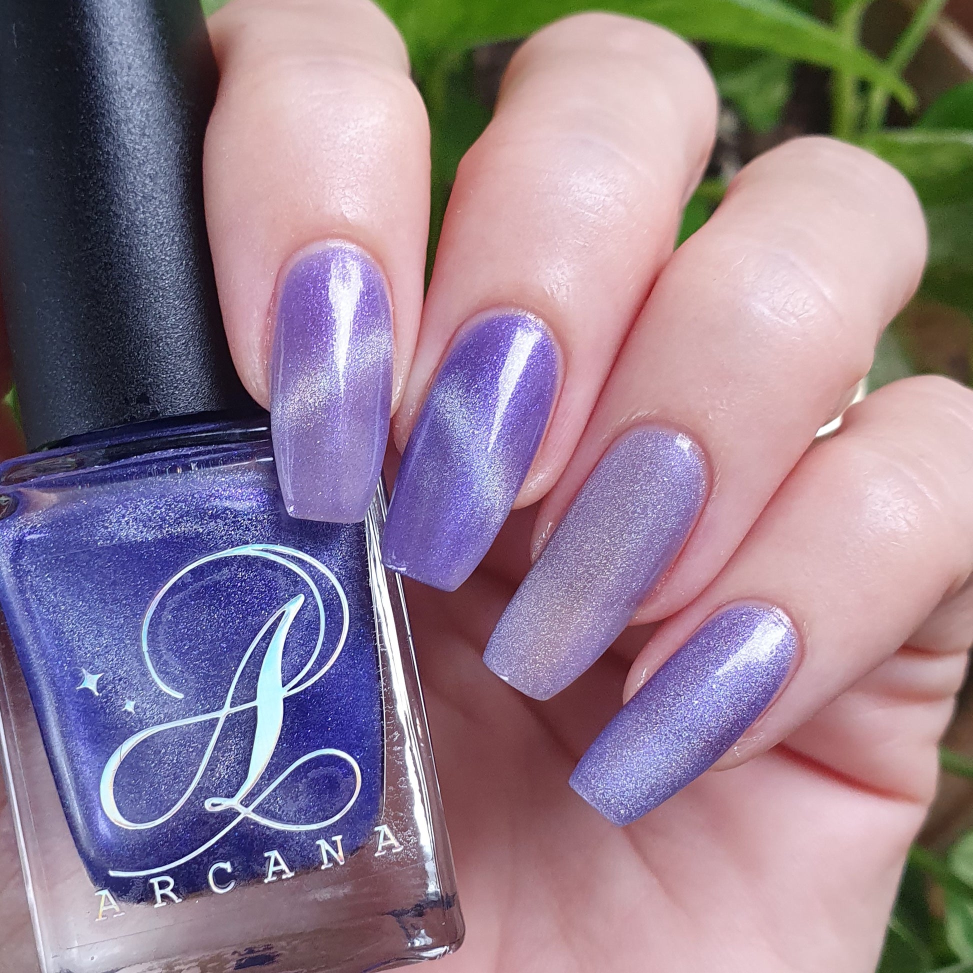 The World is a bright purple-leaning blue with purple to silver shimmer and holographic magnetic pigment.