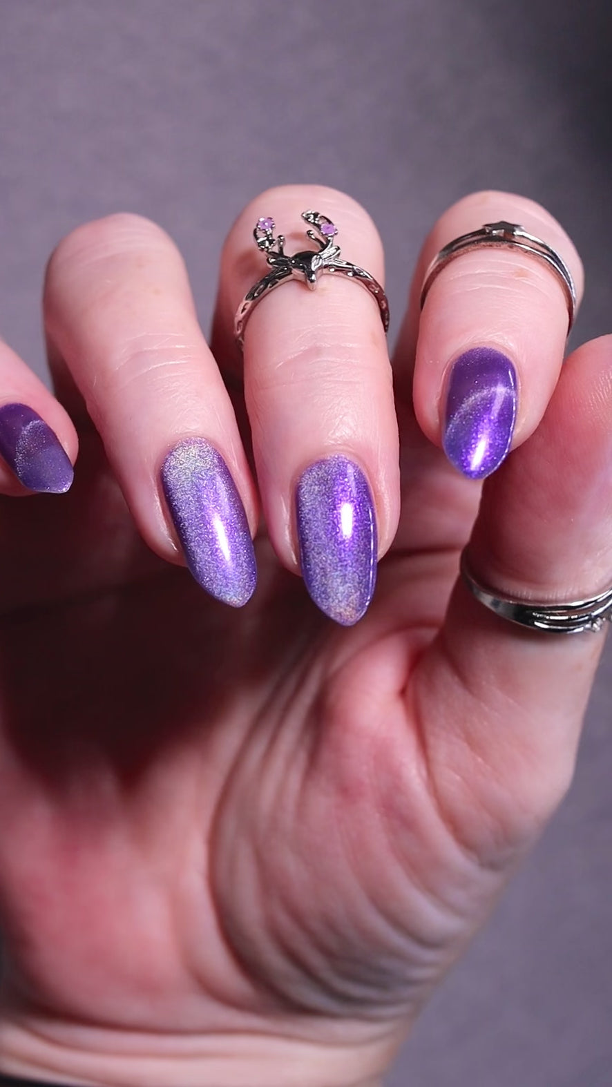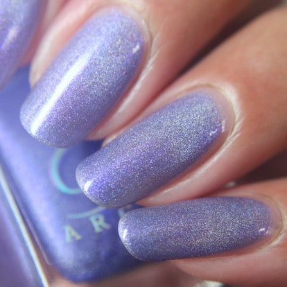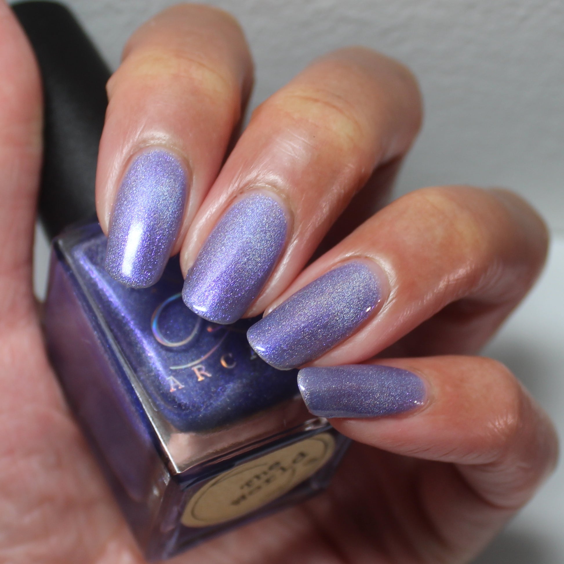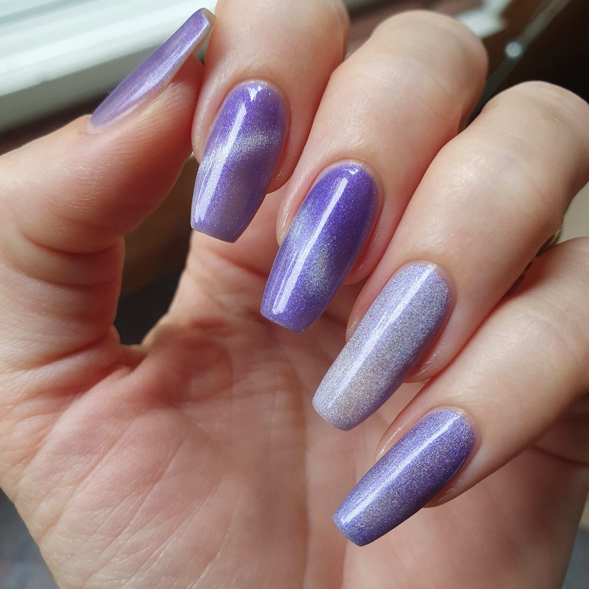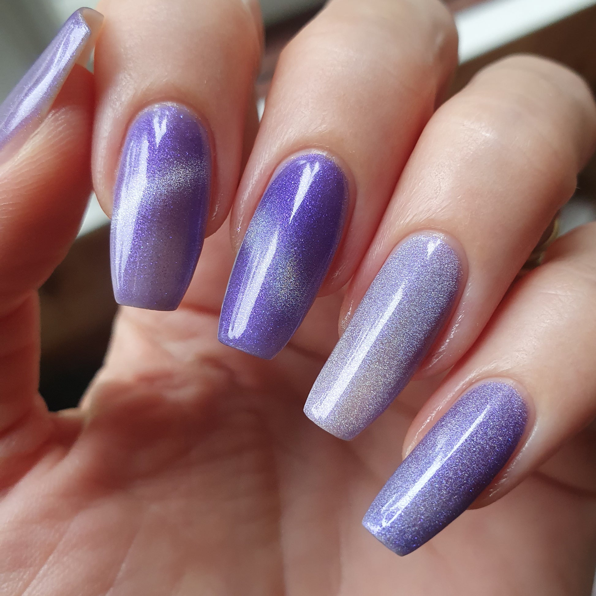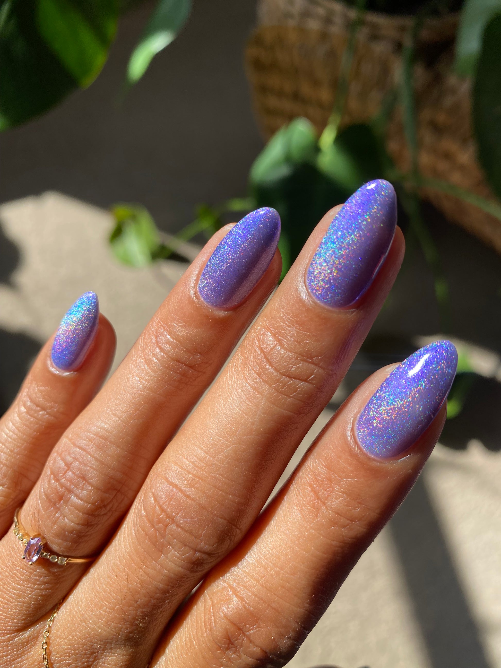 The World is a bright purple-leaning blue with purple to silver shimmer and holographic magnetic pigment.
