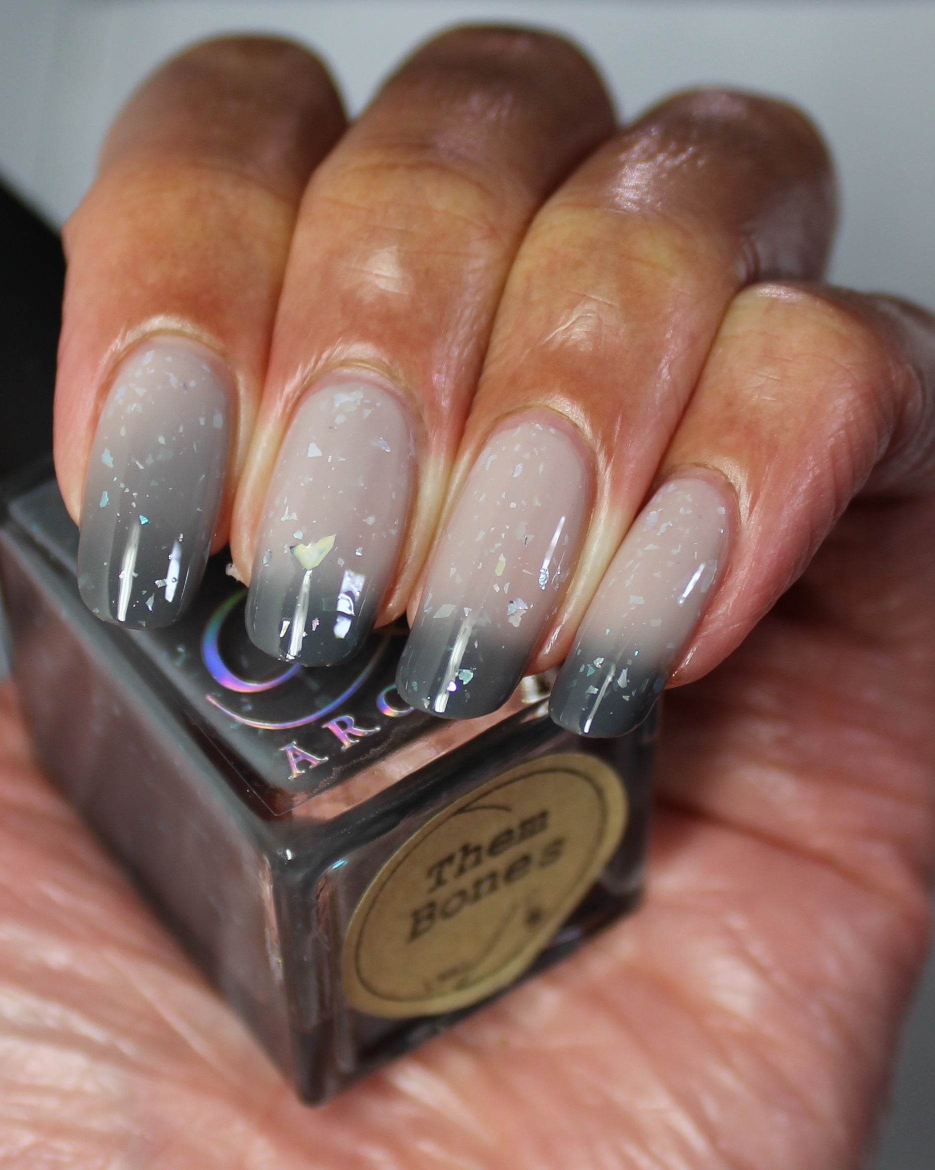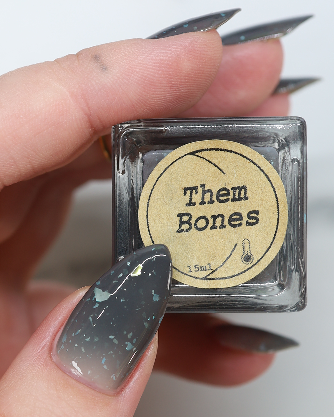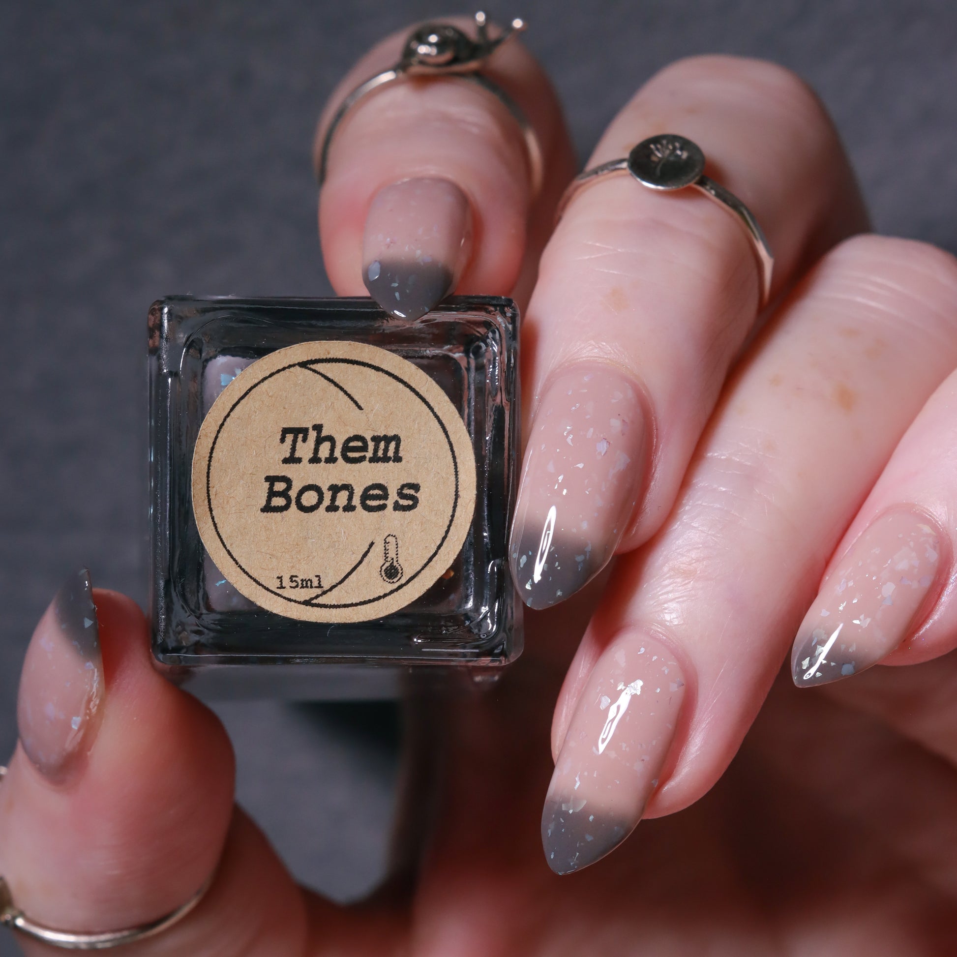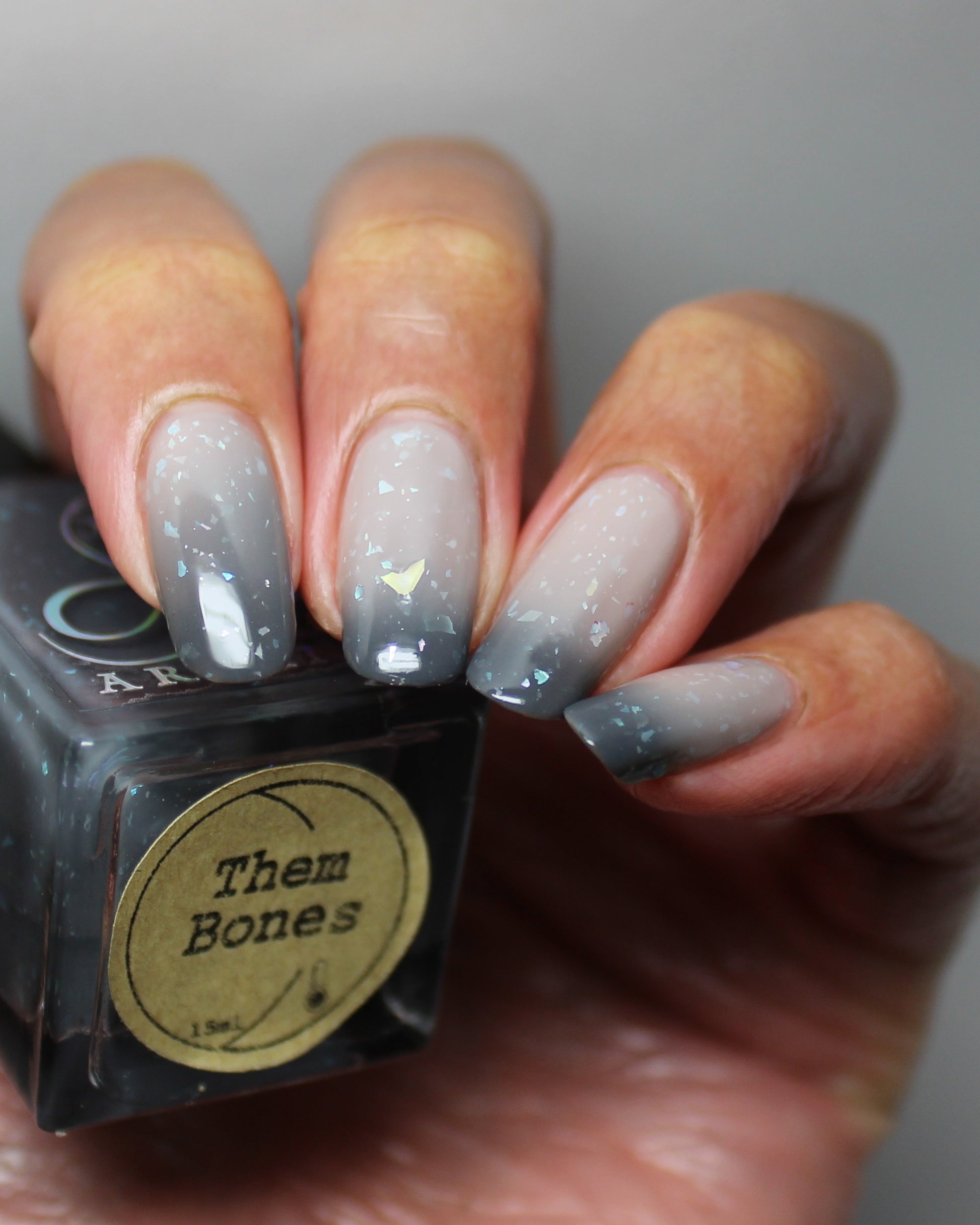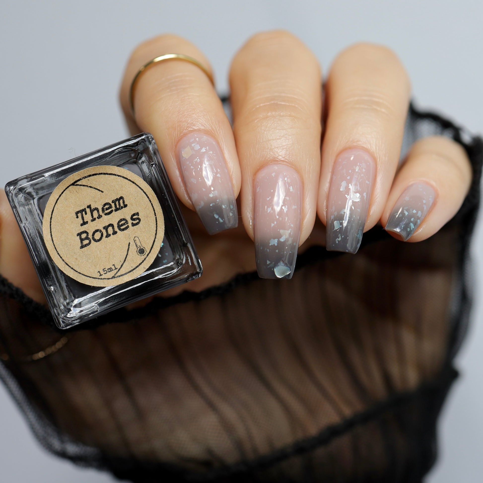Them Bones is a thermal polish that shifts from dark gray to a cloudy white with a scattering of opaque flakes that flash blue, green, and a hint of yellow.
