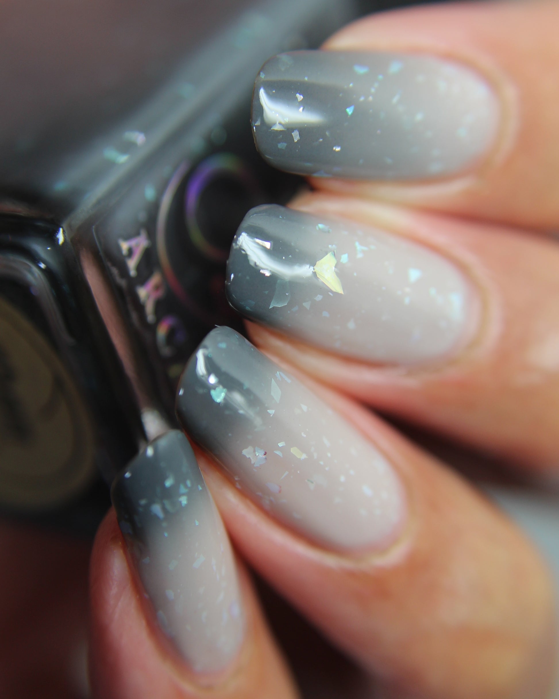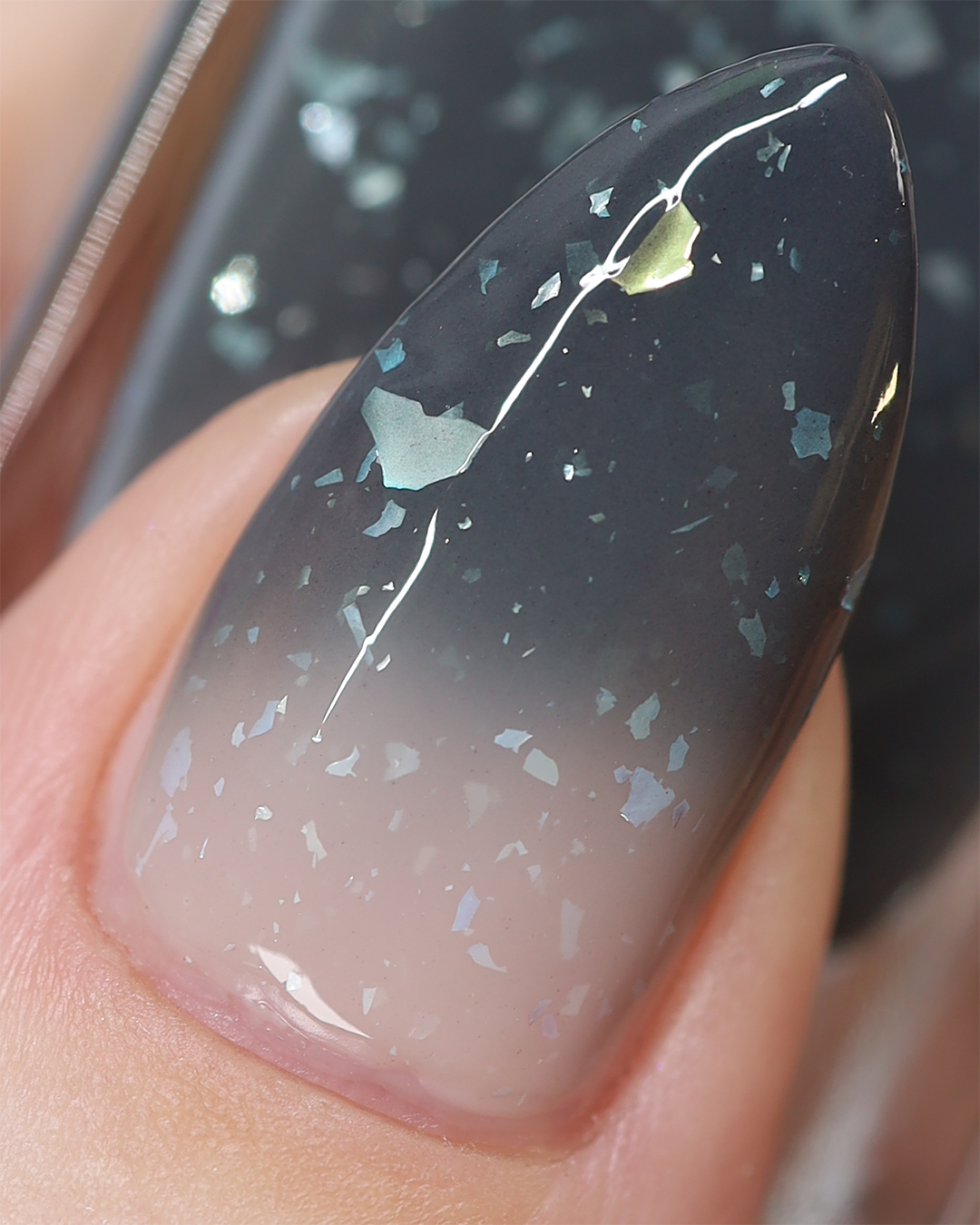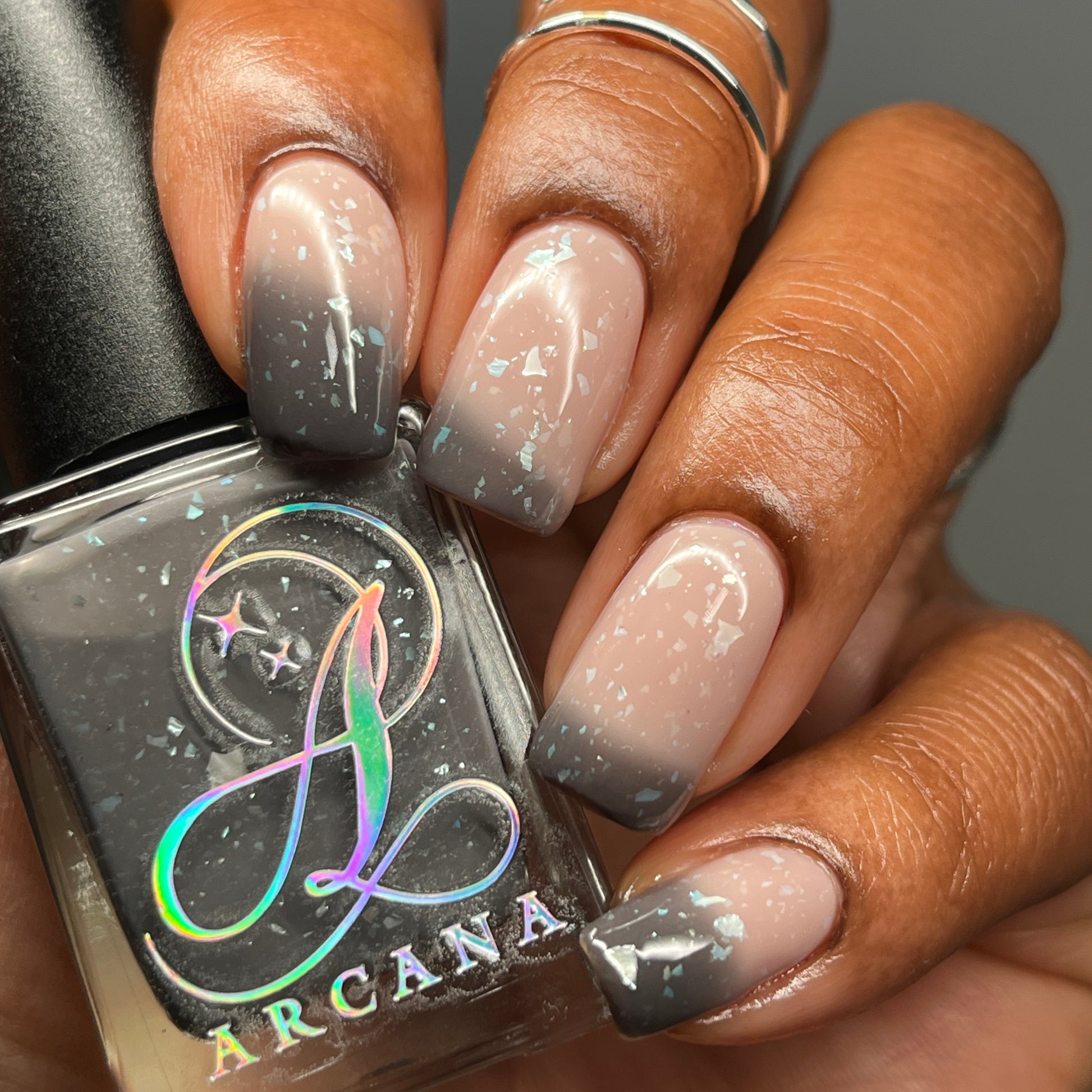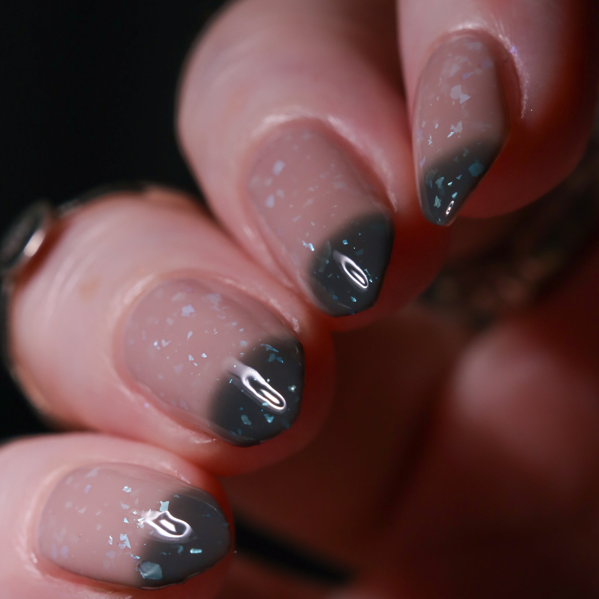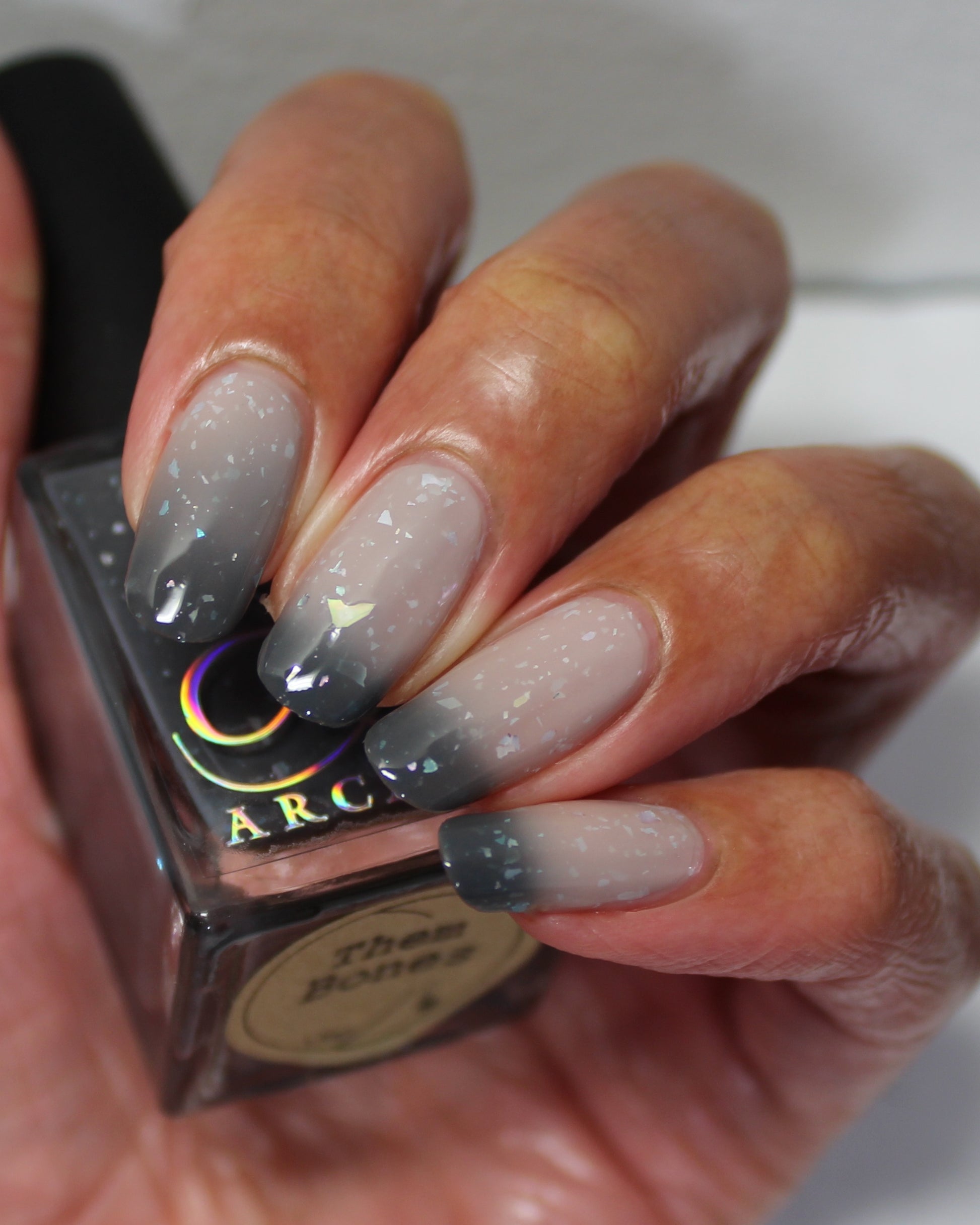 Them Bones is a thermal polish that shifts from dark gray to a cloudy white with a scattering of opaque flakes that flash blue, green, and a hint of yellow.