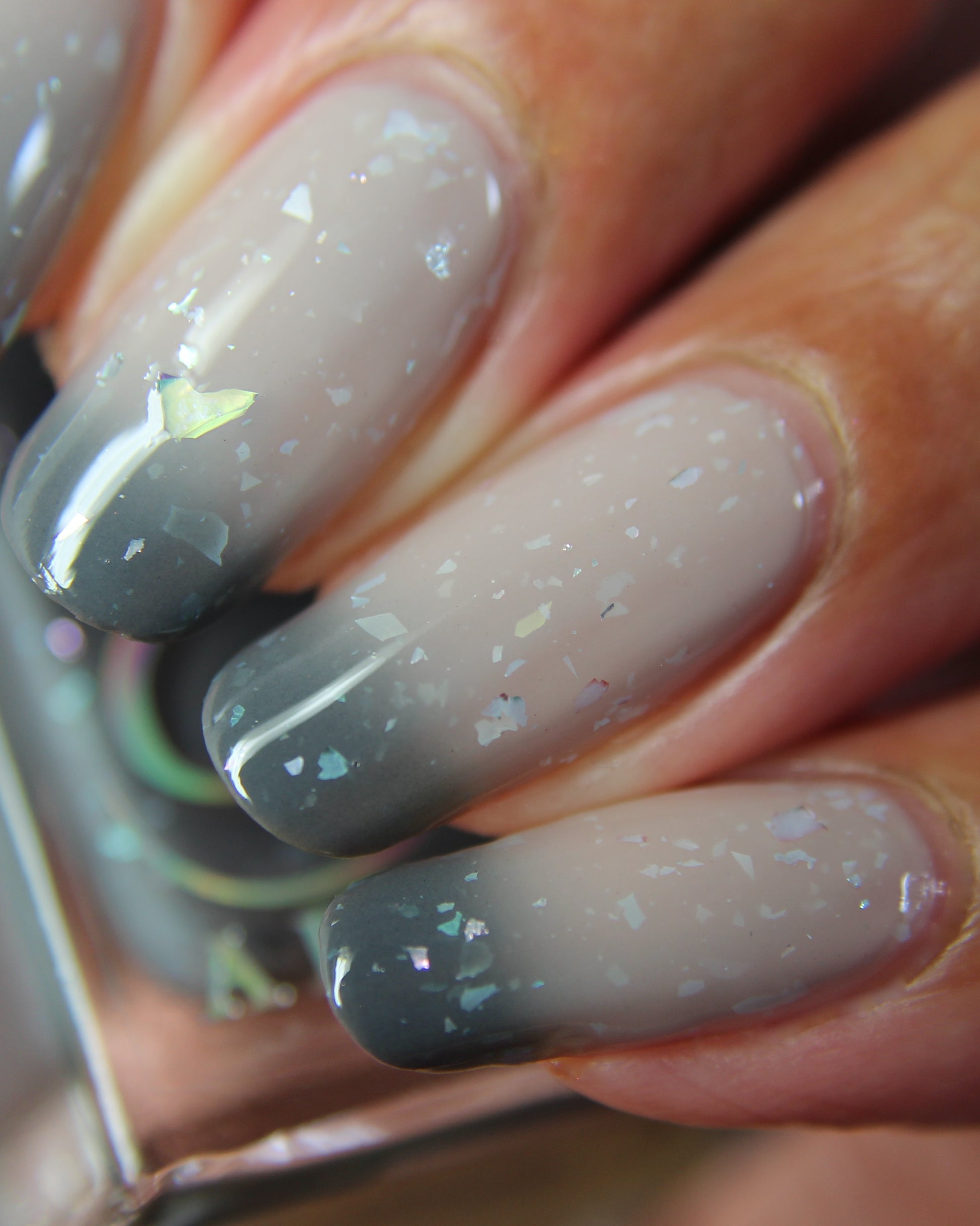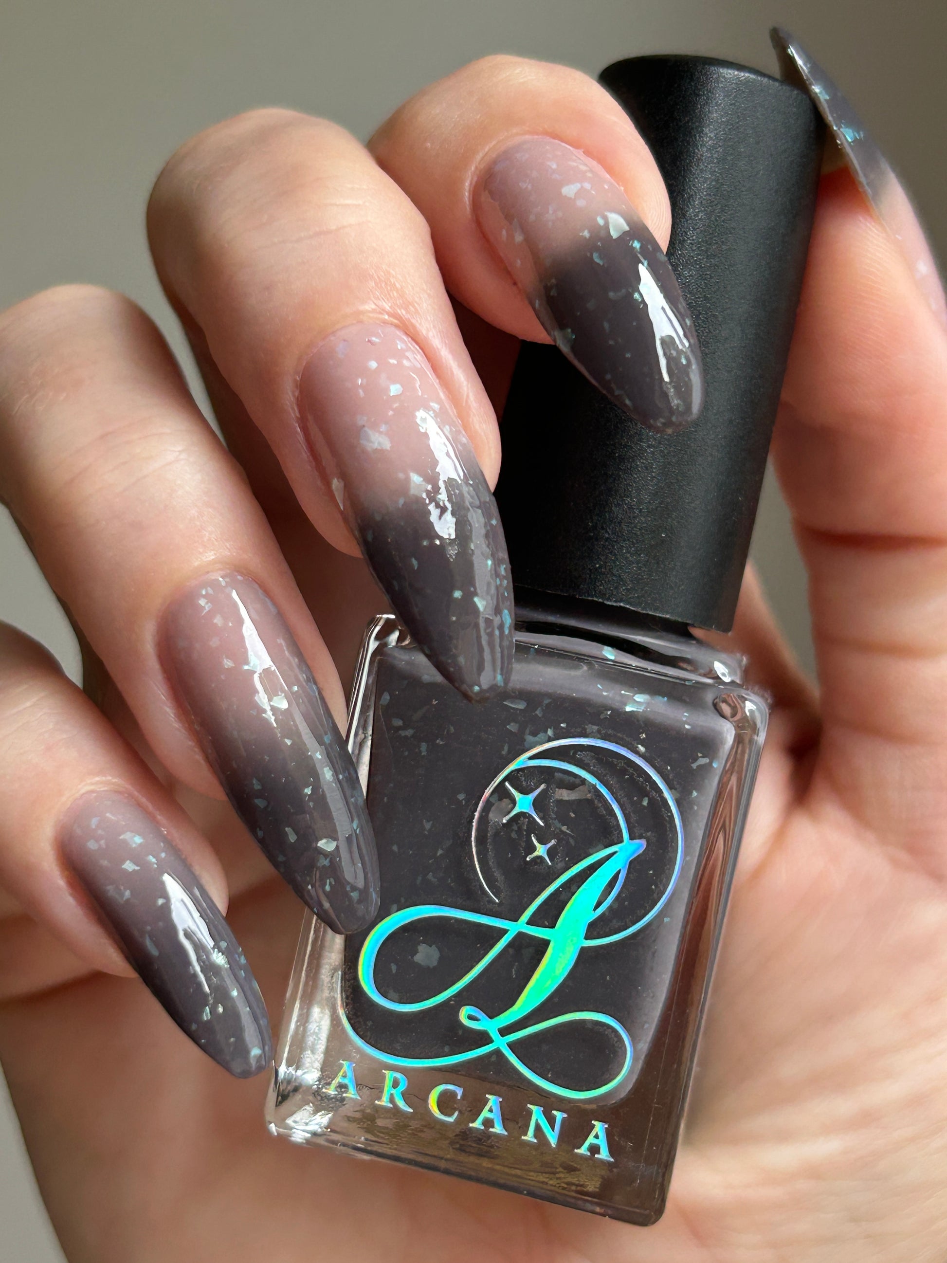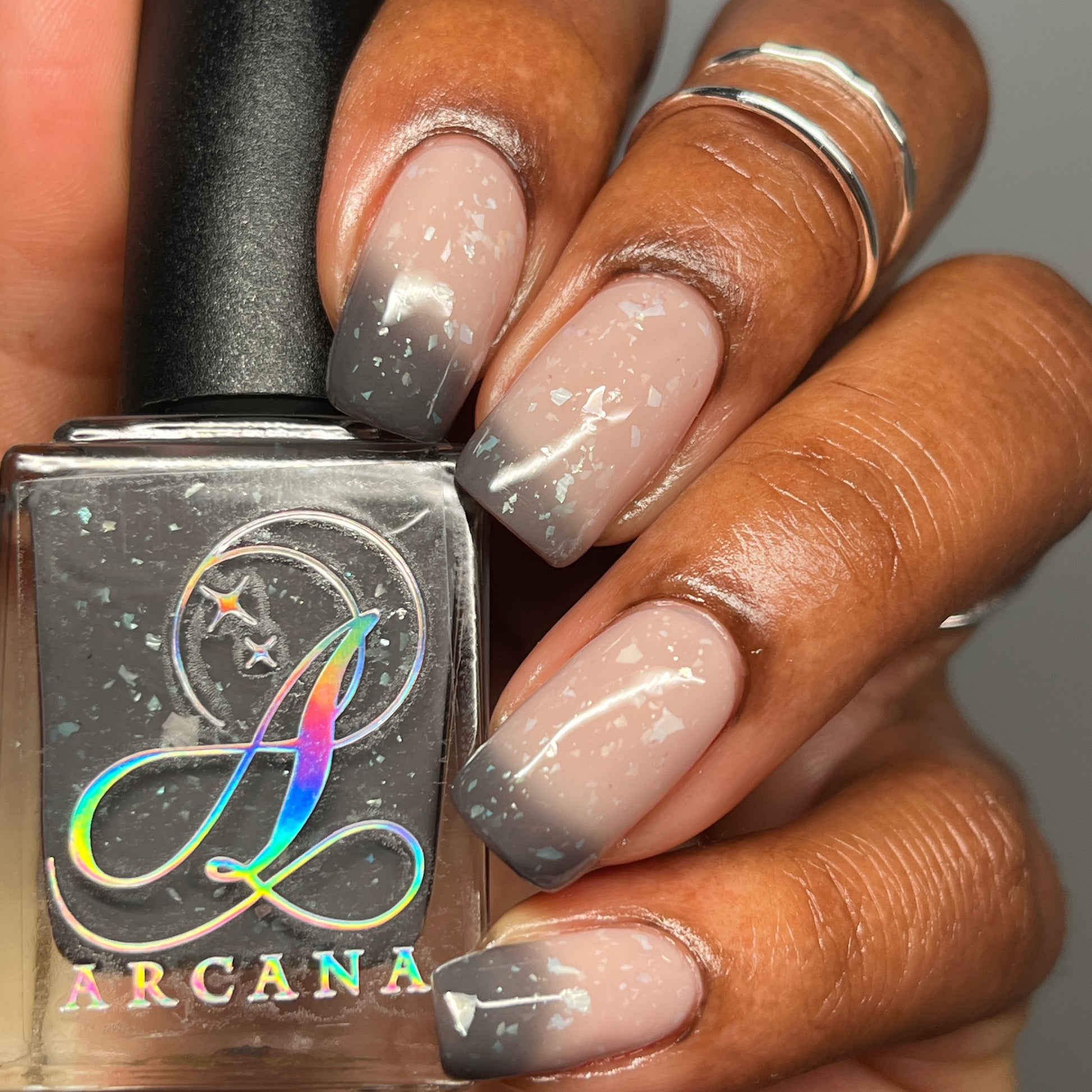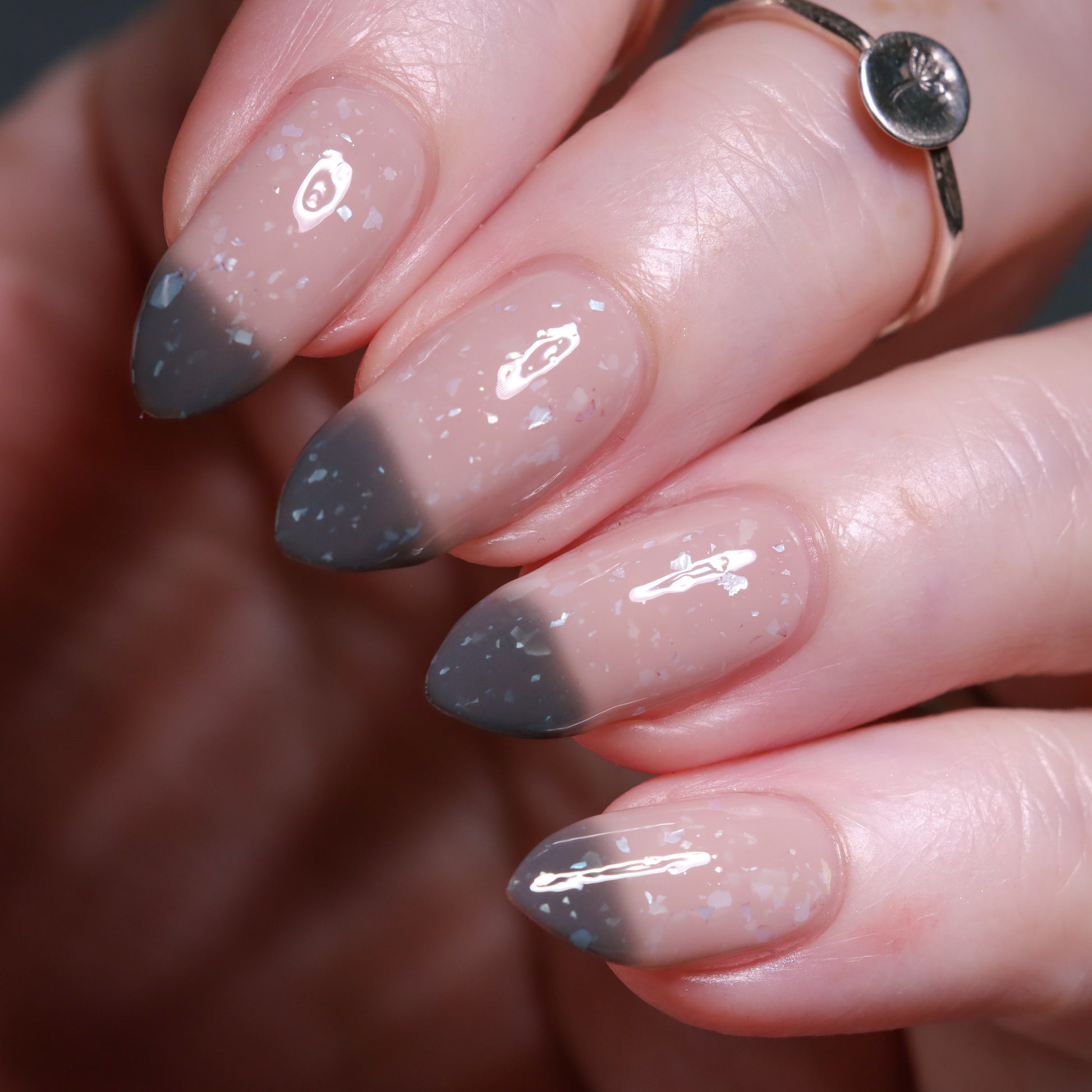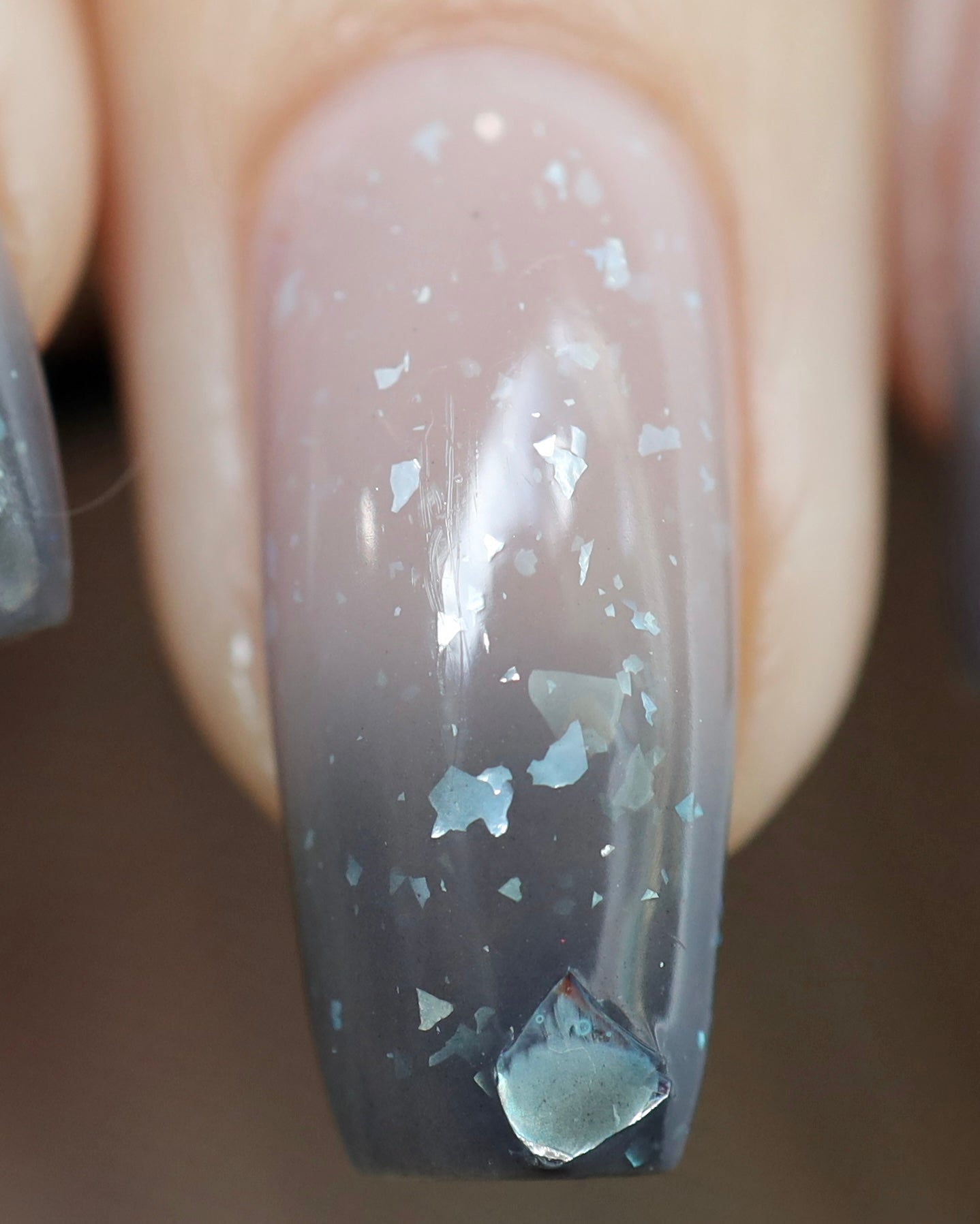 Them Bones is a thermal polish that shifts from dark gray to a cloudy white with a scattering of opaque flakes that flash blue, green, and a hint of yellow.