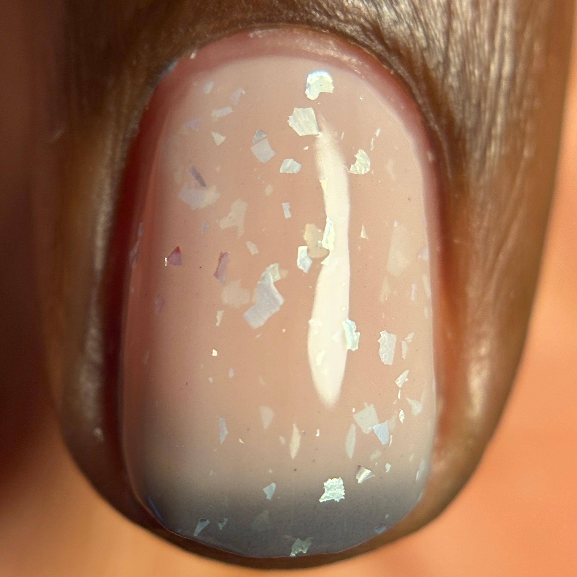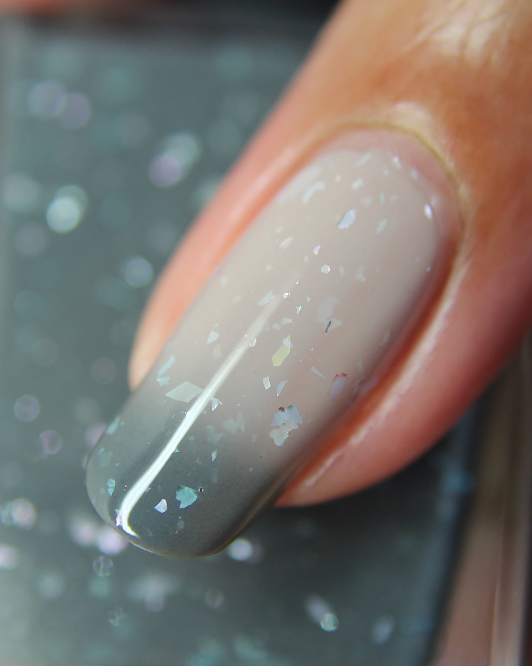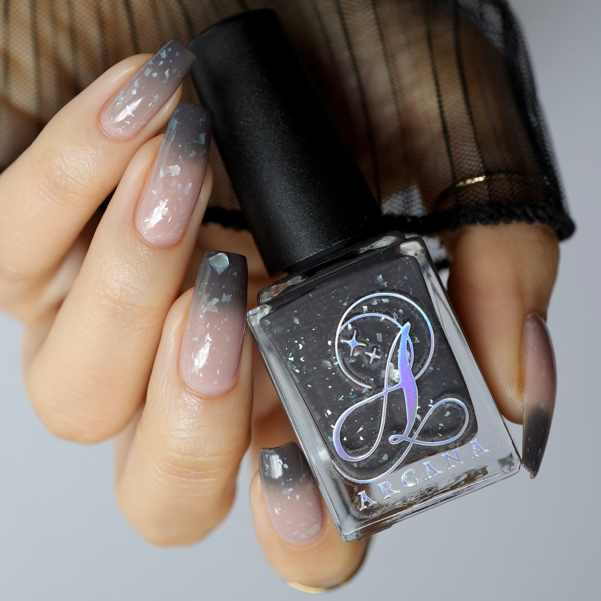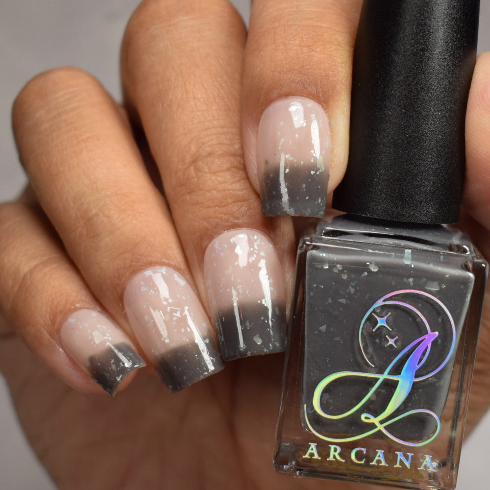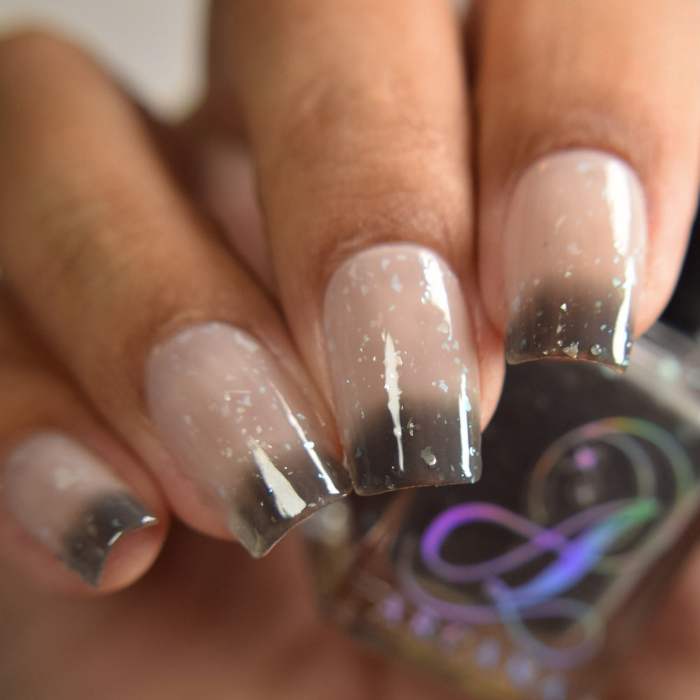 Them Bones is a thermal polish that shifts from dark gray to a cloudy white with a scattering of opaque flakes that flash blue, green, and a hint of yellow.