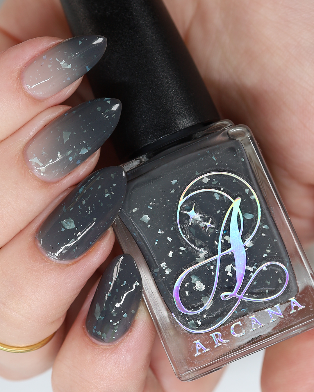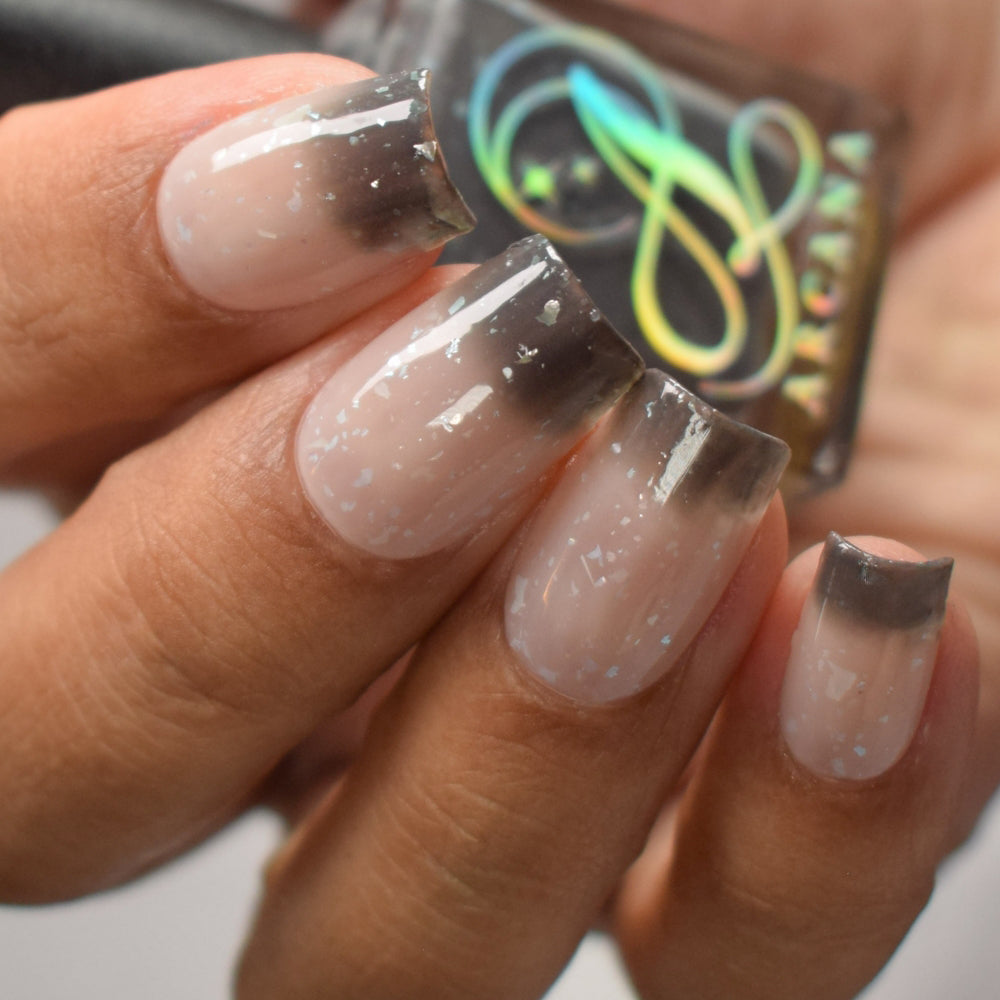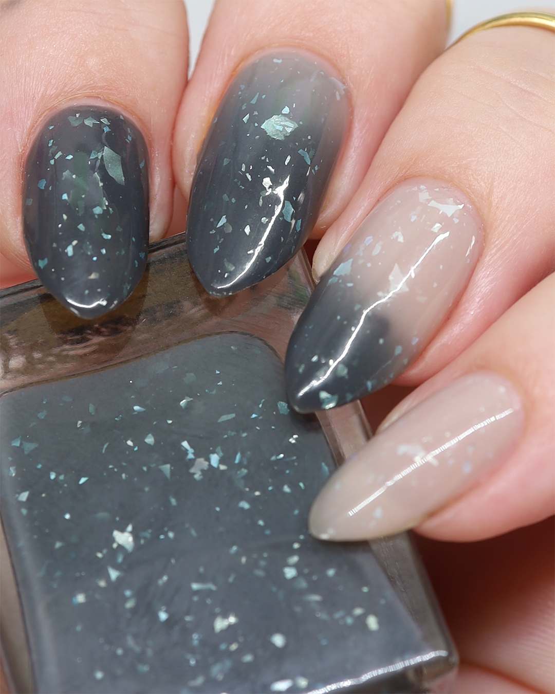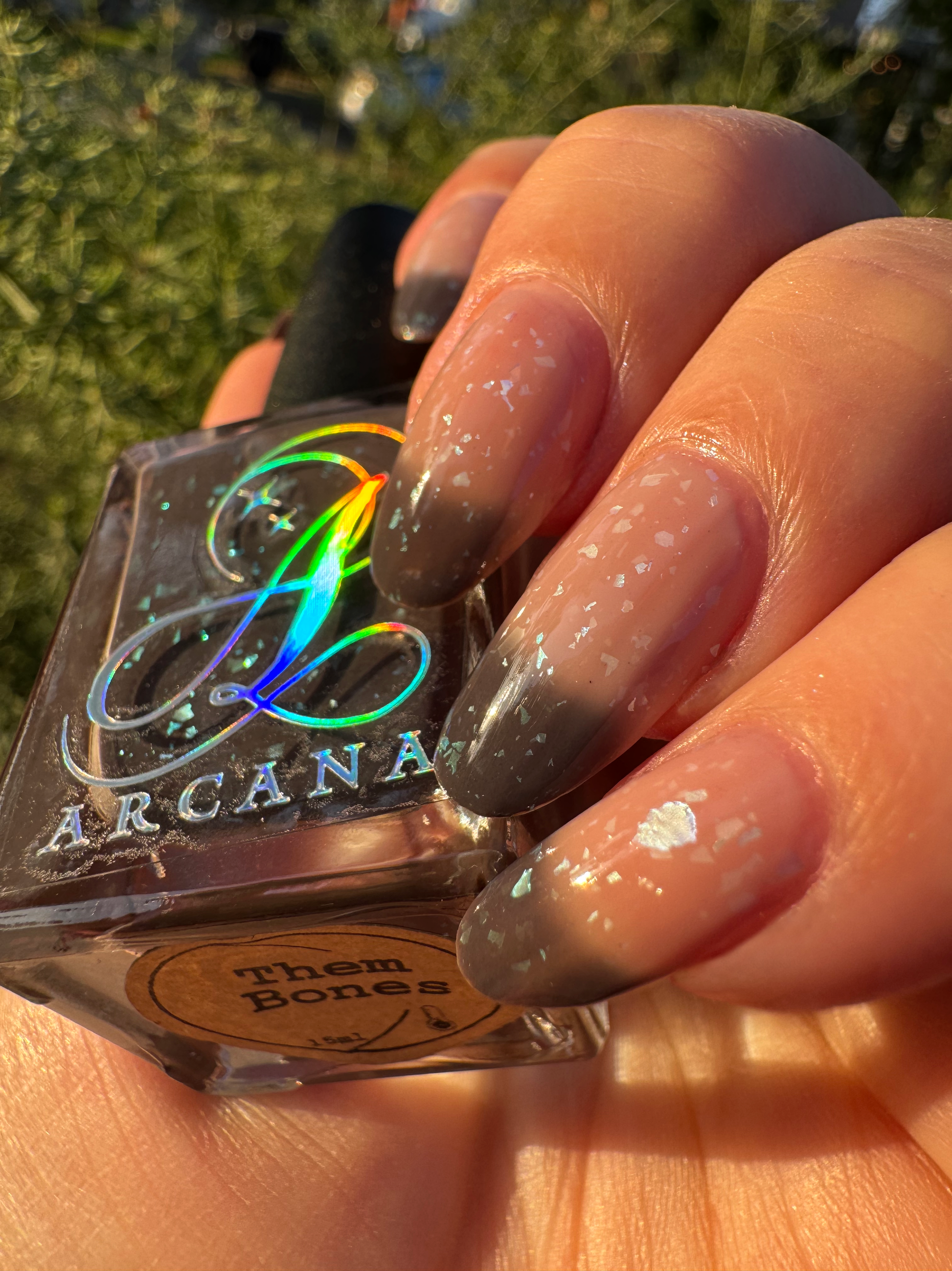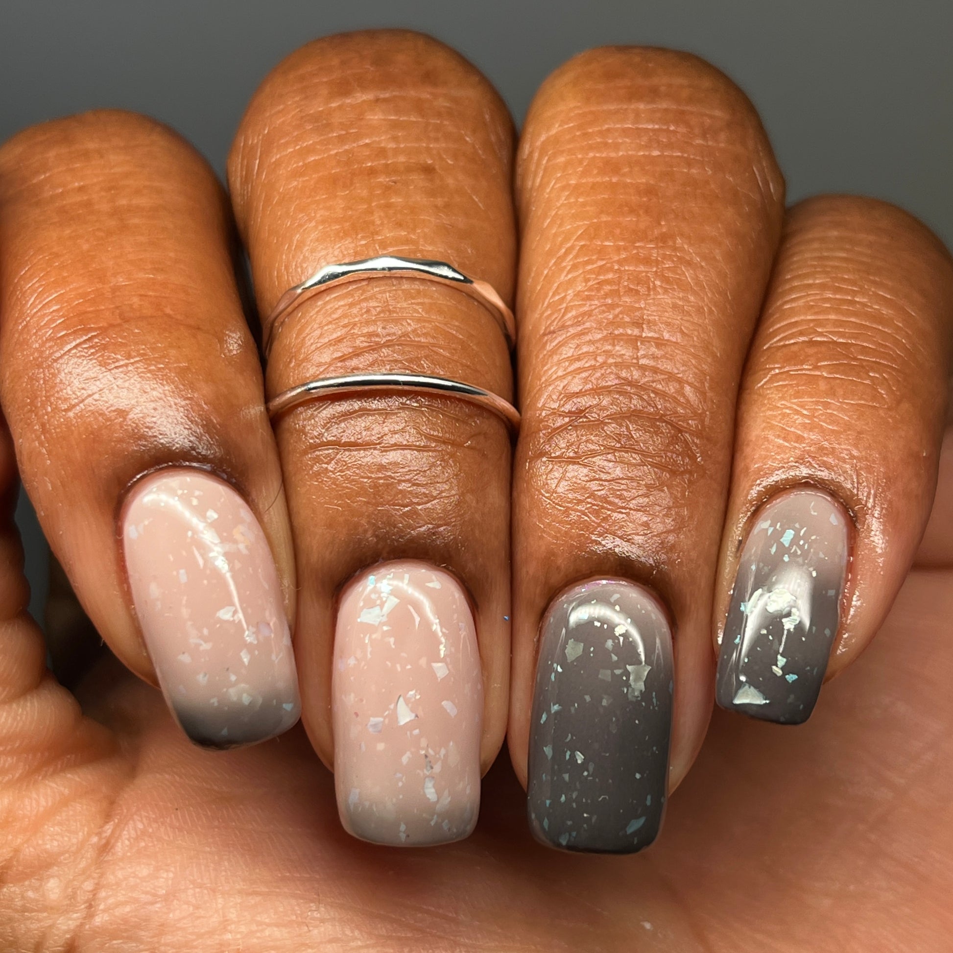 Them Bones is a thermal polish that shifts from dark gray to a cloudy white with a scattering of opaque flakes that flash blue, green, and a hint of yellow.