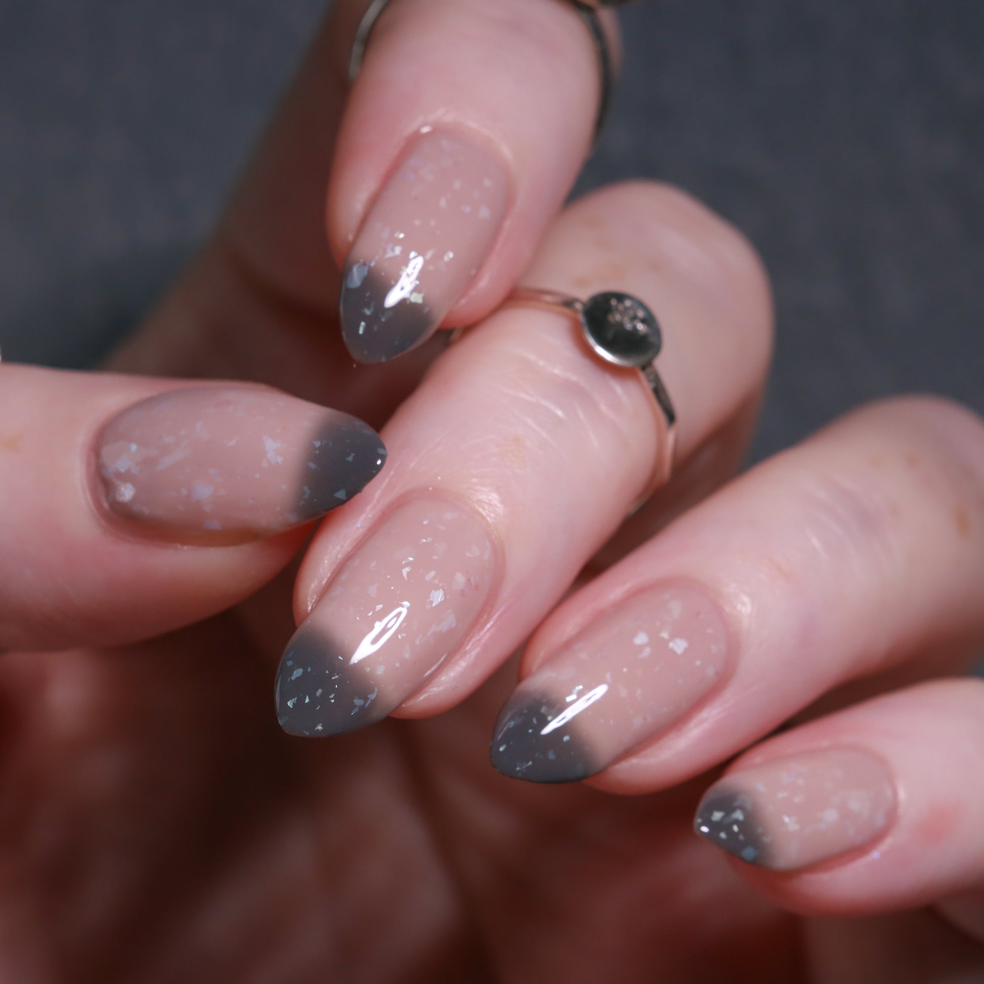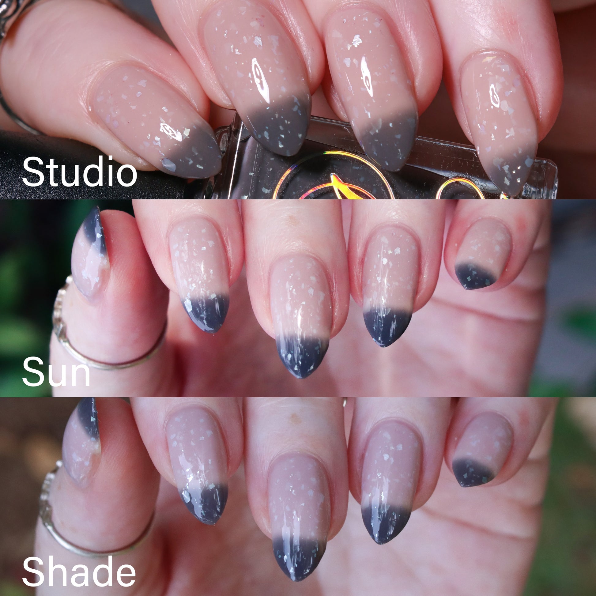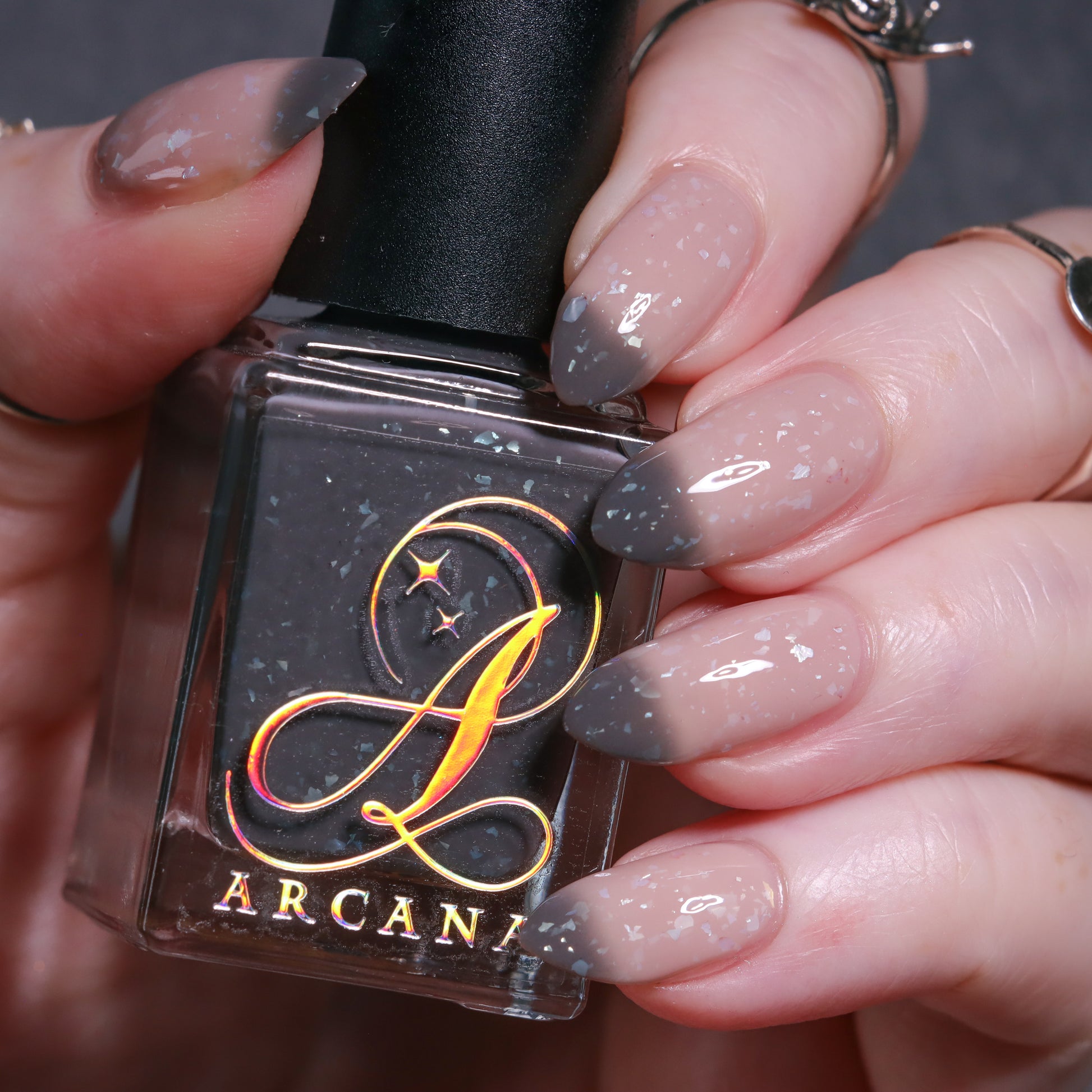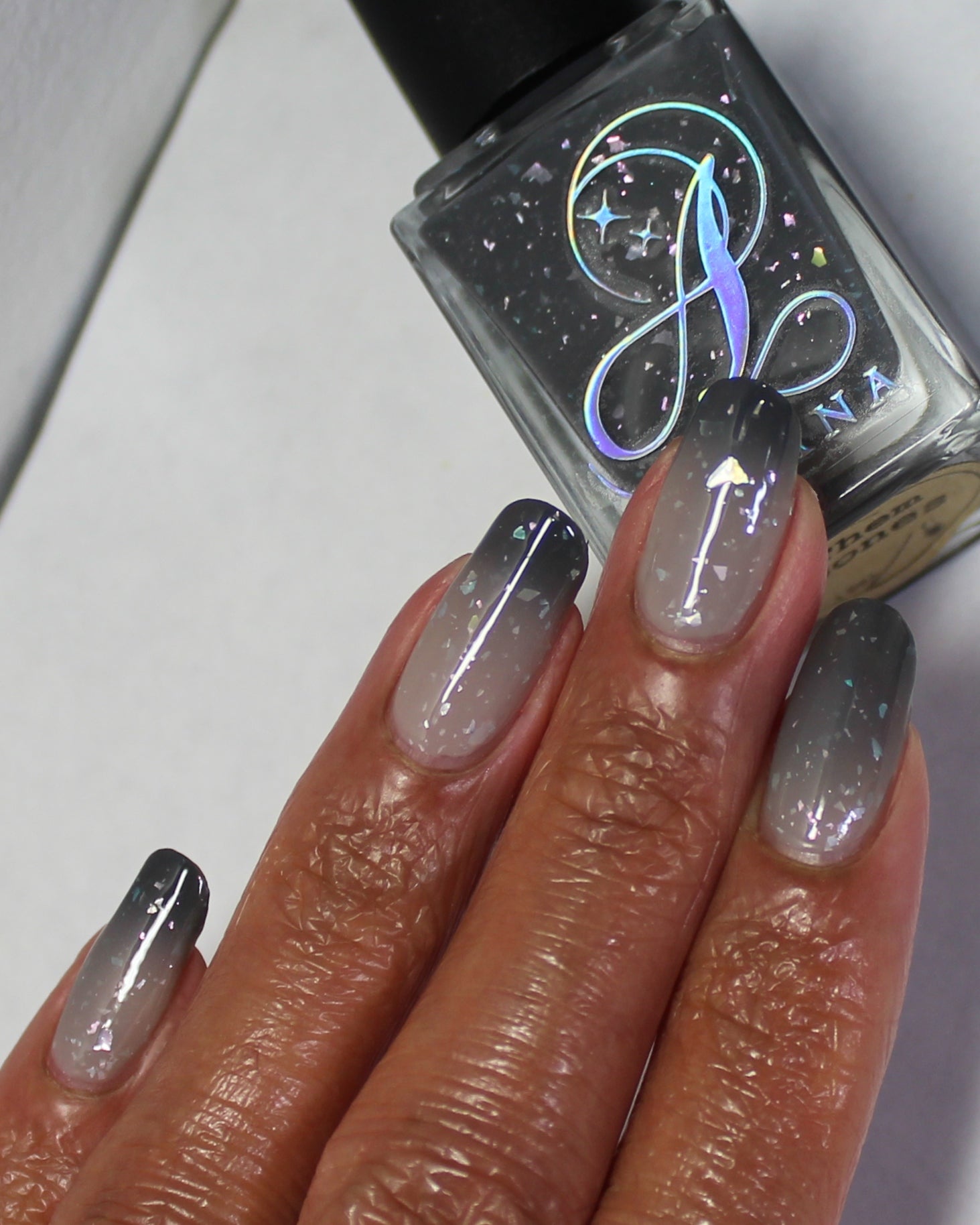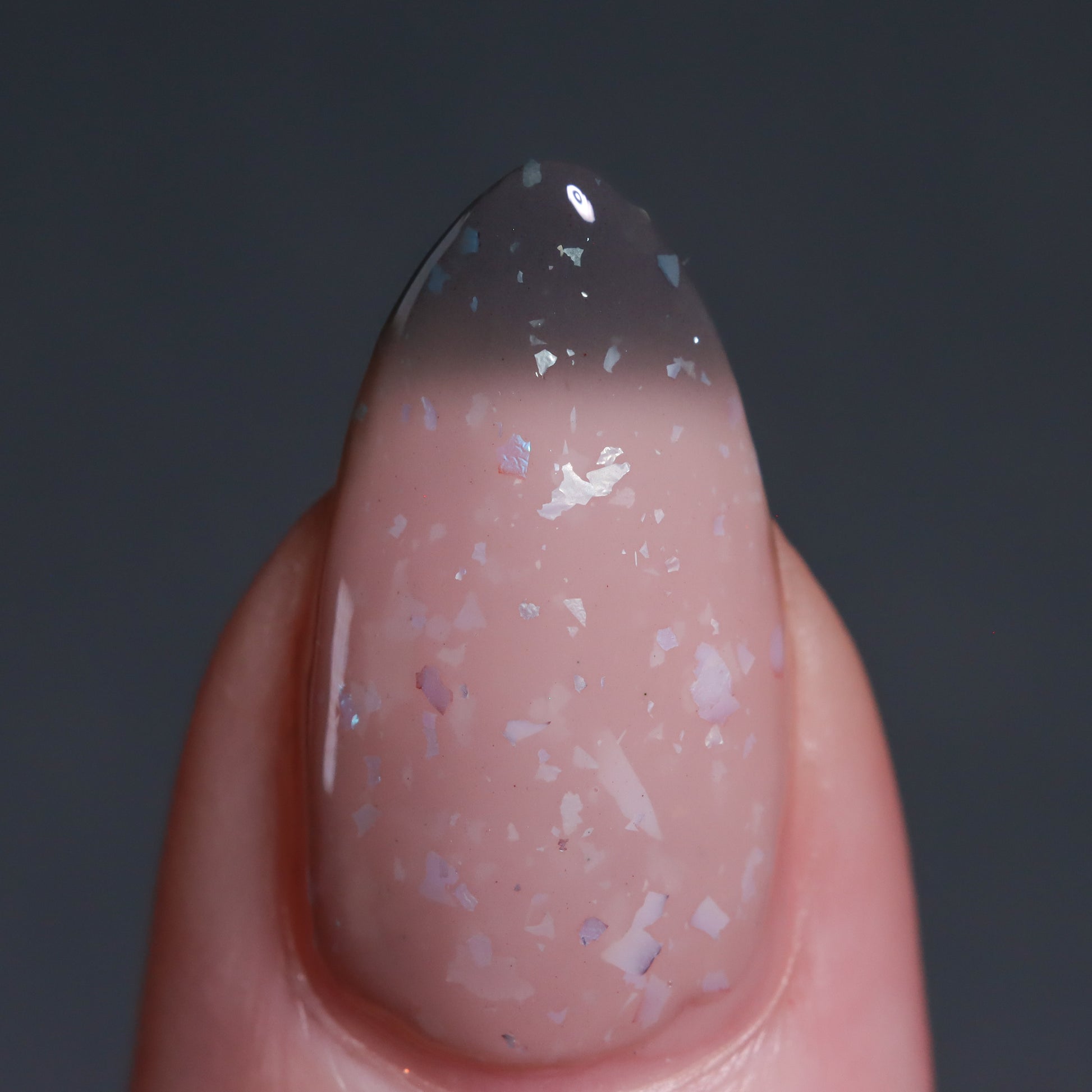 Them Bones is a thermal polish that shifts from dark gray to a cloudy white with a scattering of opaque flakes that flash blue, green, and a hint of yellow.