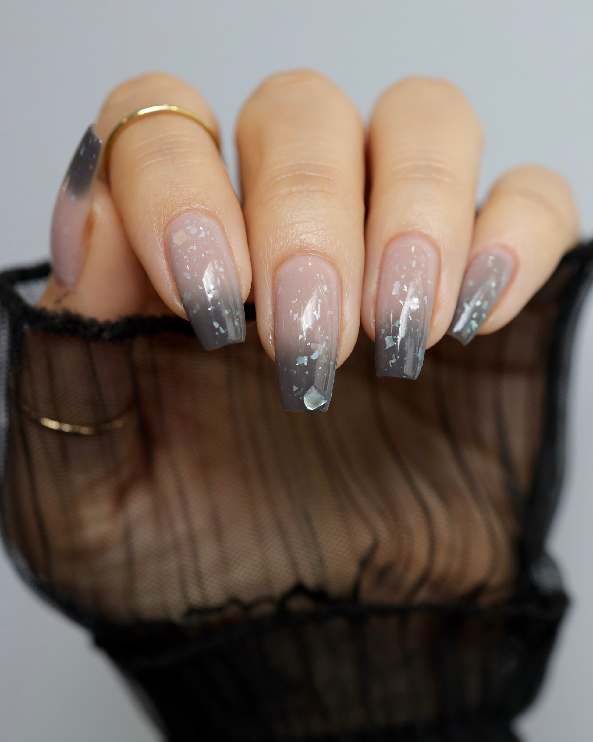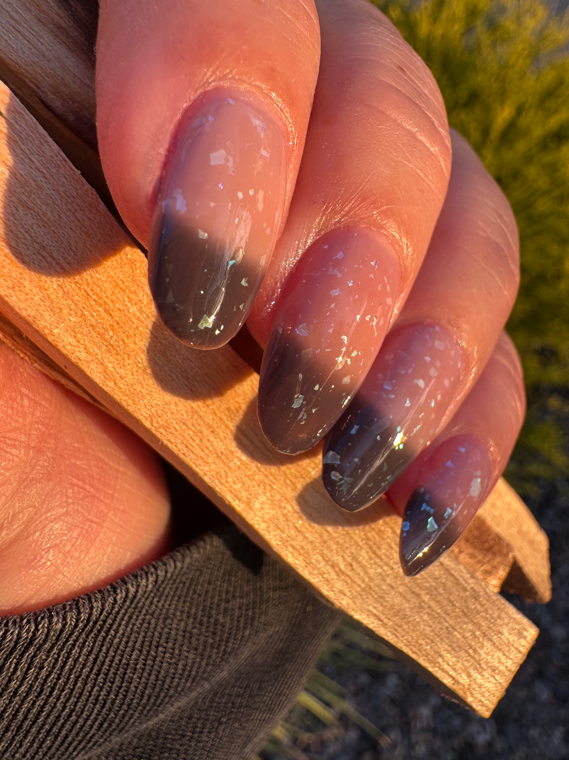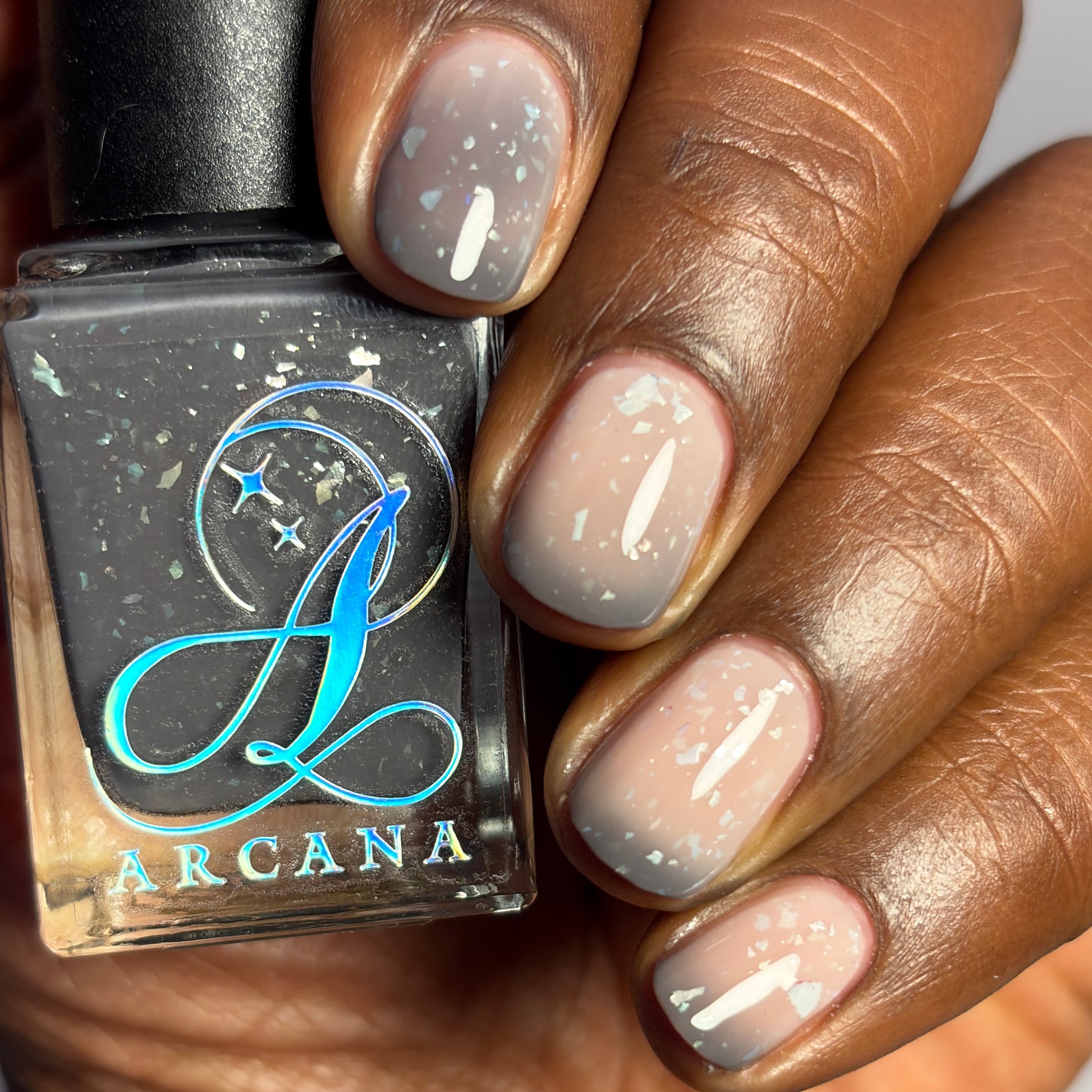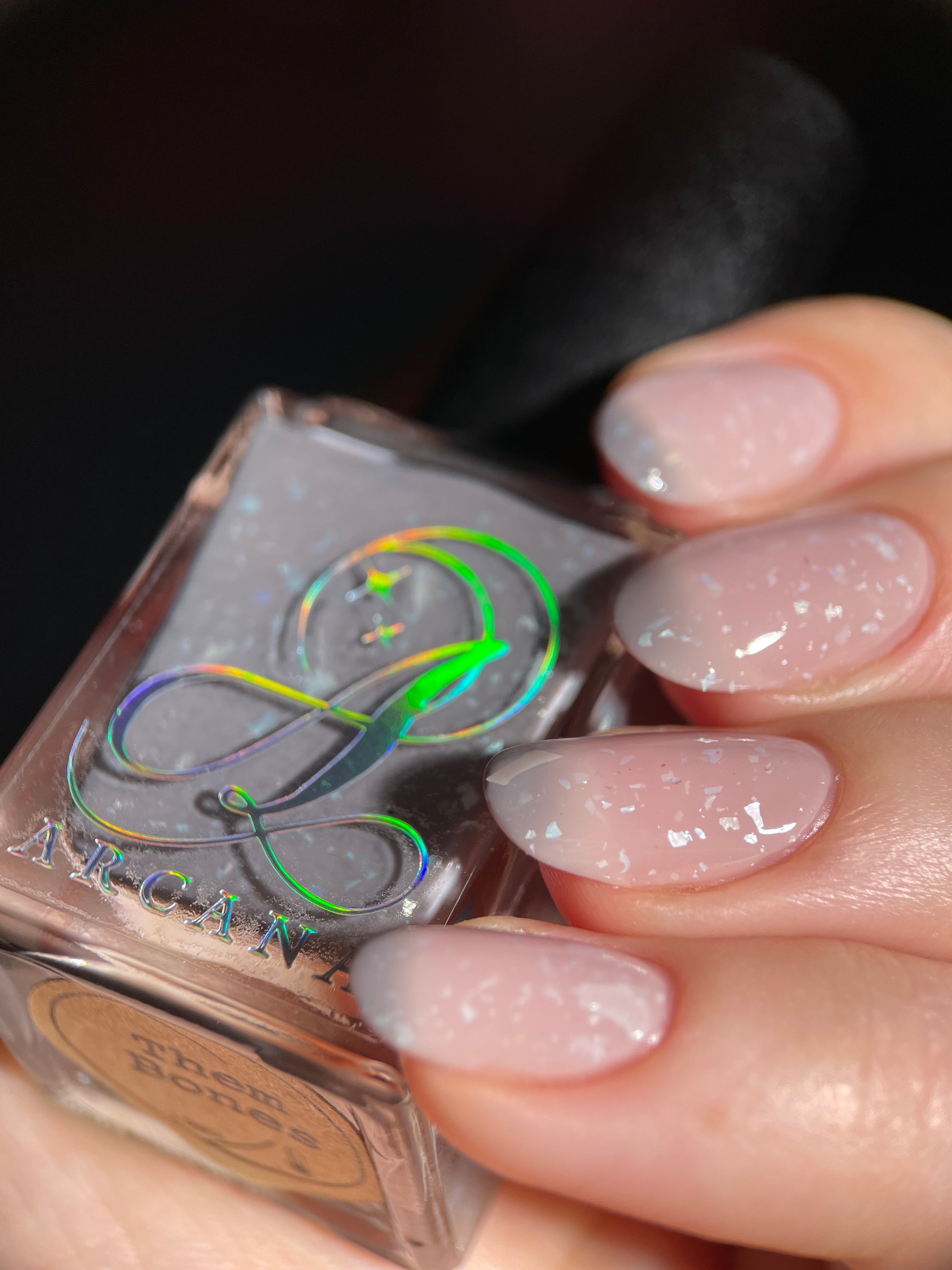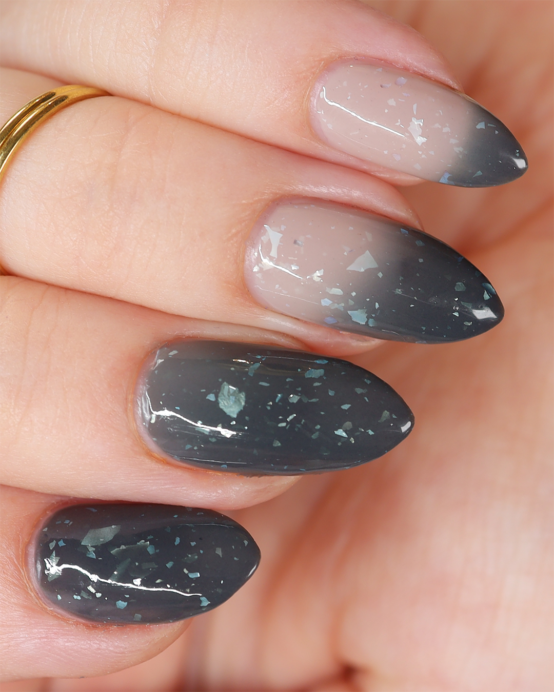 Them Bones is a thermal polish that shifts from dark gray to a cloudy white with a scattering of opaque flakes that flash blue, green, and a hint of yellow.