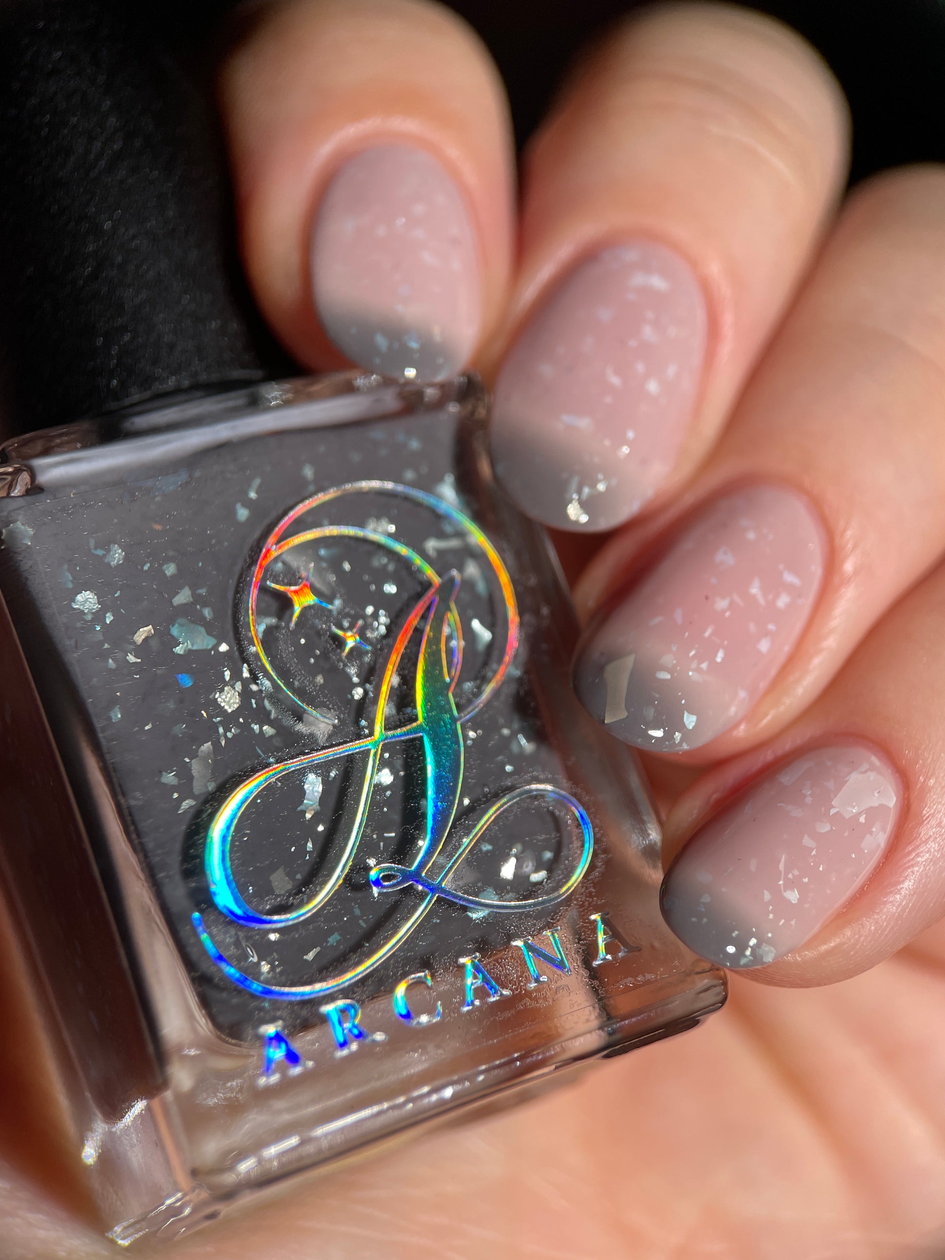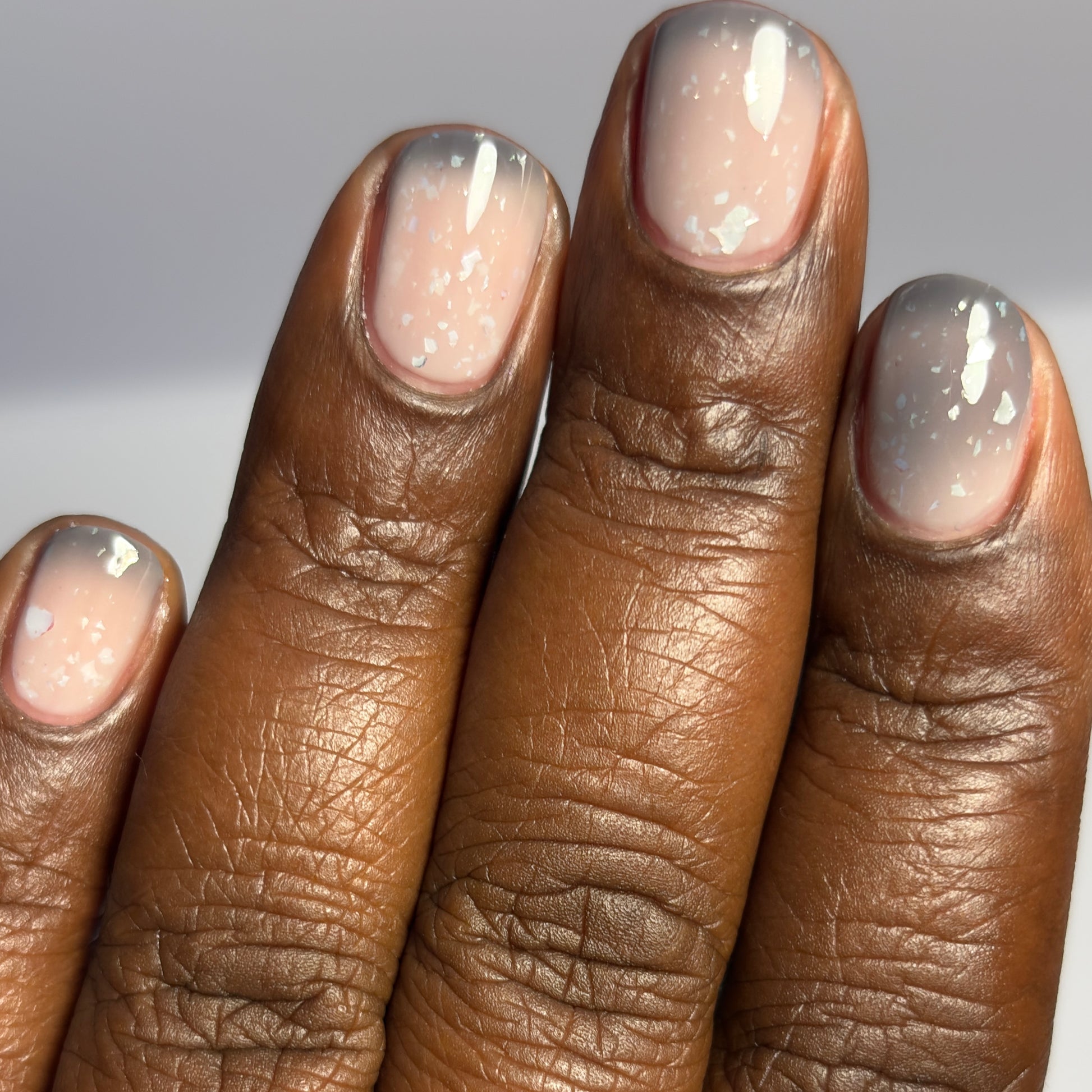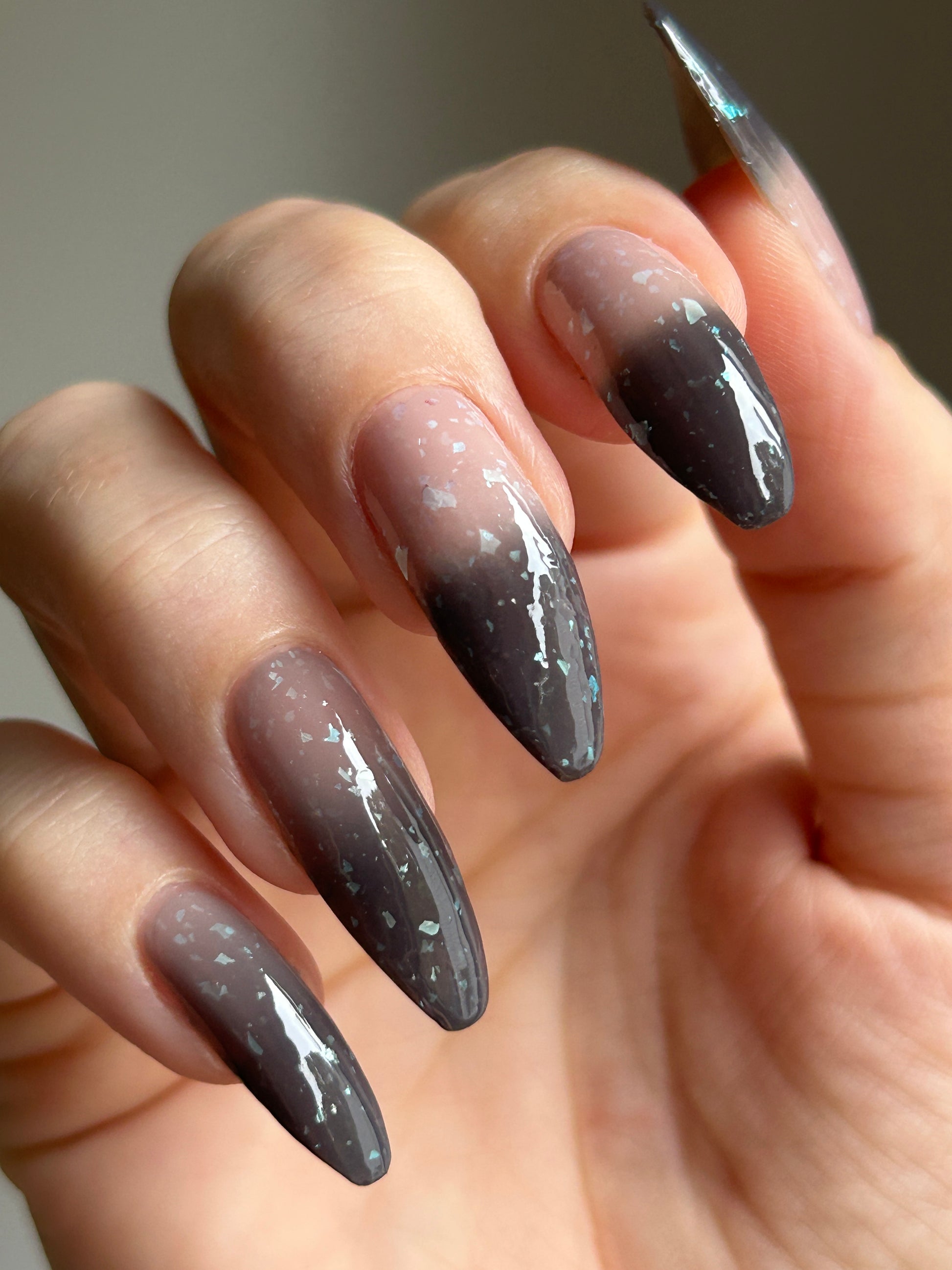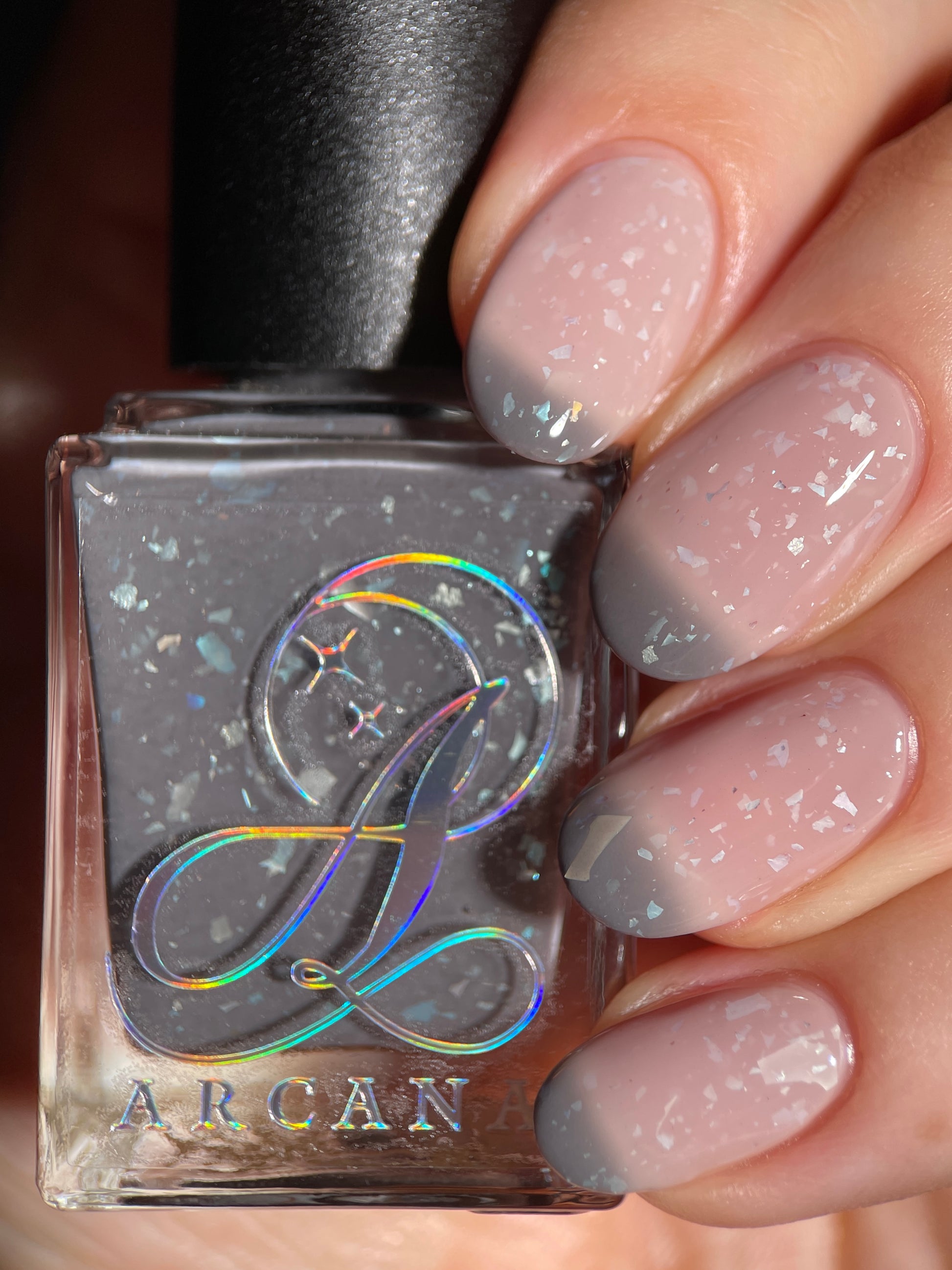 Them Bones is a thermal polish that shifts from dark gray to a cloudy white with a scattering of opaque flakes that flash blue, green, and a hint of yellow.
