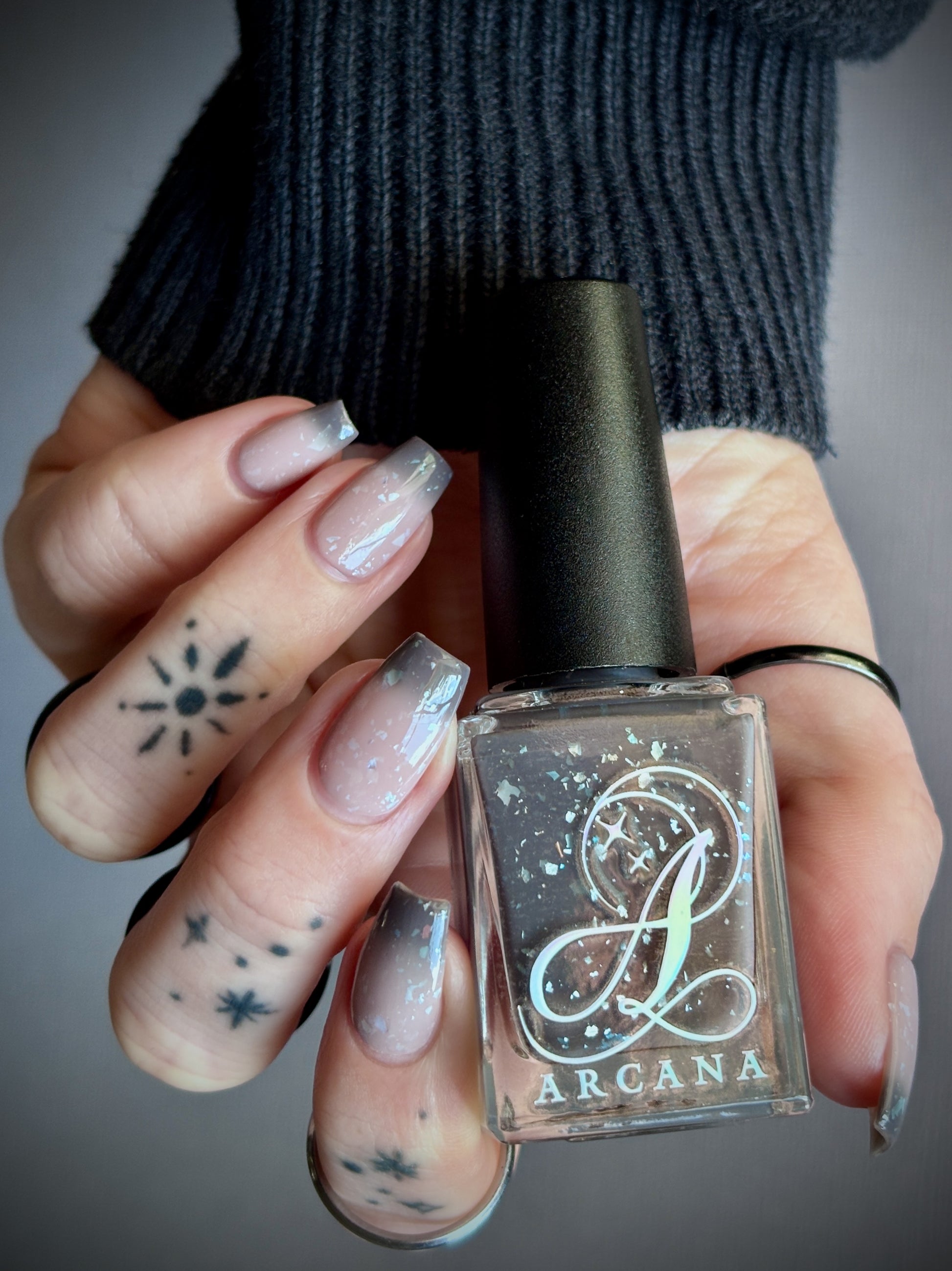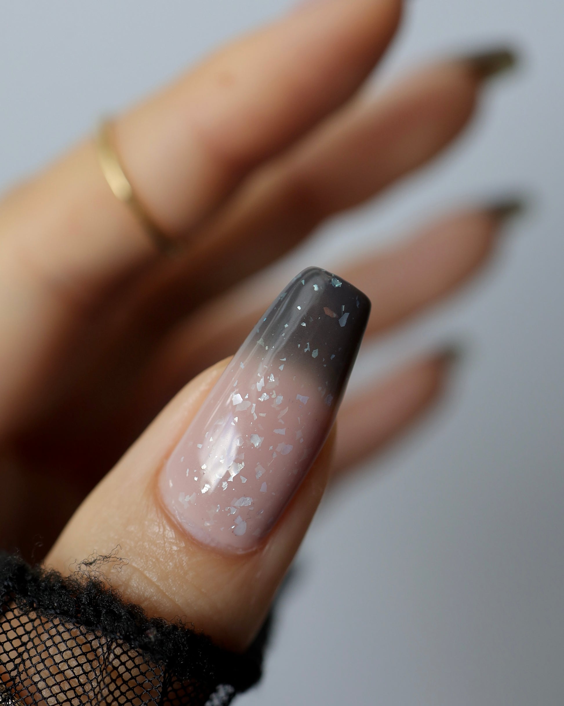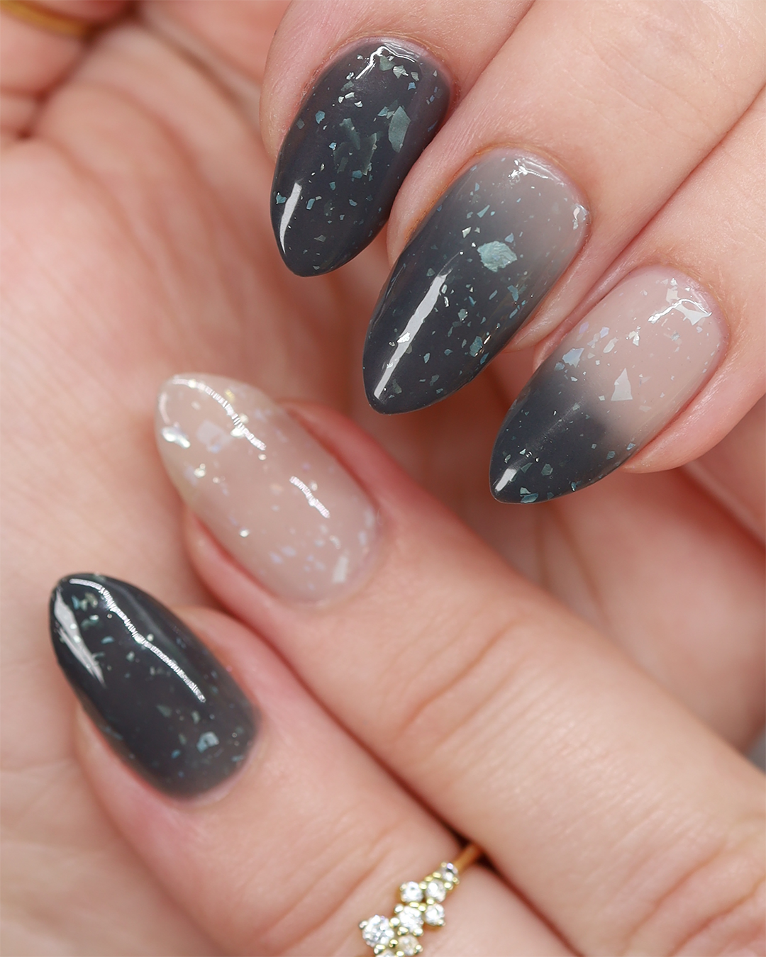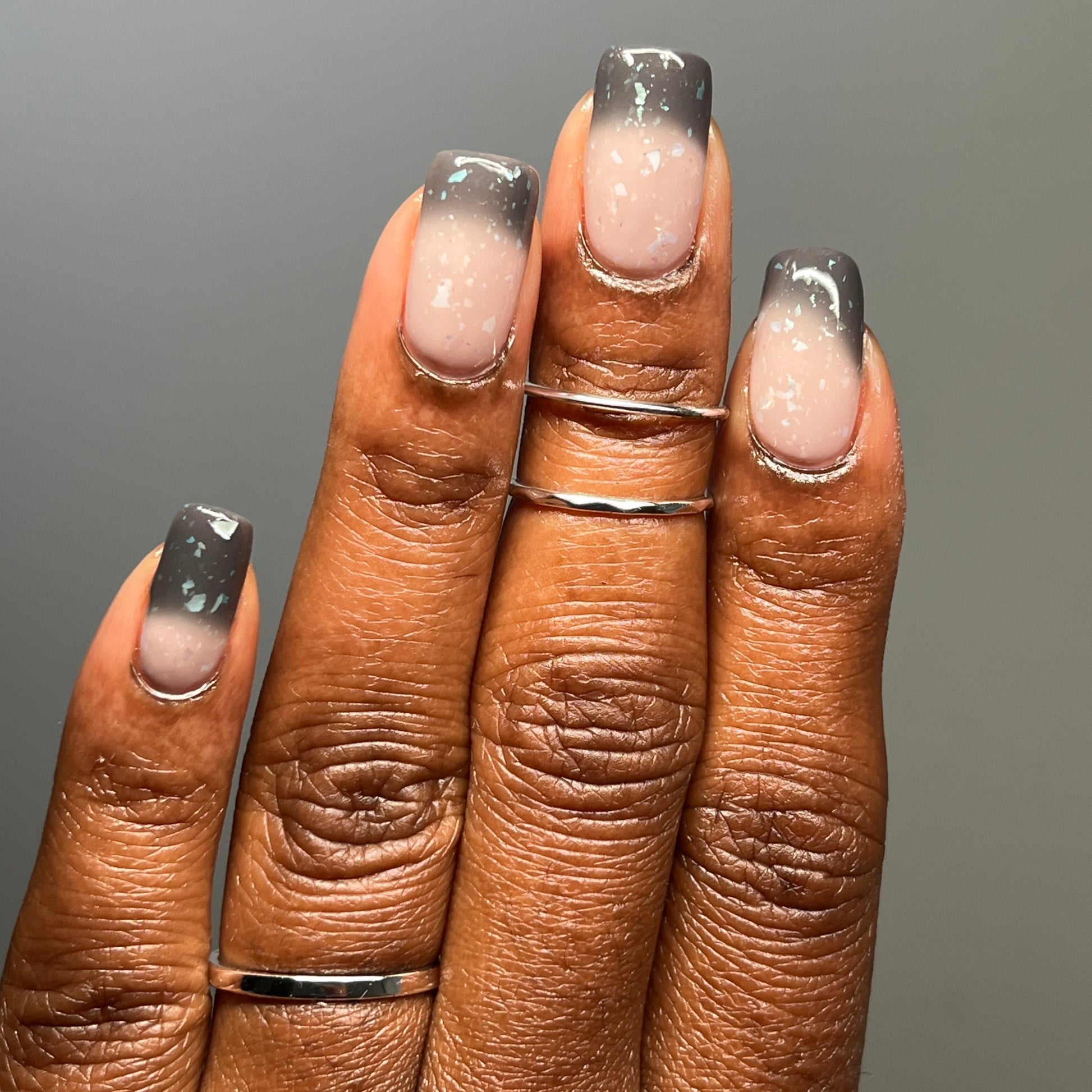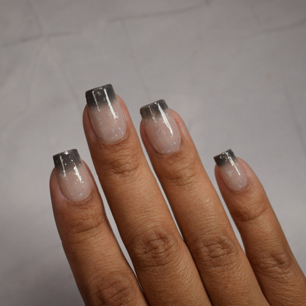Them Bones is a thermal polish that shifts from dark gray to a cloudy white with a scattering of opaque flakes that flash blue, green, and a hint of yellow.