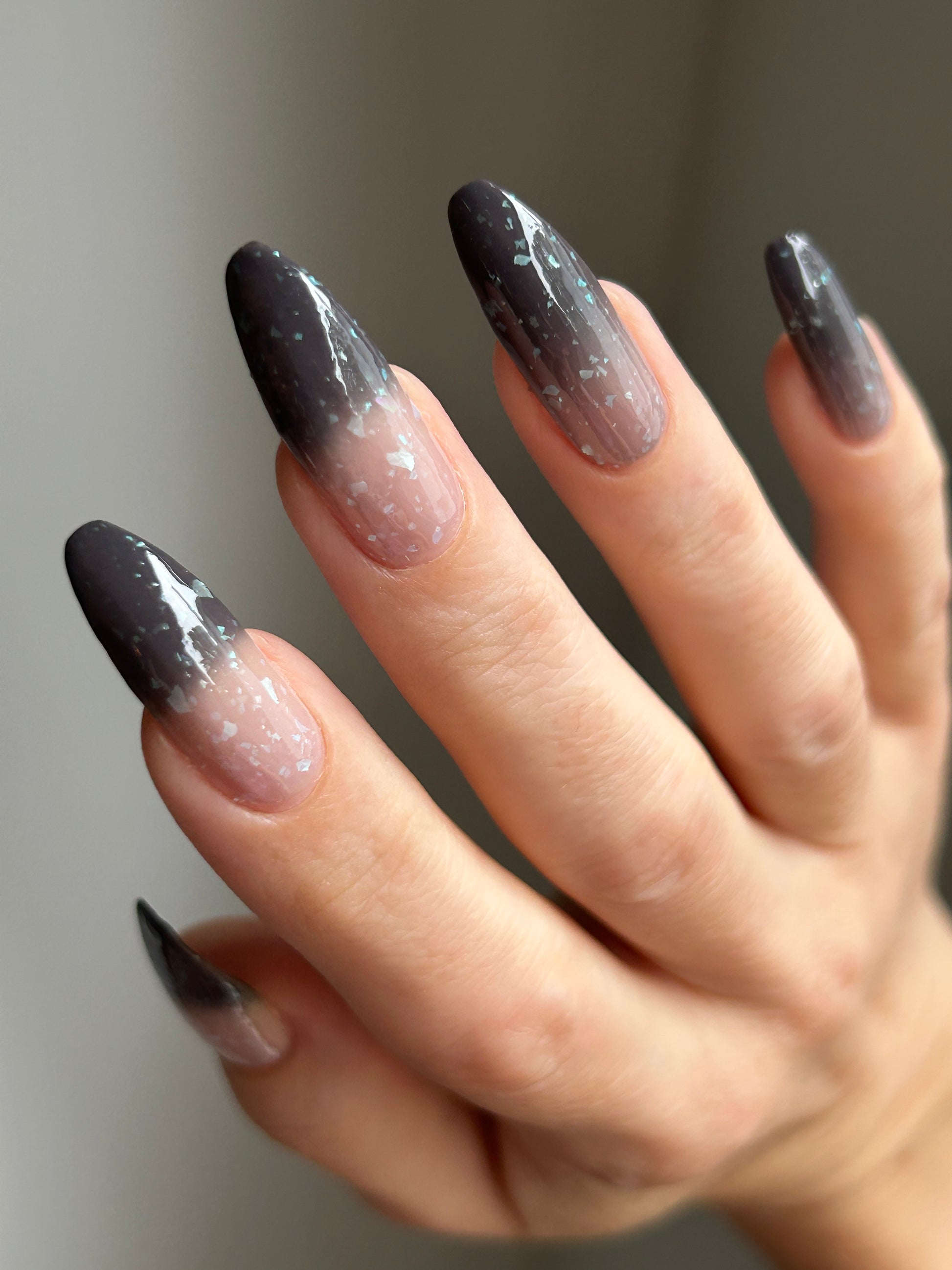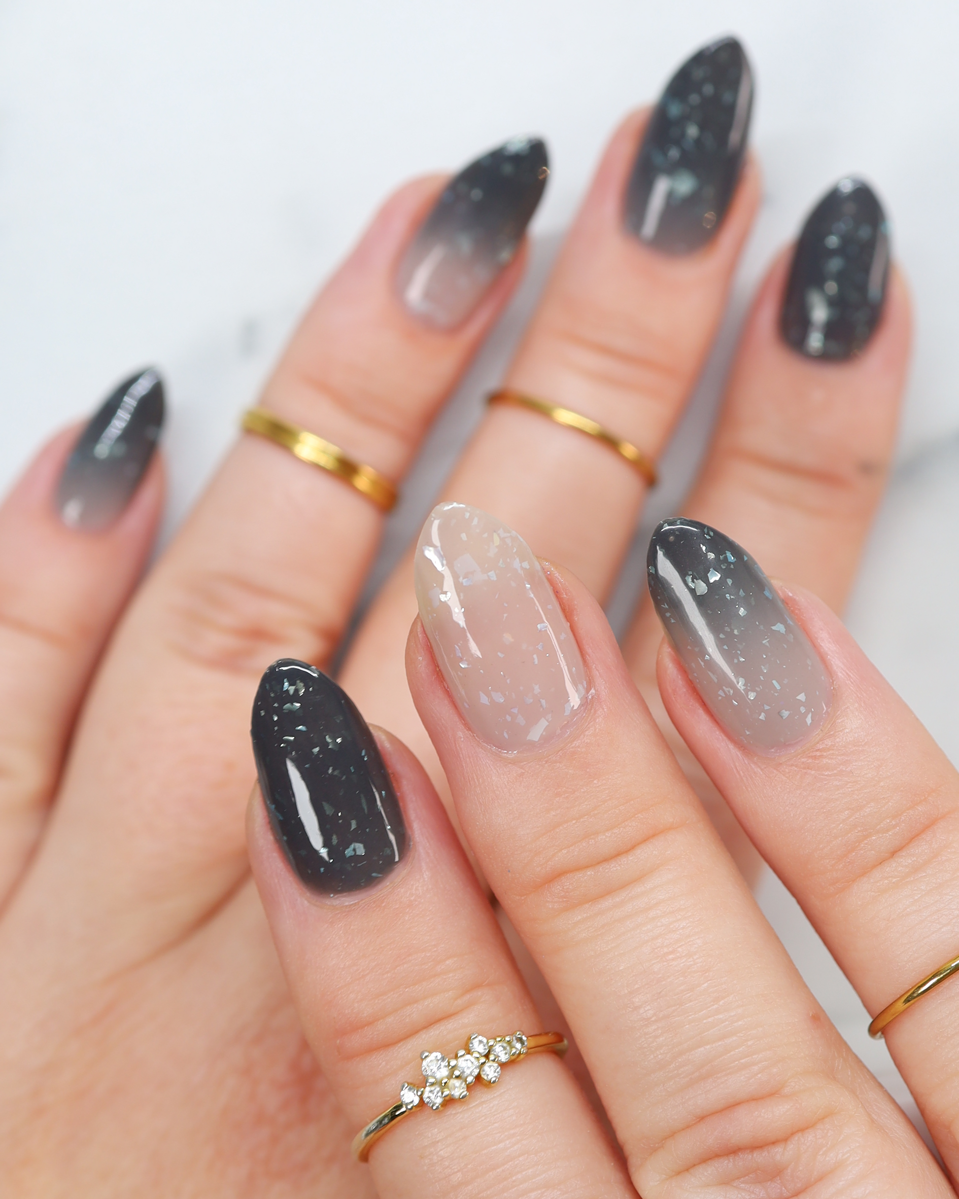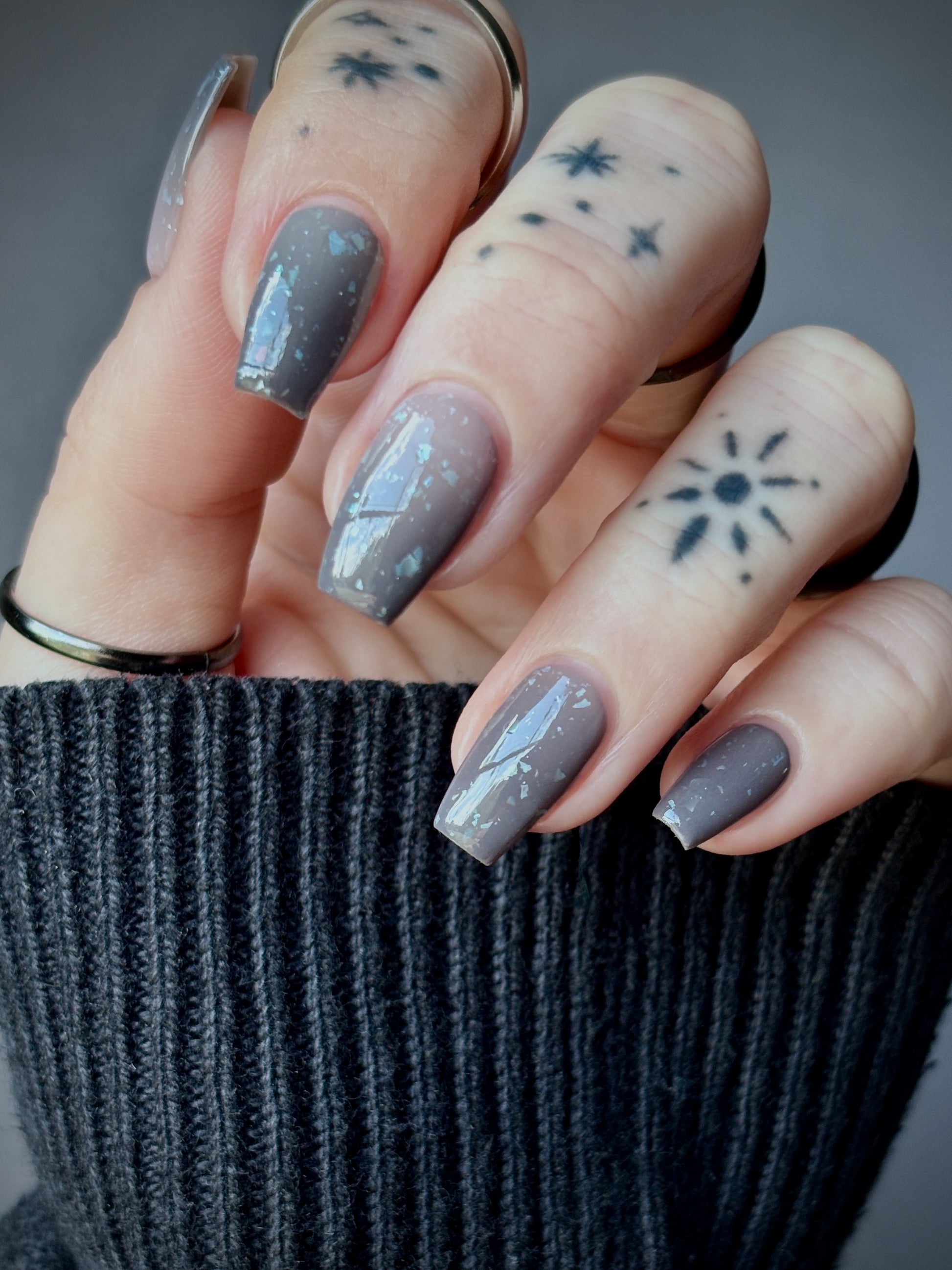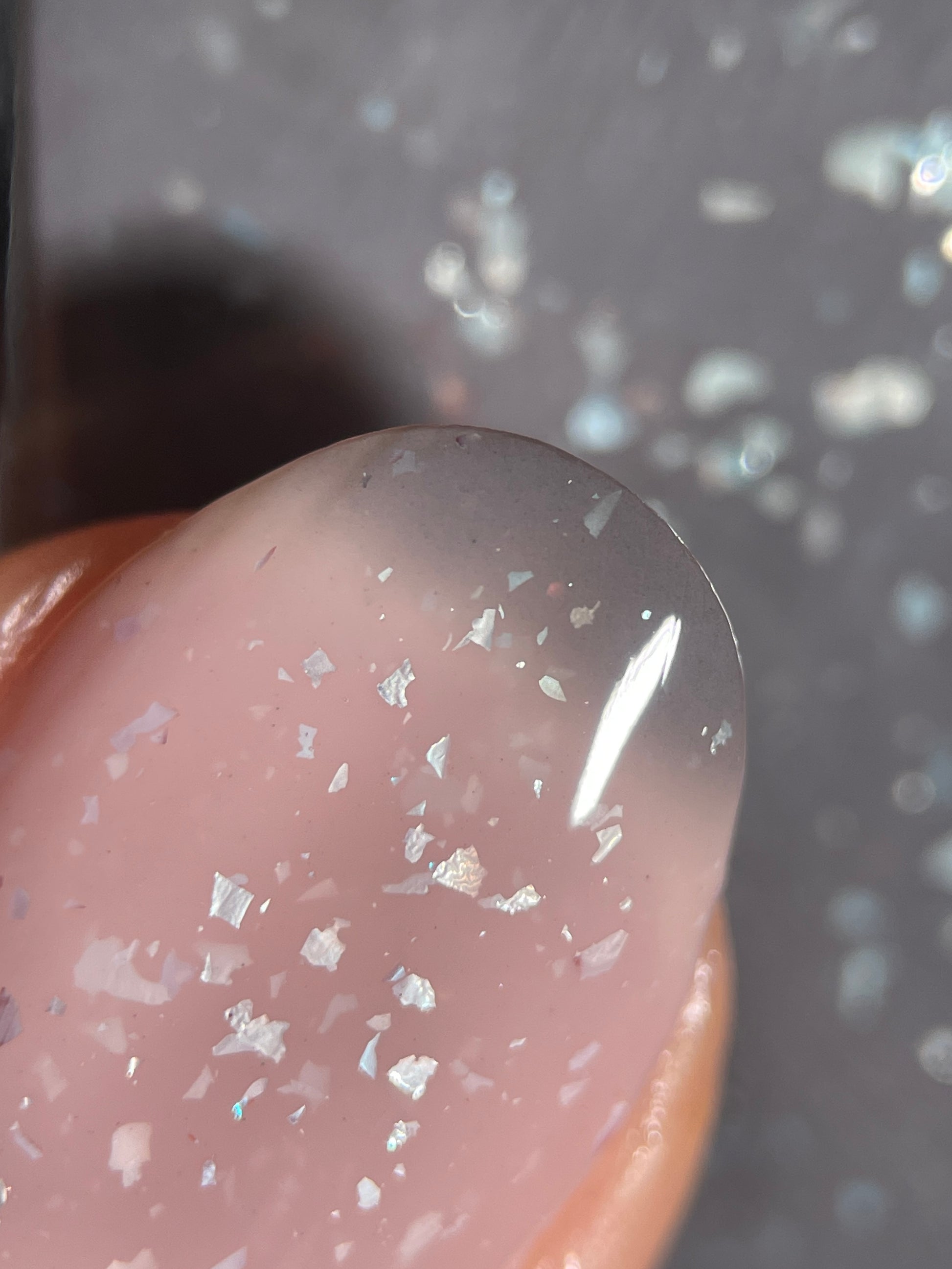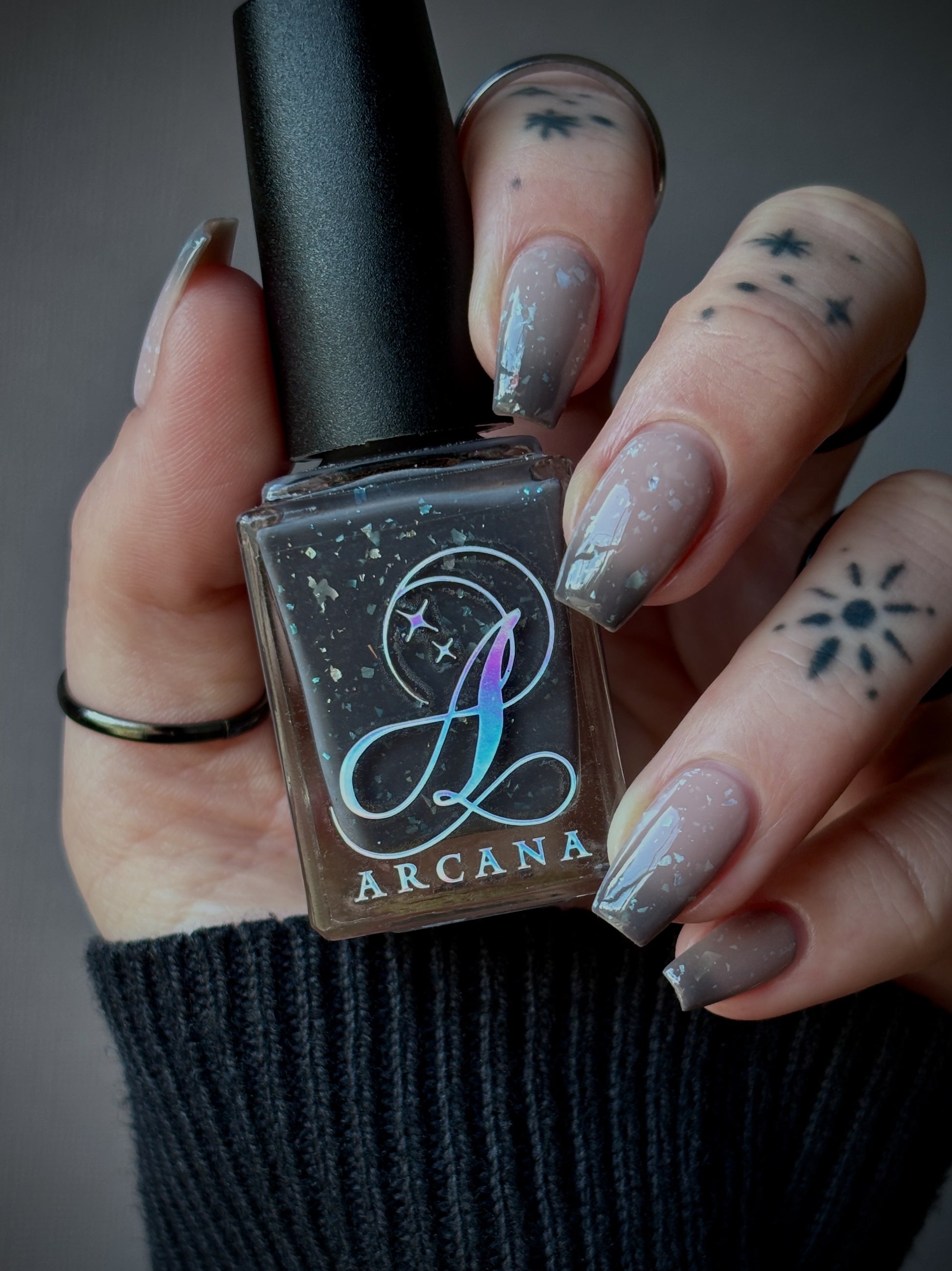 Them Bones is a thermal polish that shifts from dark gray to a cloudy white with a scattering of opaque flakes that flash blue, green, and a hint of yellow.