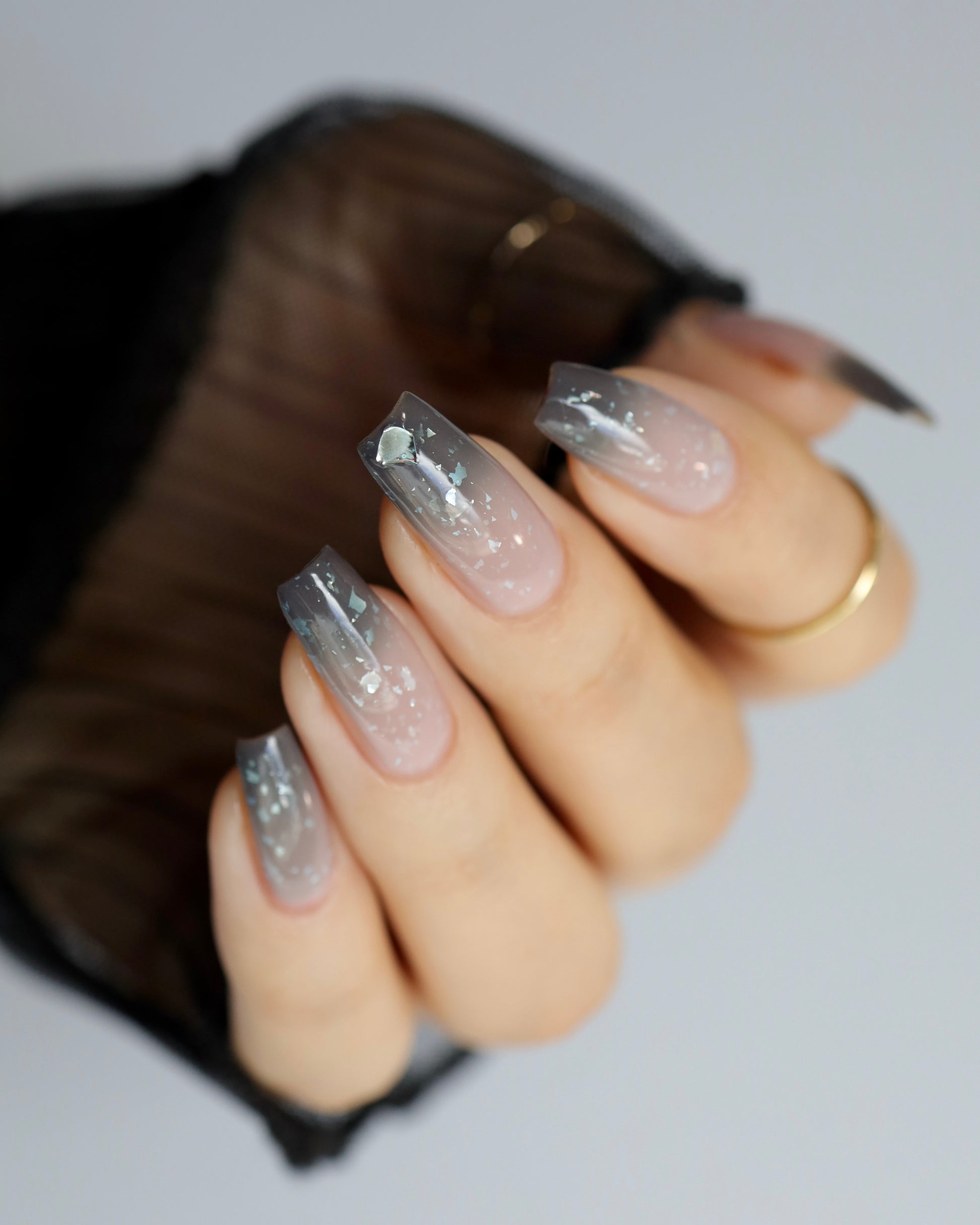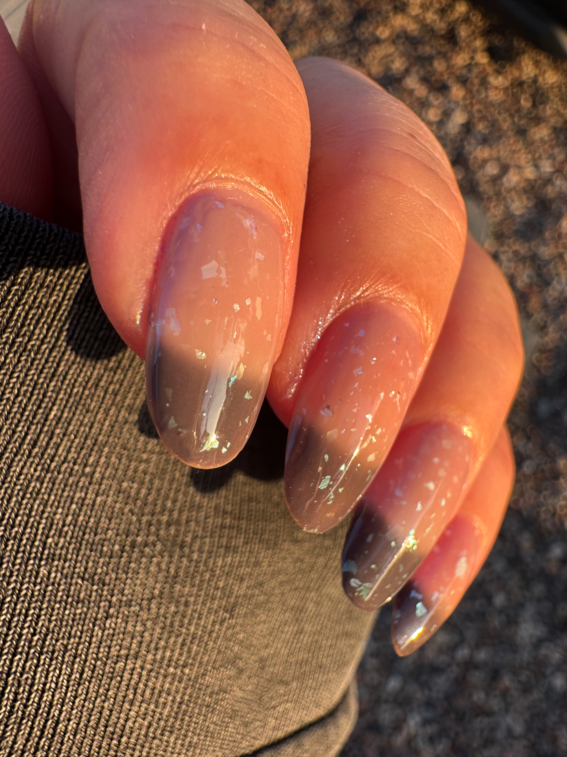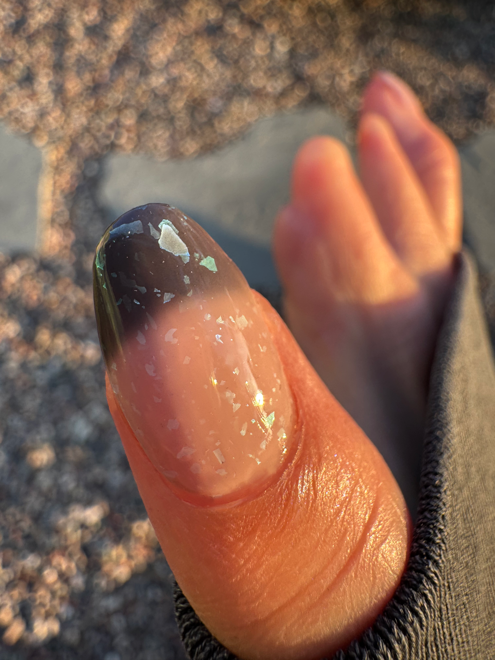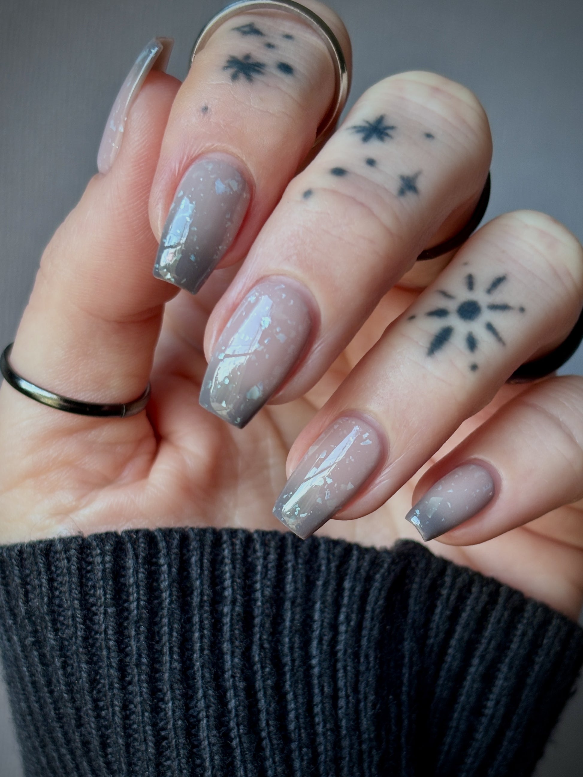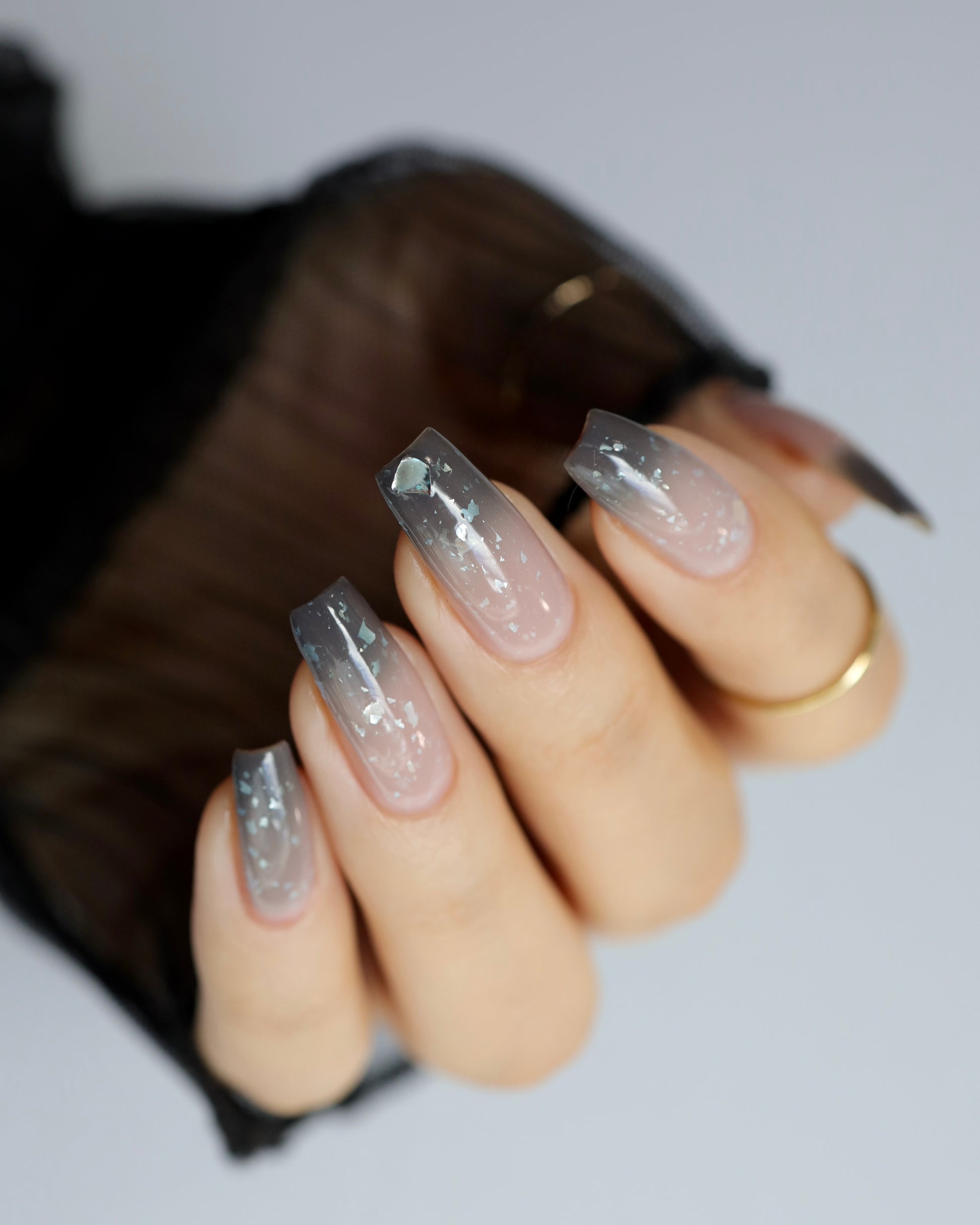 Them Bones is a thermal polish that shifts from dark gray to a cloudy white with a scattering of opaque flakes that flash blue, green, and a hint of yellow.