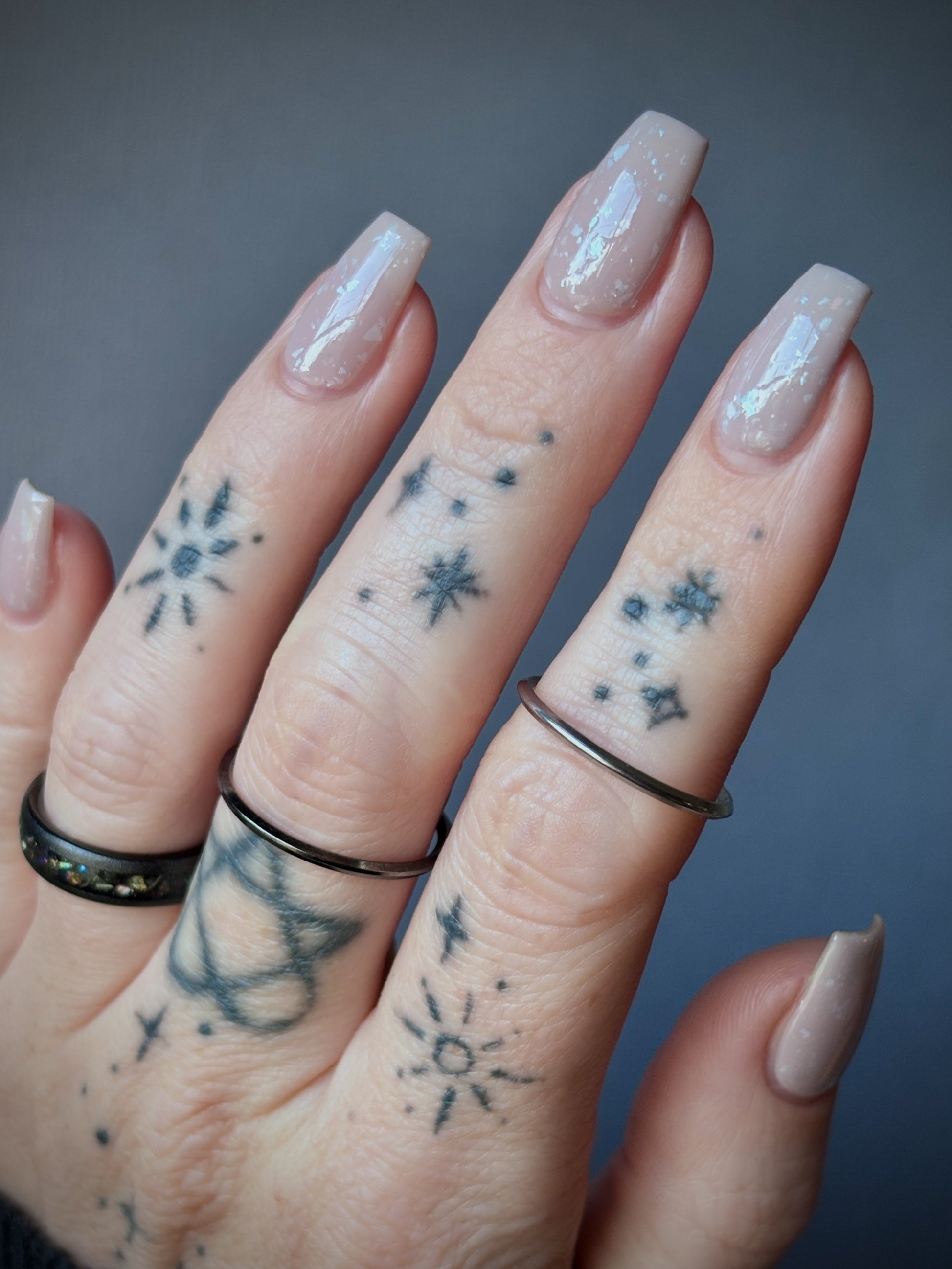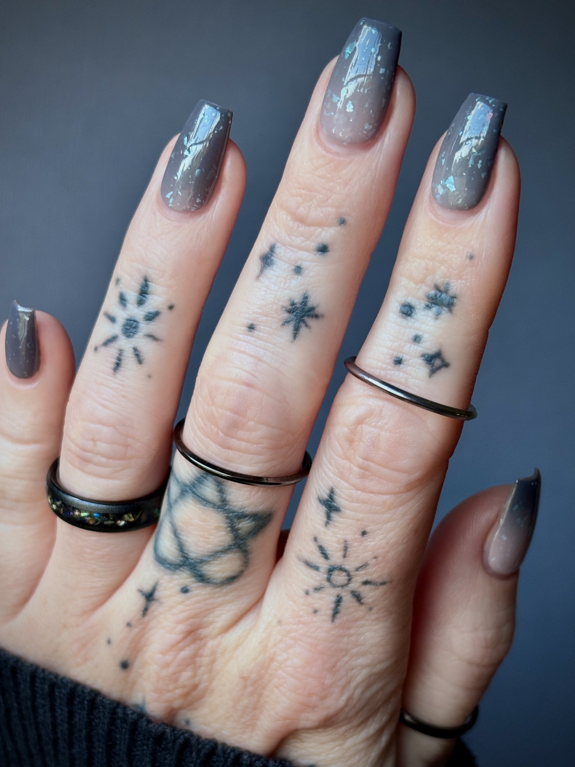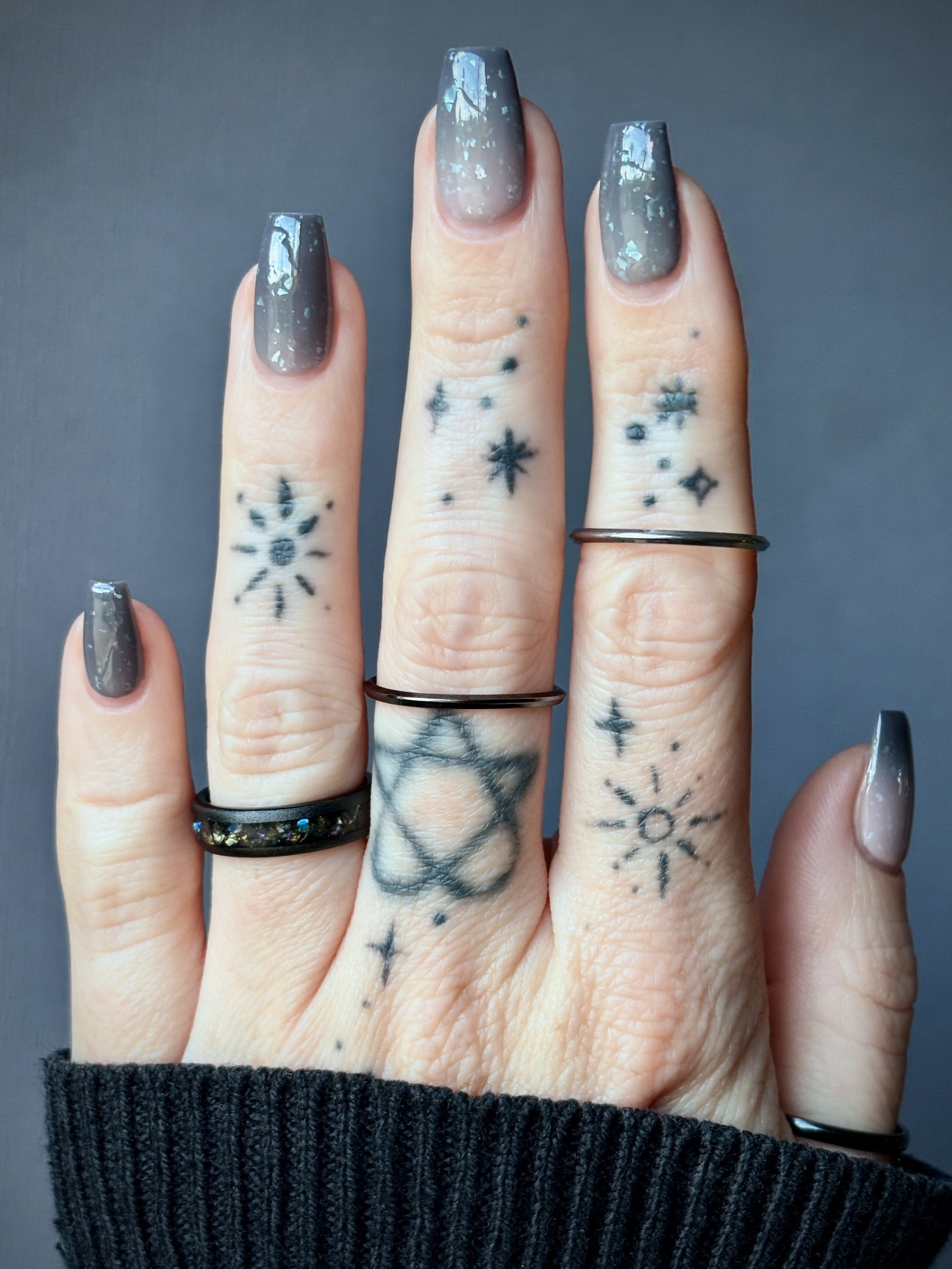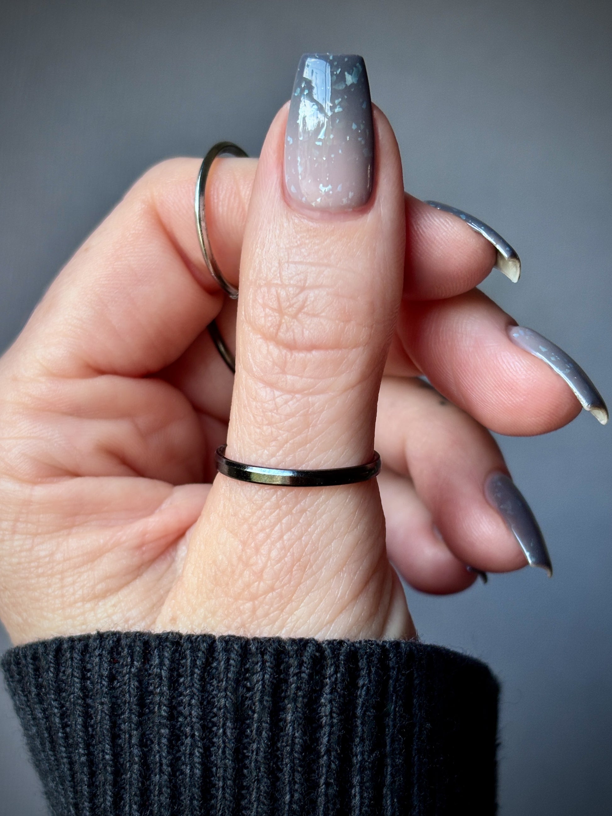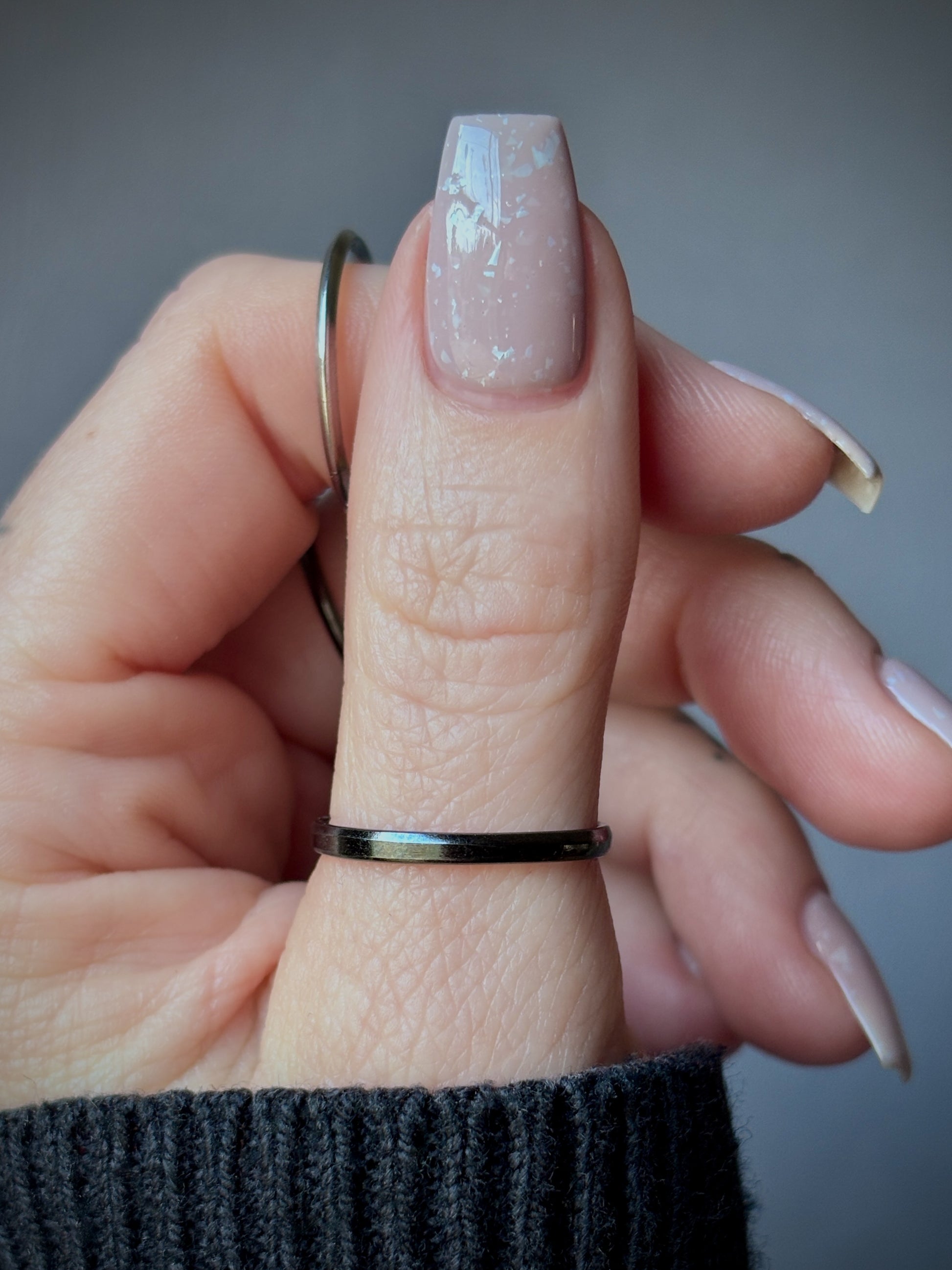 Them Bones is a thermal polish that shifts from dark gray to a cloudy white with a scattering of opaque flakes that flash blue, green, and a hint of yellow.