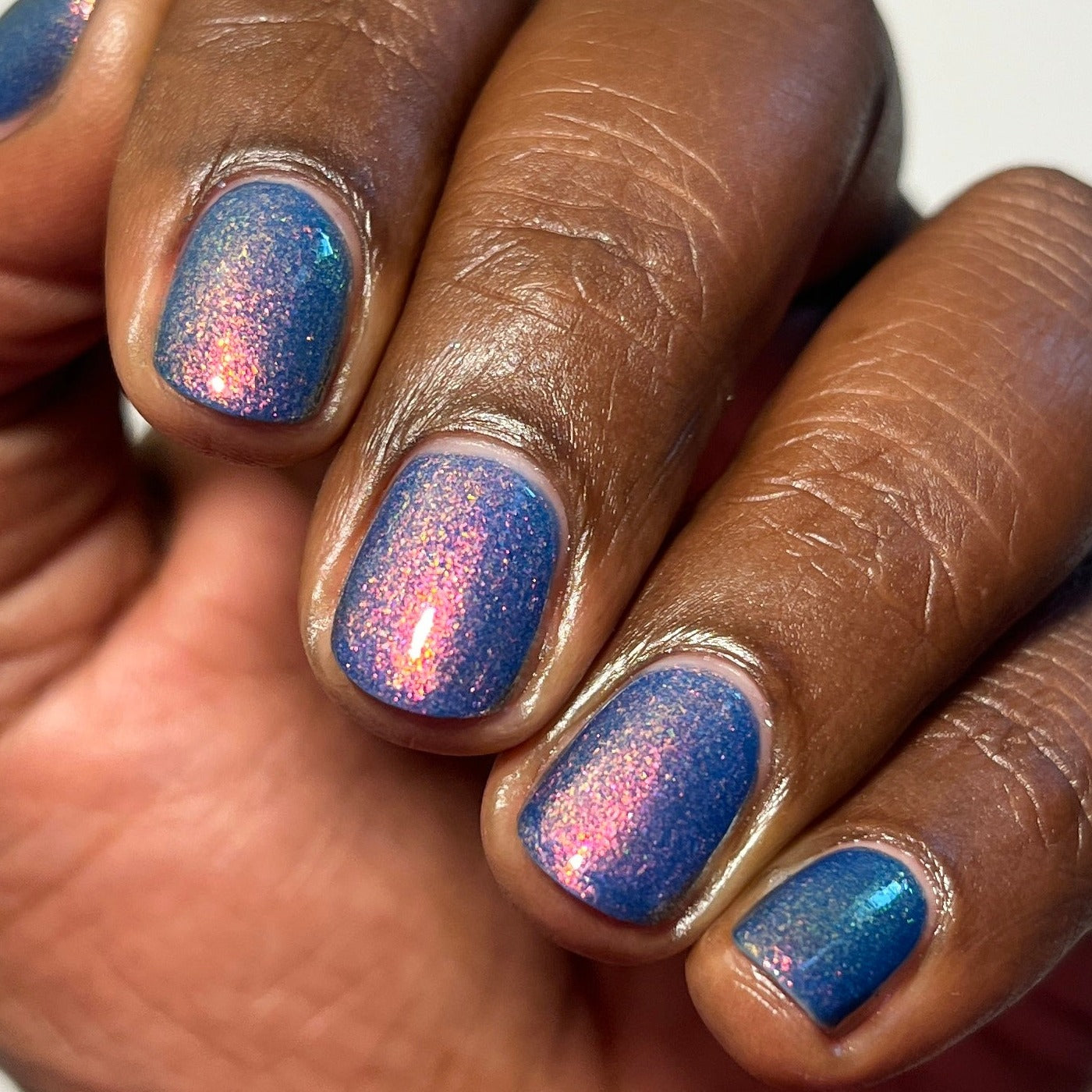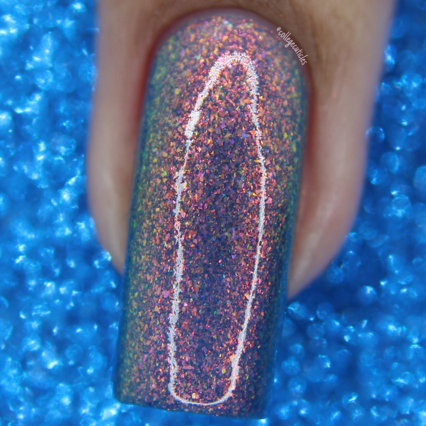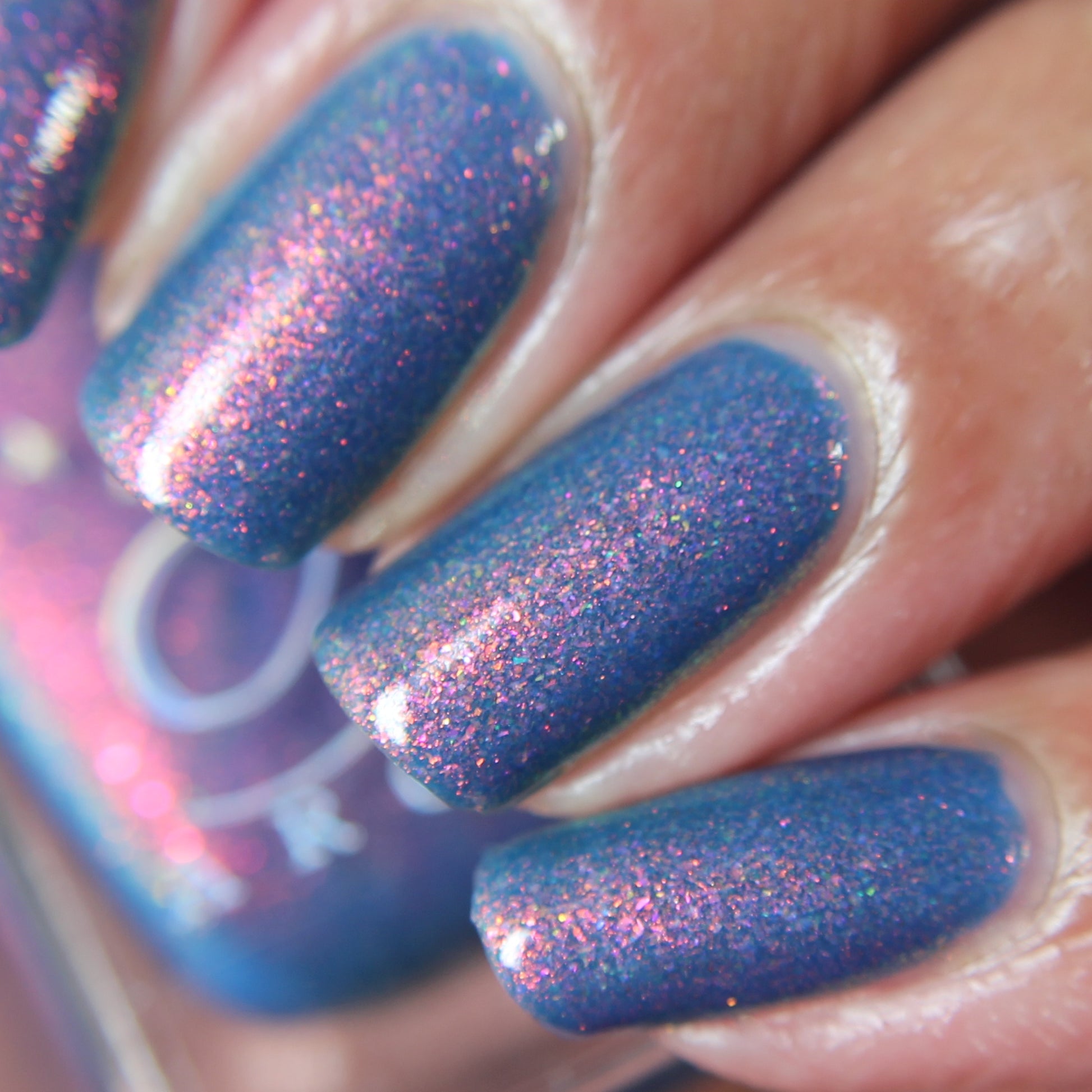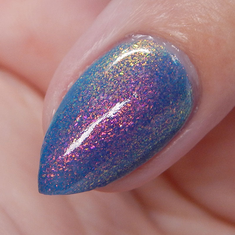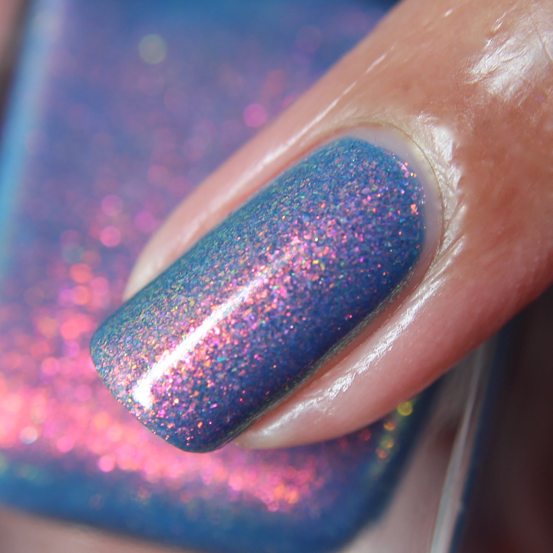 This polish has a neon blue base with pink-orange-yellow large particle shimmer!