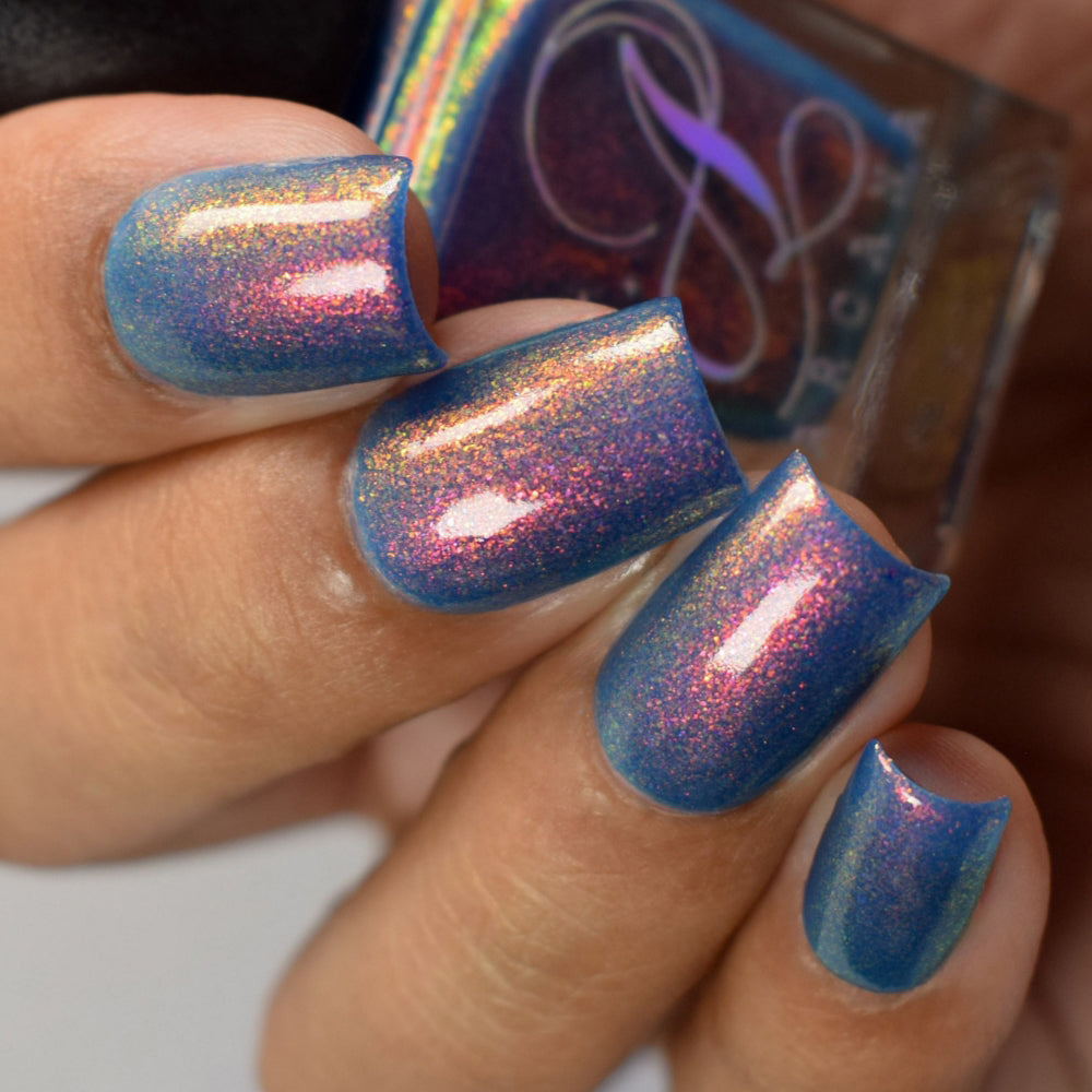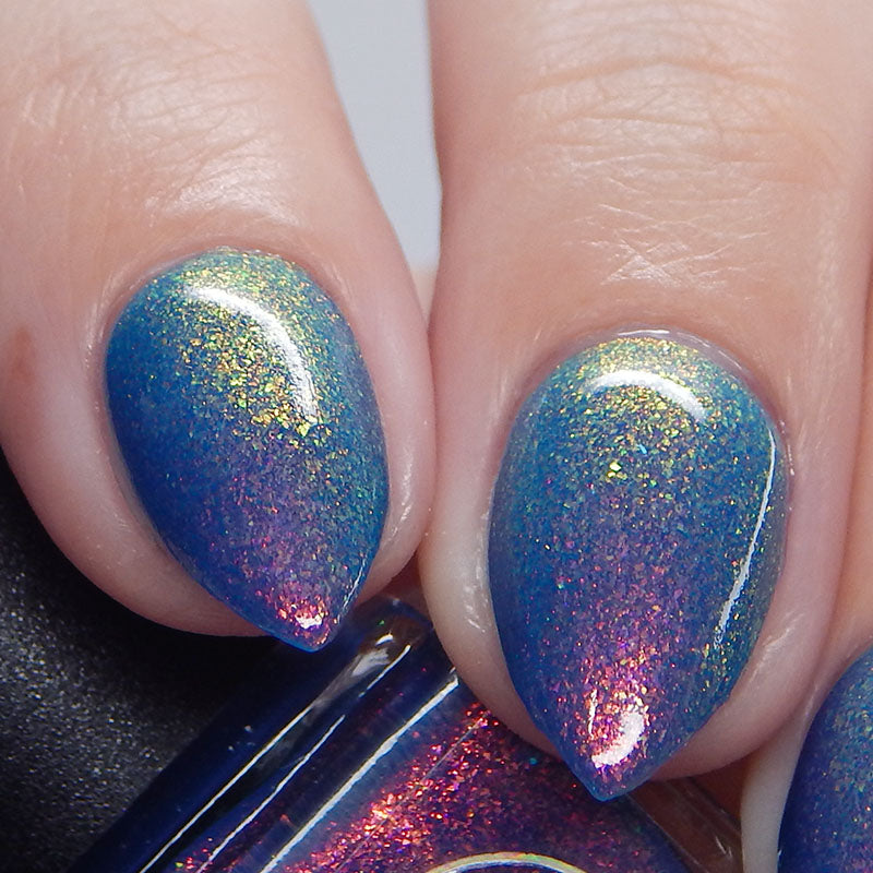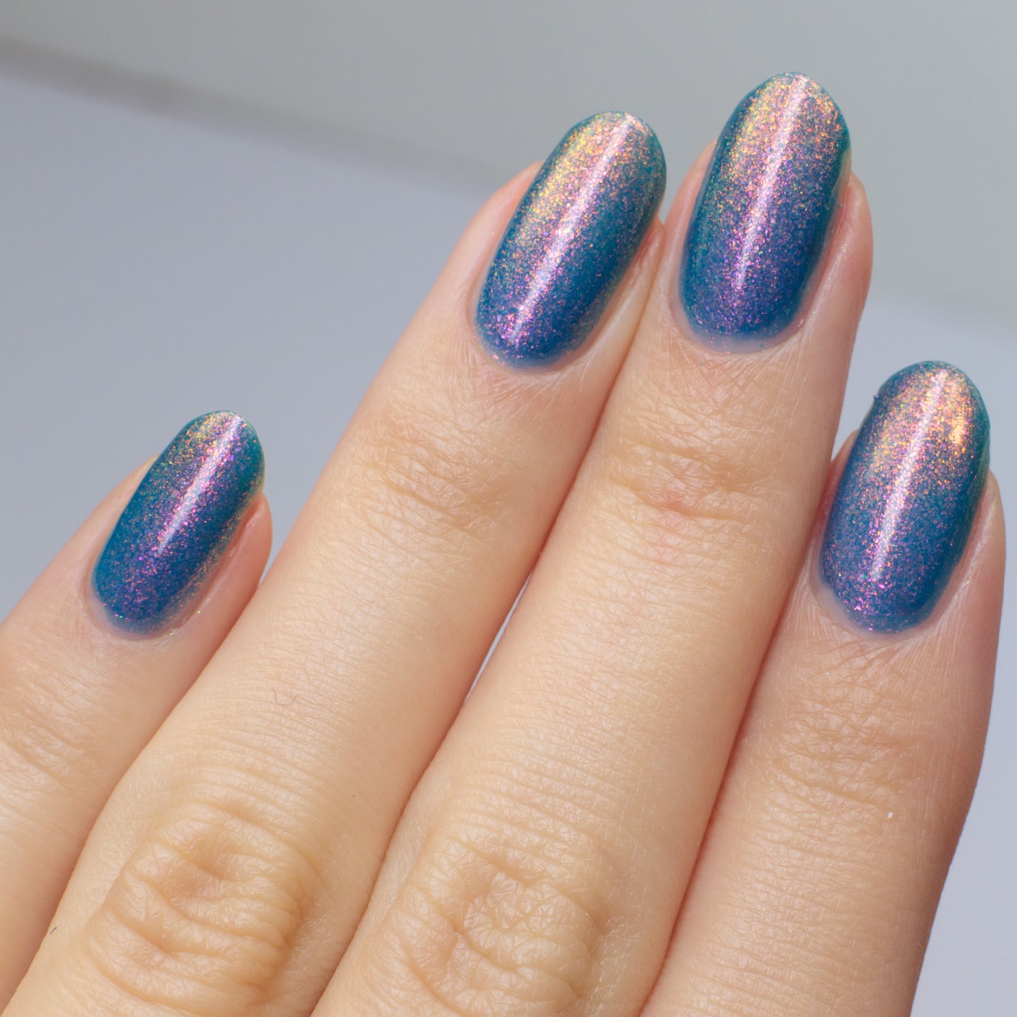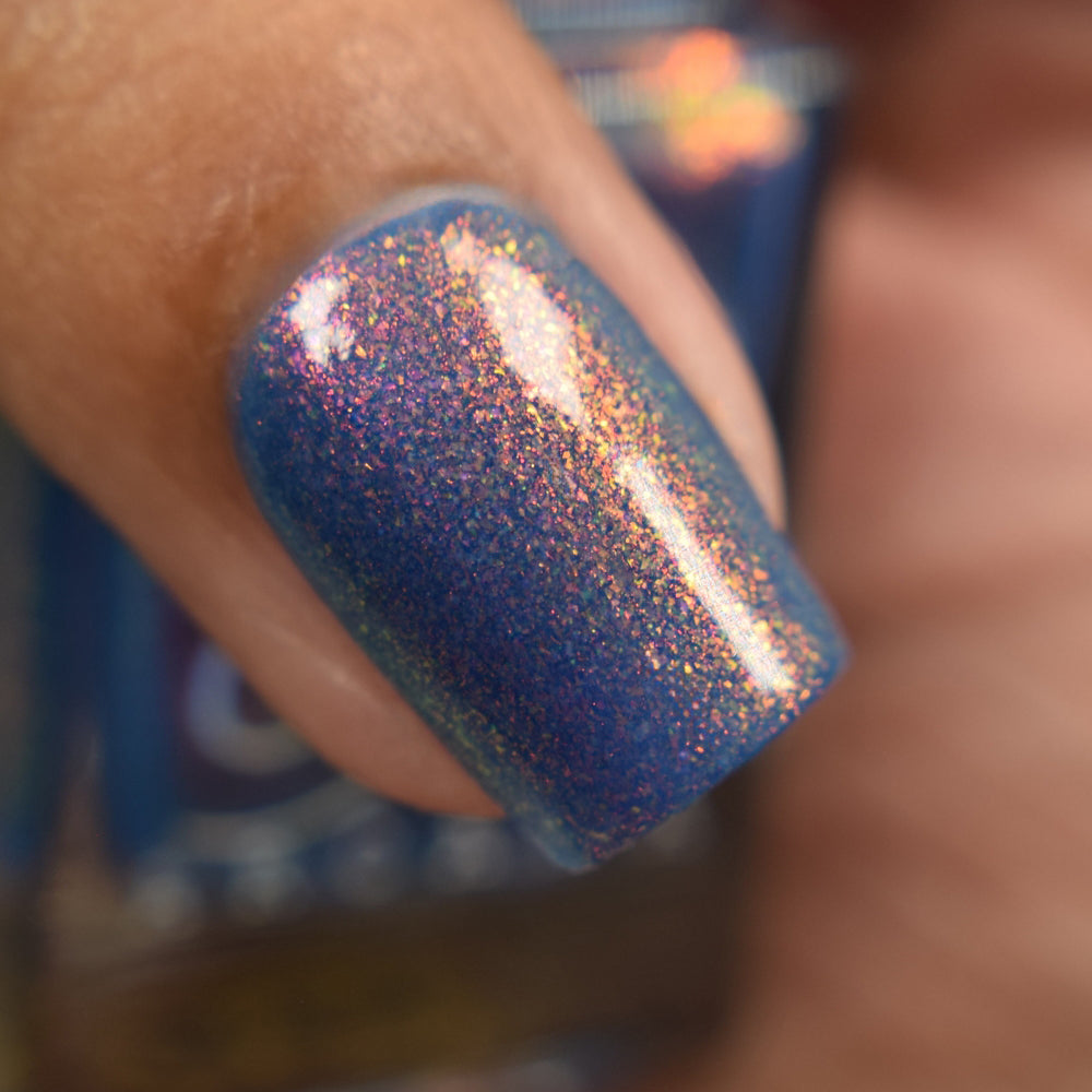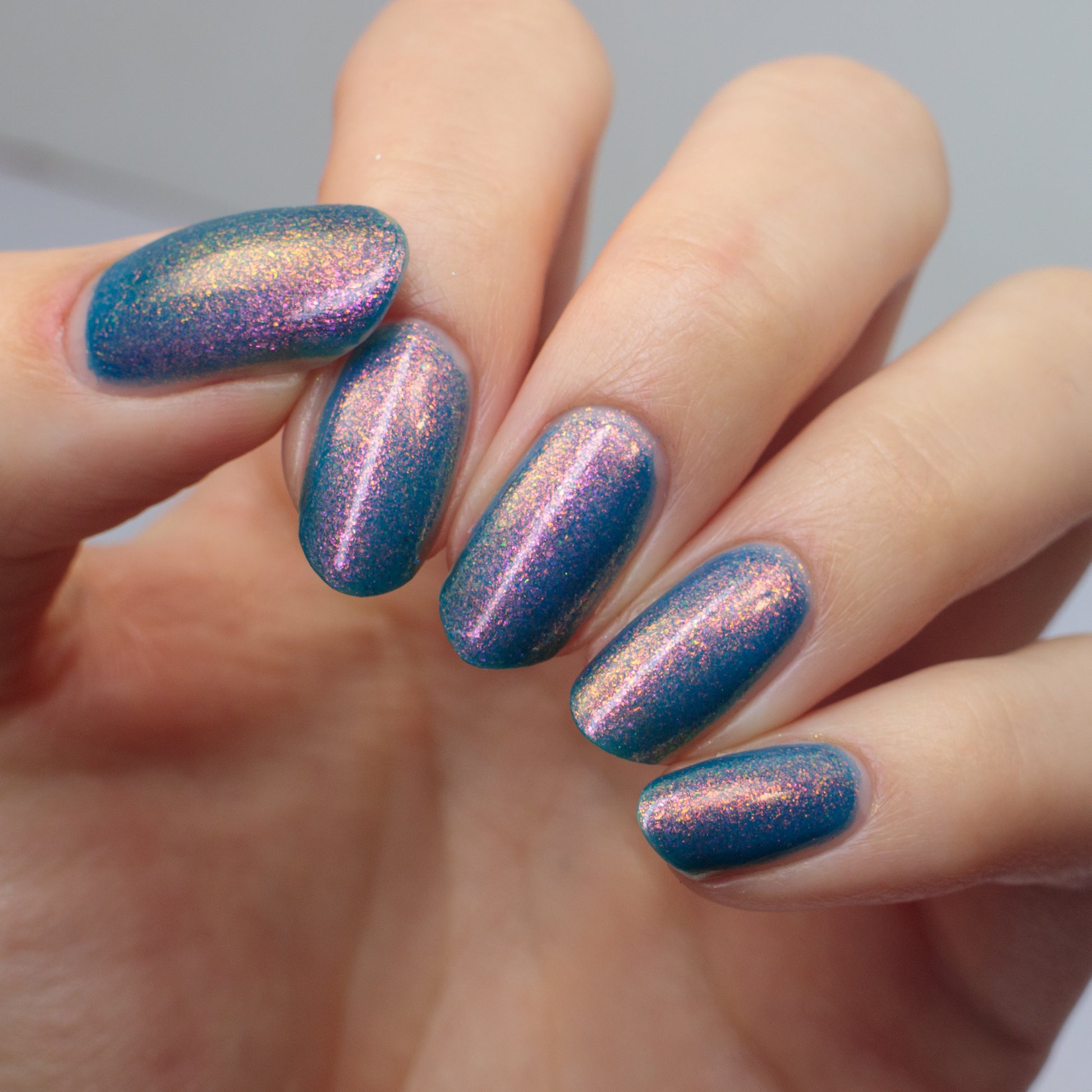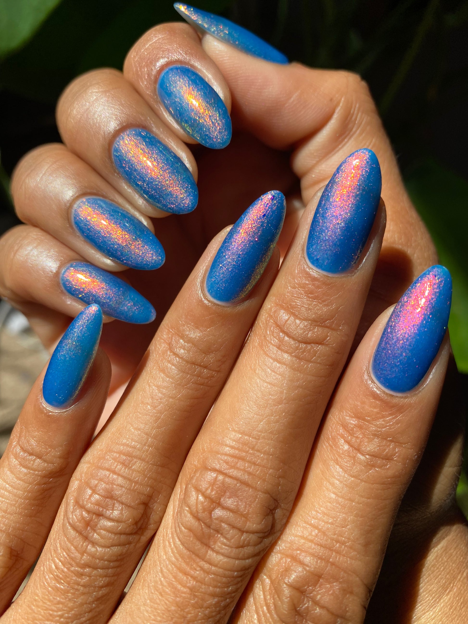 This polish has a neon blue base with pink-orange-yellow large particle shimmer!