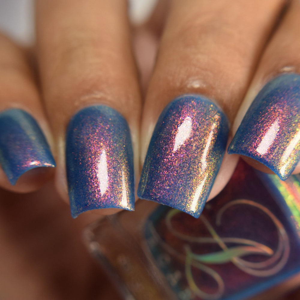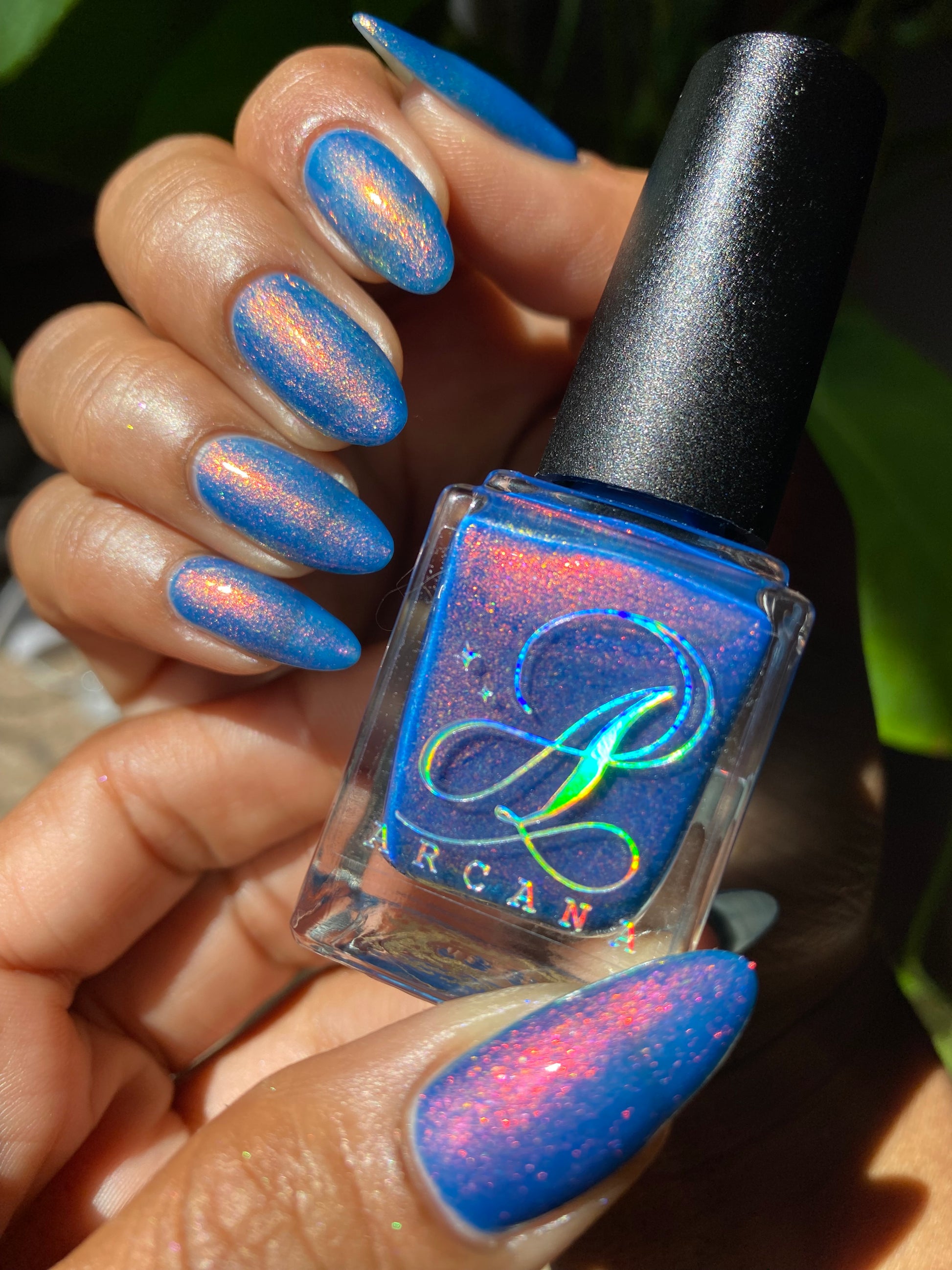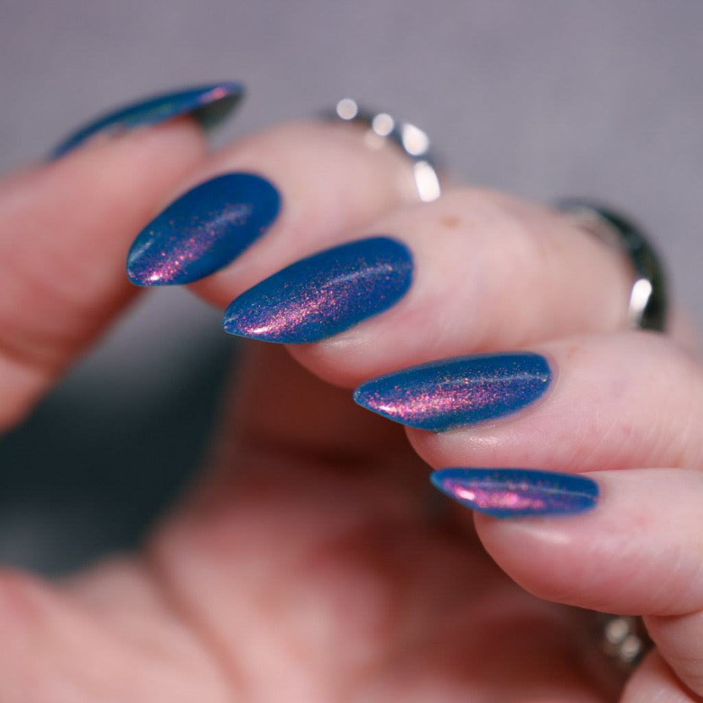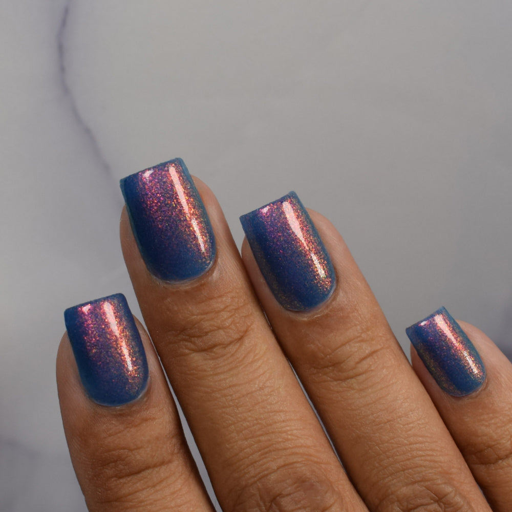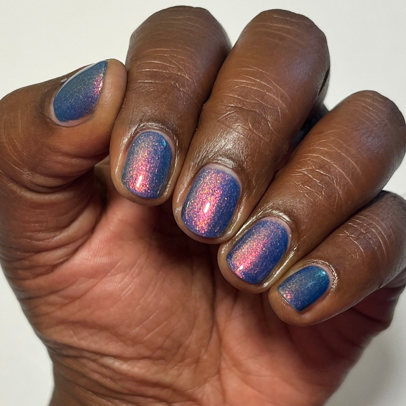 This polish has a neon blue base with pink-orange-yellow large particle shimmer!