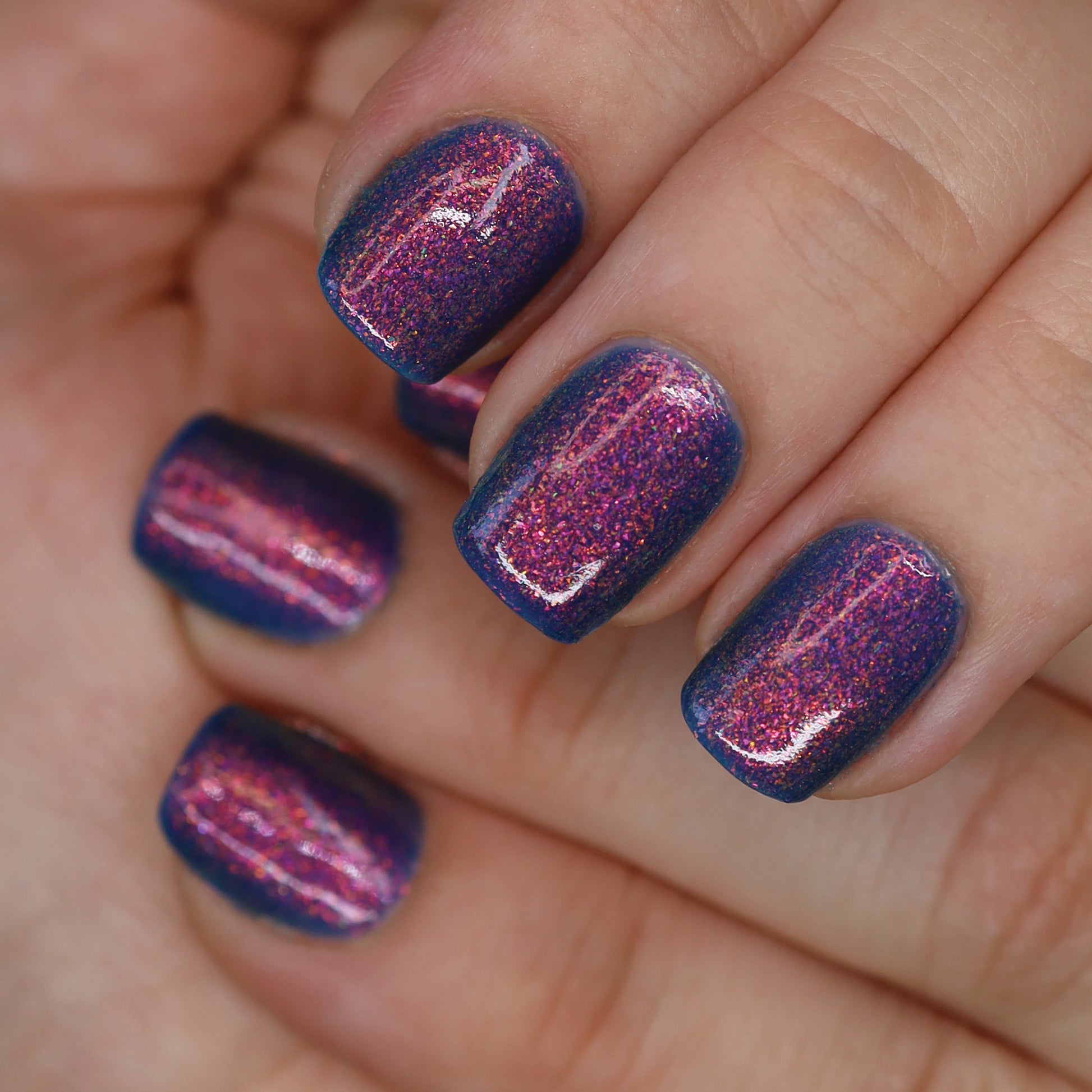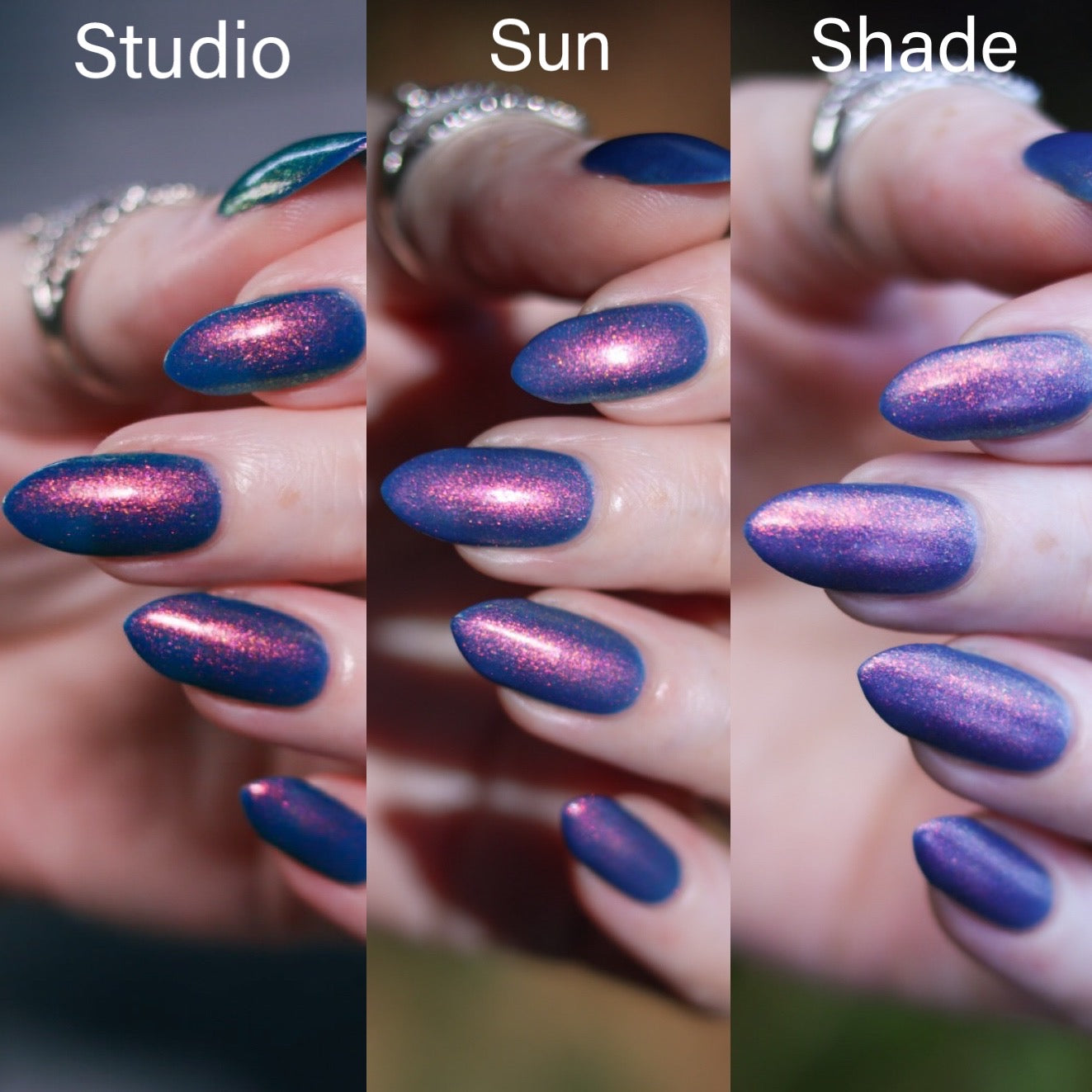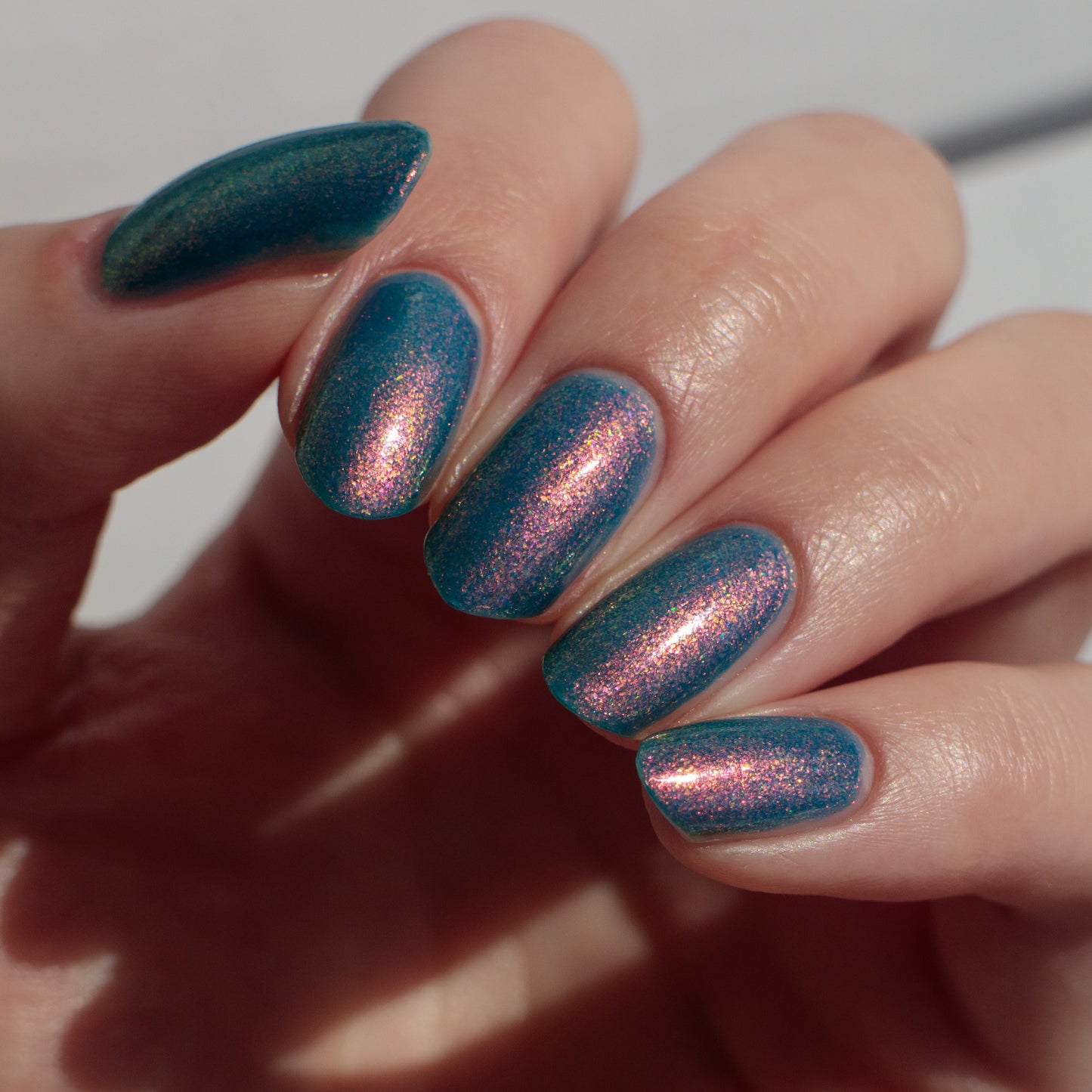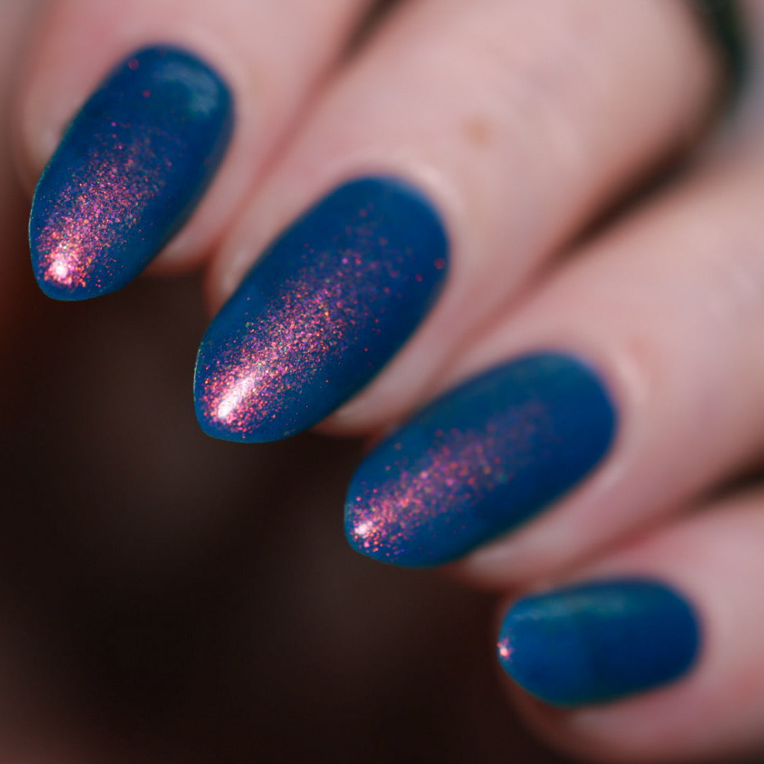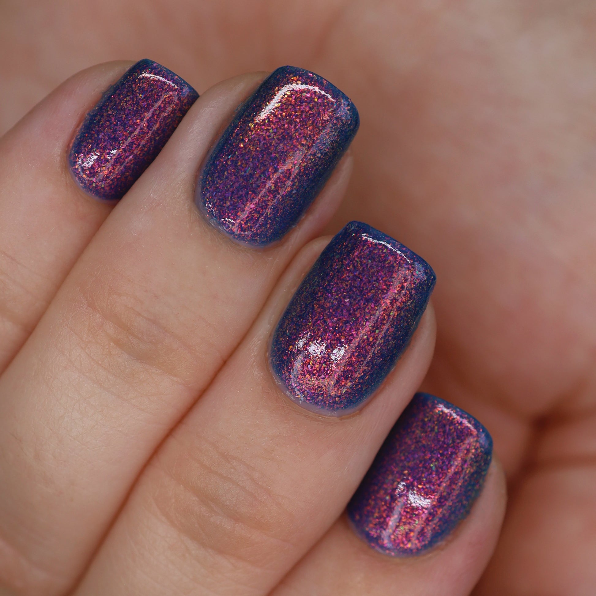 This polish has a neon blue base with pink-orange-yellow large particle shimmer!