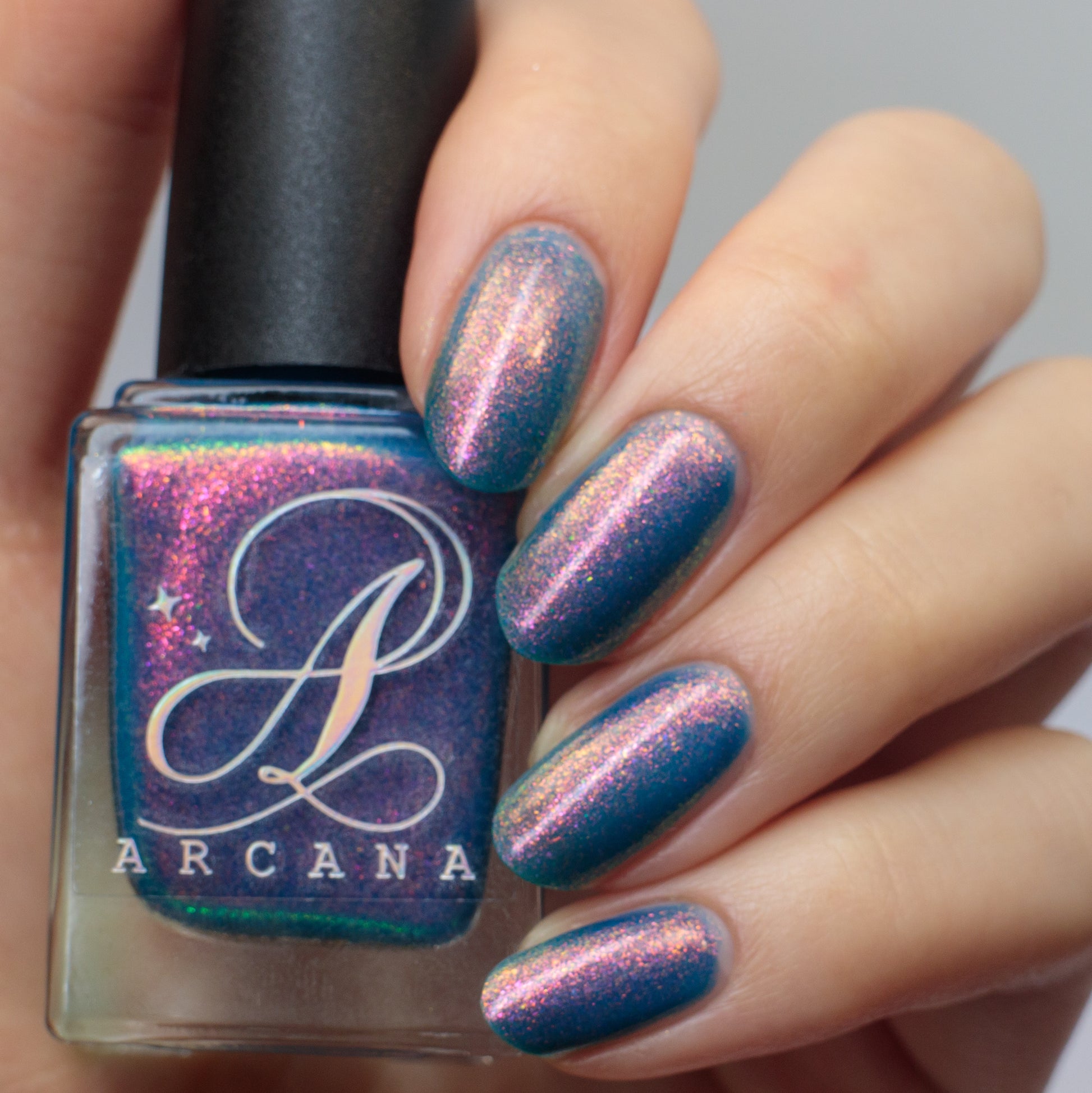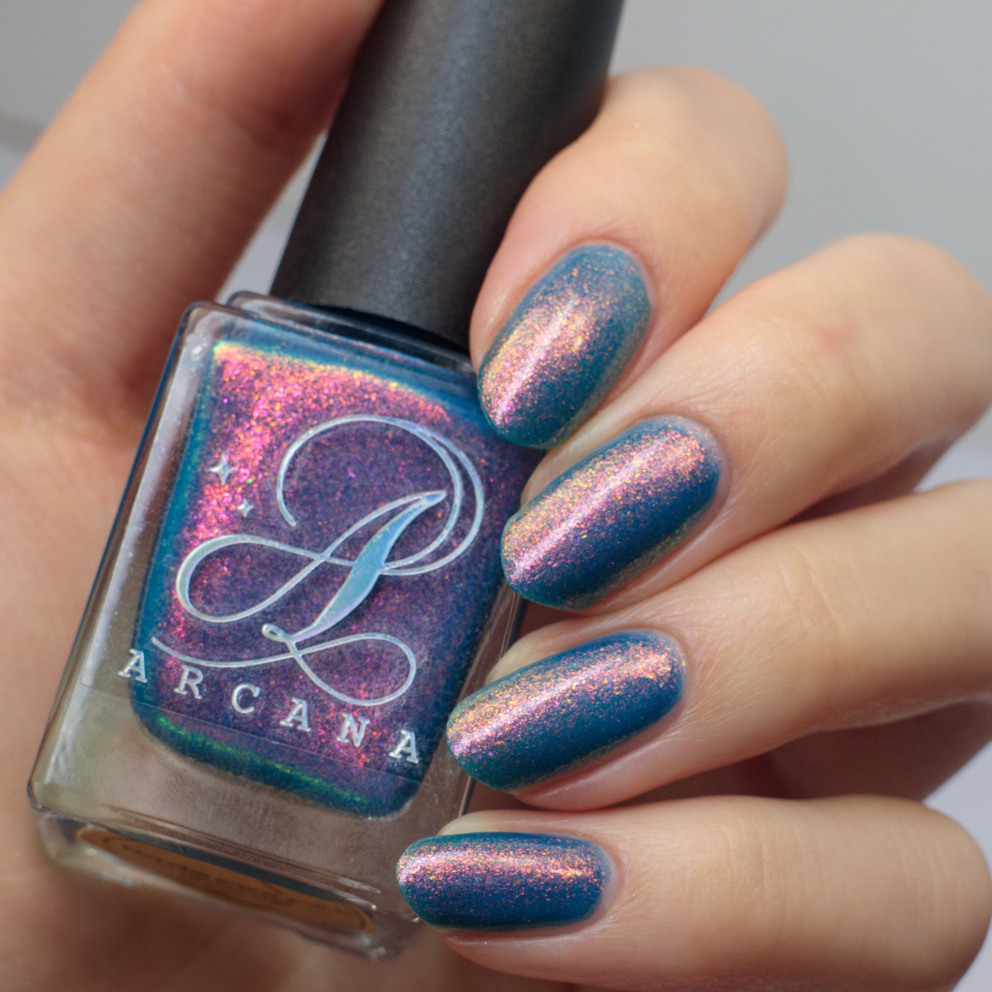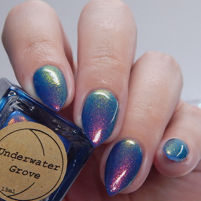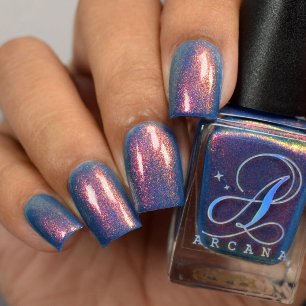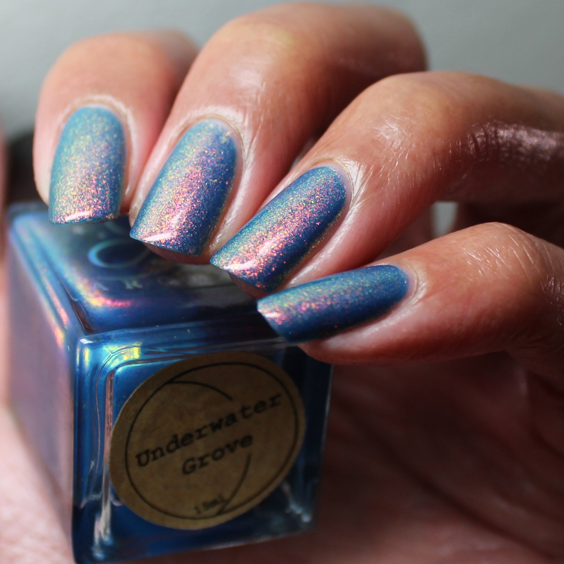 This polish has a neon blue base with pink-orange-yellow large particle shimmer!