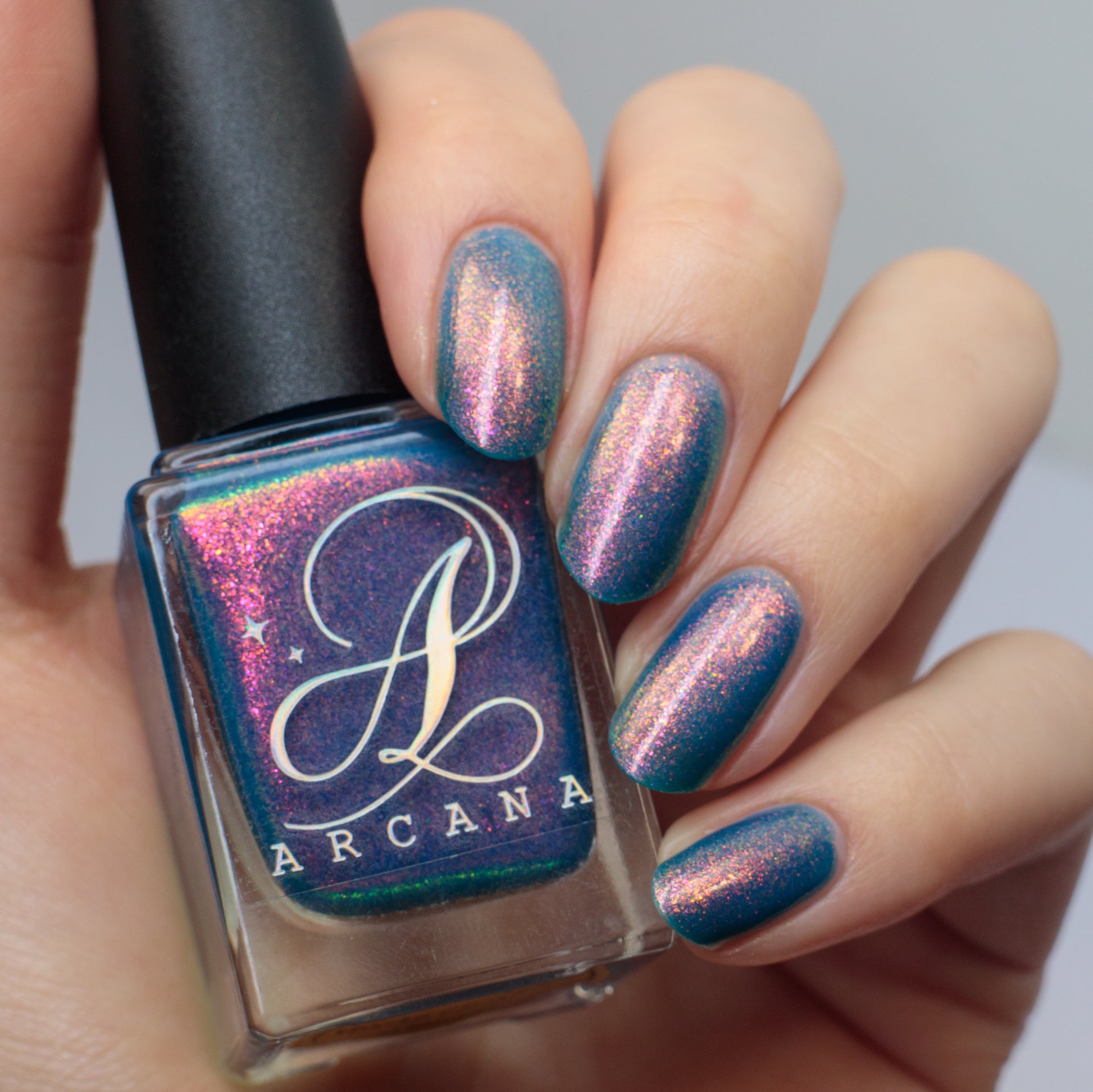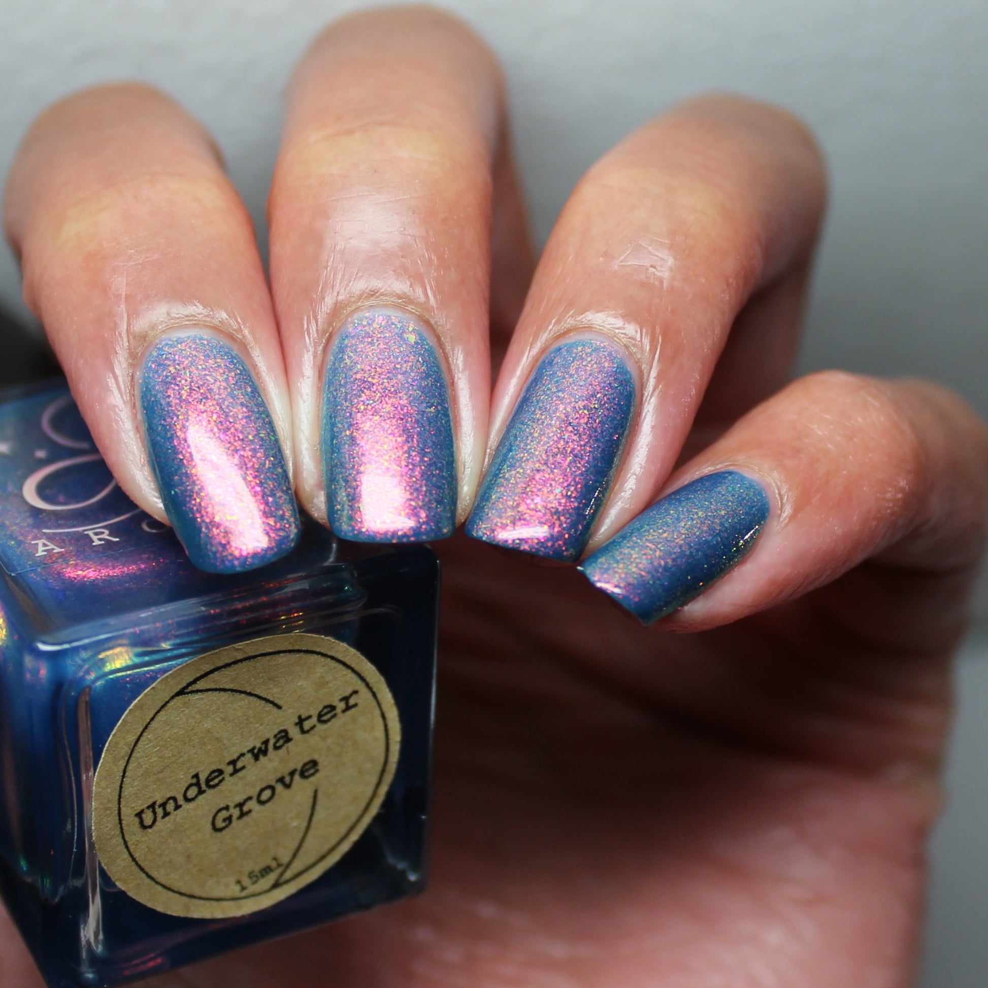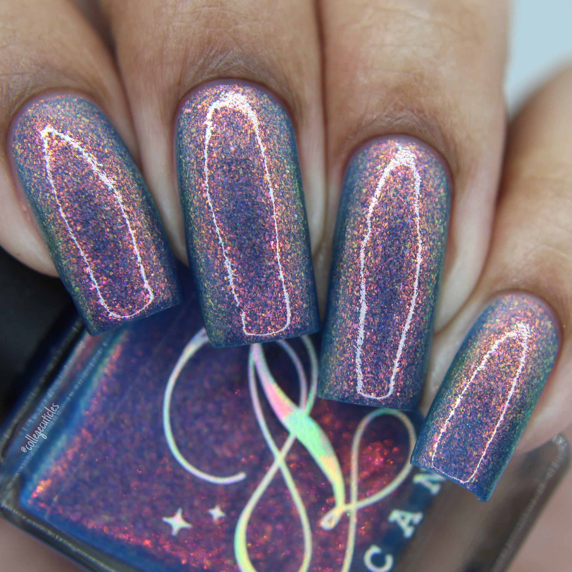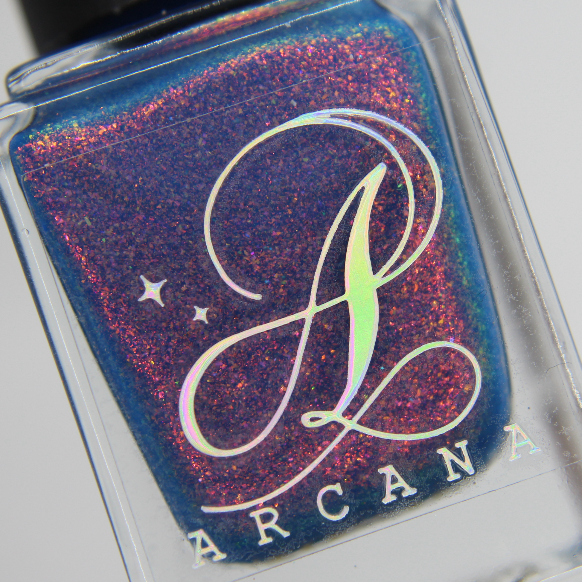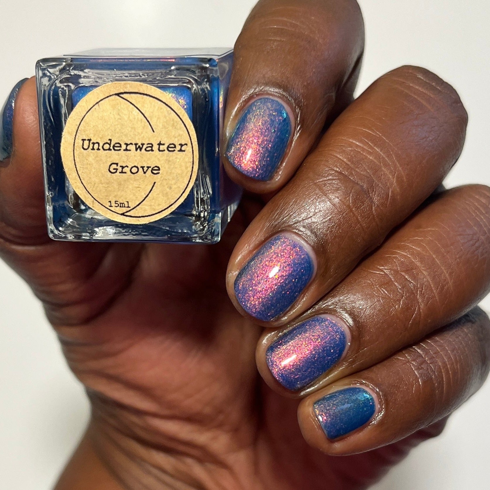 This polish has a neon blue base with pink-orange-yellow large particle shimmer!